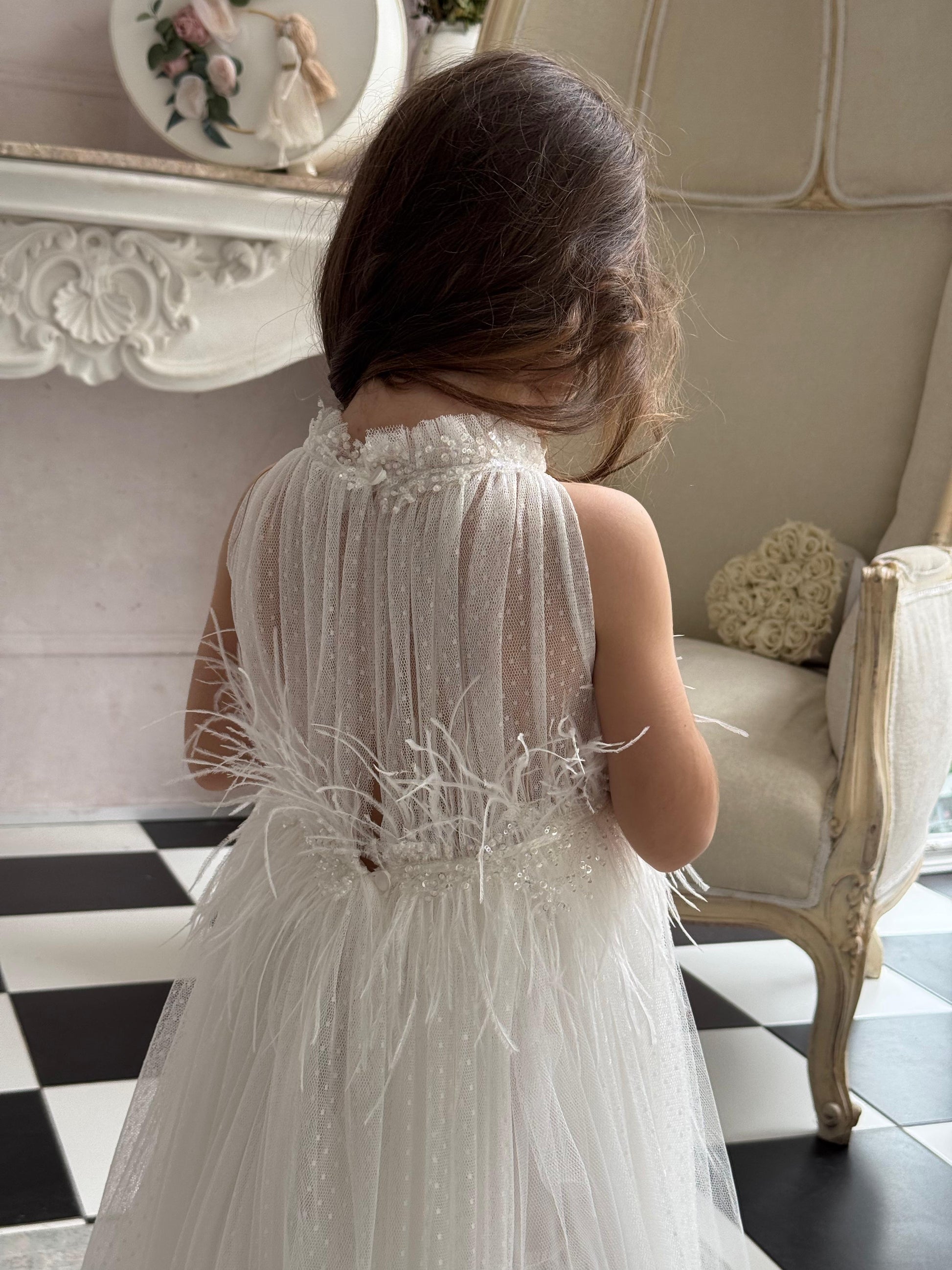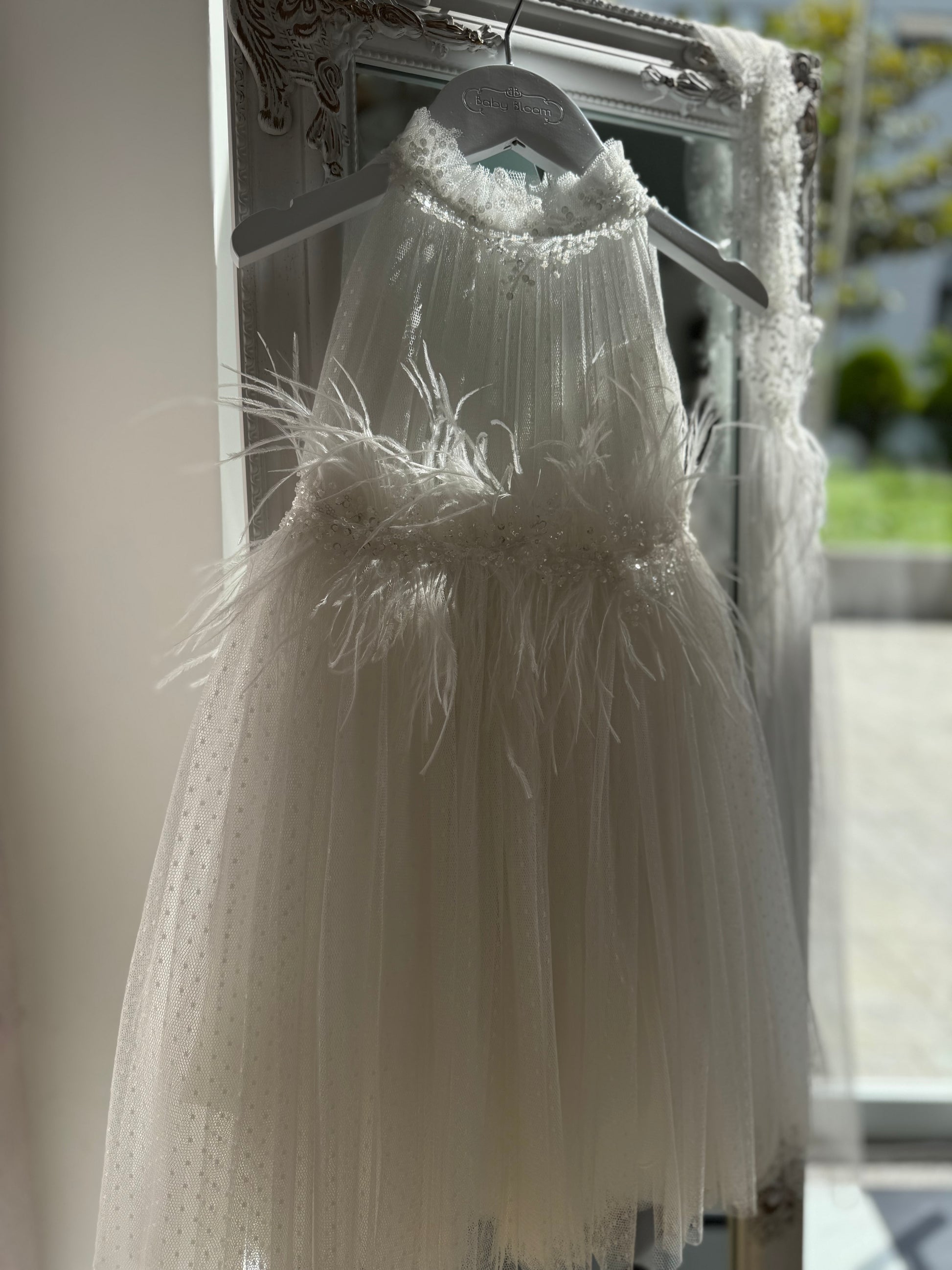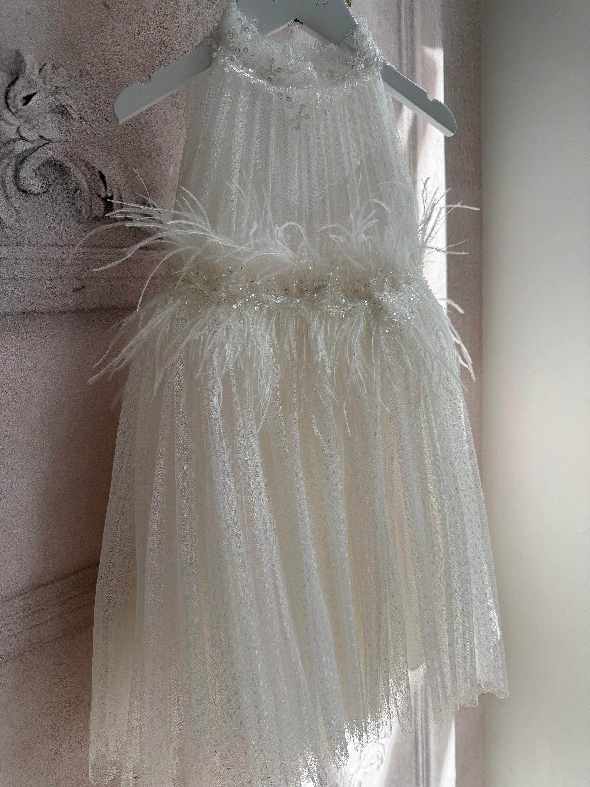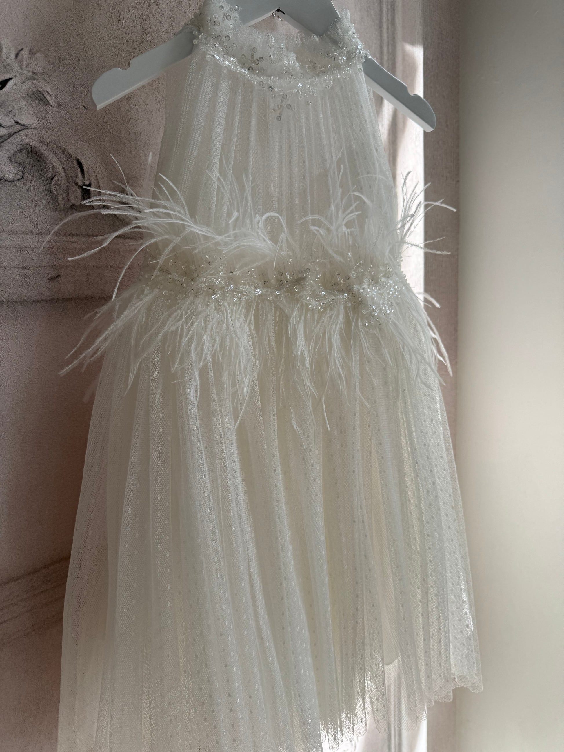 Fustan pagezimesh dhe eventesh, me fyt te mbyllur, me detaje kristalesh dhe puplash.