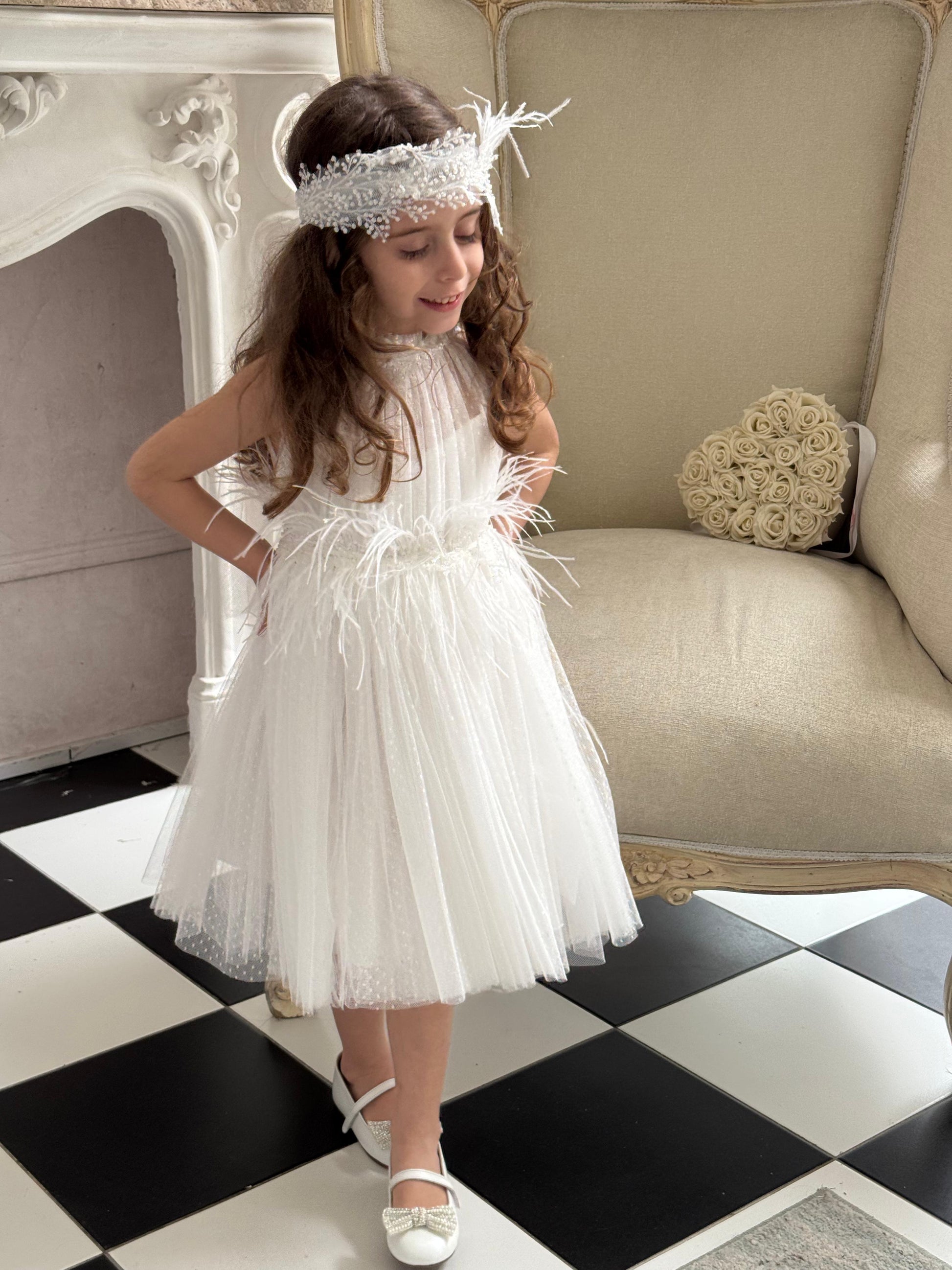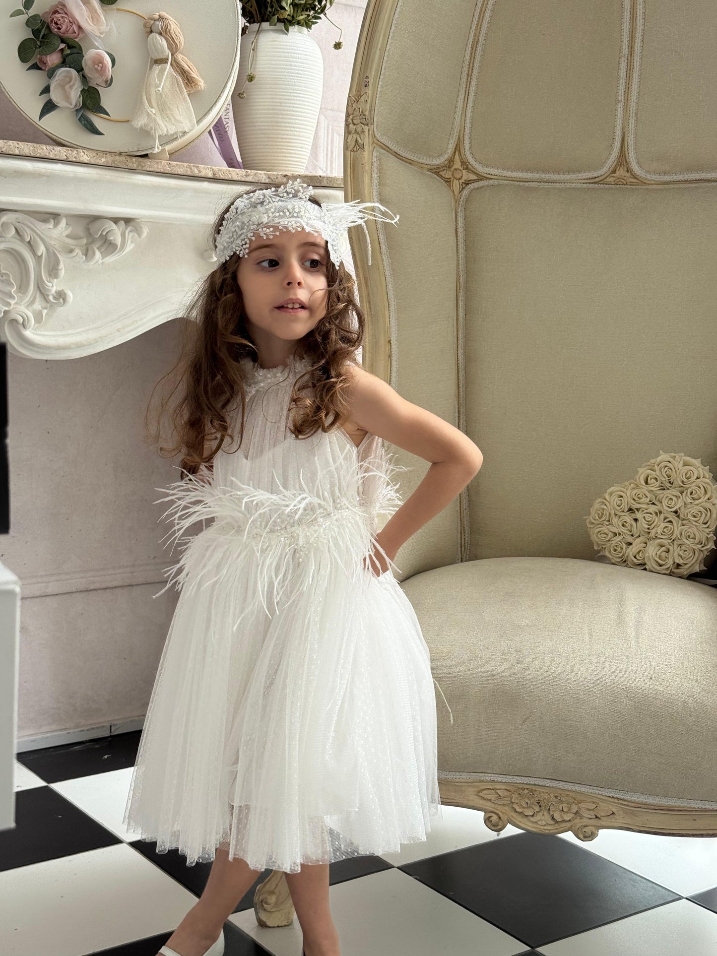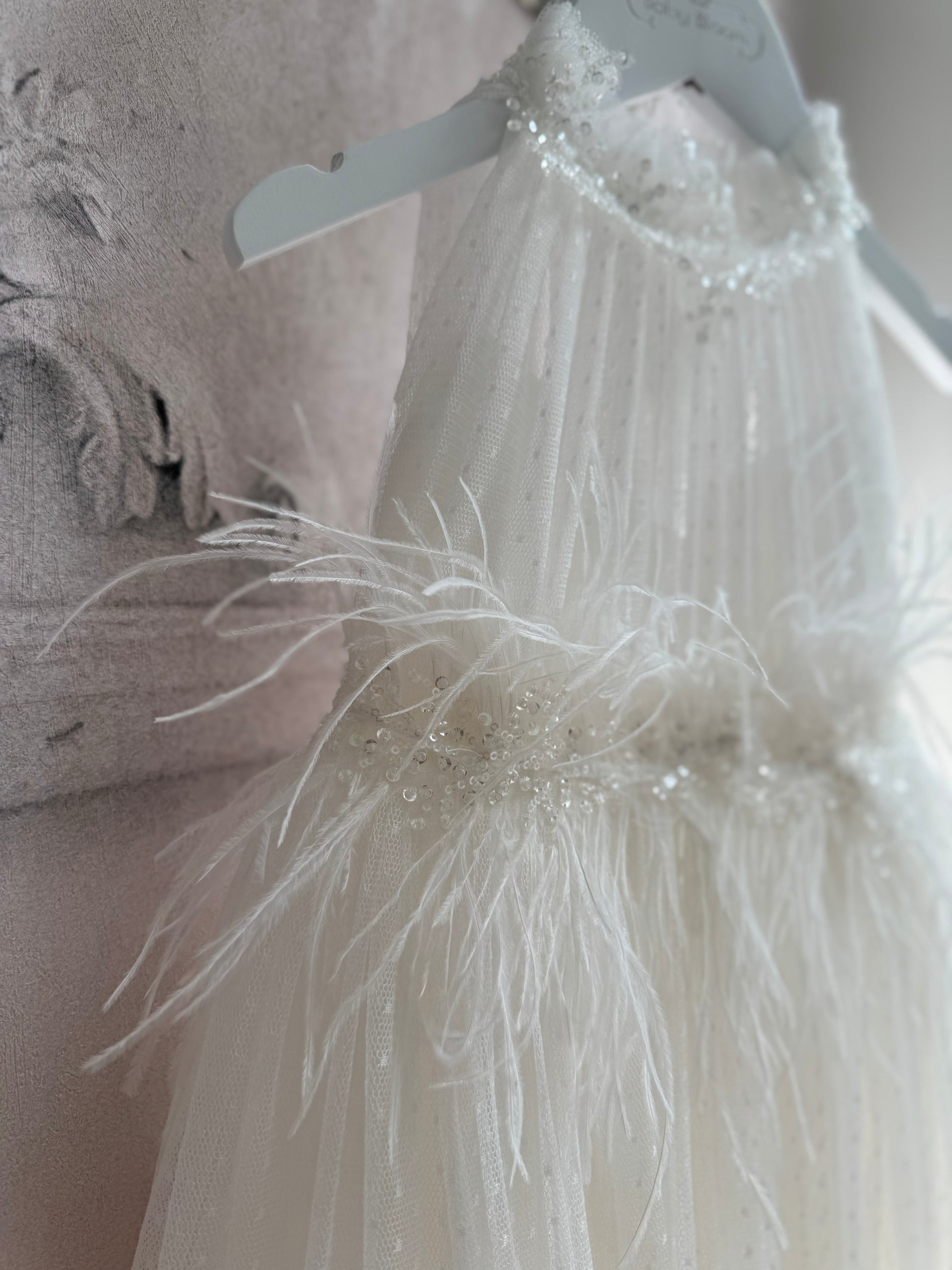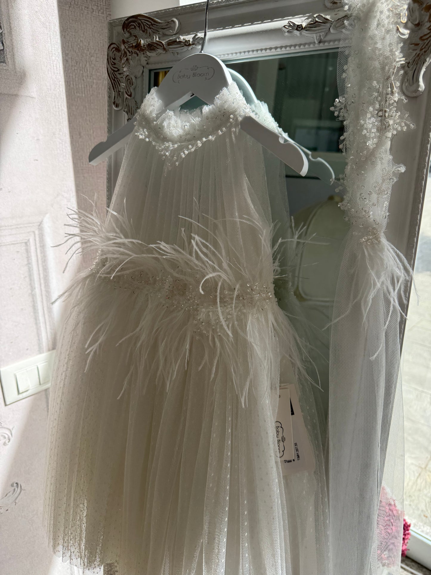 Fustan pagezimesh dhe eventesh, me fyt te mbyllur, me detaje kristalesh dhe puplash.