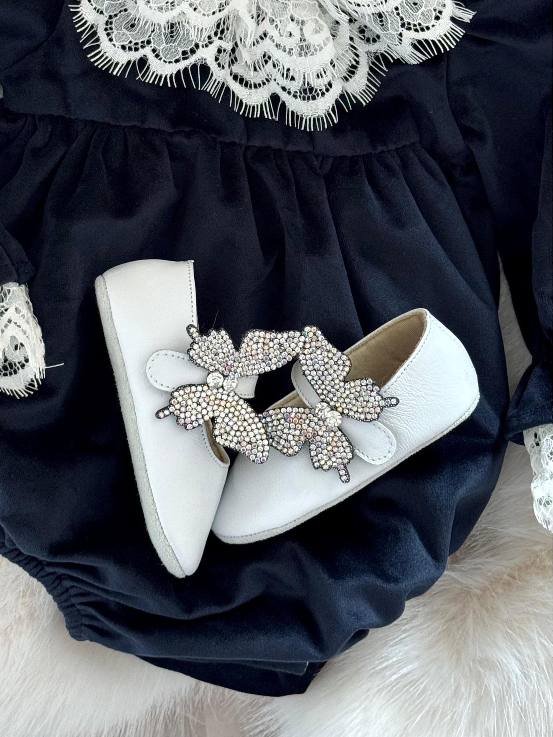 Pupat per beba me flutur anesore, me gurre swarovski. Modeli butterfly anesore, lekure ne ngjyre te bardhe.