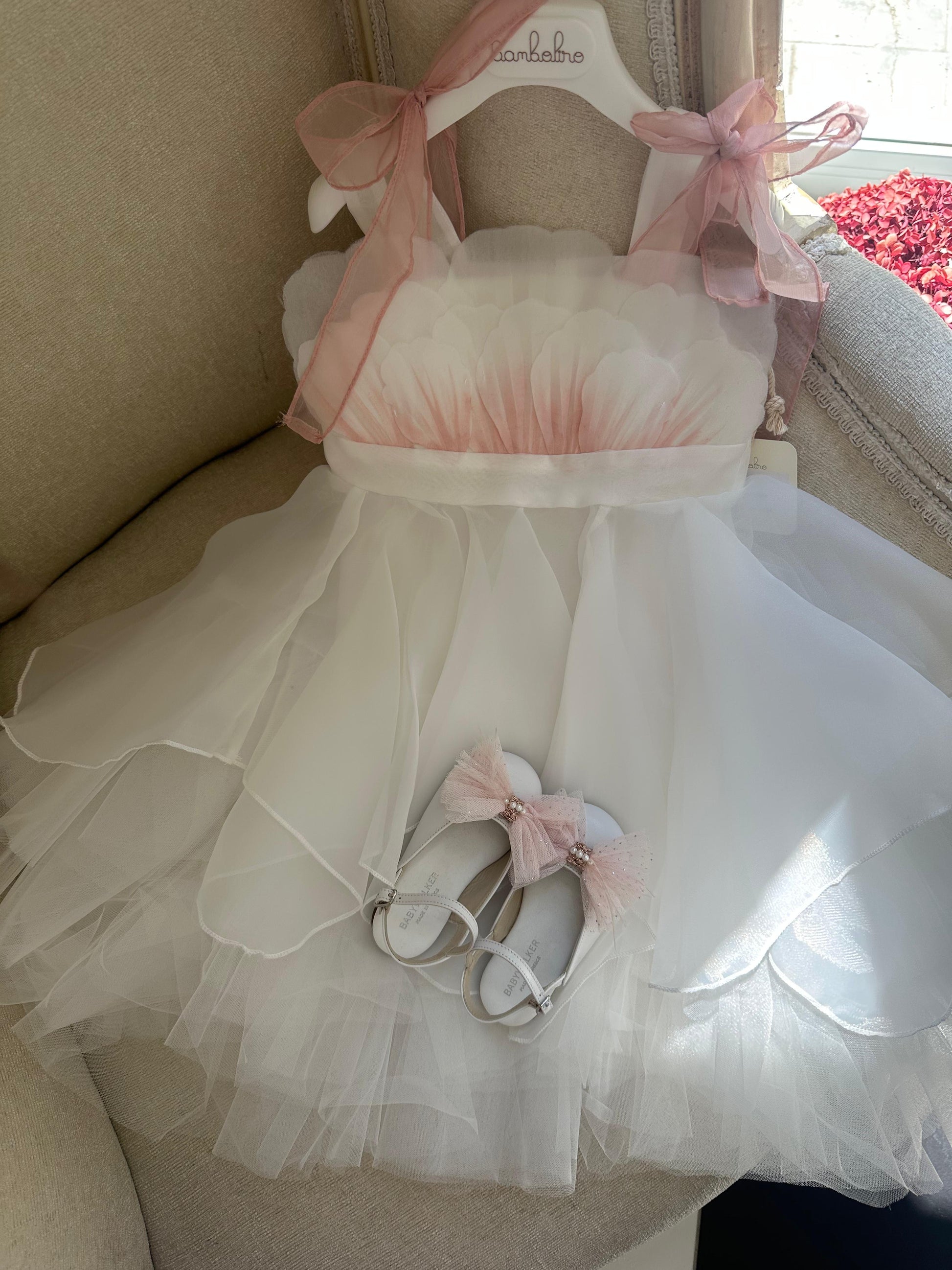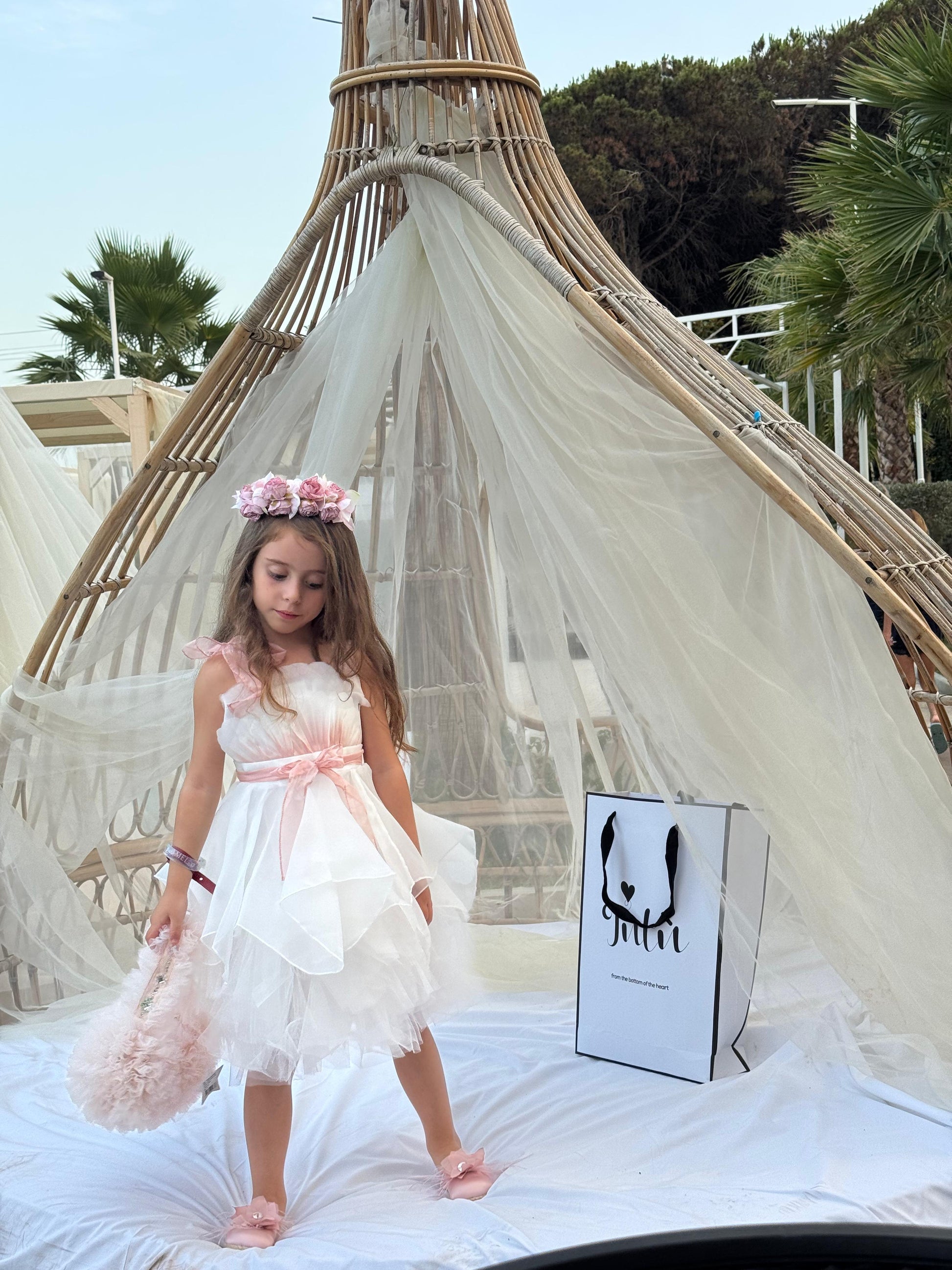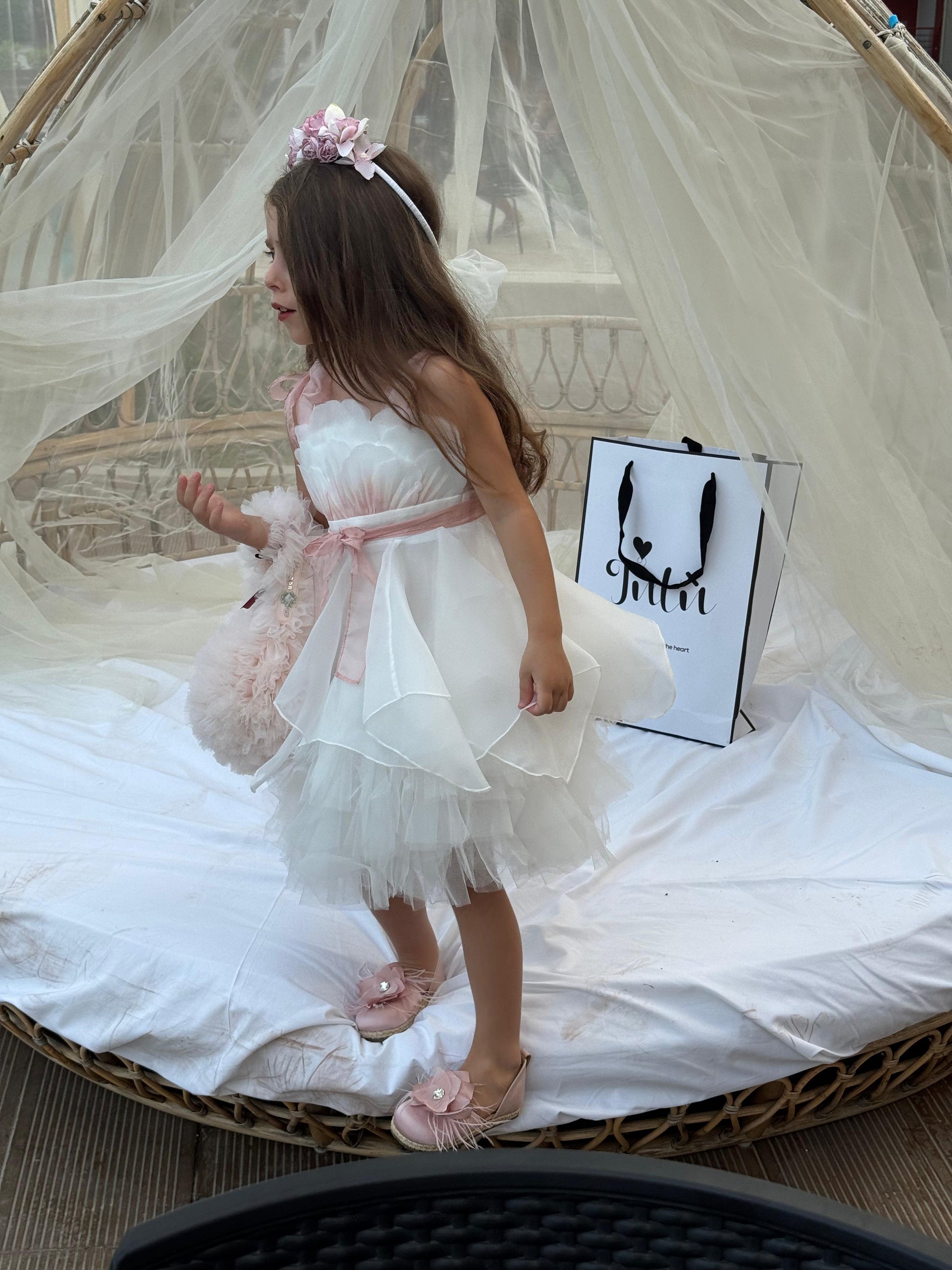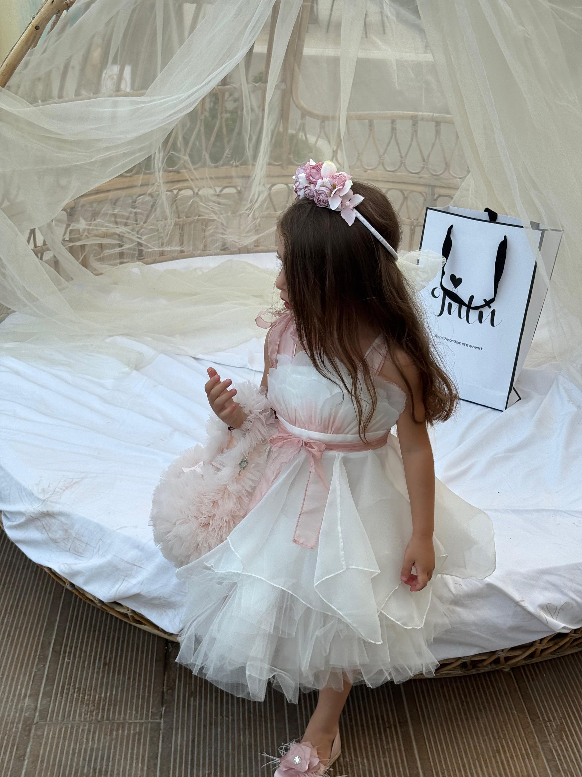 Adrianna dress.Fustan eventesh me petale lulesh, tirante dhe shtresa tyli.