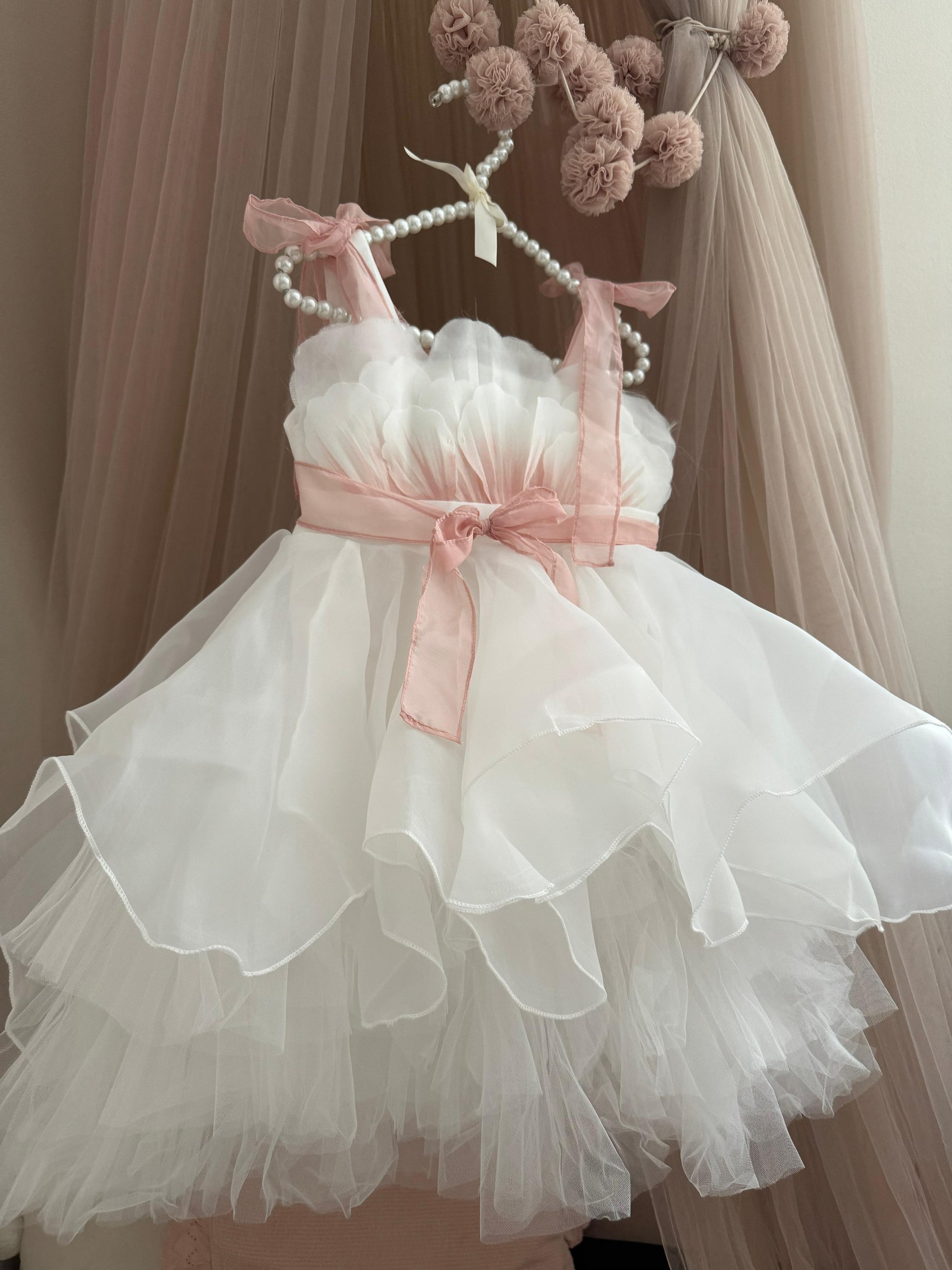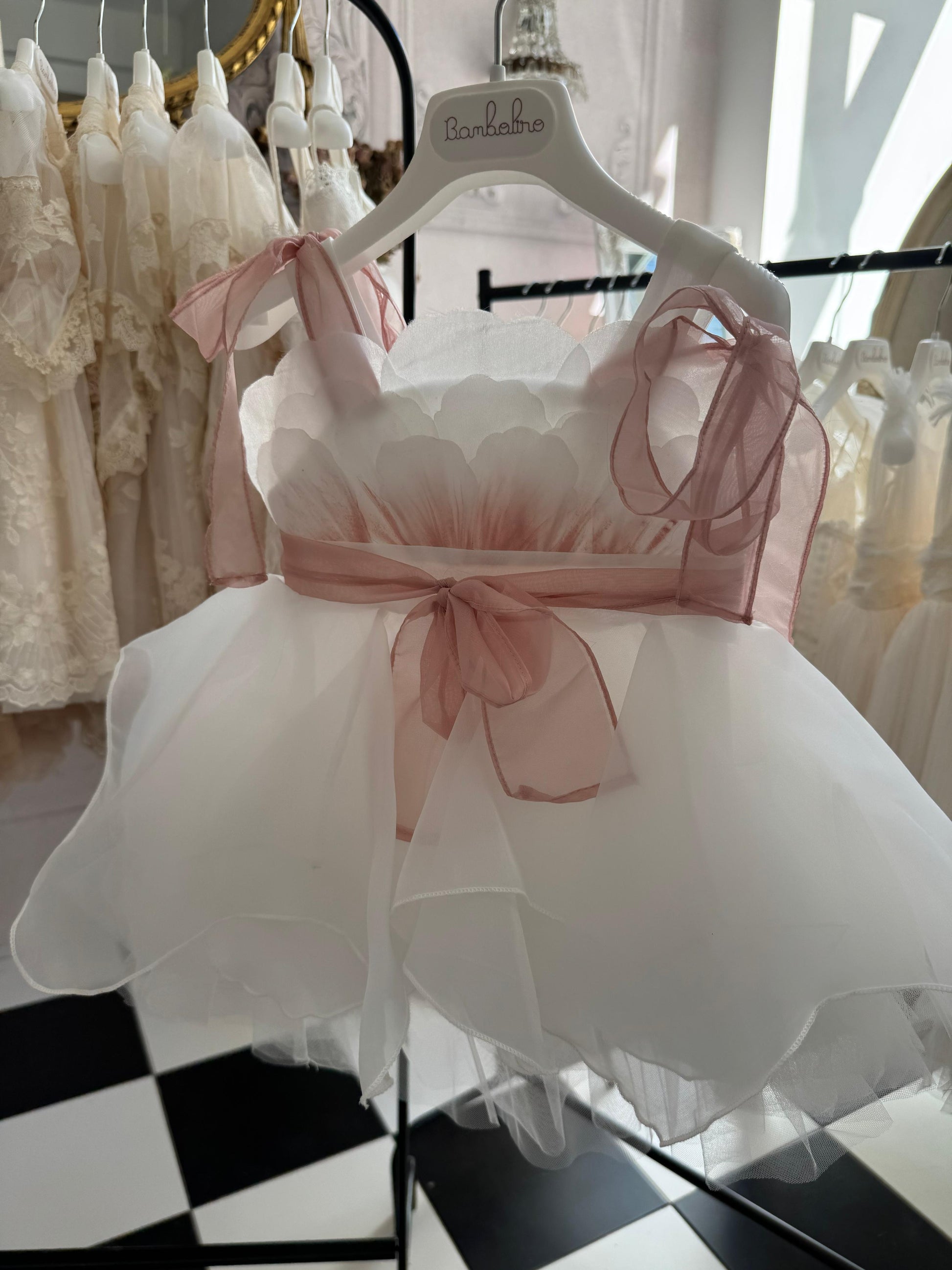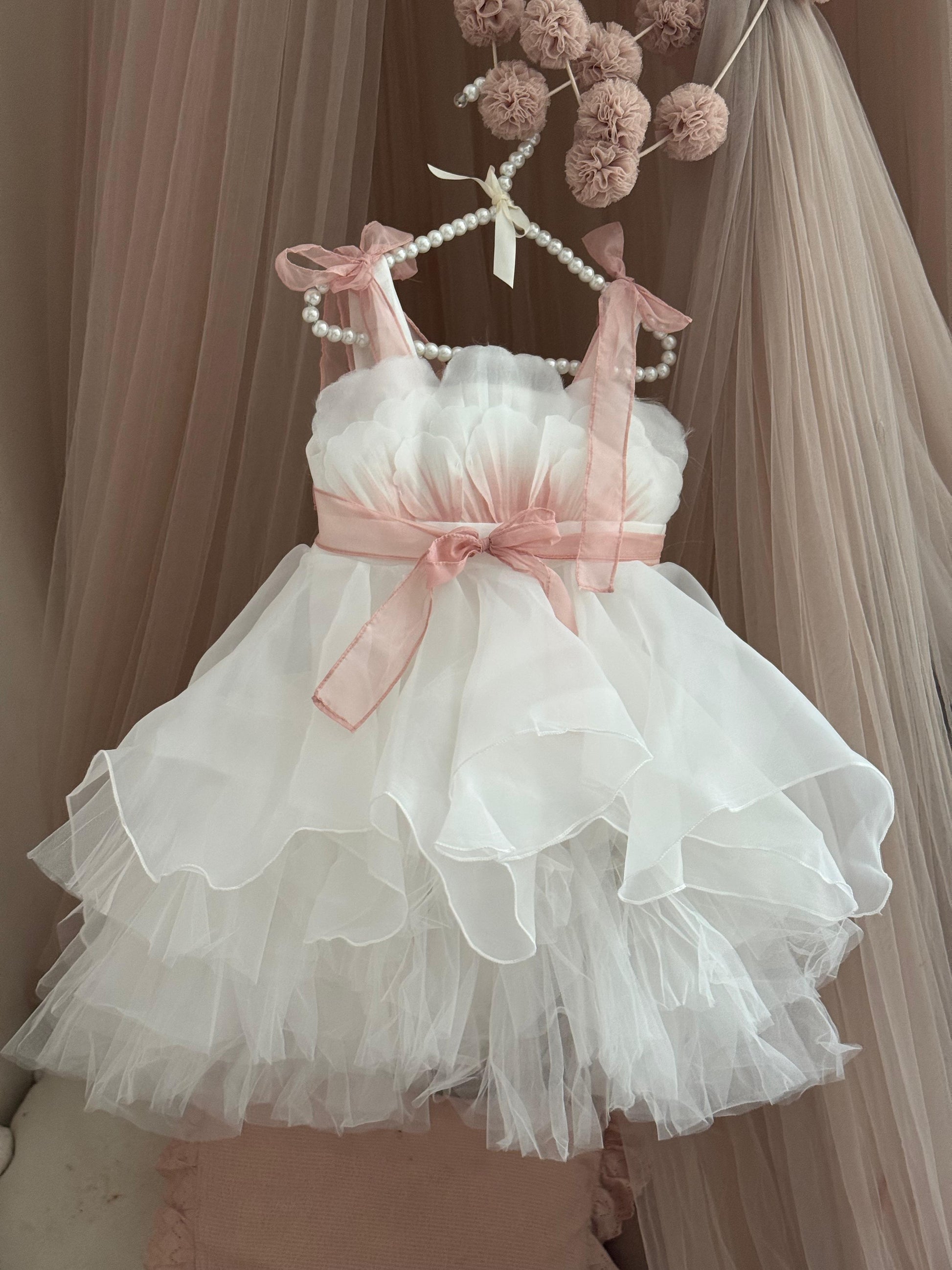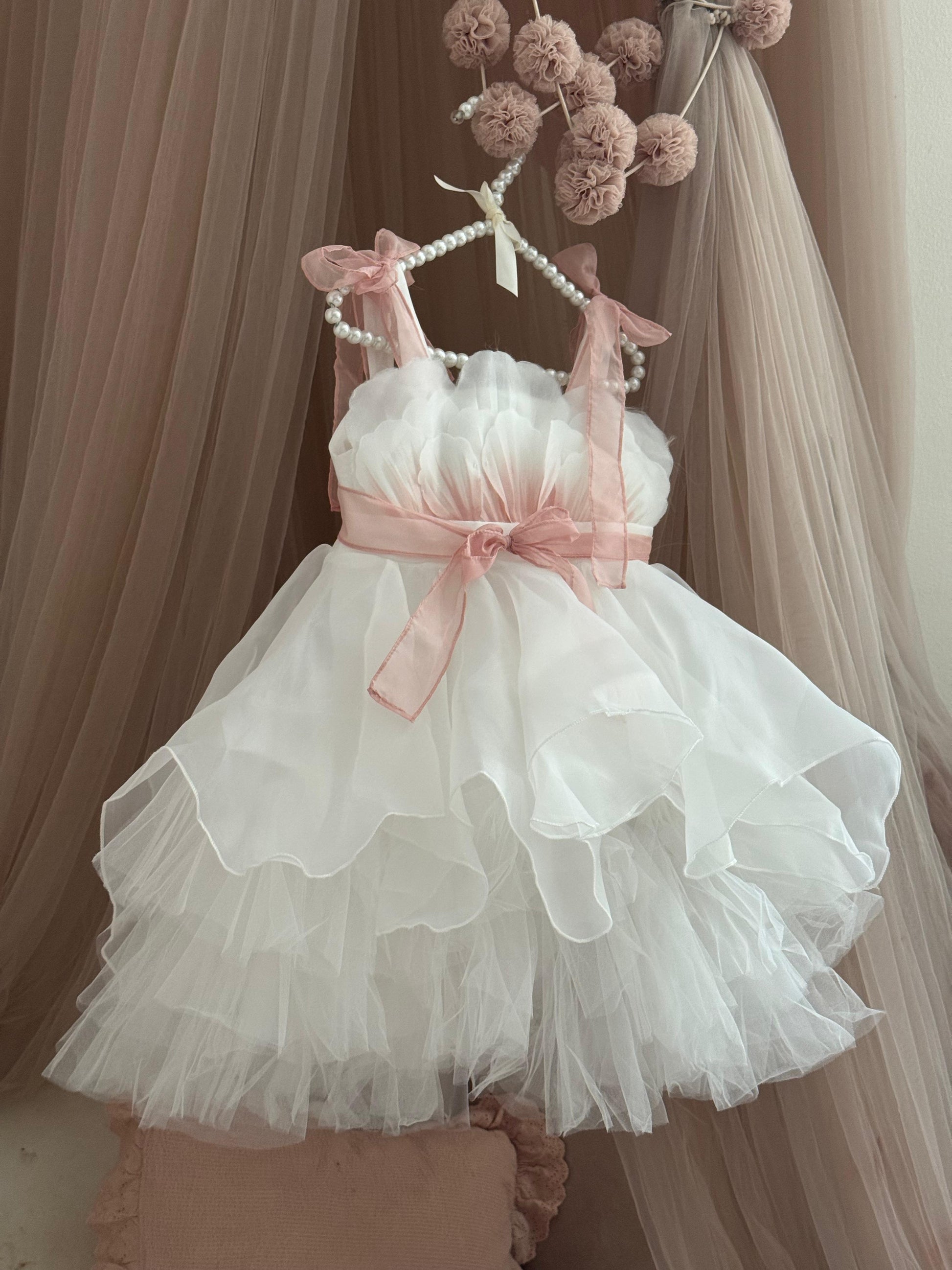 Adrianna dress.Fustan eventesh me petale lulesh, tirante dhe shtresa tyli.