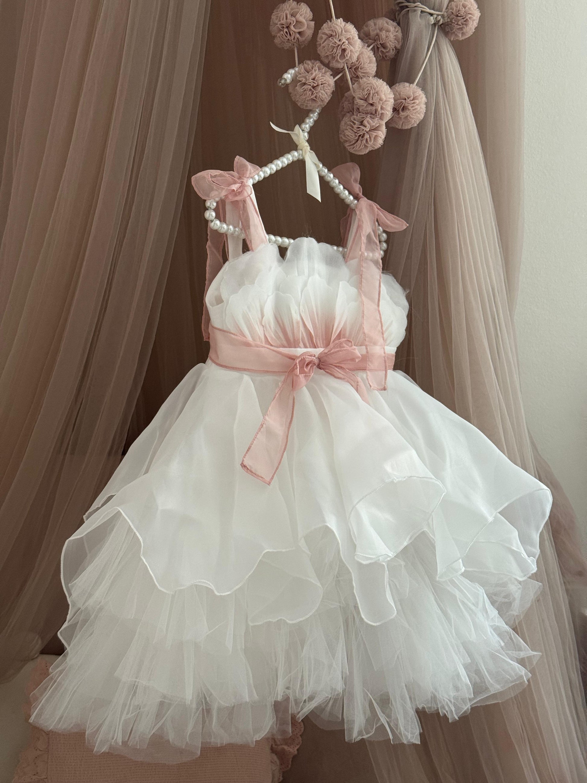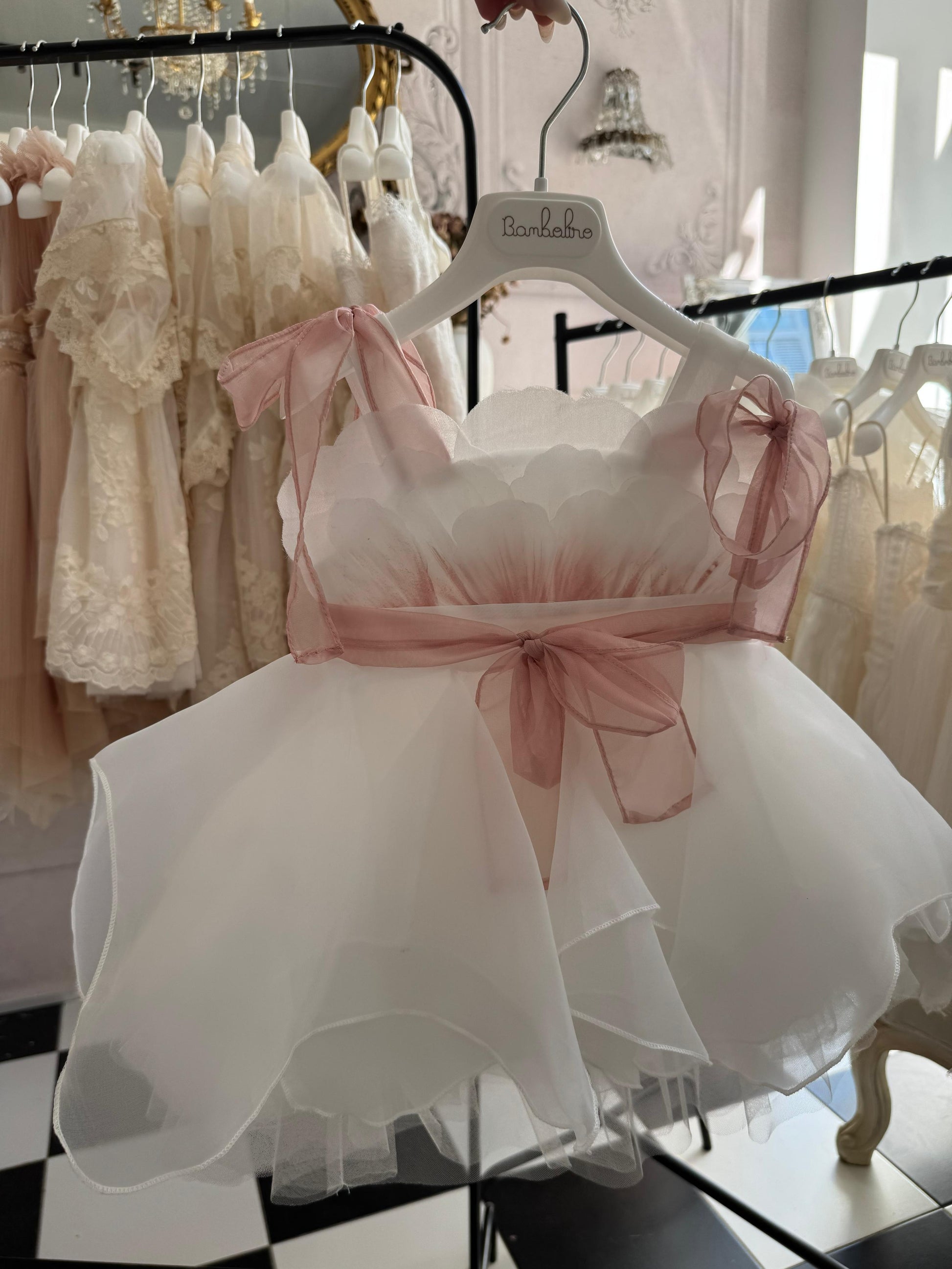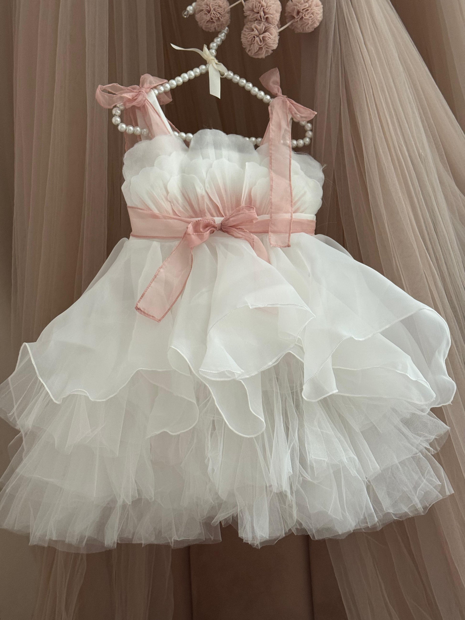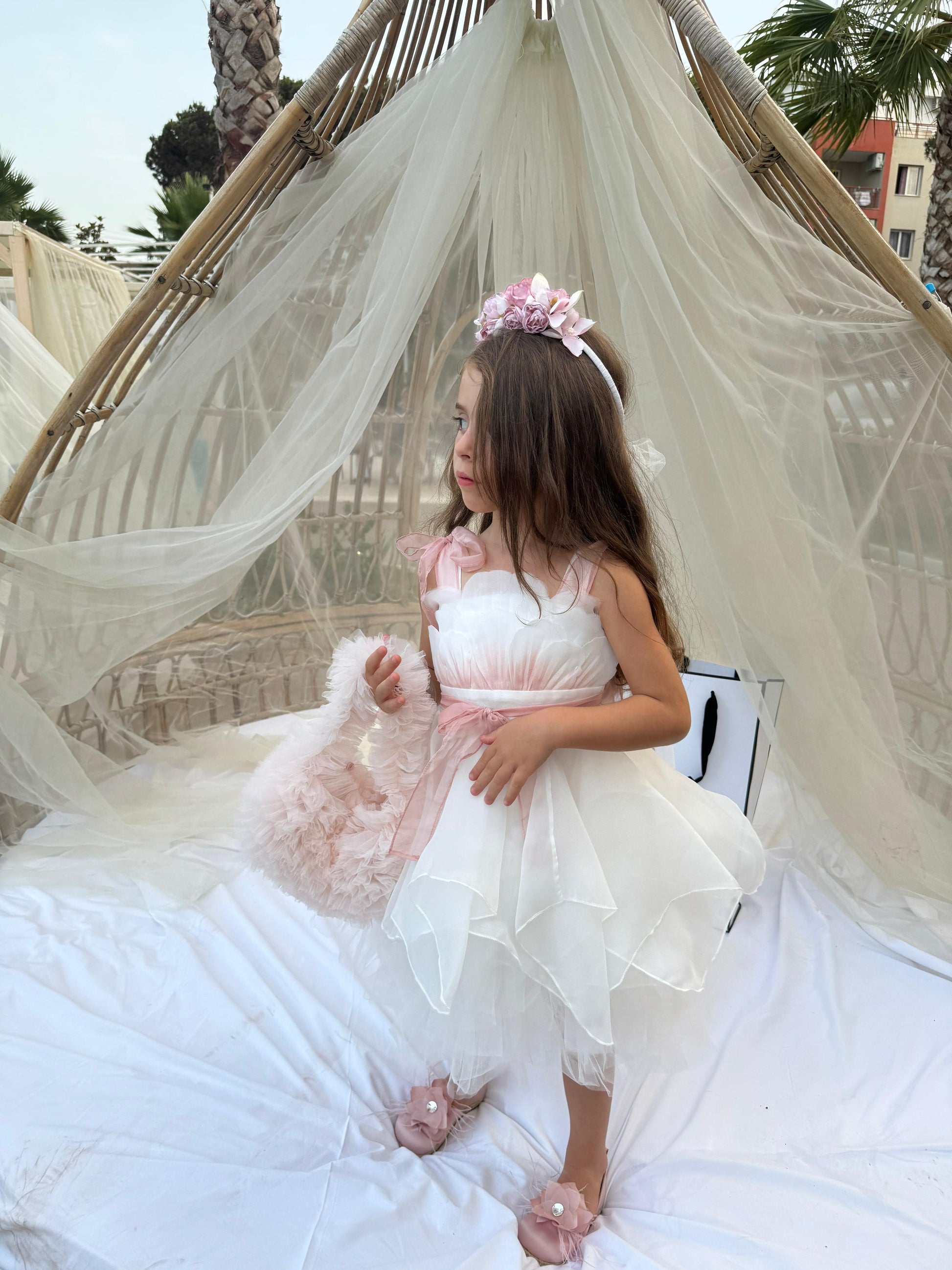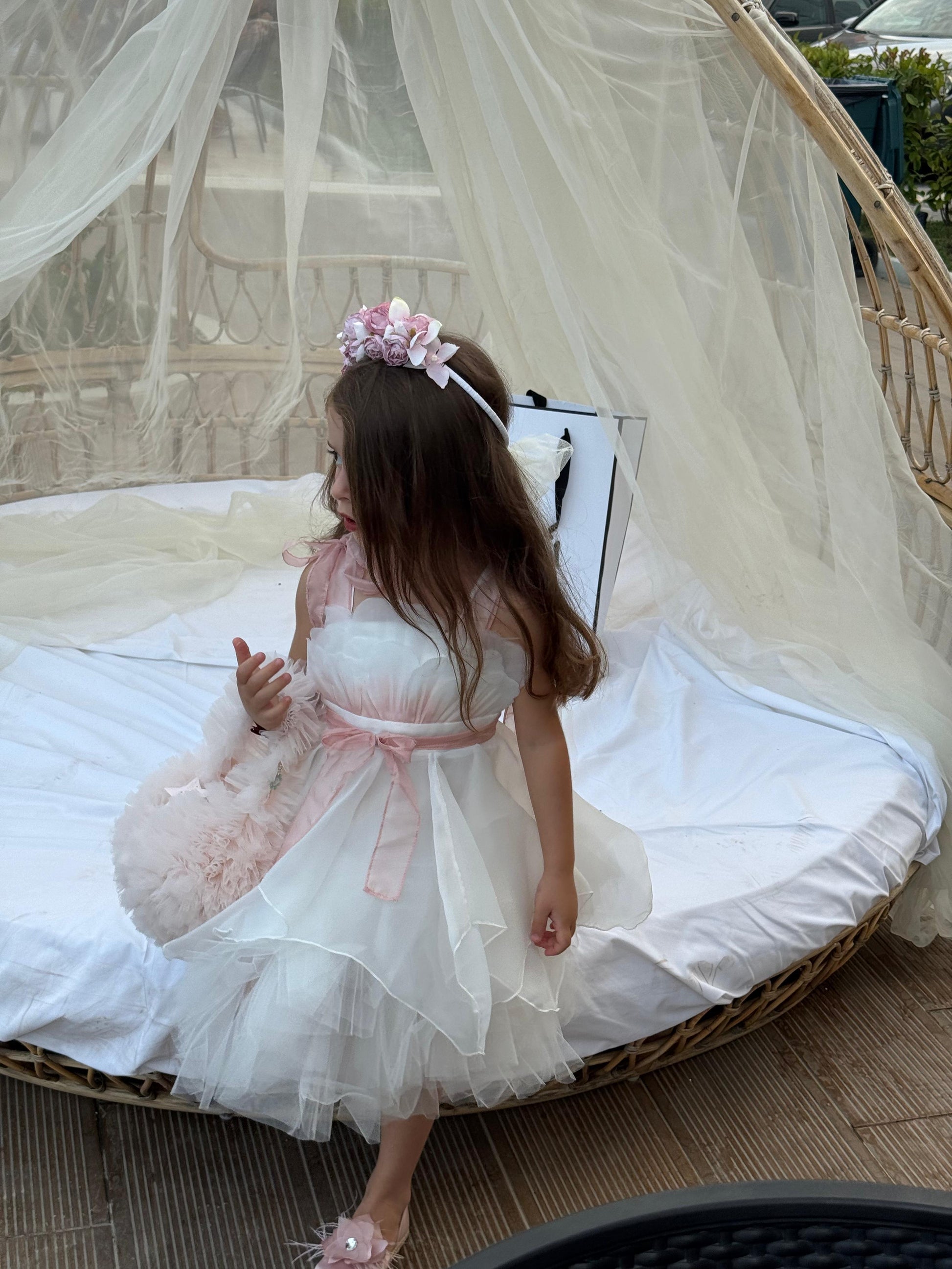 Adrianna dress.Fustan eventesh me petale lulesh, tirante dhe shtresa tyli.