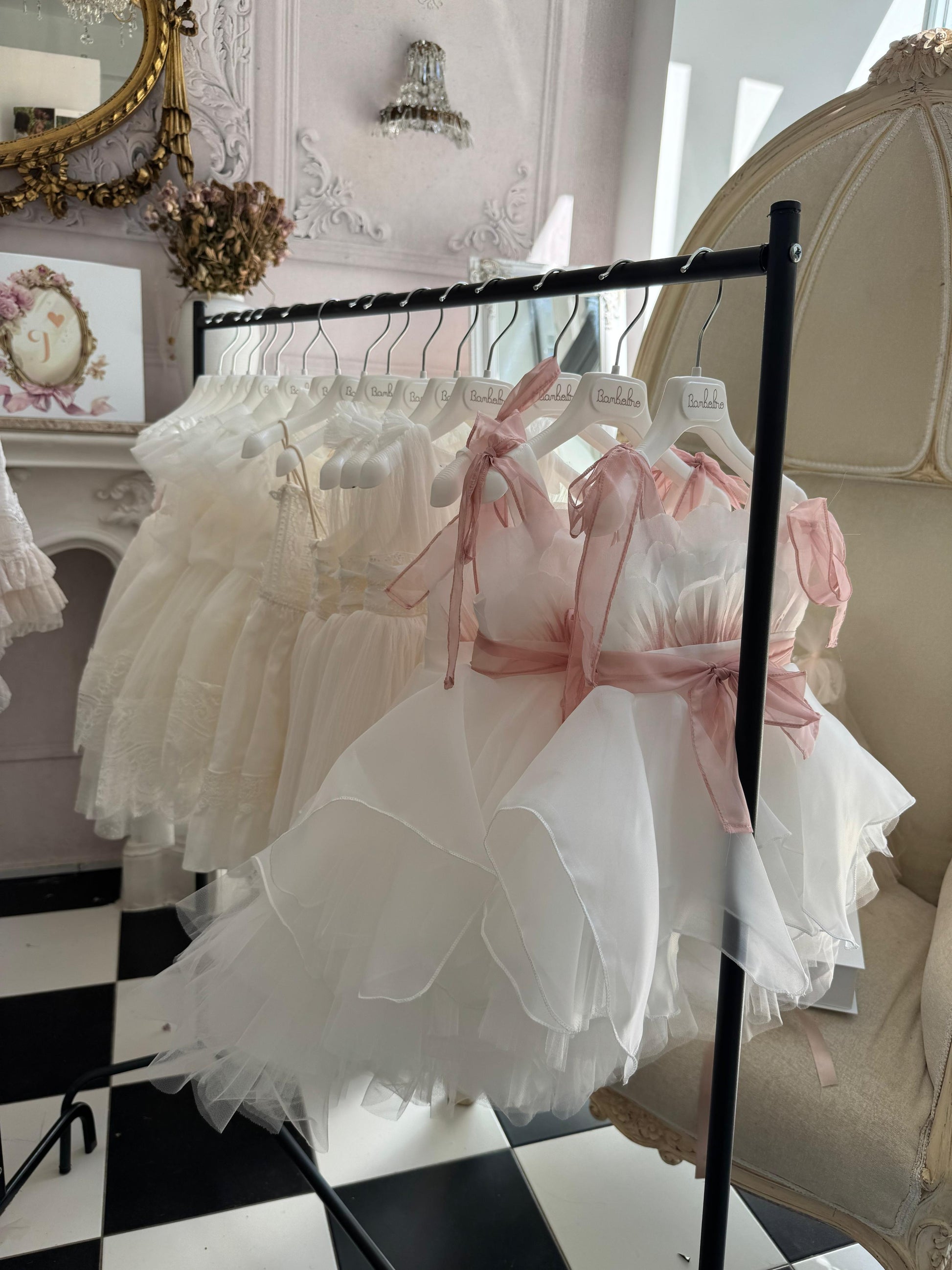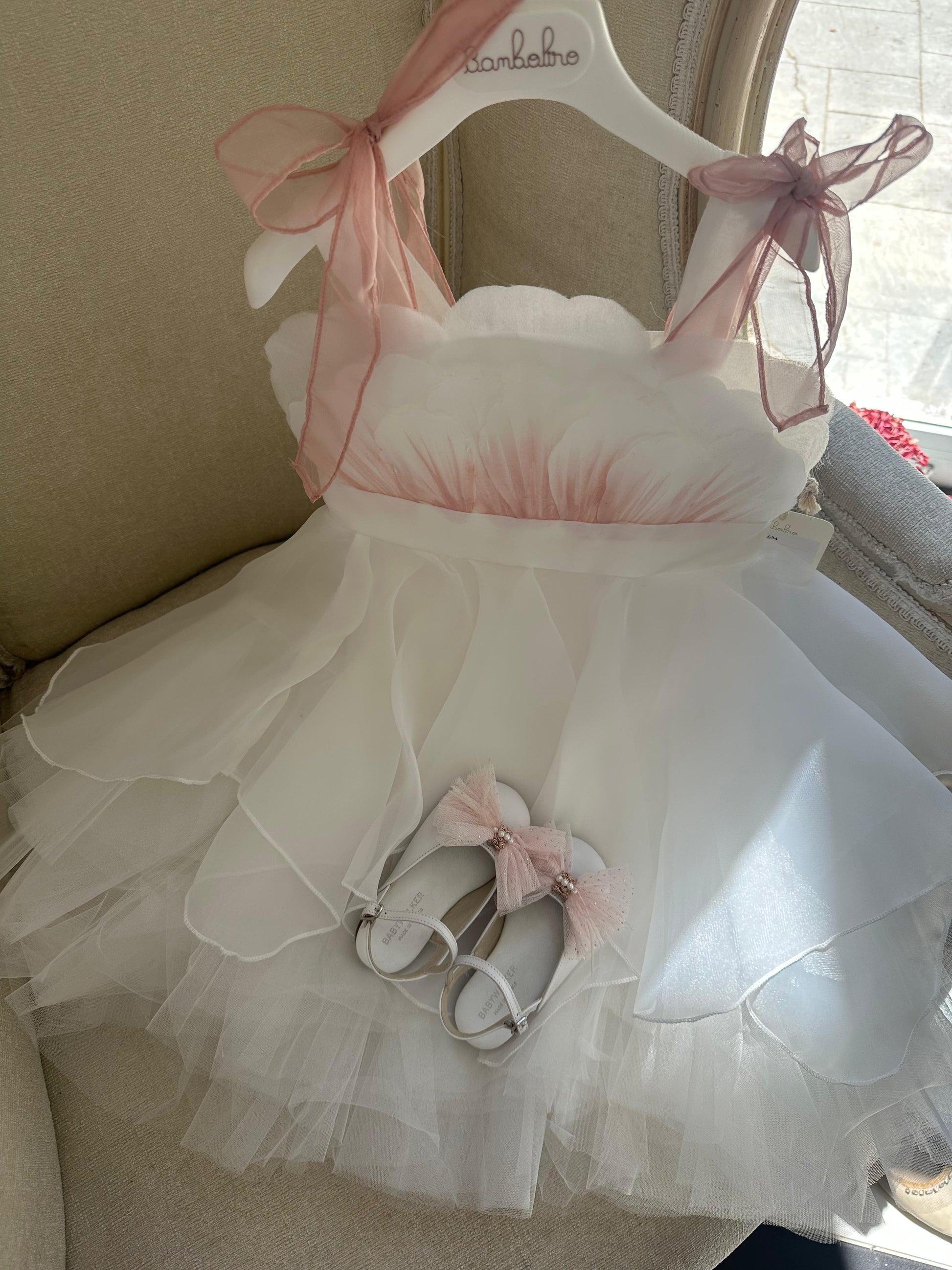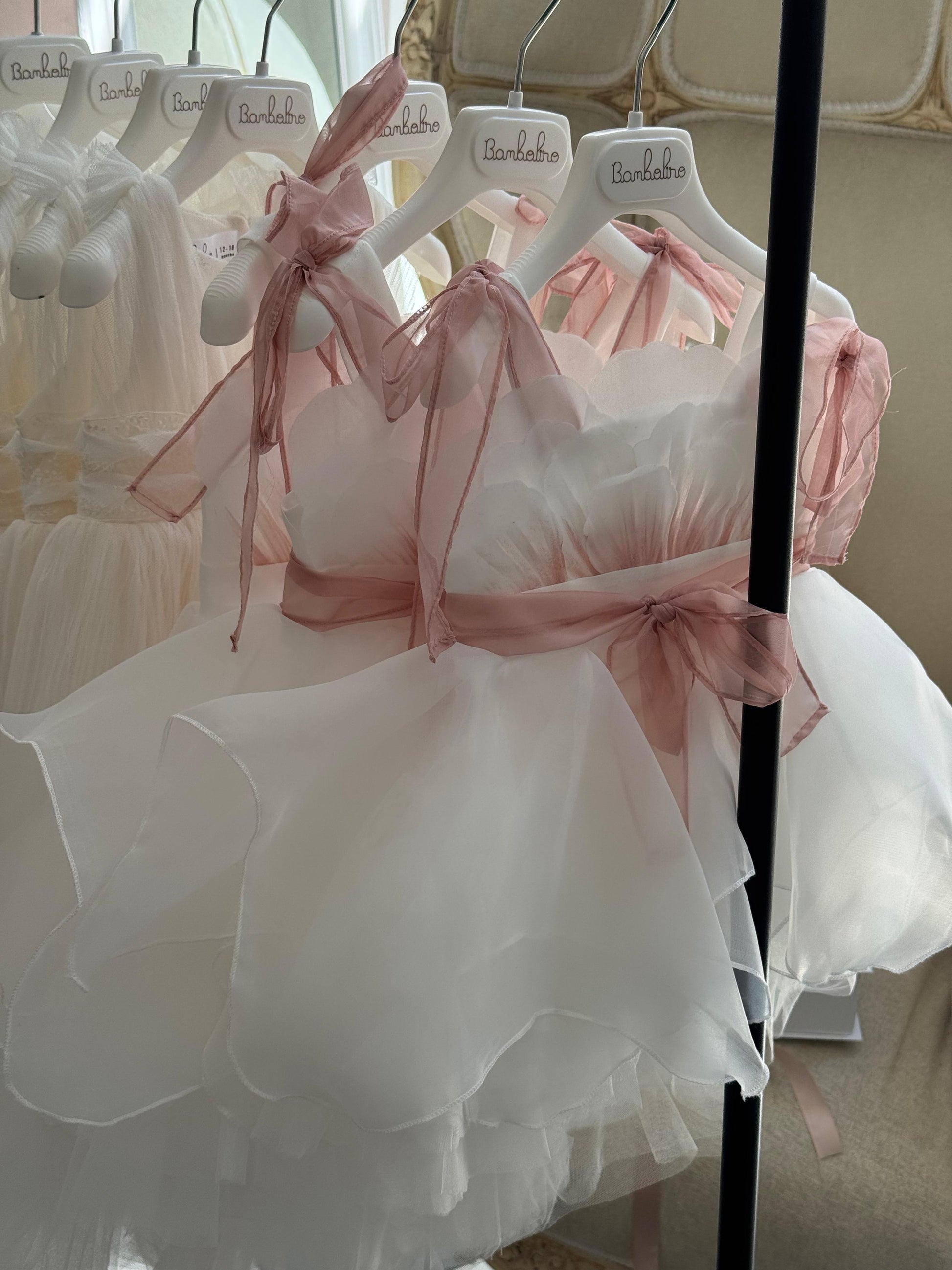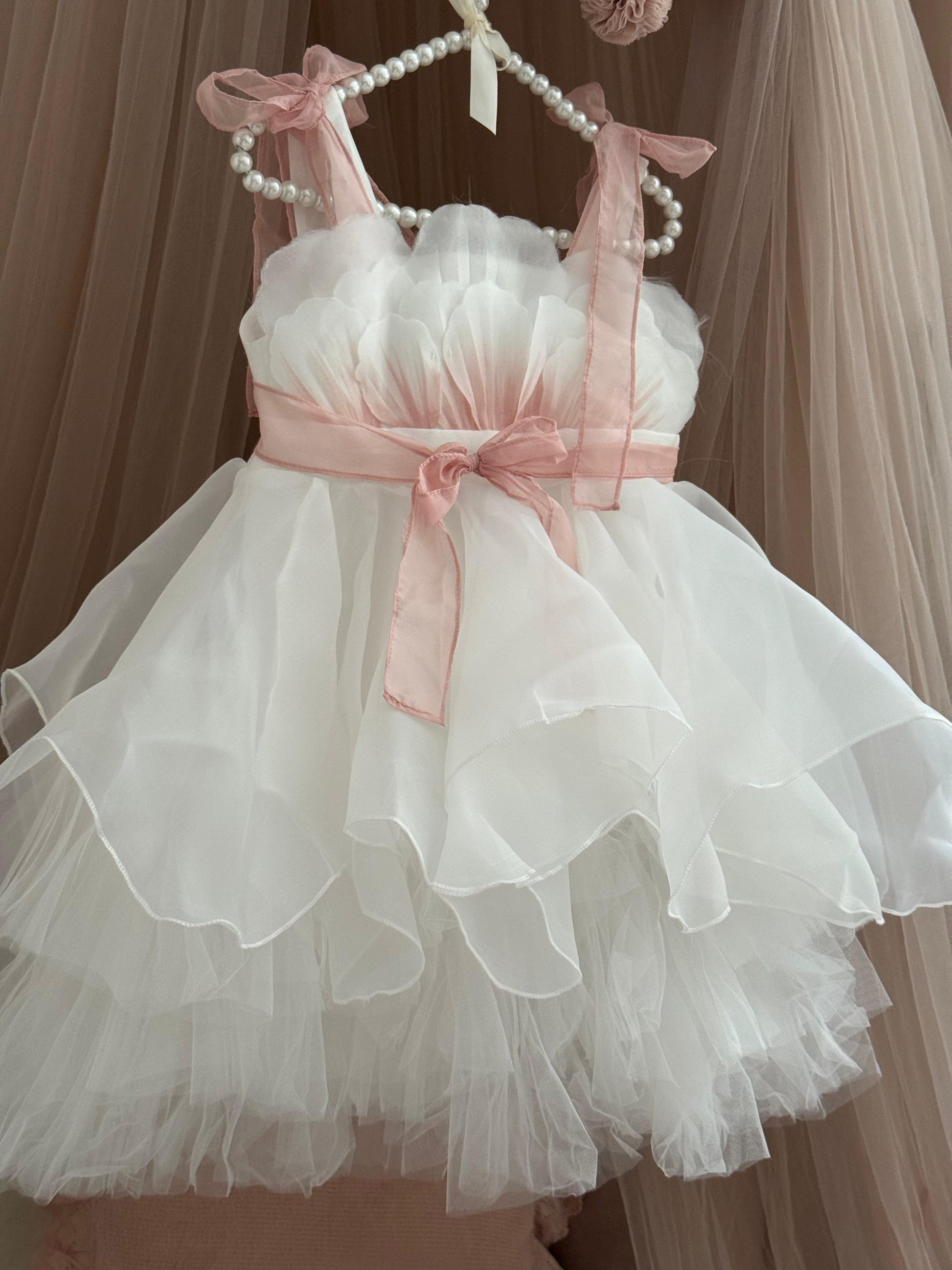 Adrianna dress.Fustan eventesh me petale lulesh, tirante dhe shtresa tyli.
