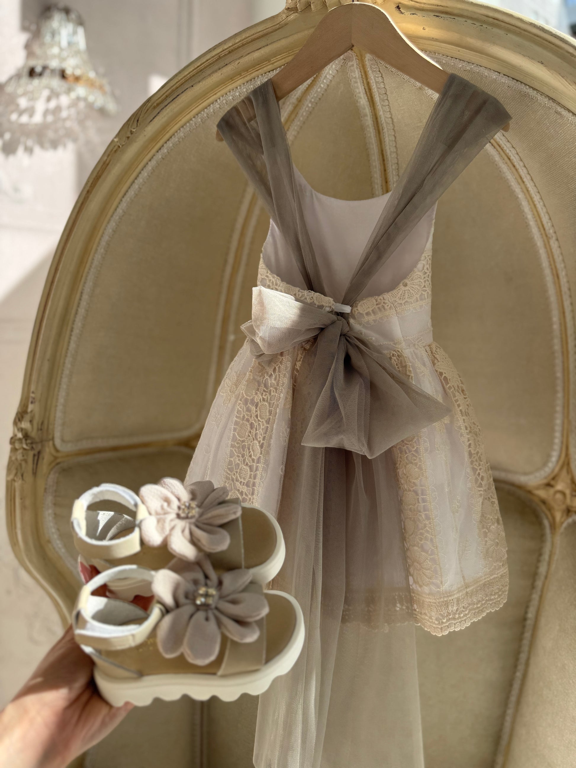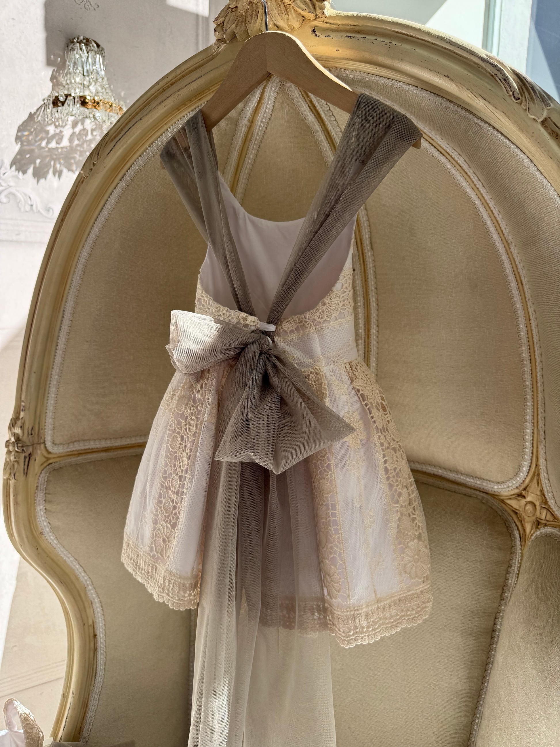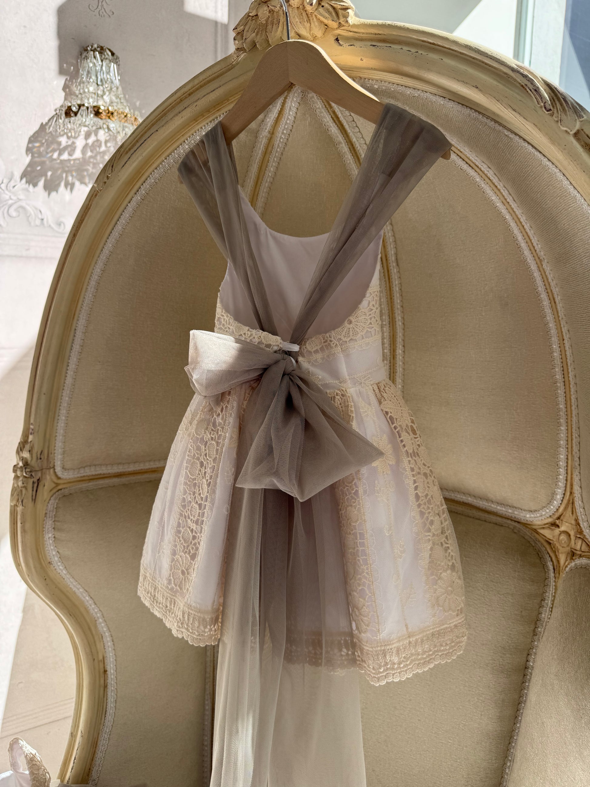 Fustan ceremonial me shpine jashte dhe detaje fjongo me tyl jeshil.