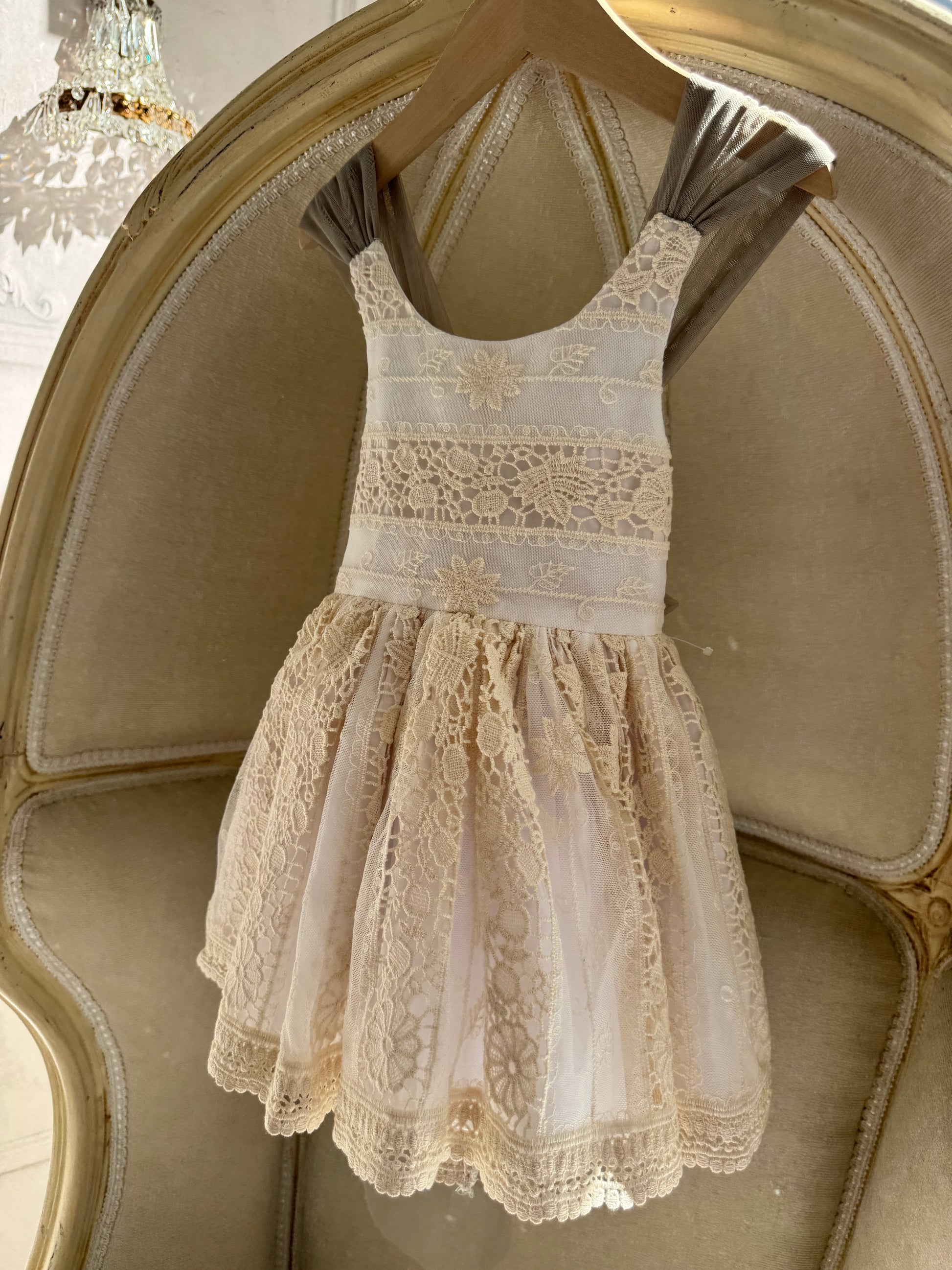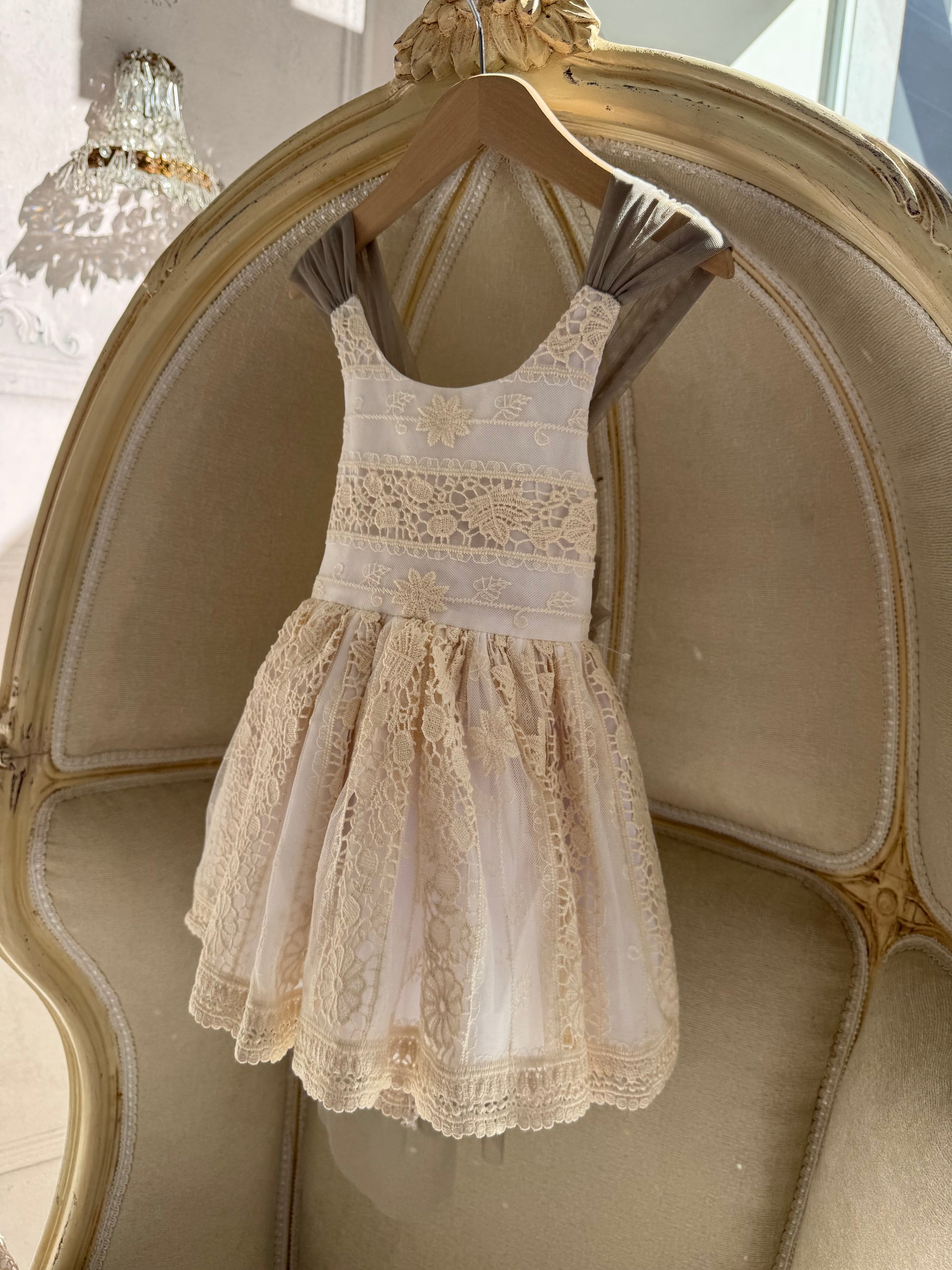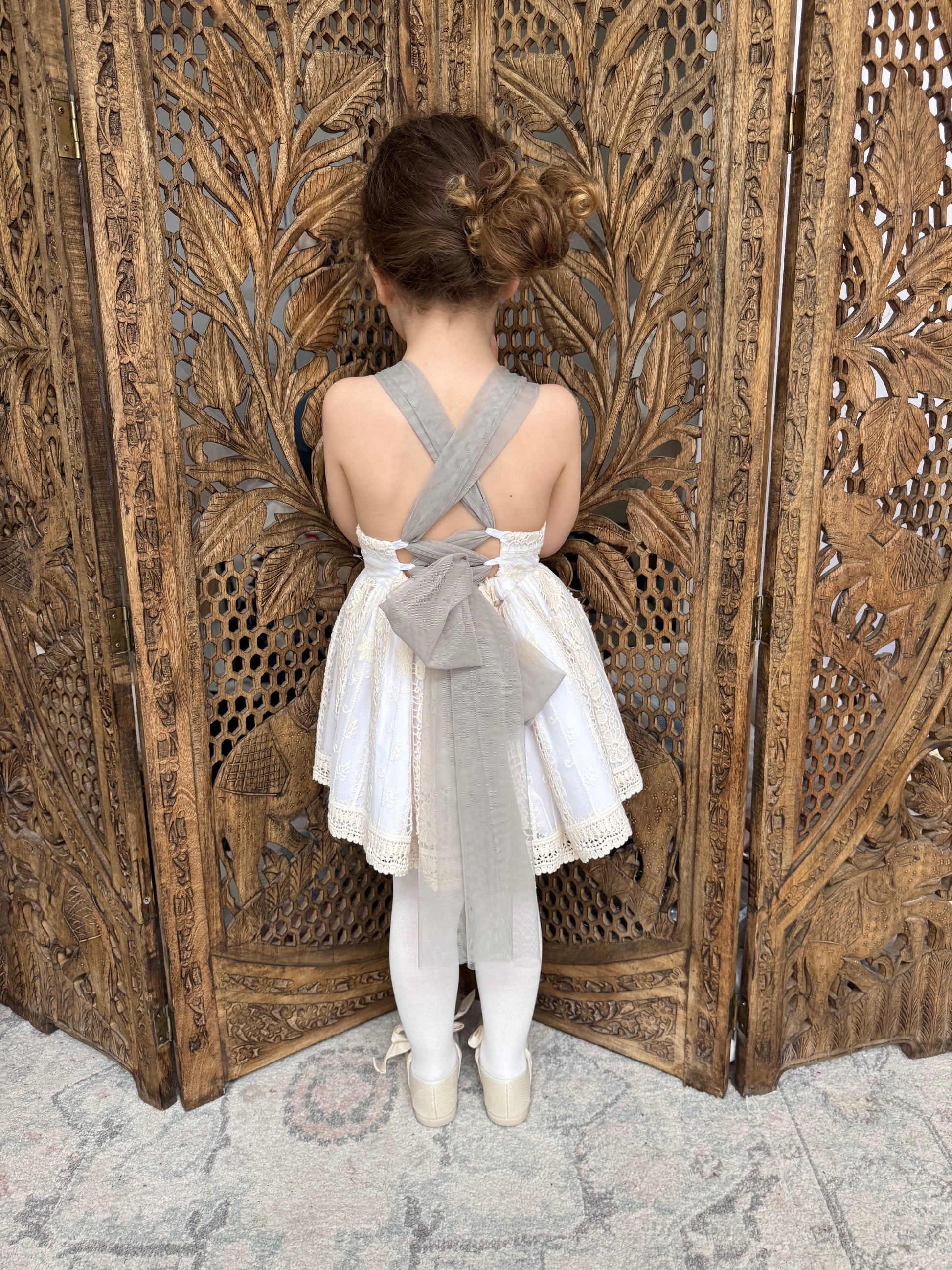 Fustan ceremonial me shpine jashte dhe detaje fjongo me tyl jeshil.