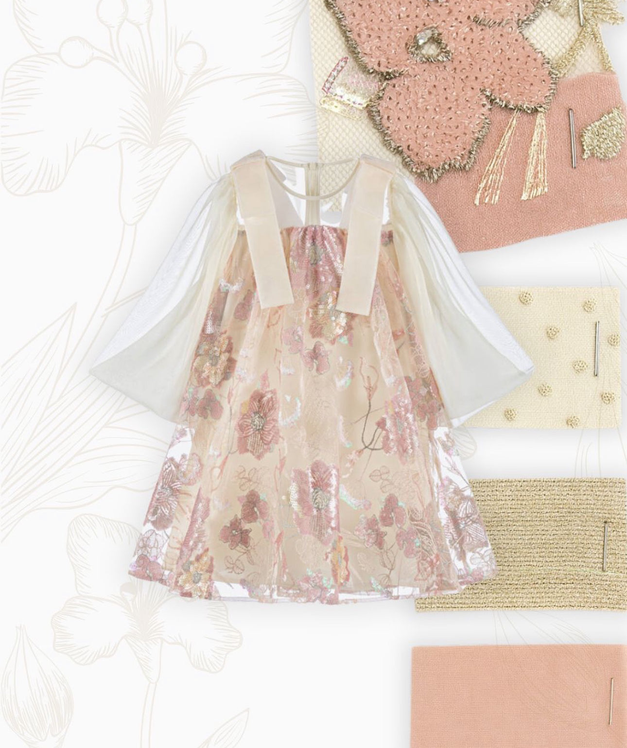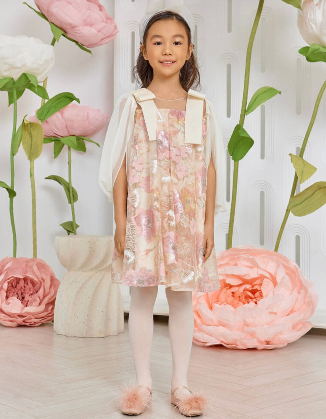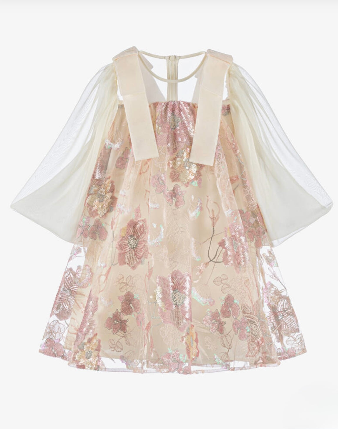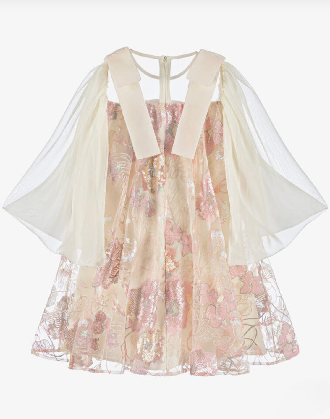 PINK AND IVORY SEQUIN FLORAL LACE DRESS WITH IVORY CHIFFON SLEEVES AND VELVET BOWS