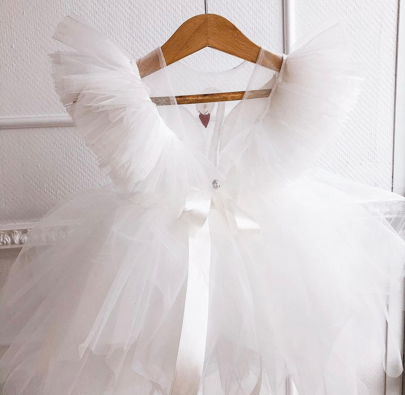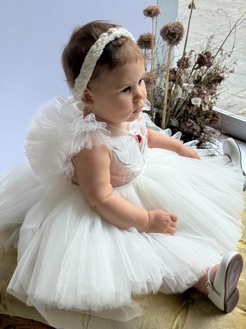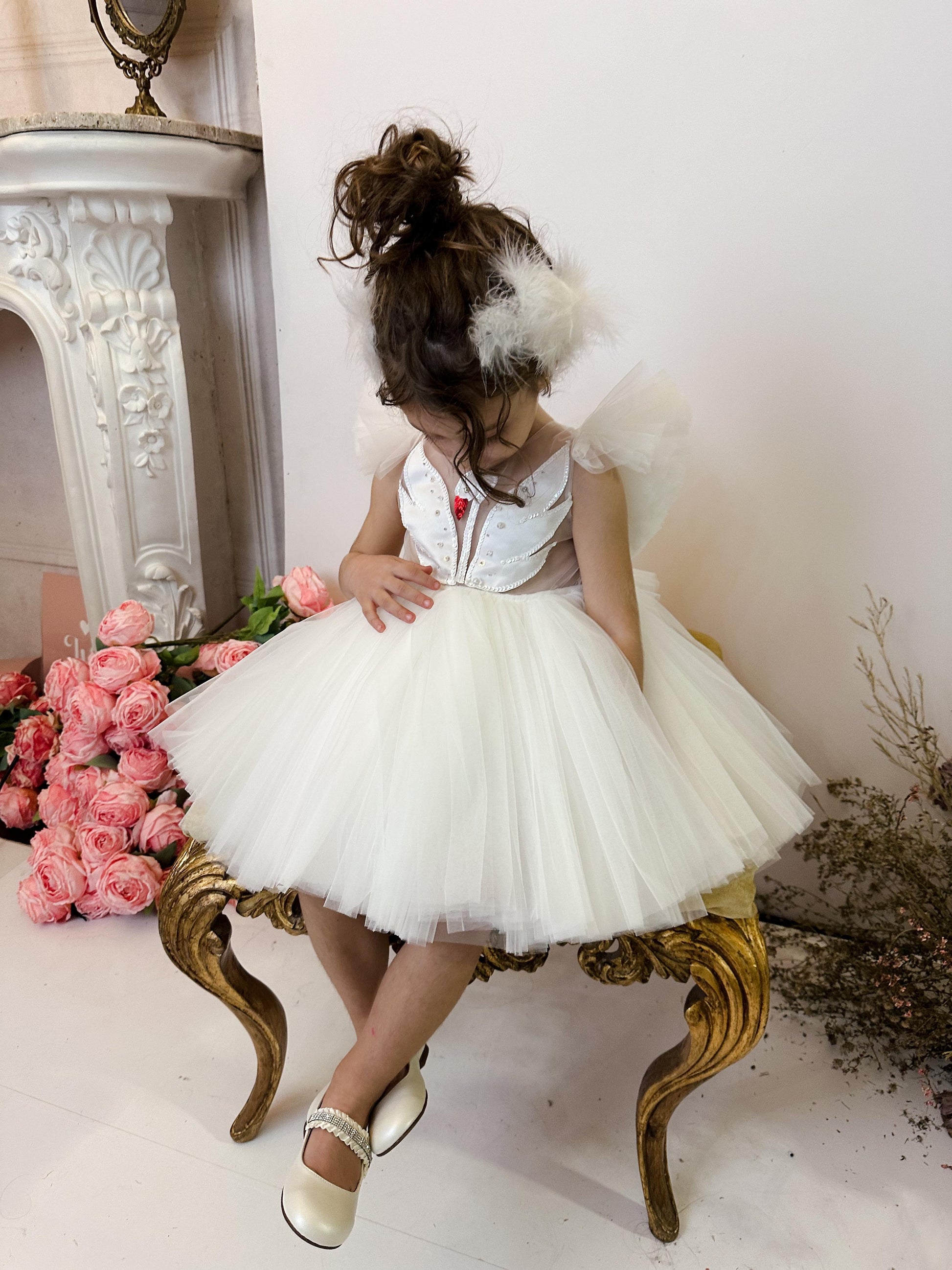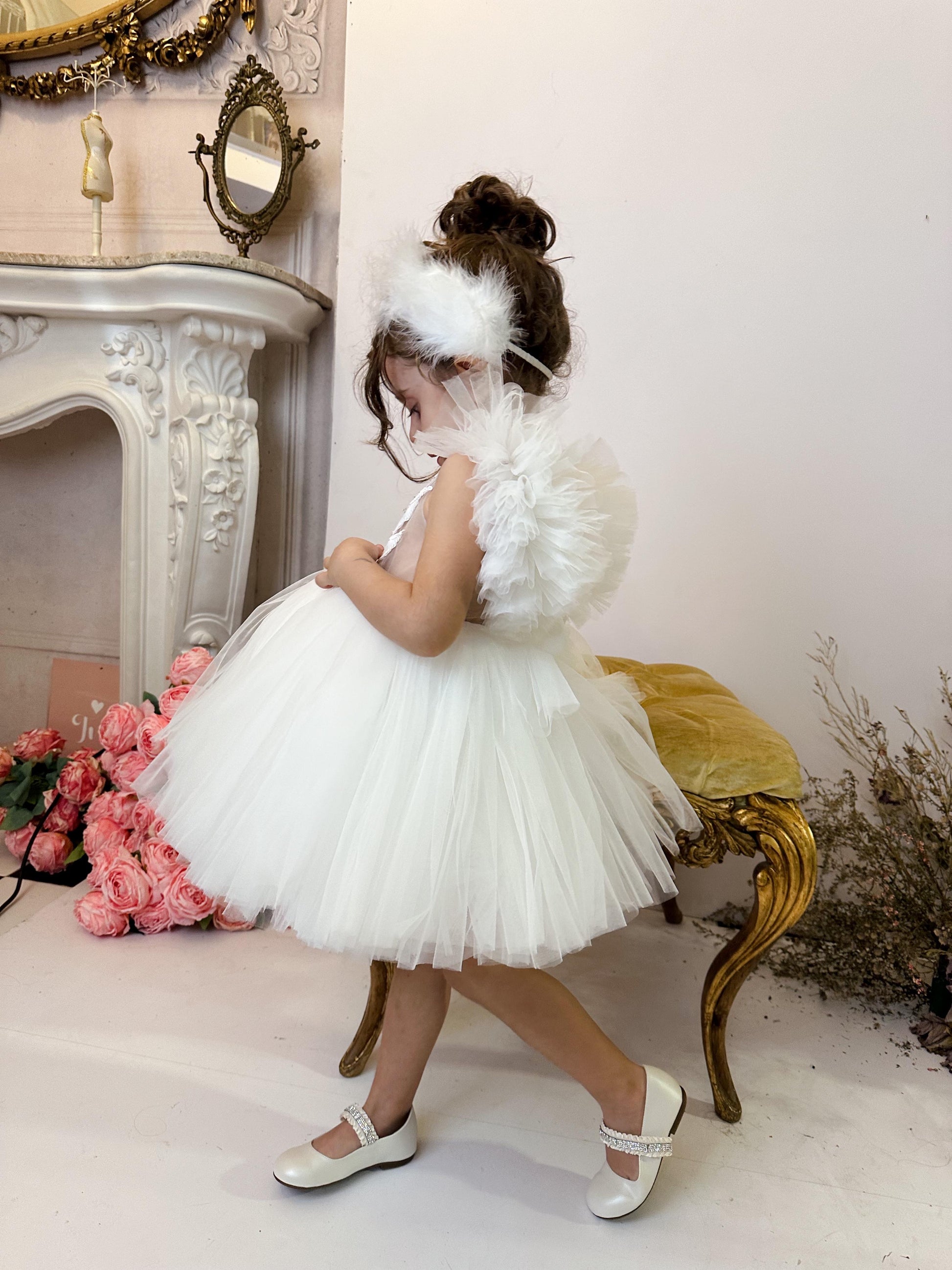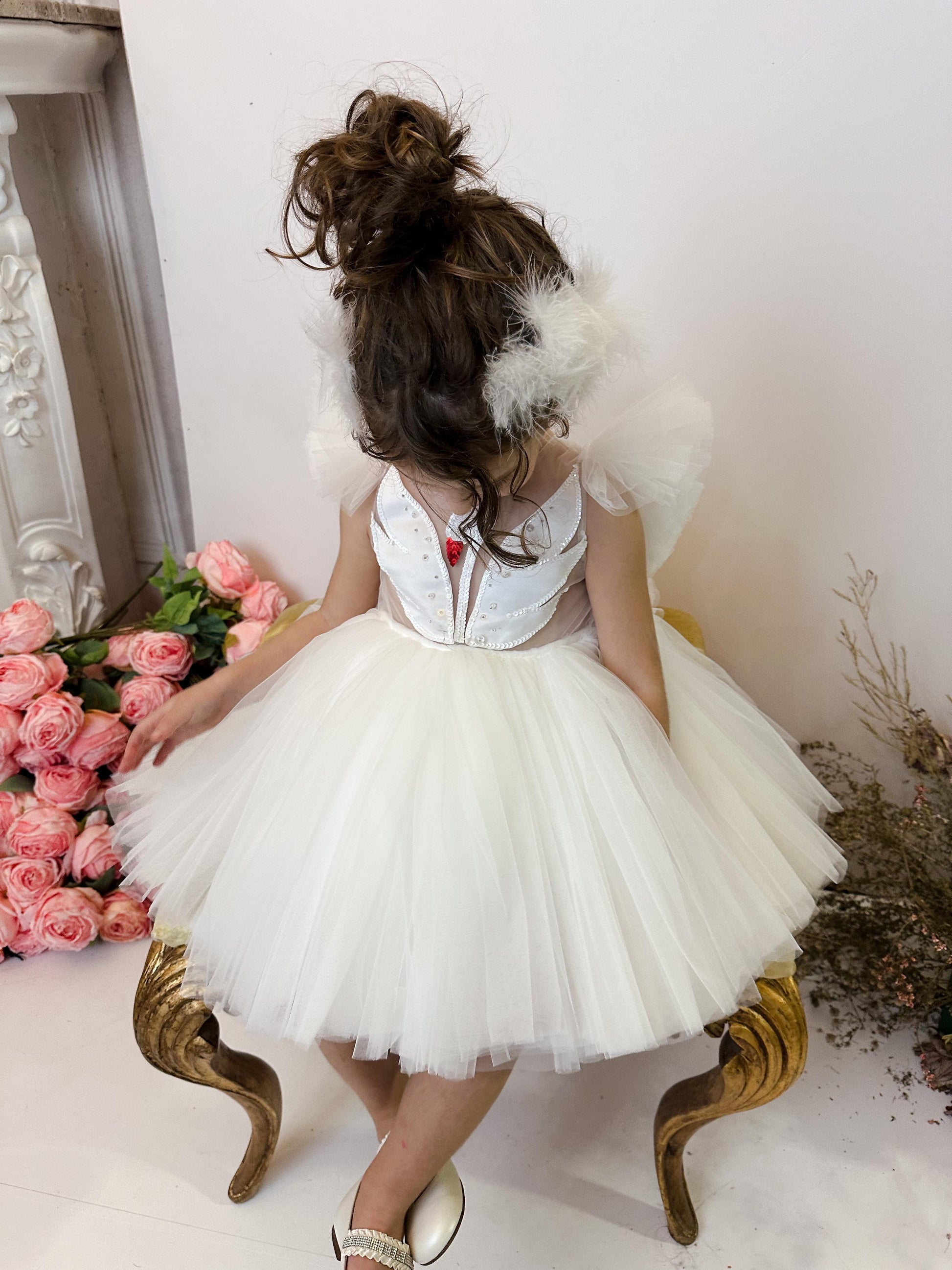 Fustani me mjelme, me tyl dhe detaje teminash.