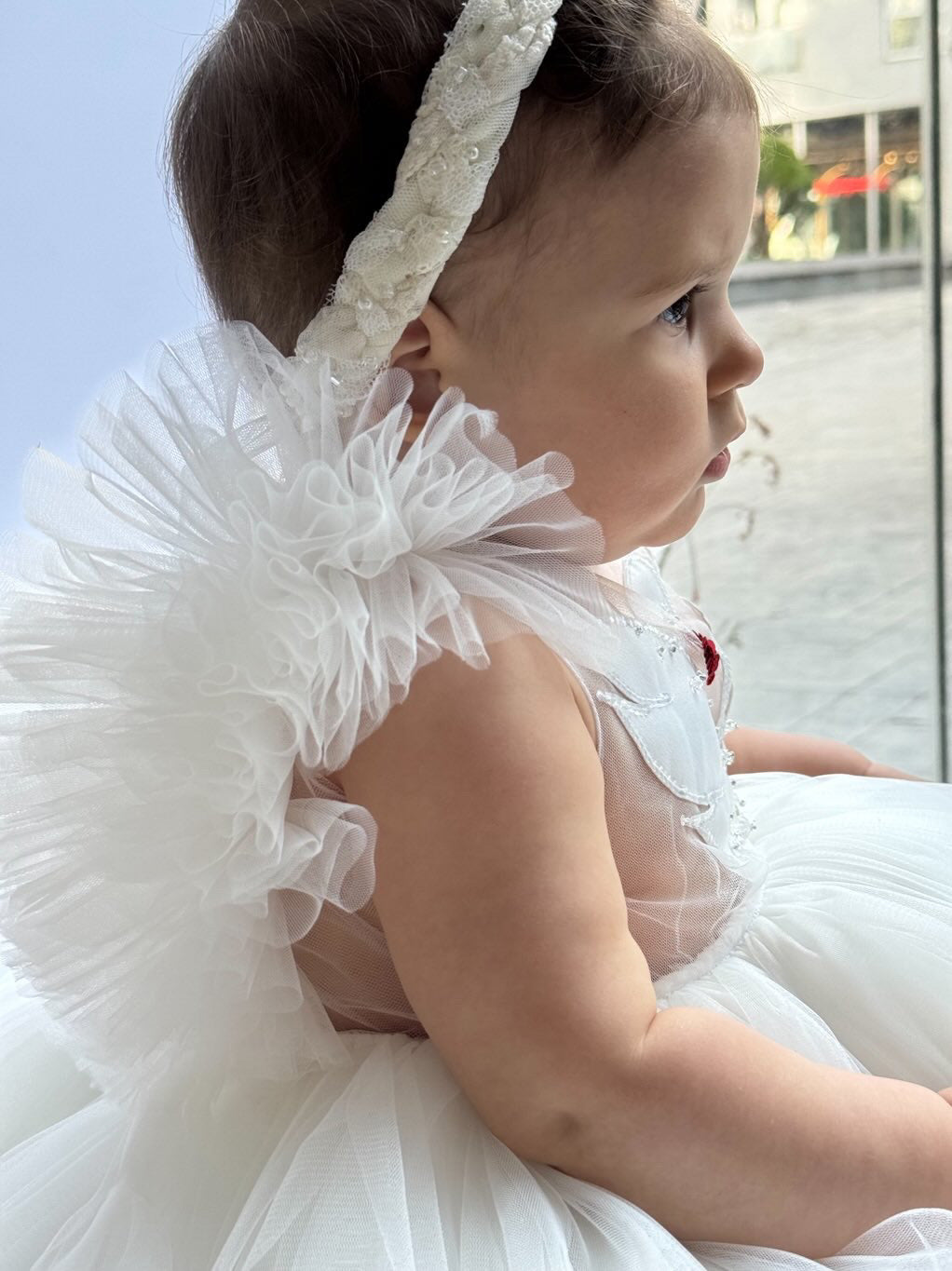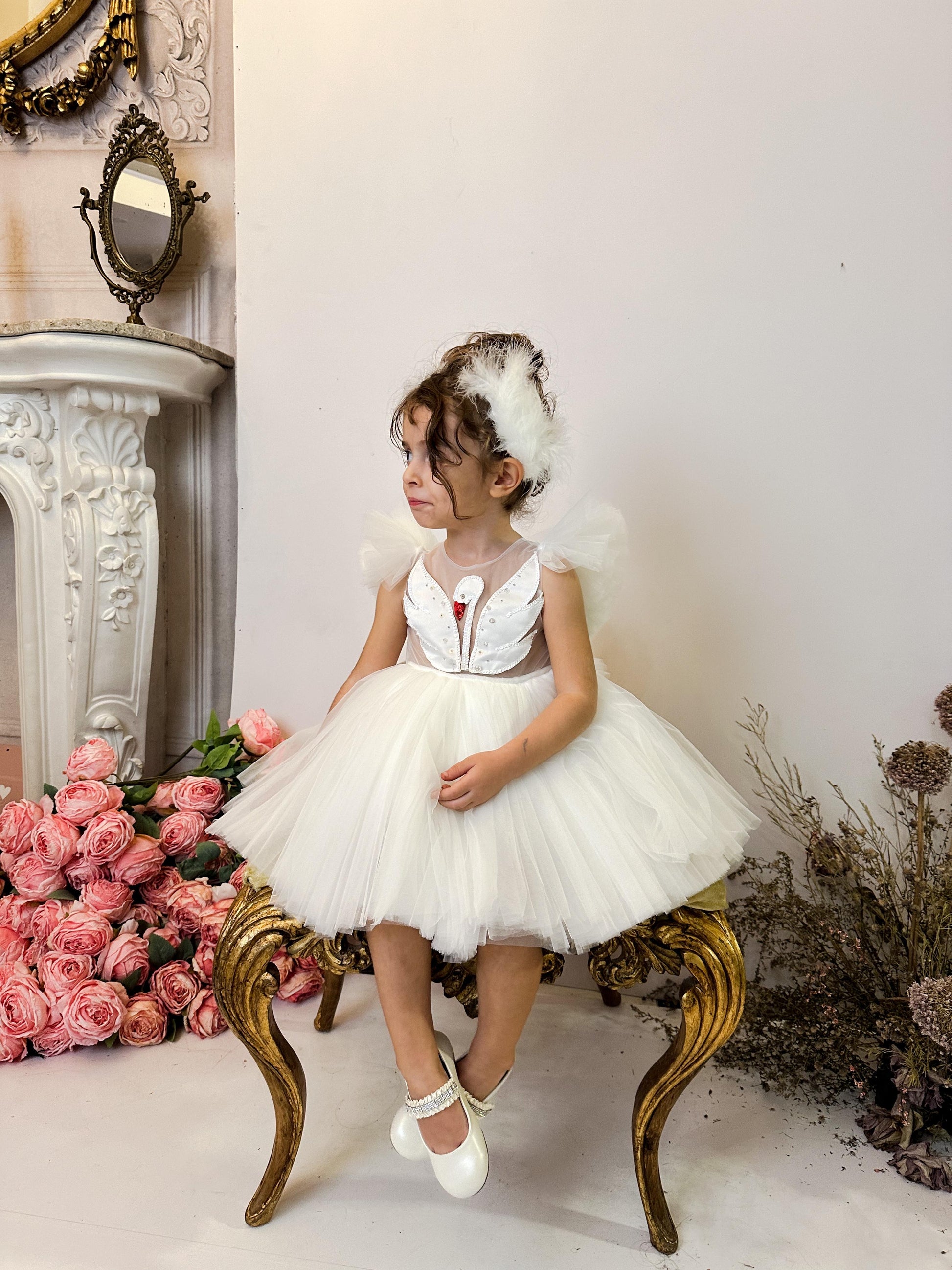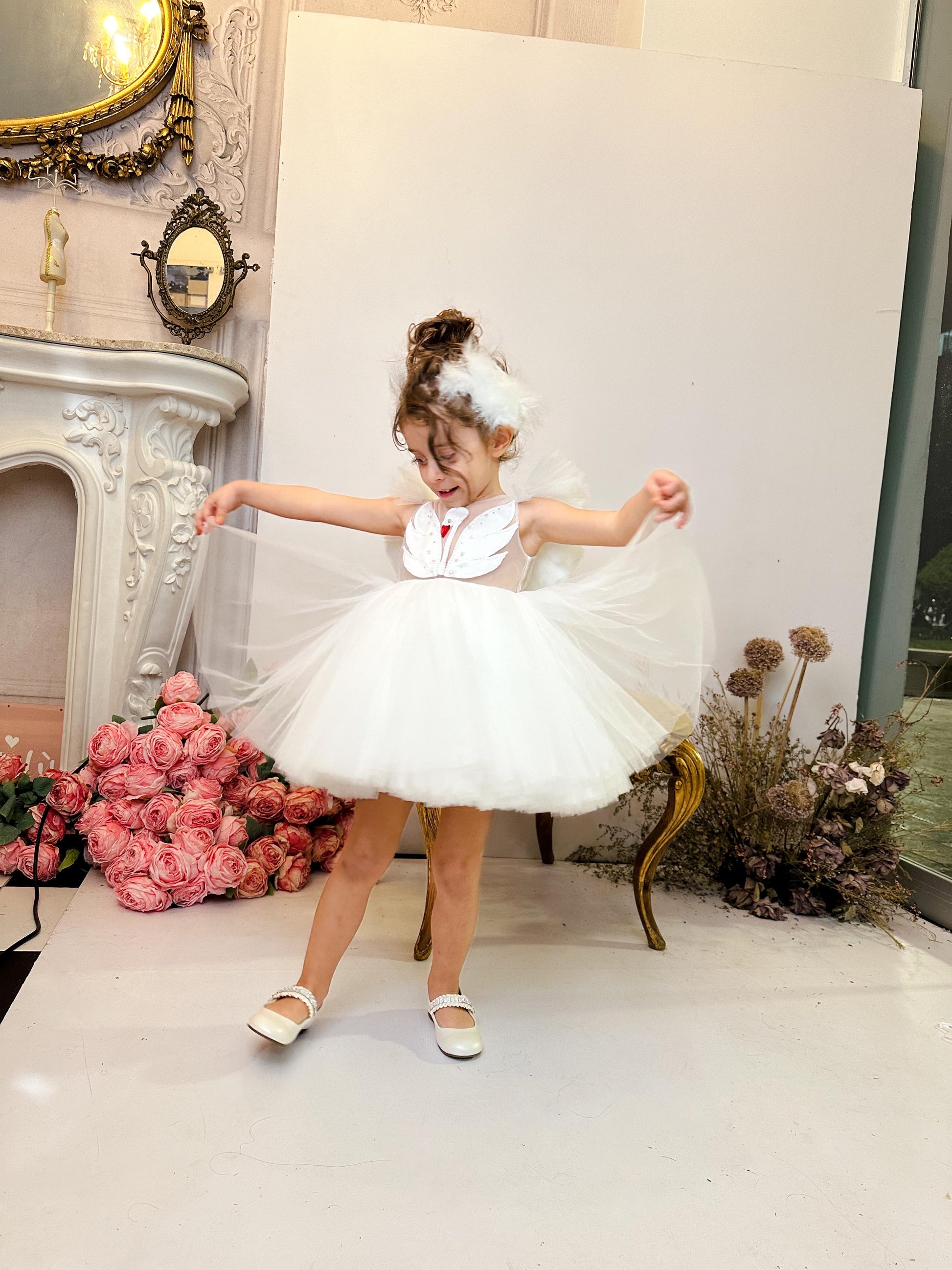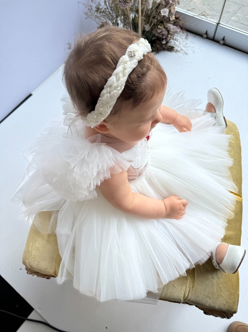 Fustani me mjelme, me tyl dhe detaje teminash.