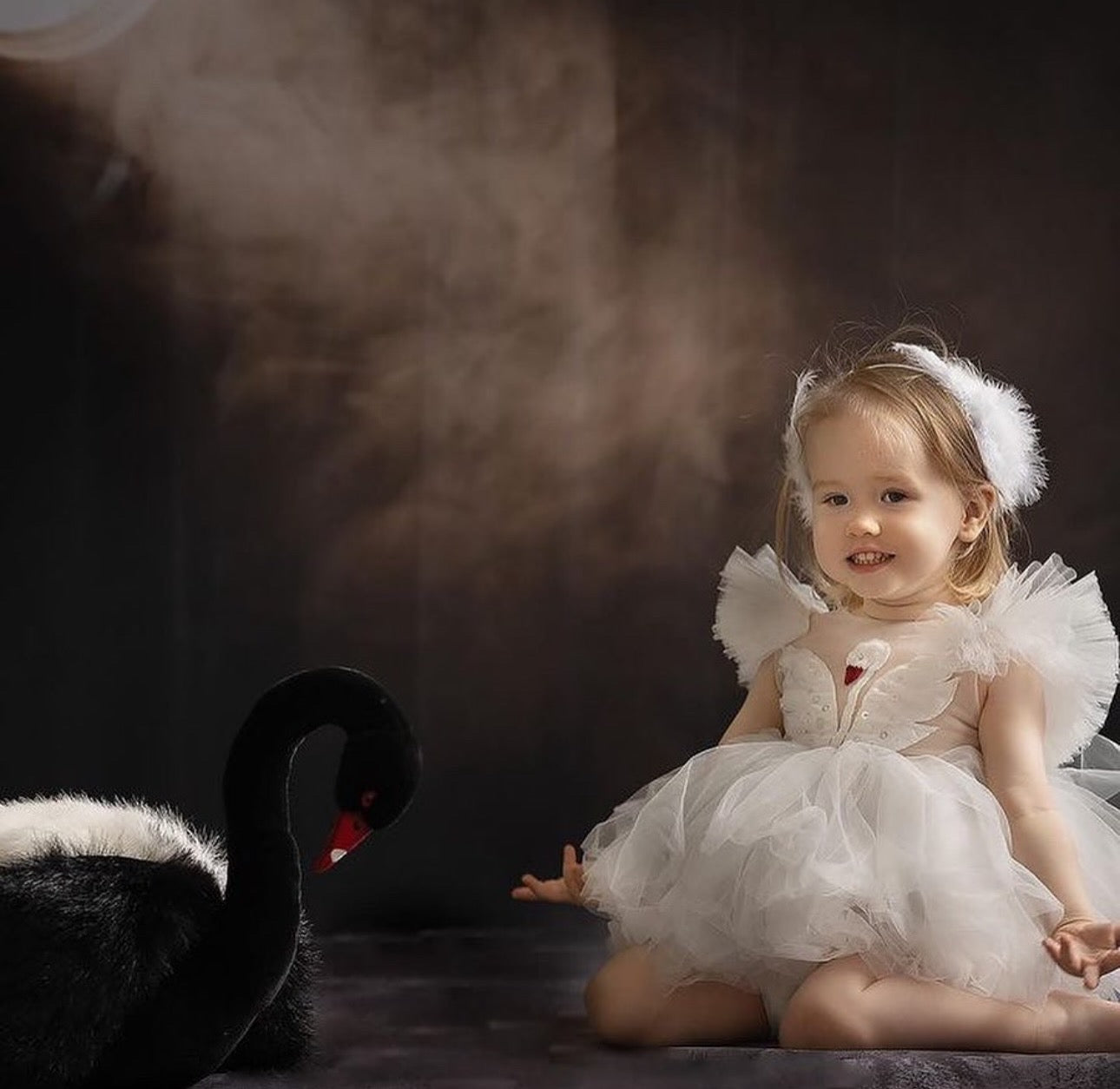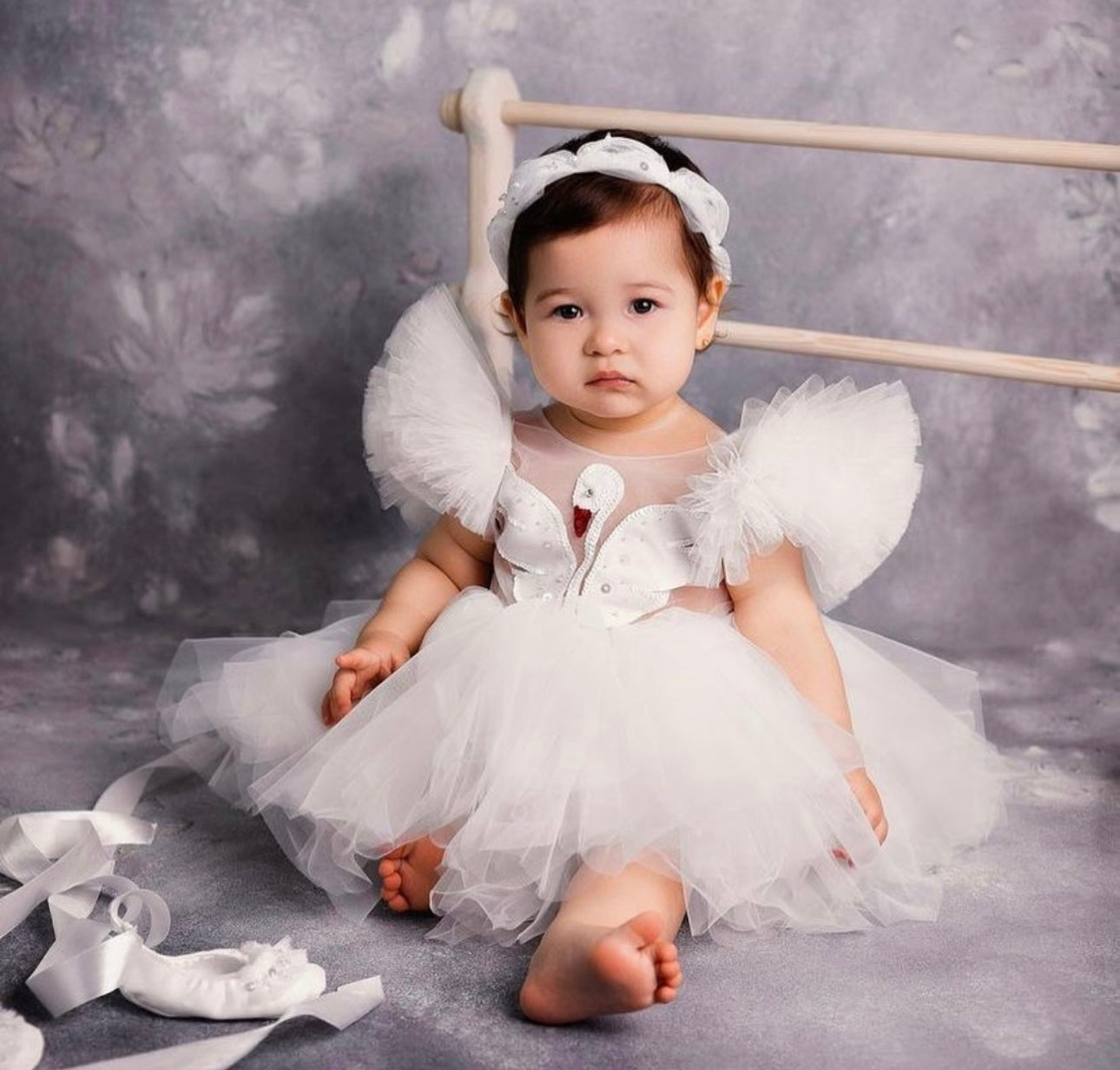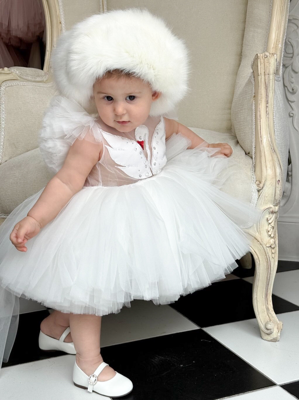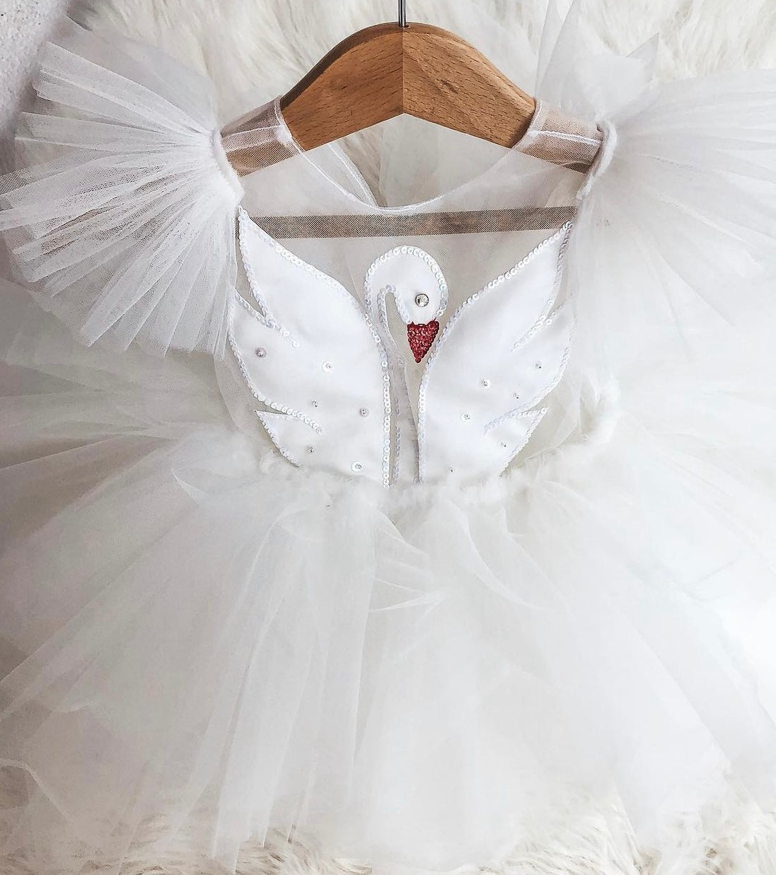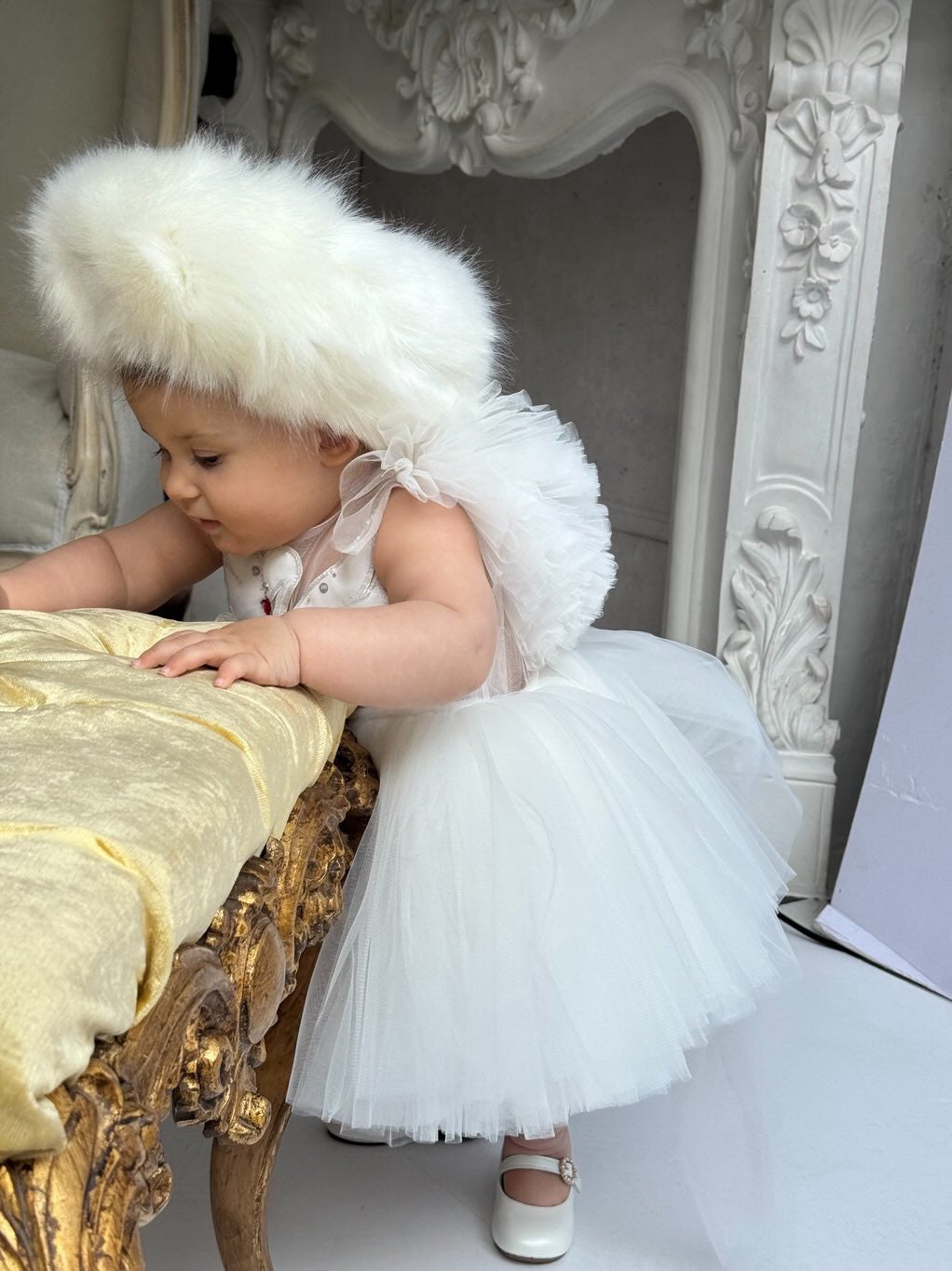 Fustani me mjelme, me tyl dhe detaje teminash.