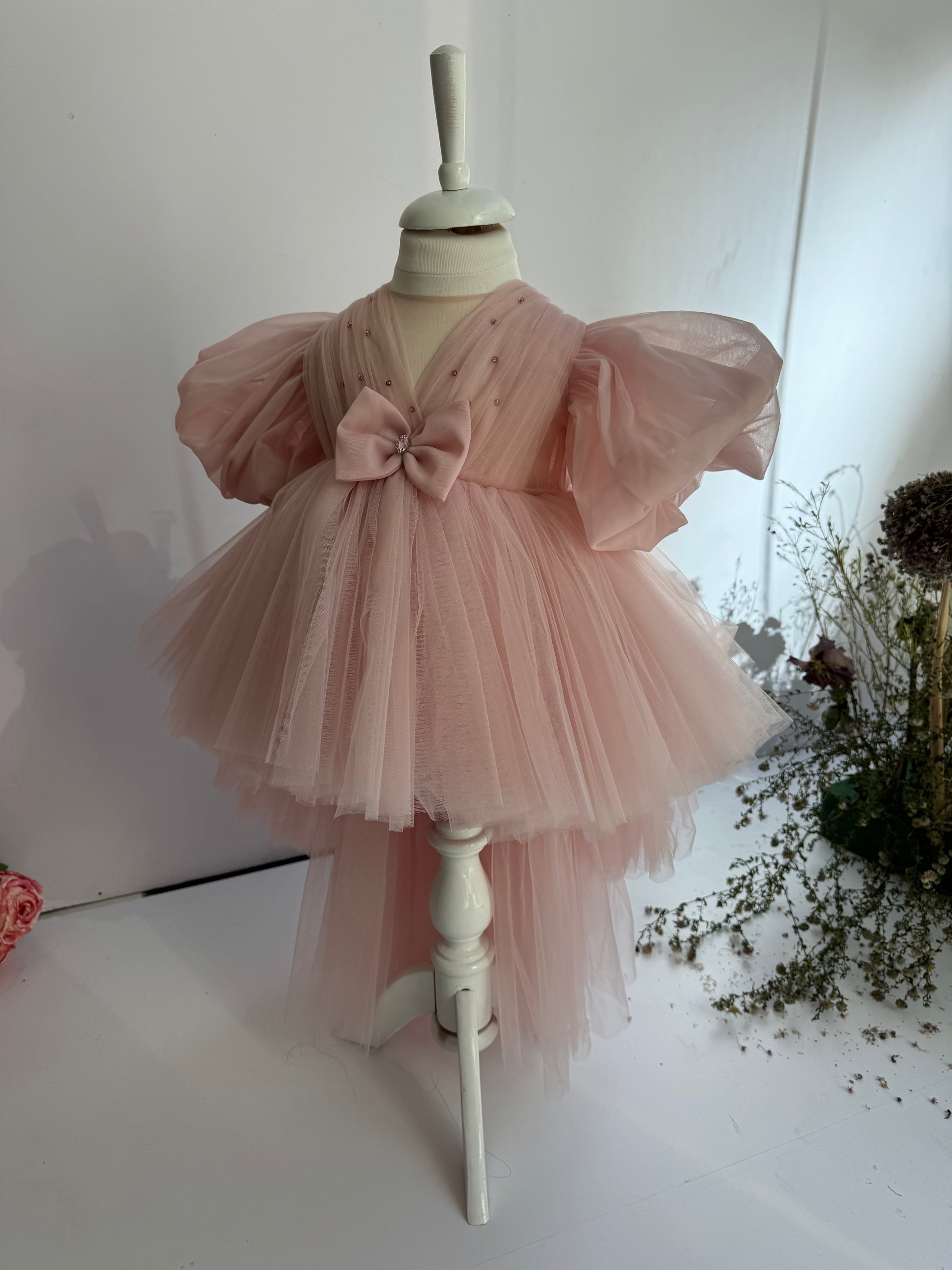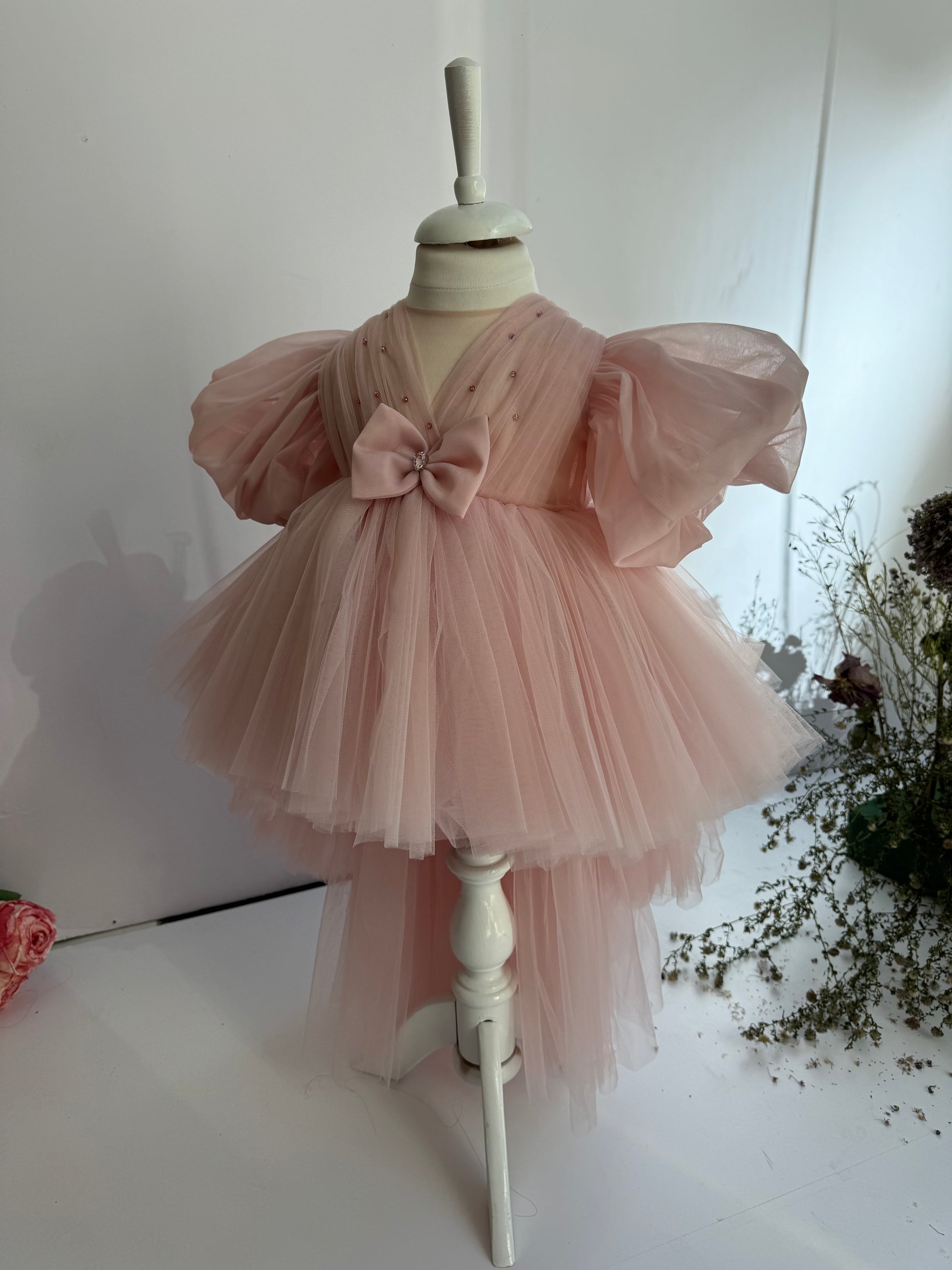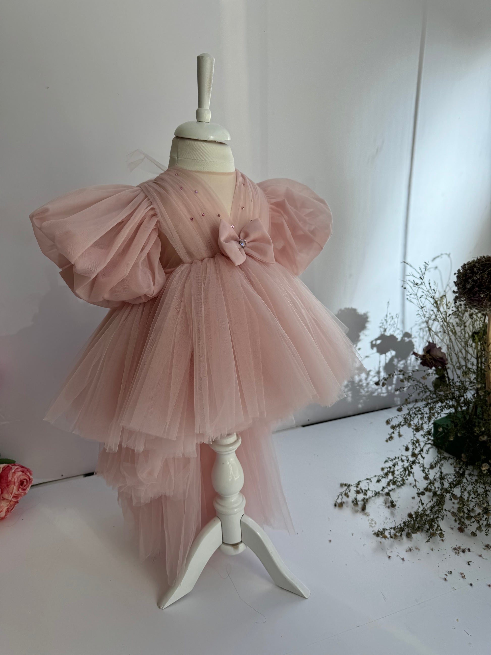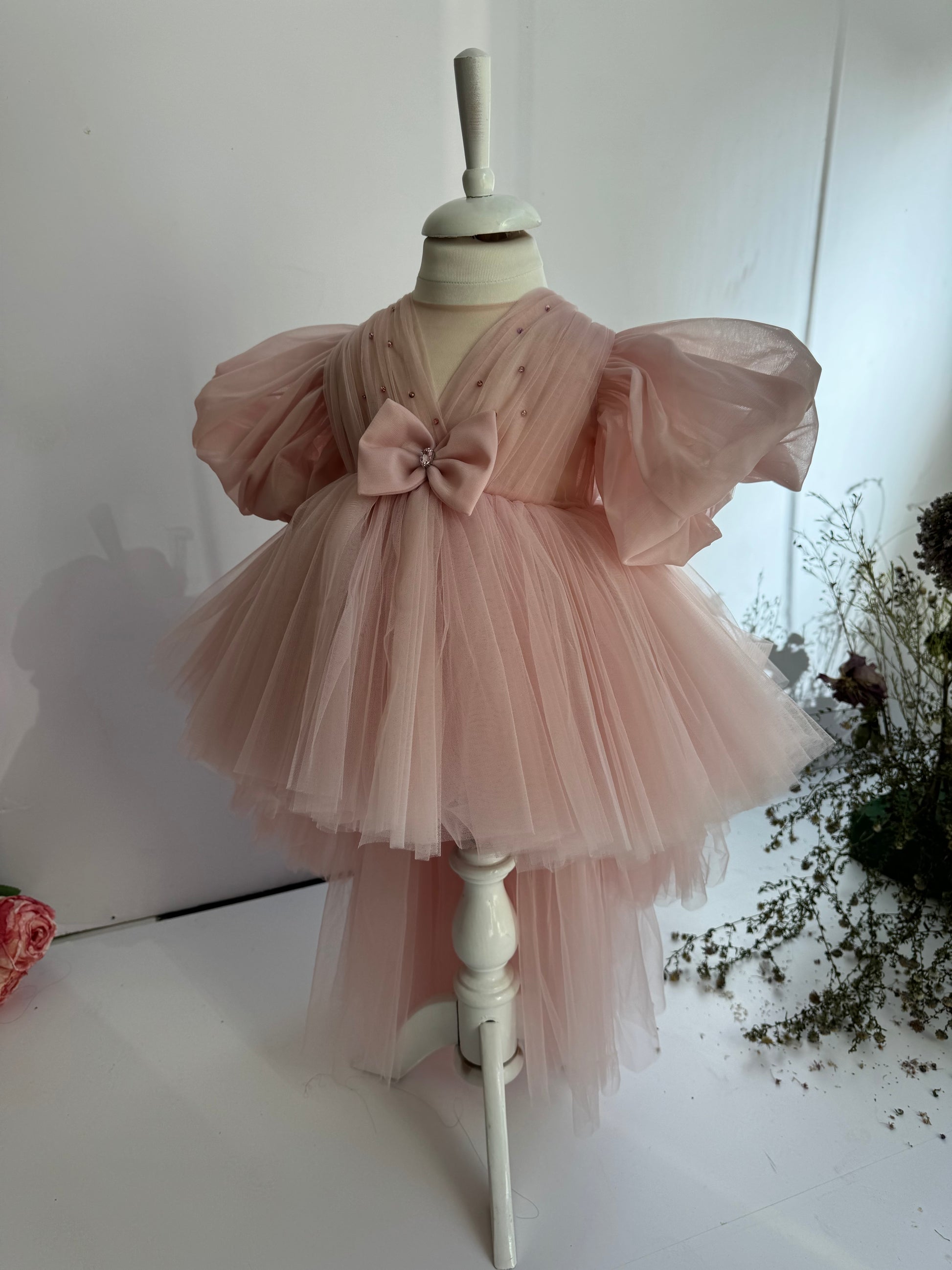 Fustan madheshtor eventesh, me shtresa tyli, detajin e fjongos dhe bisht.