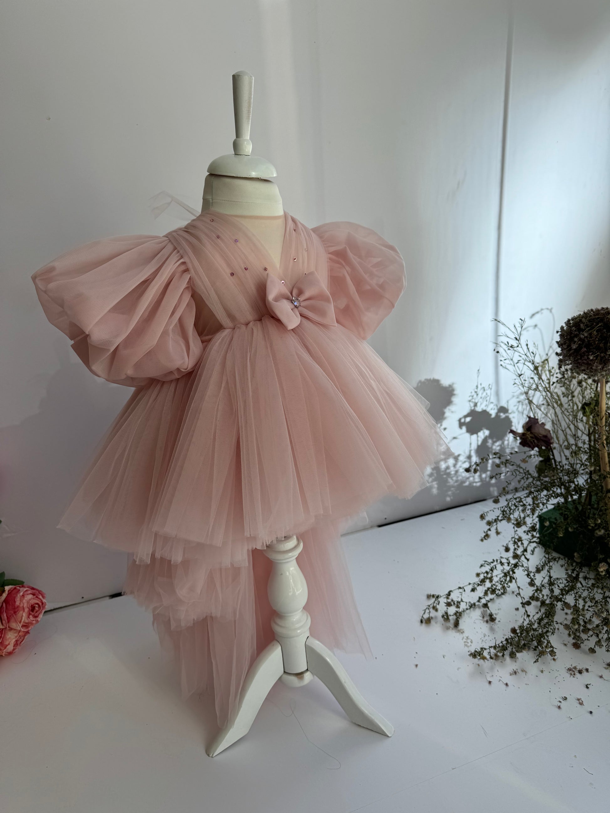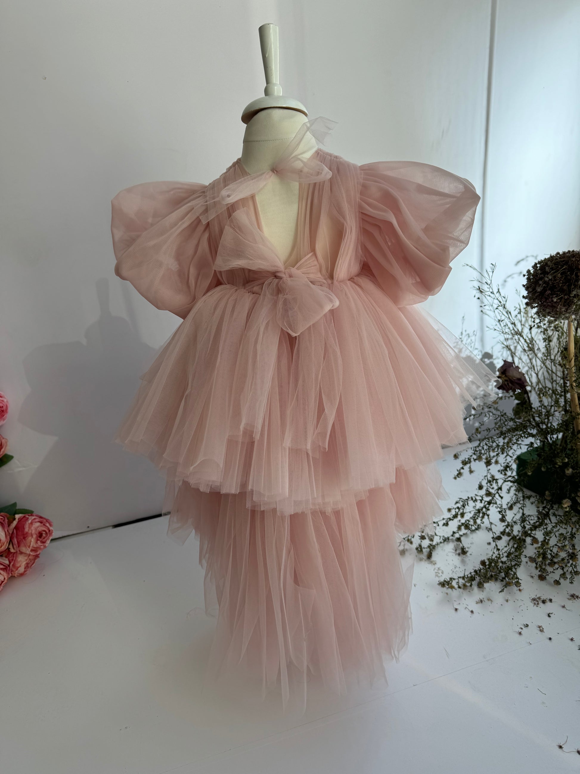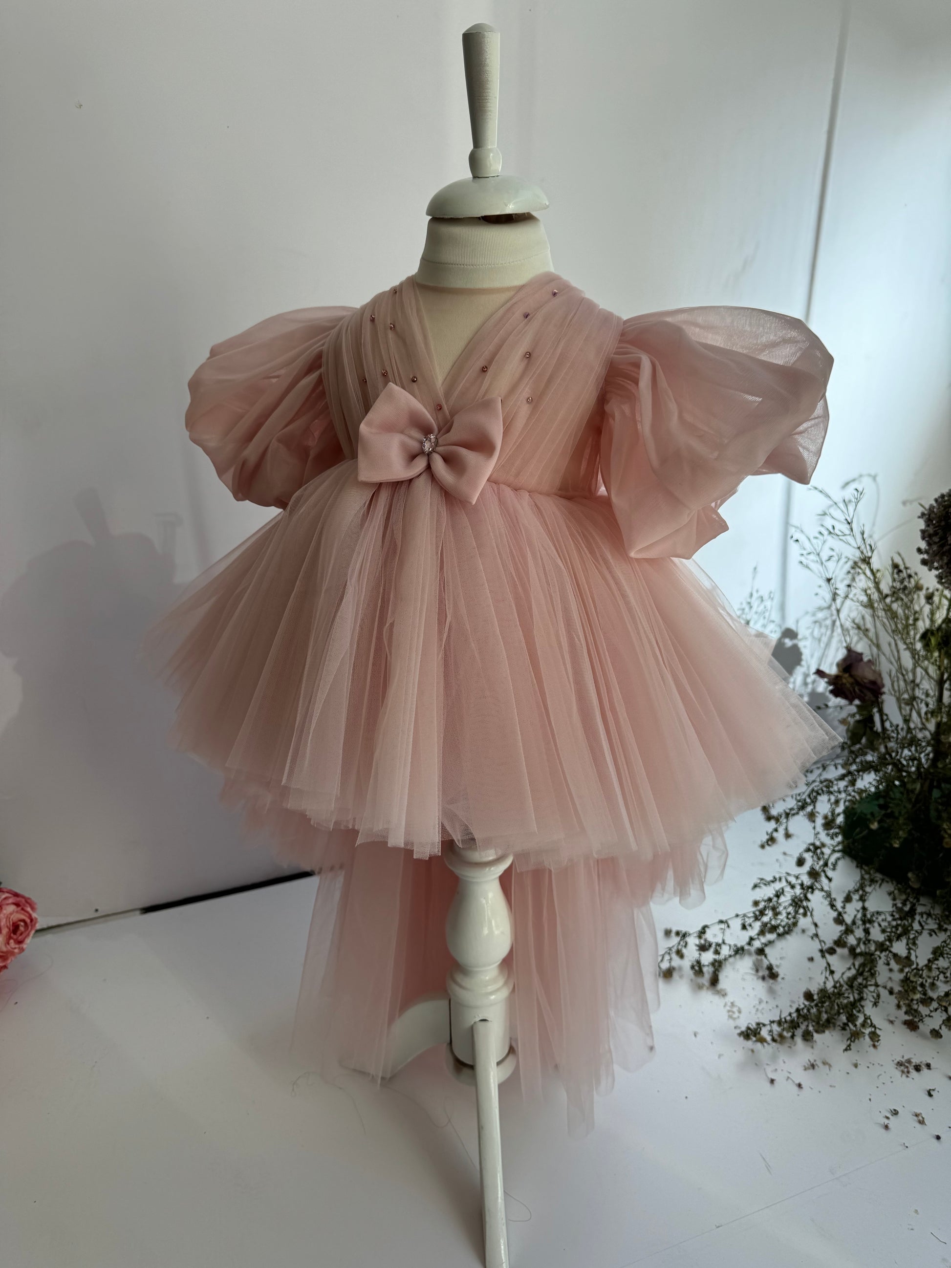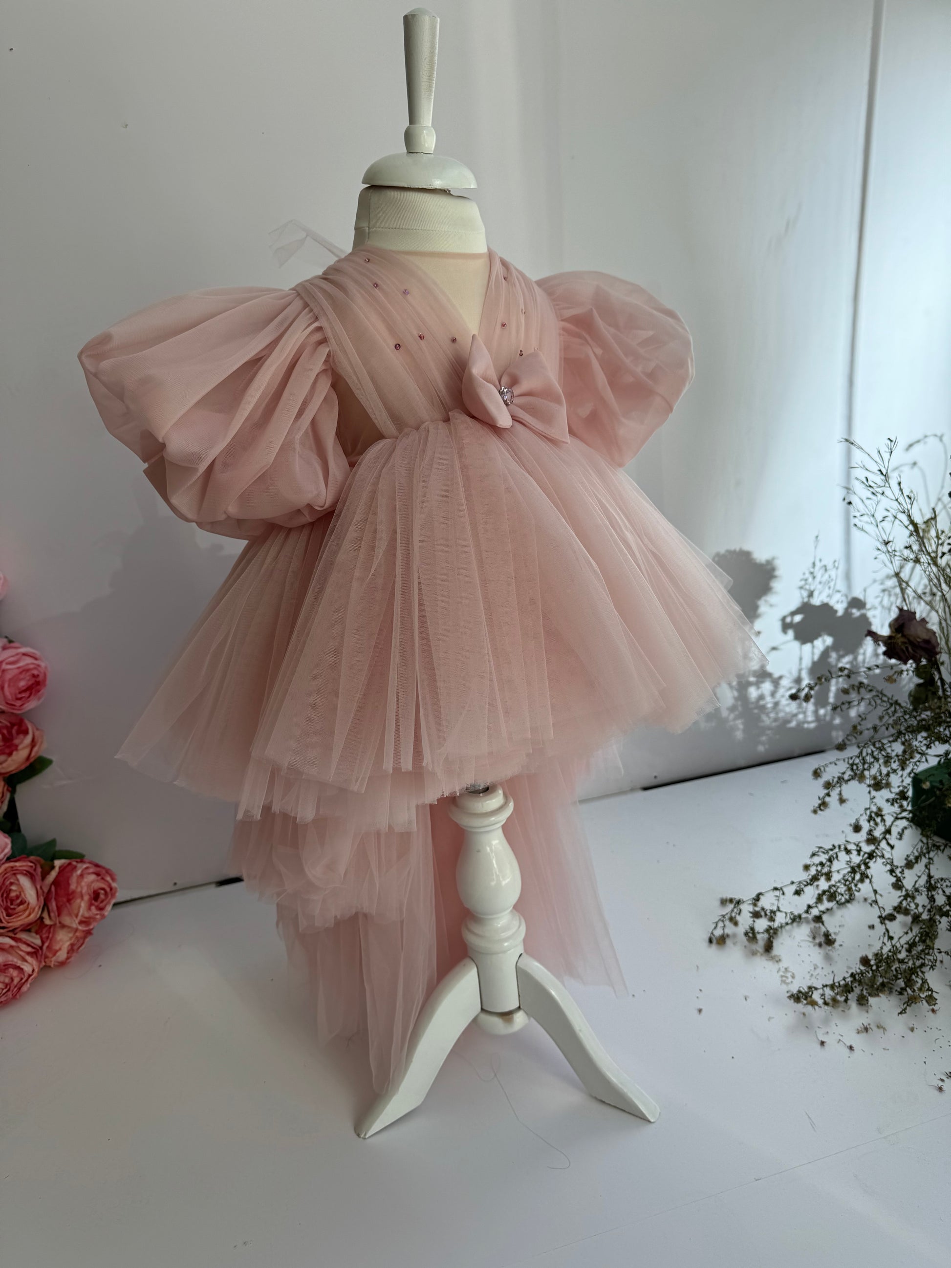 Fustan madheshtor eventesh, me shtresa tyli, detajin e fjongos dhe bisht.