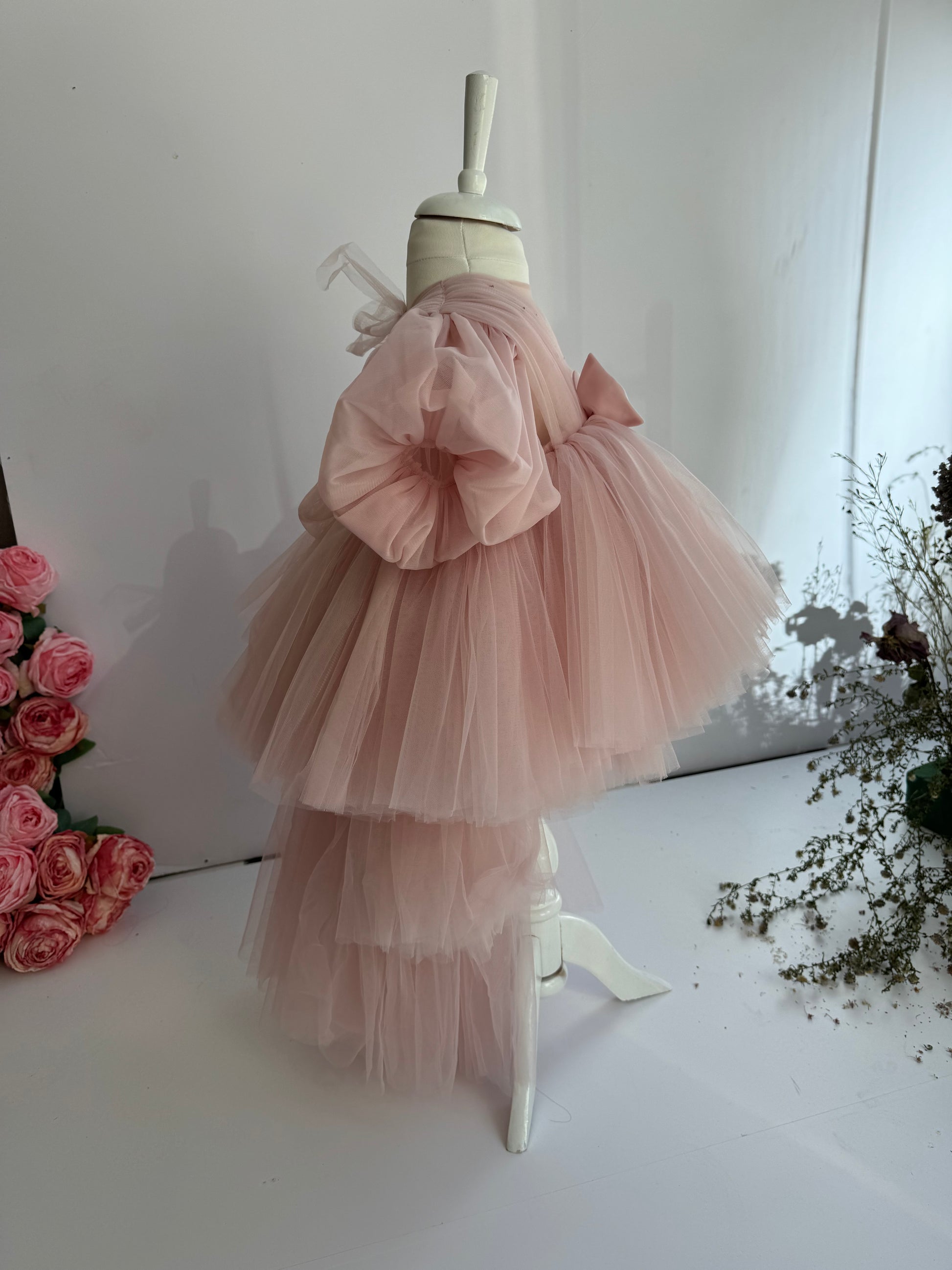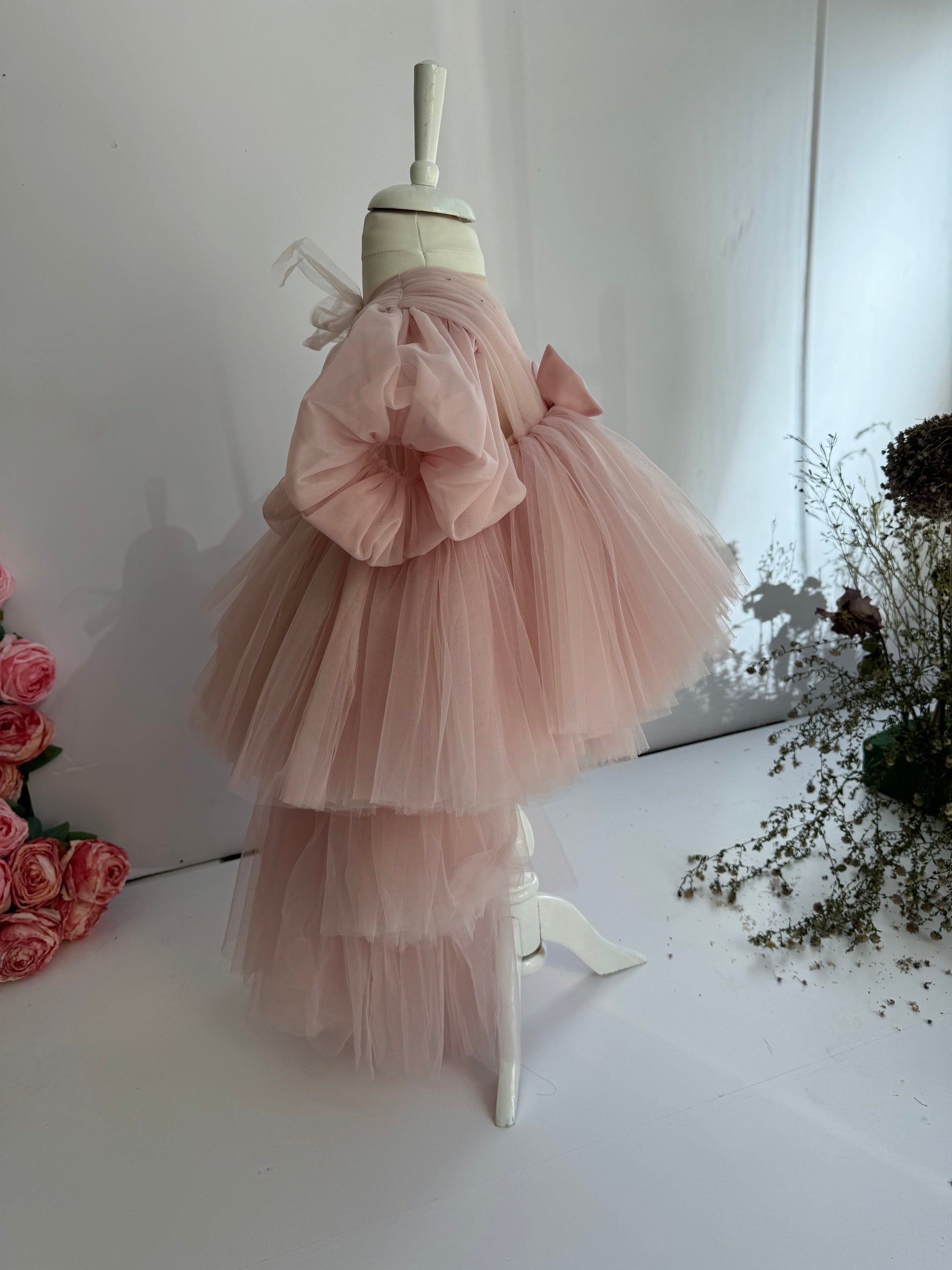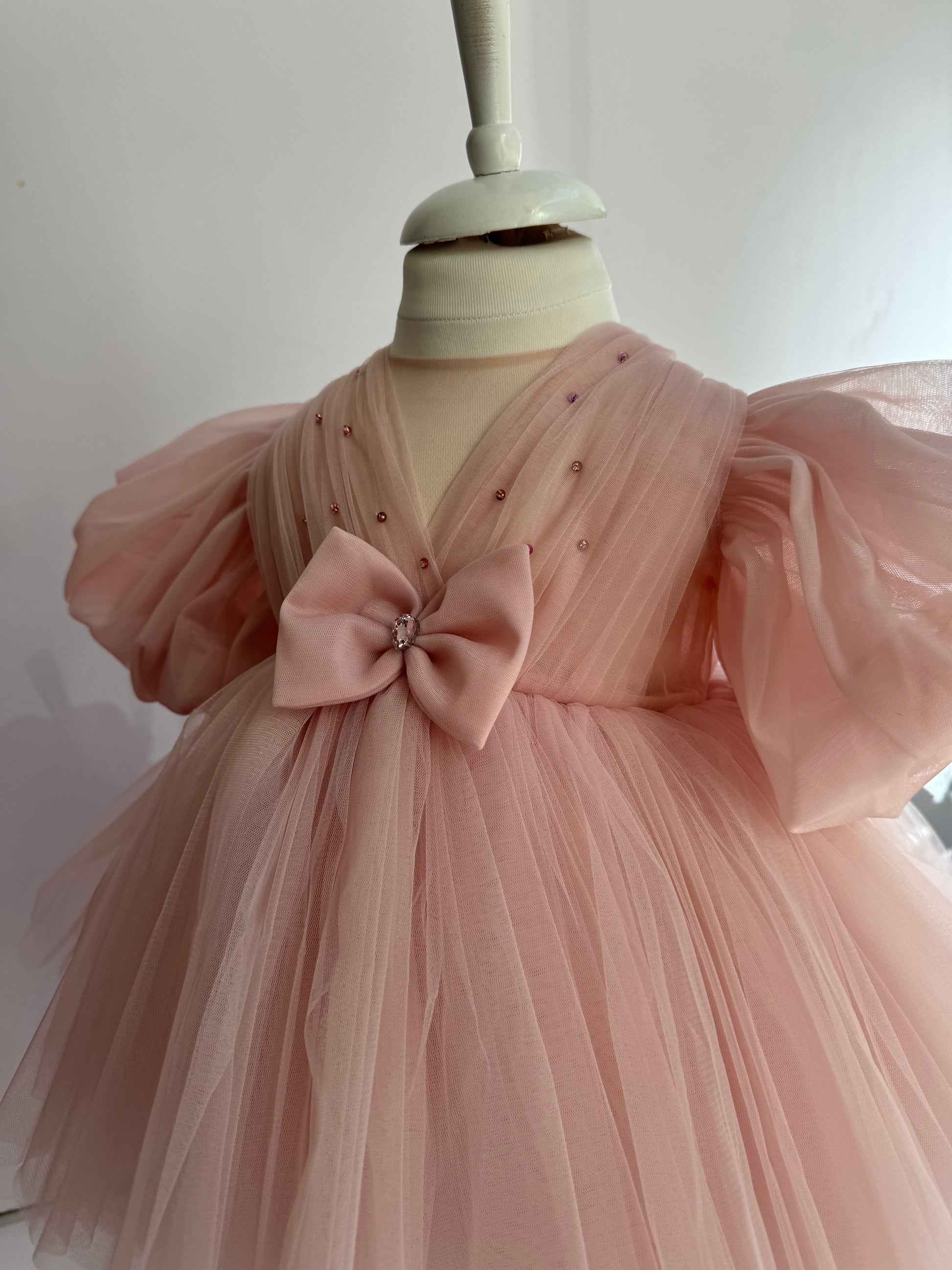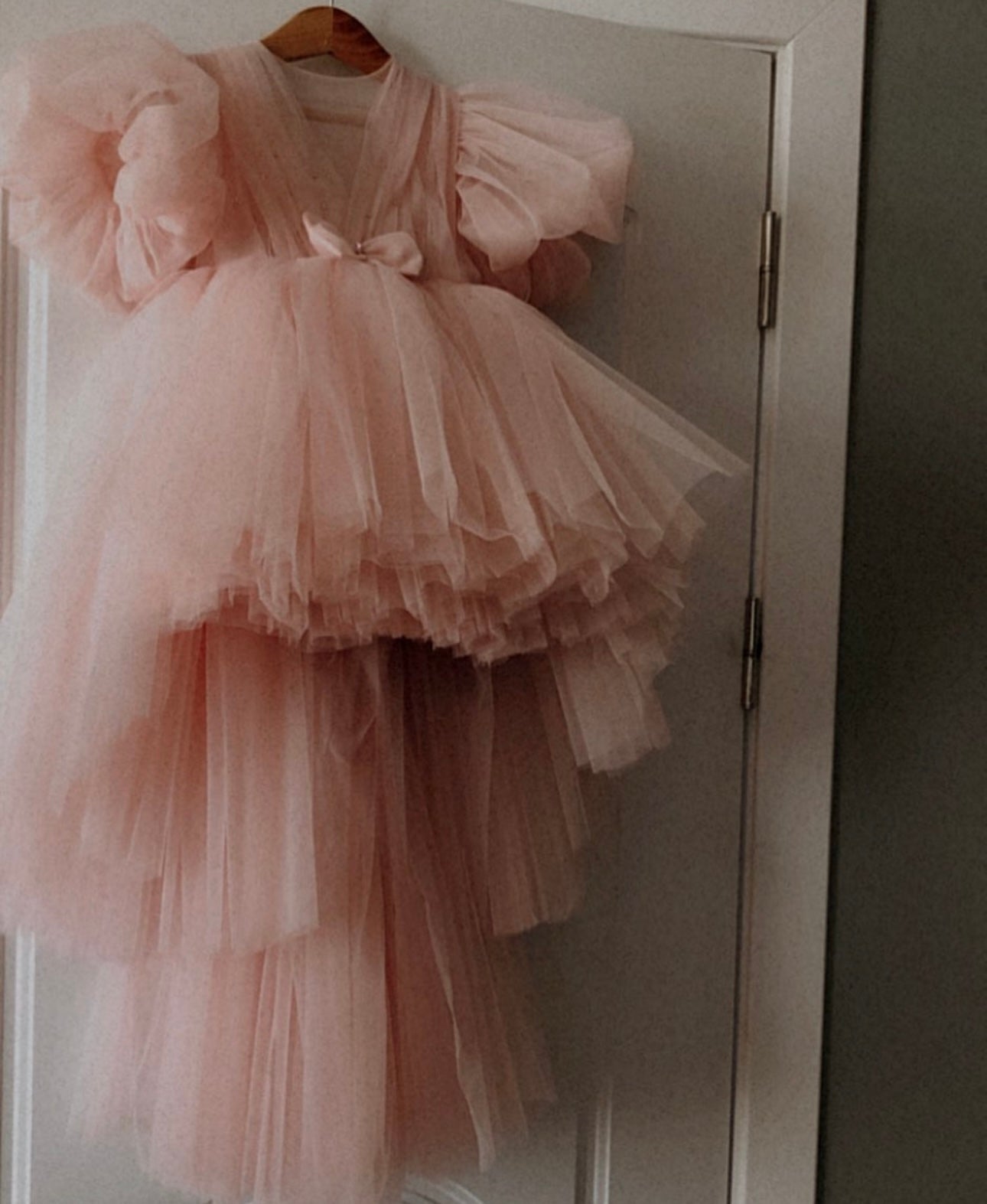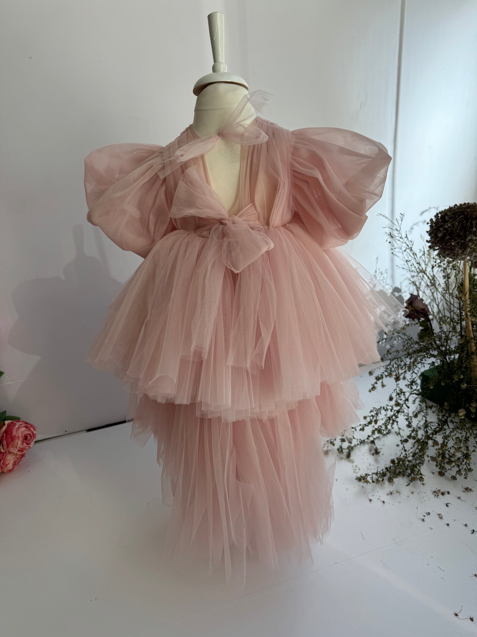 Fustan madheshtor eventesh, me shtresa tyli, detajin e fjongos dhe bisht.
