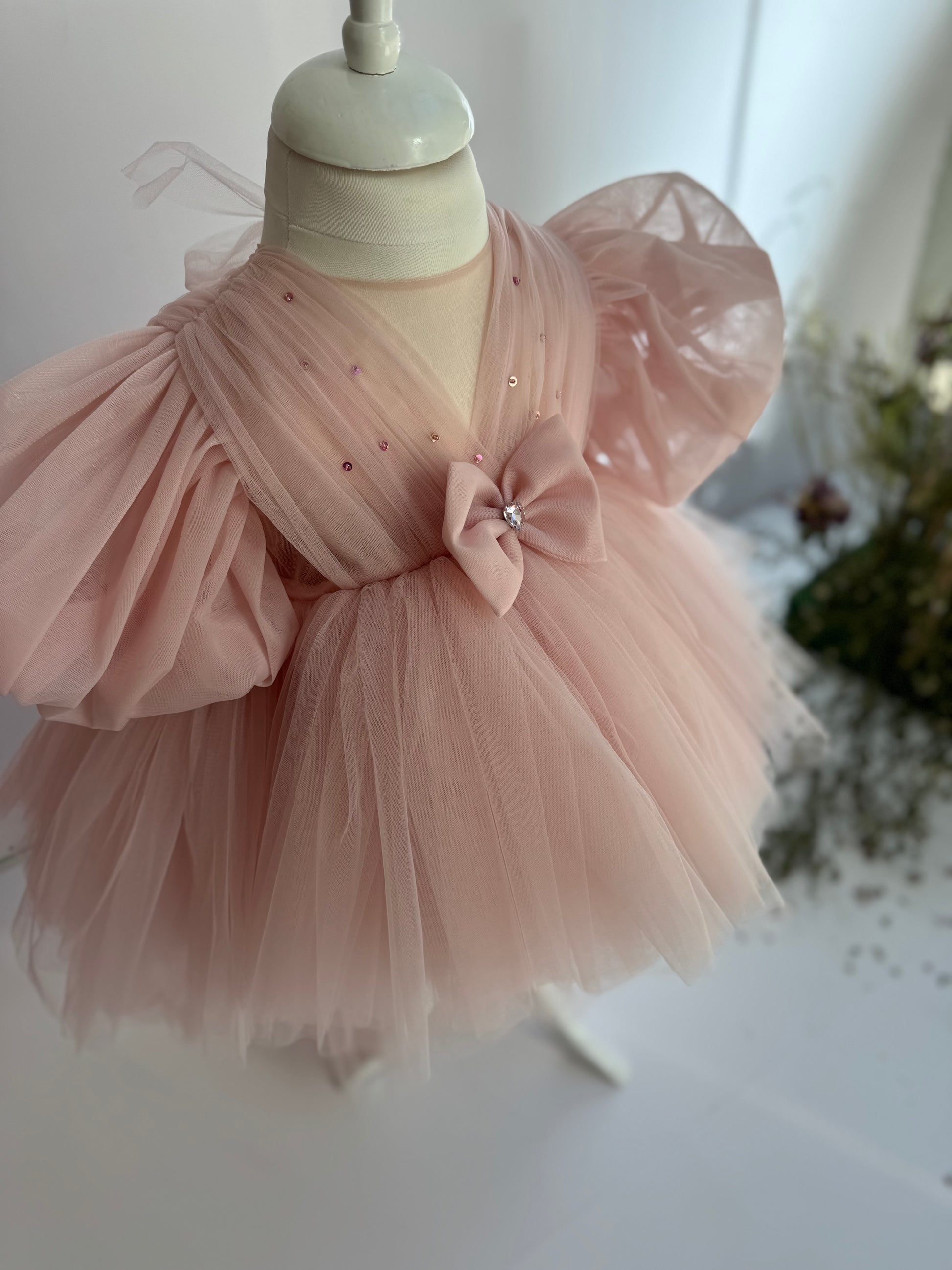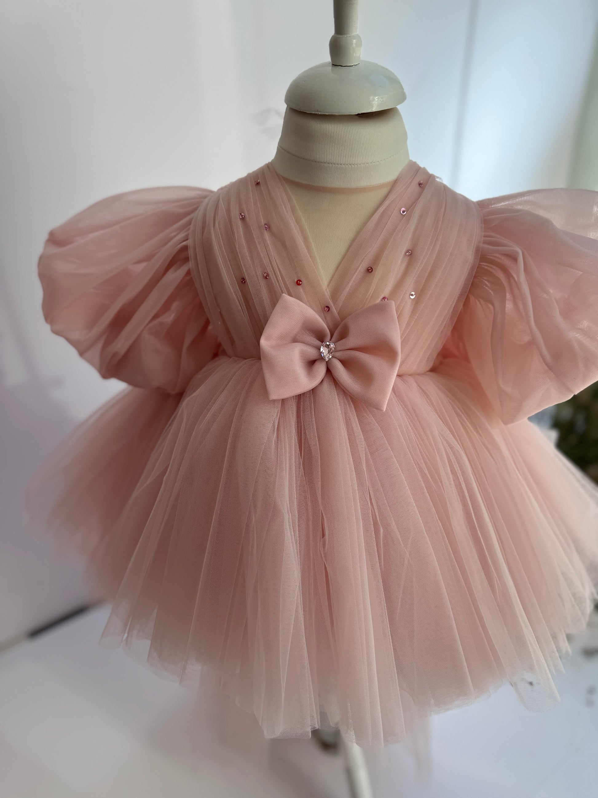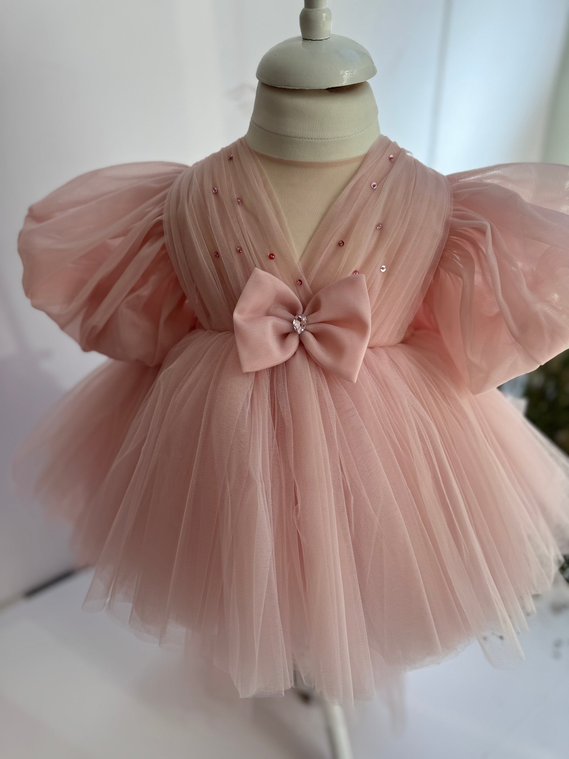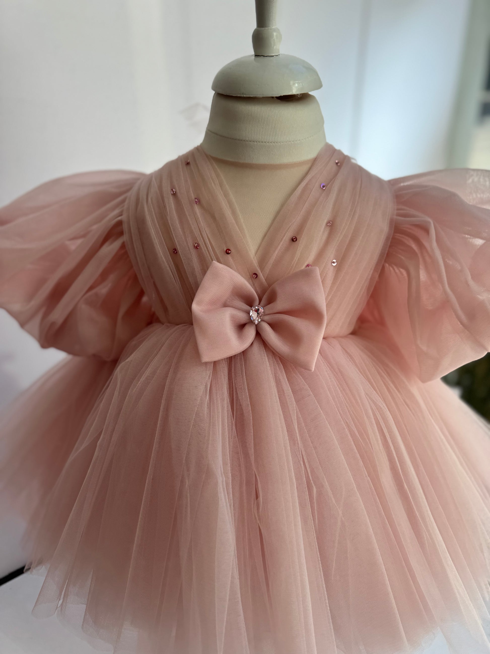 Fustan madheshtor eventesh, me shtresa tyli, detajin e fjongos dhe bisht.