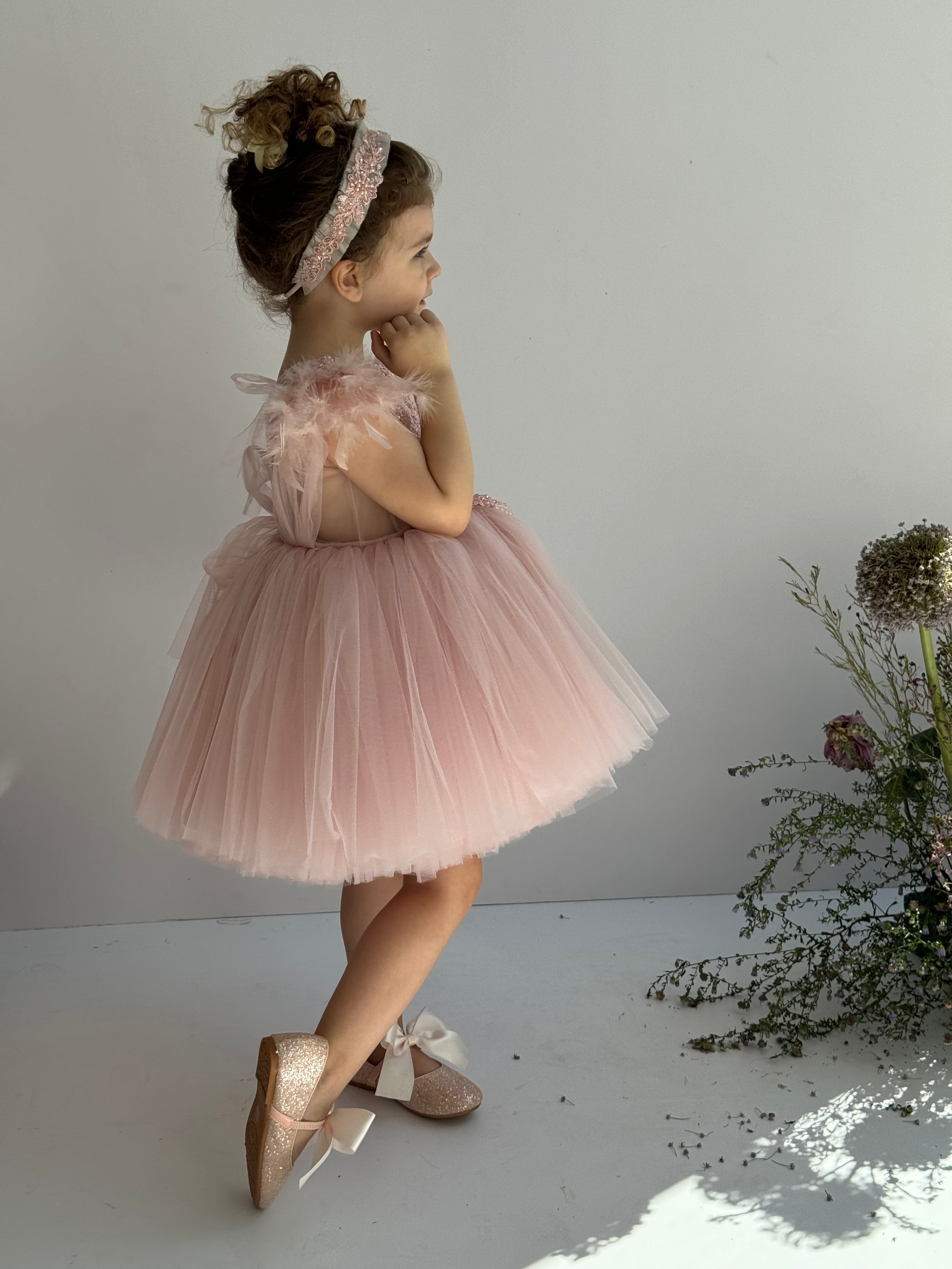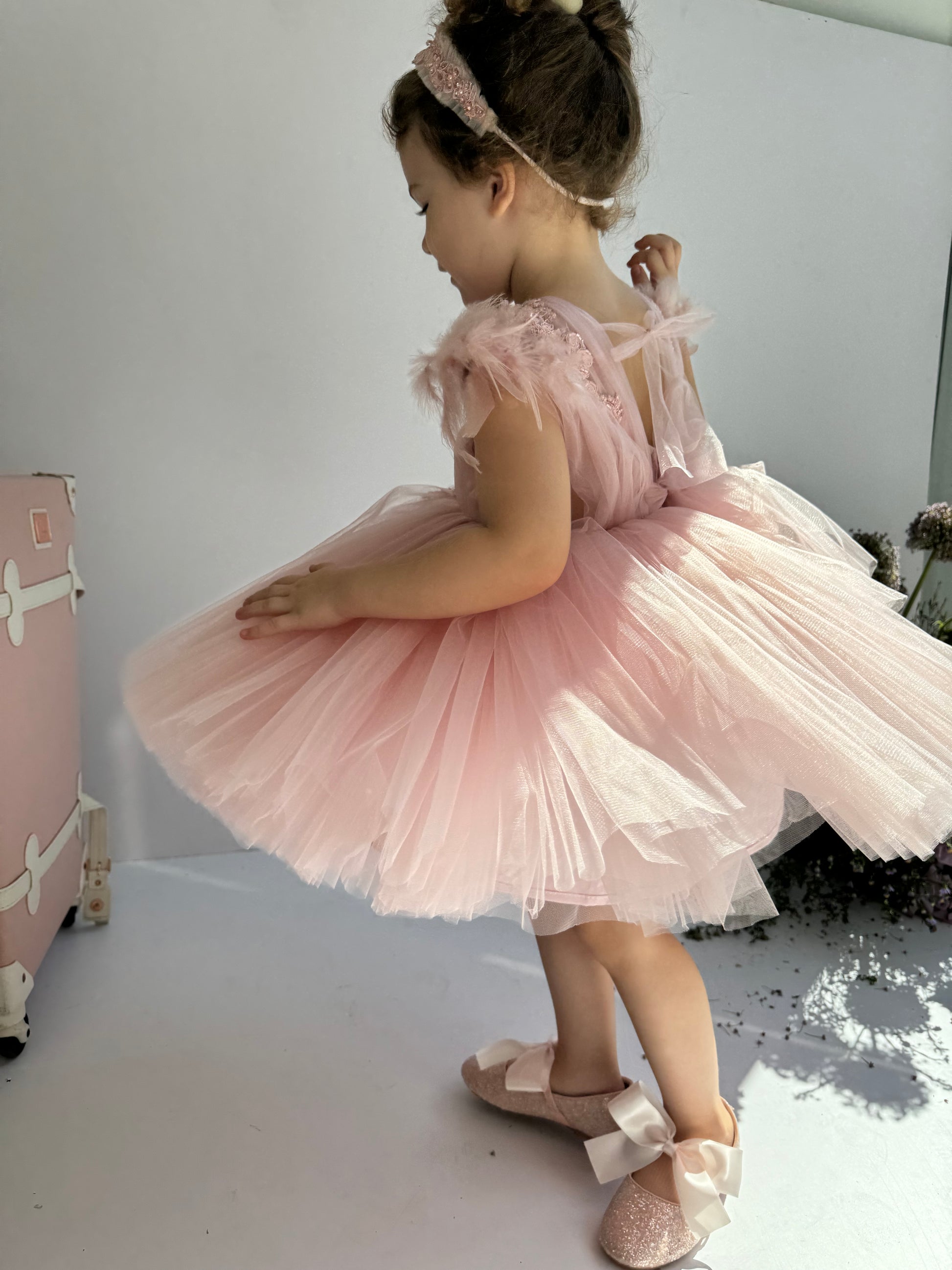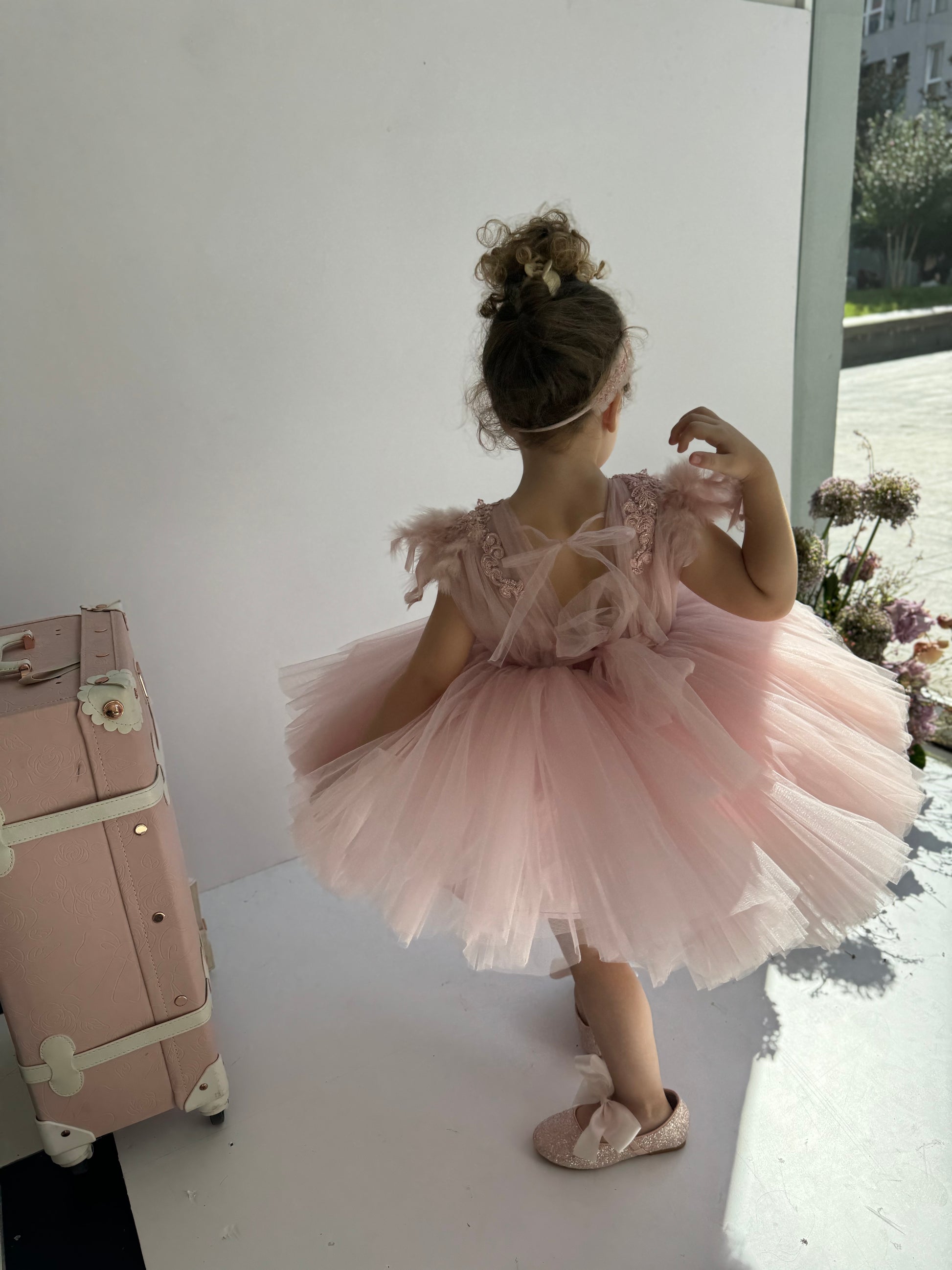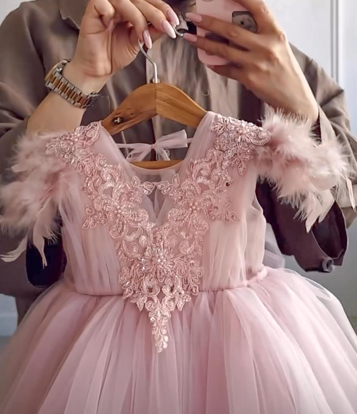 Fustan eventesh me shtresa tyli dhe aplikacione te qendisura me detaje puplash tek supet.