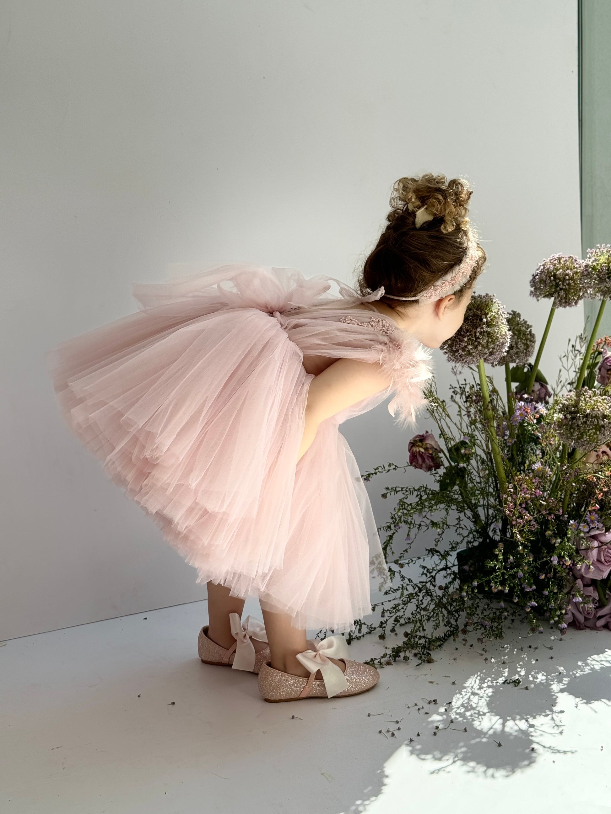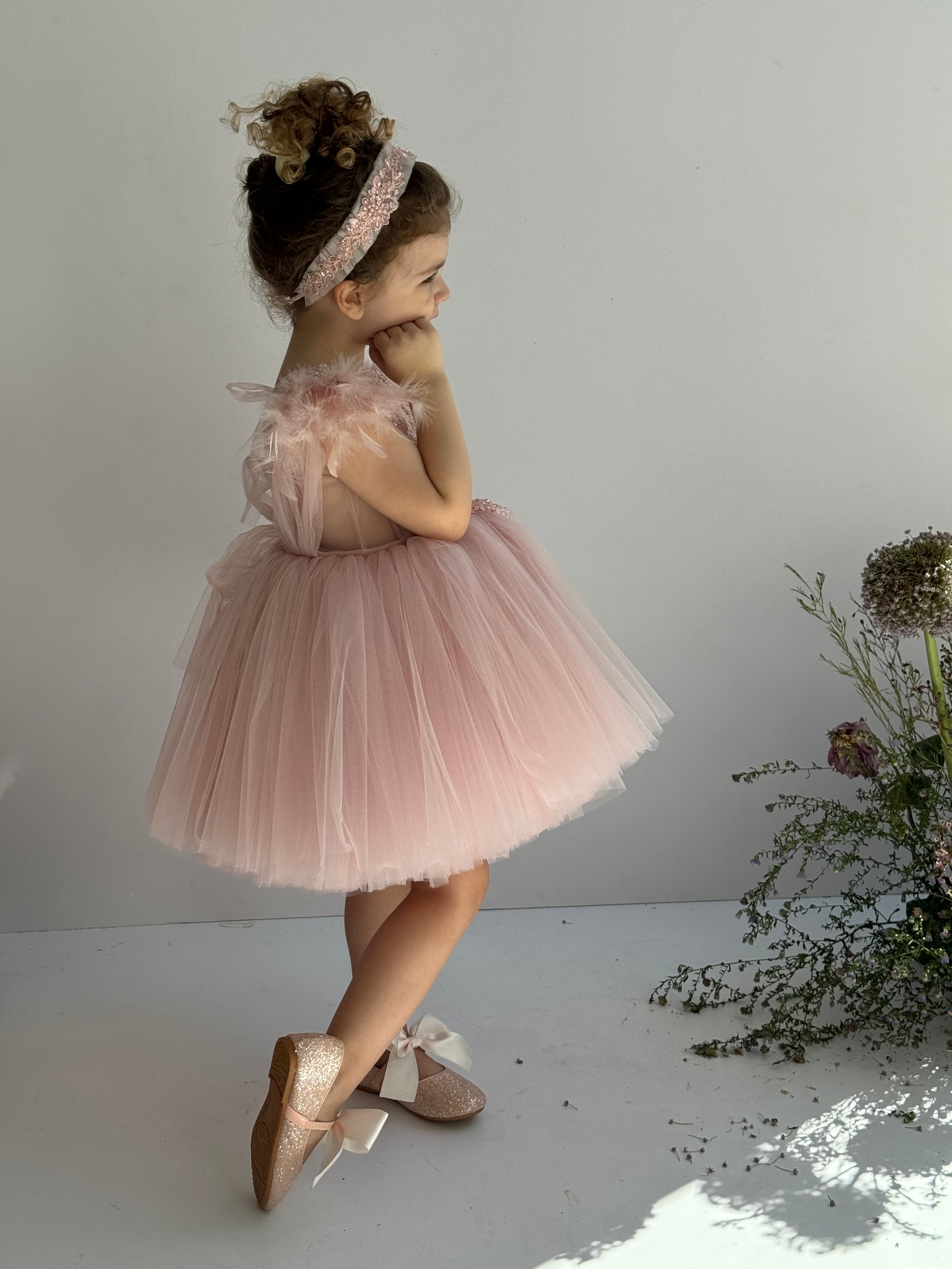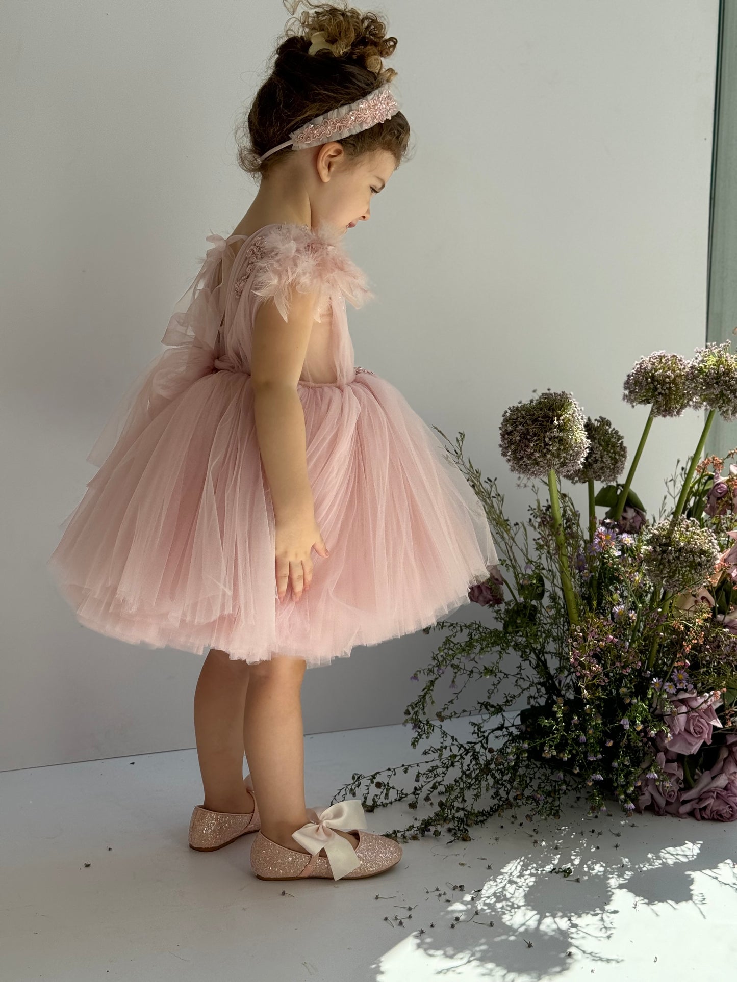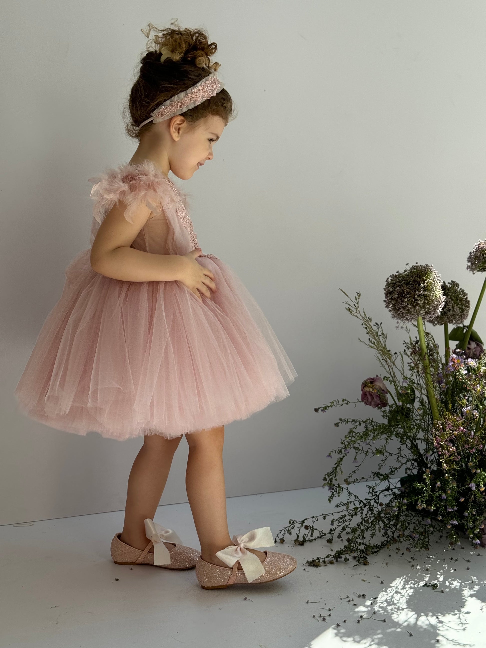 Fustan eventesh me shtresa tyli dhe aplikacione te qendisura me detaje puplash tek supet.