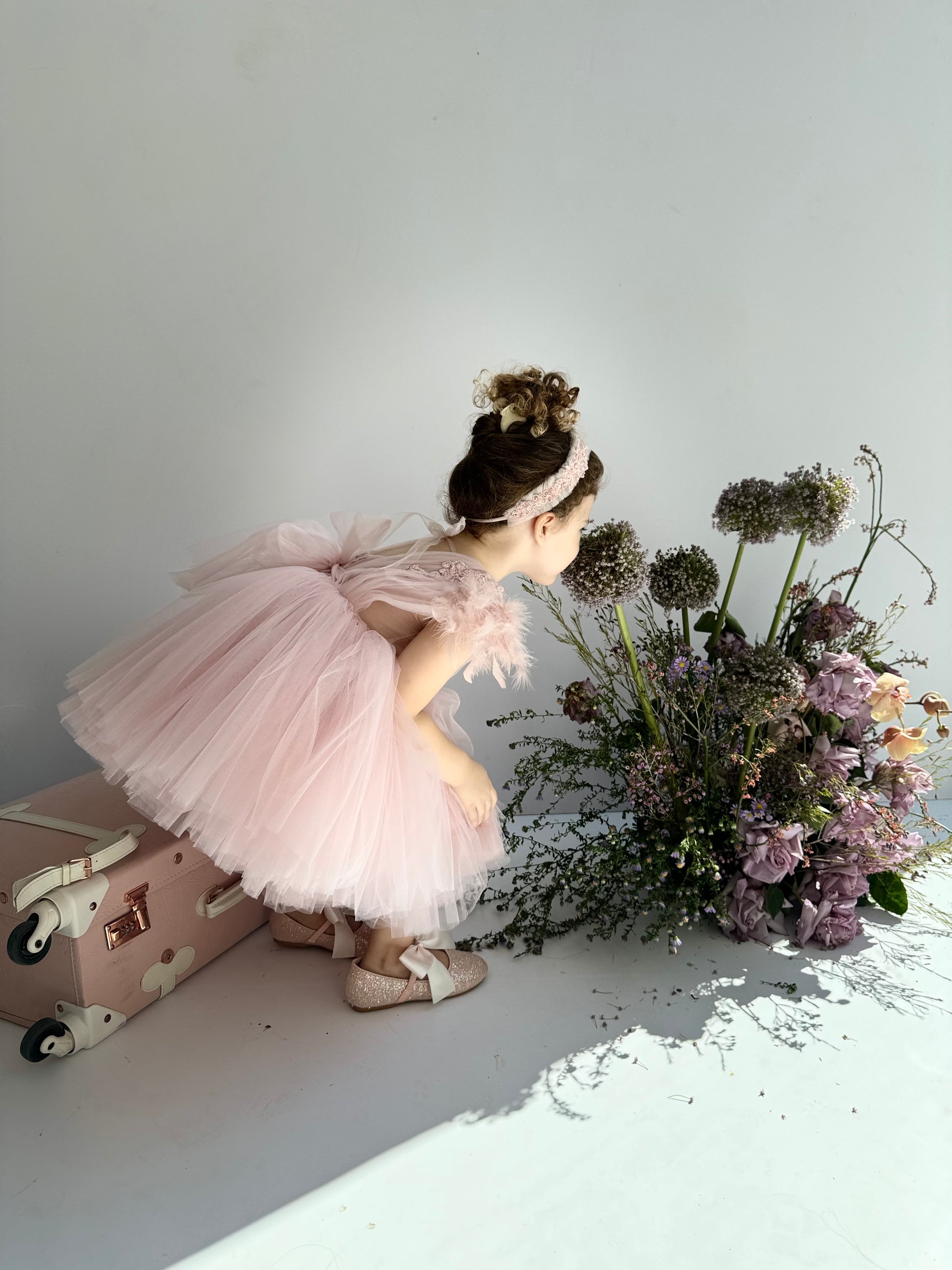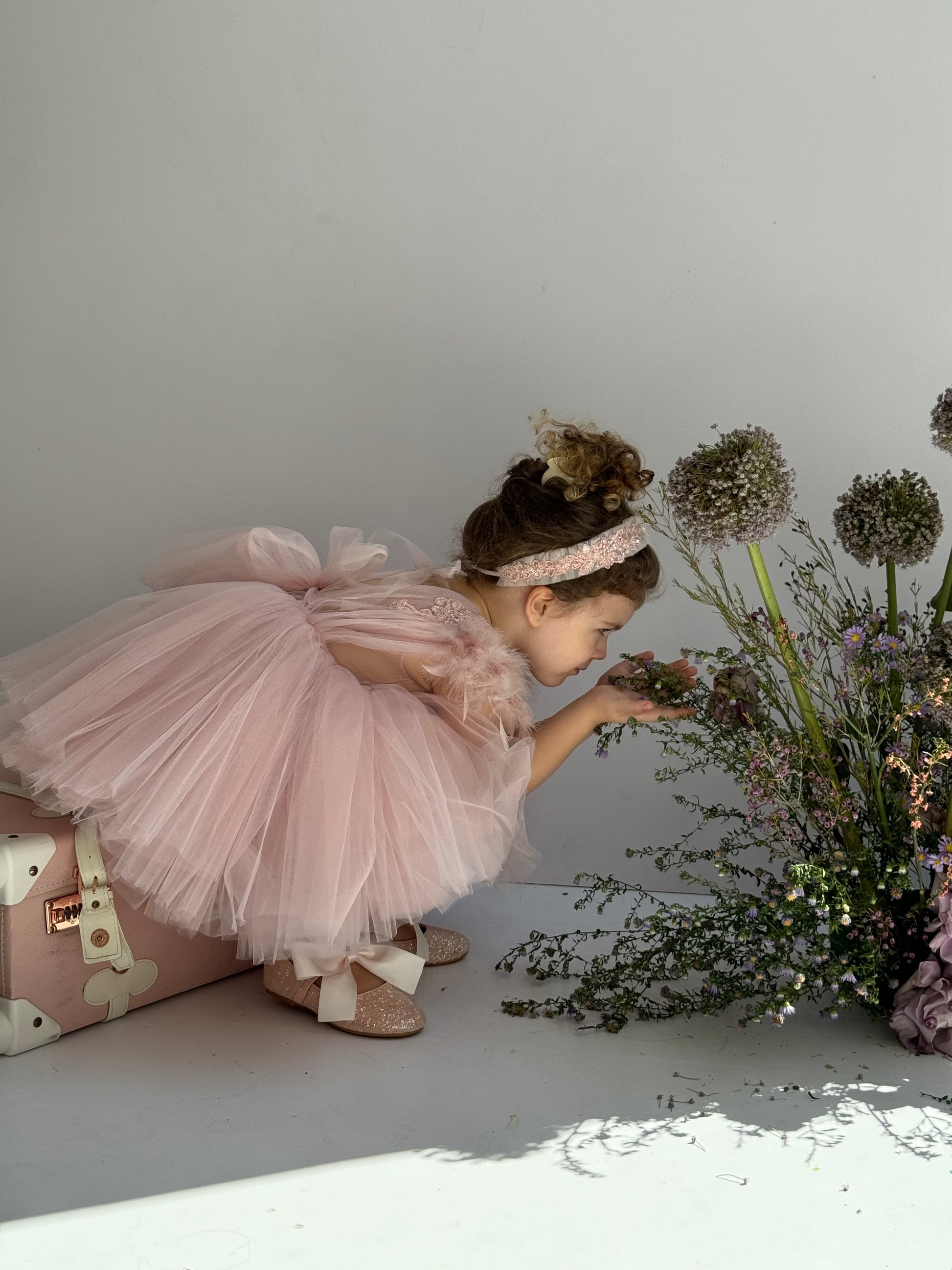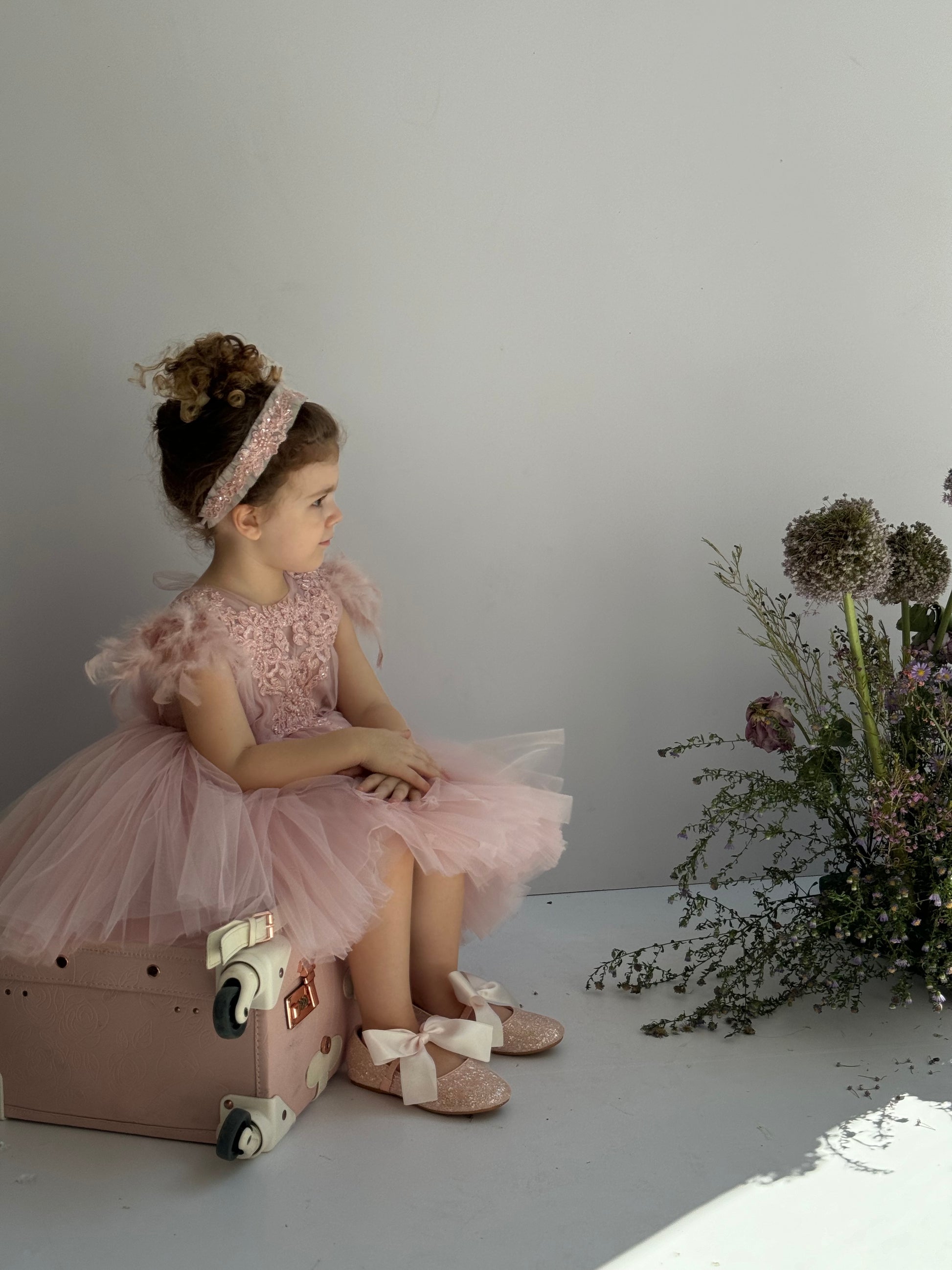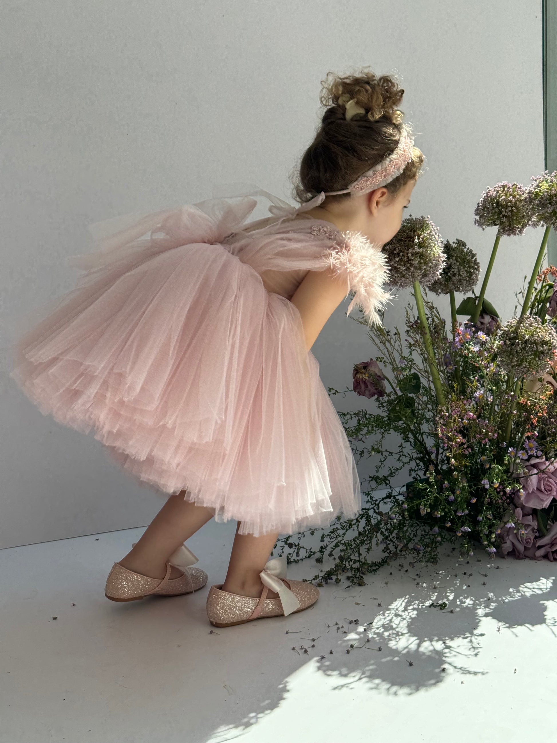 Fustan eventesh me shtresa tyli dhe aplikacione te qendisura me detaje puplash tek supet.