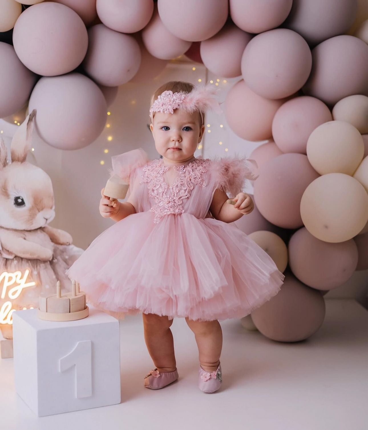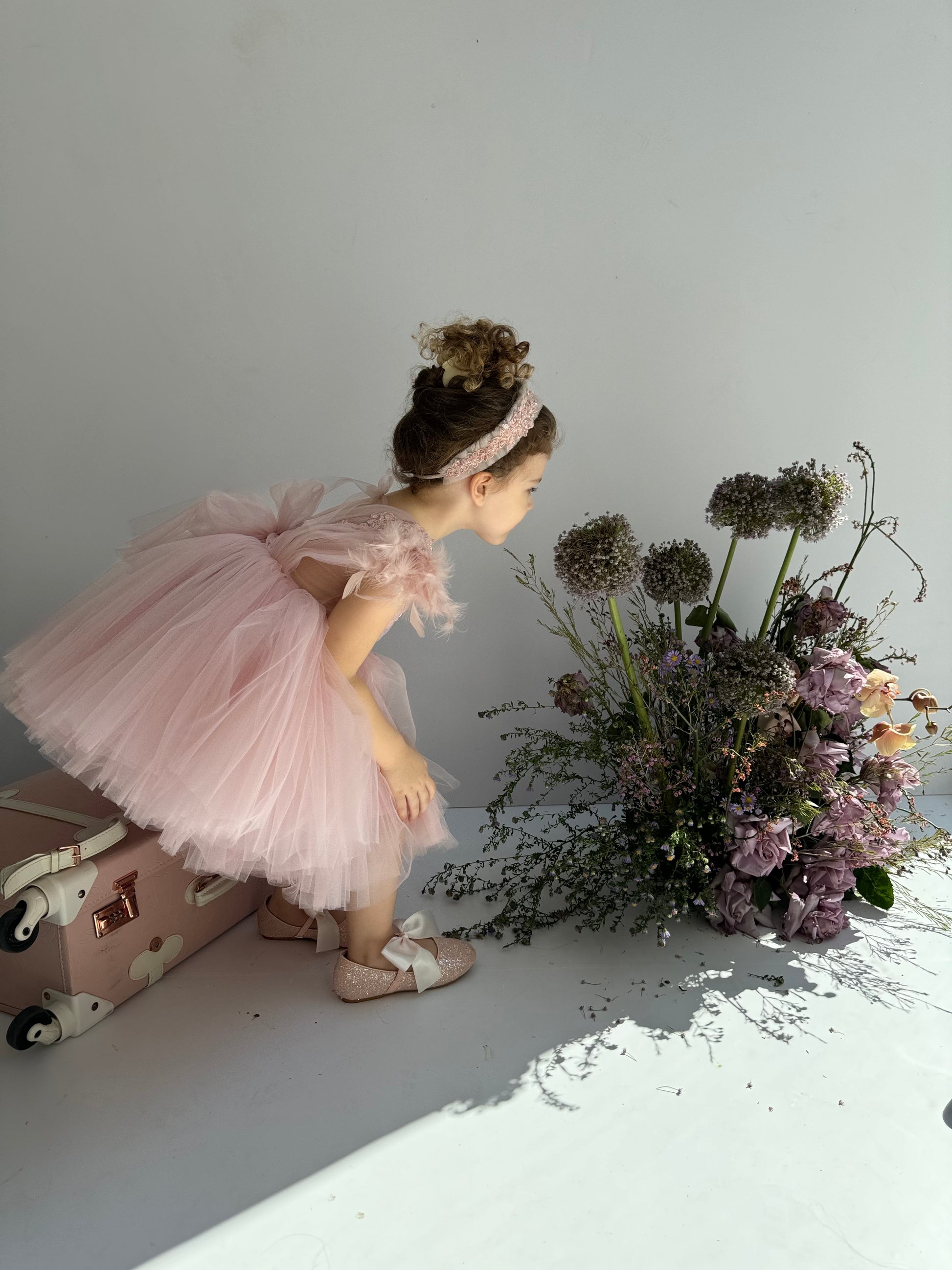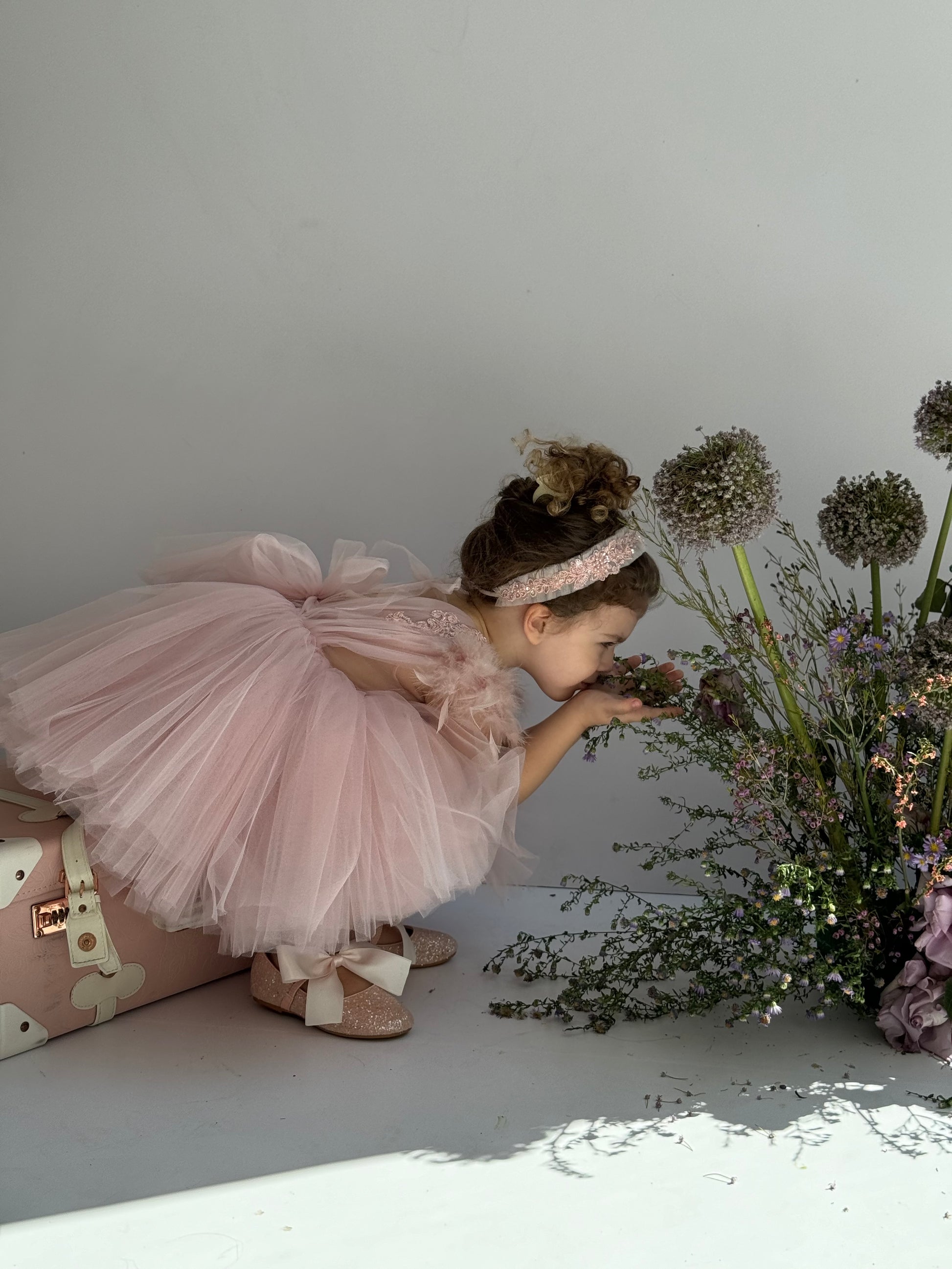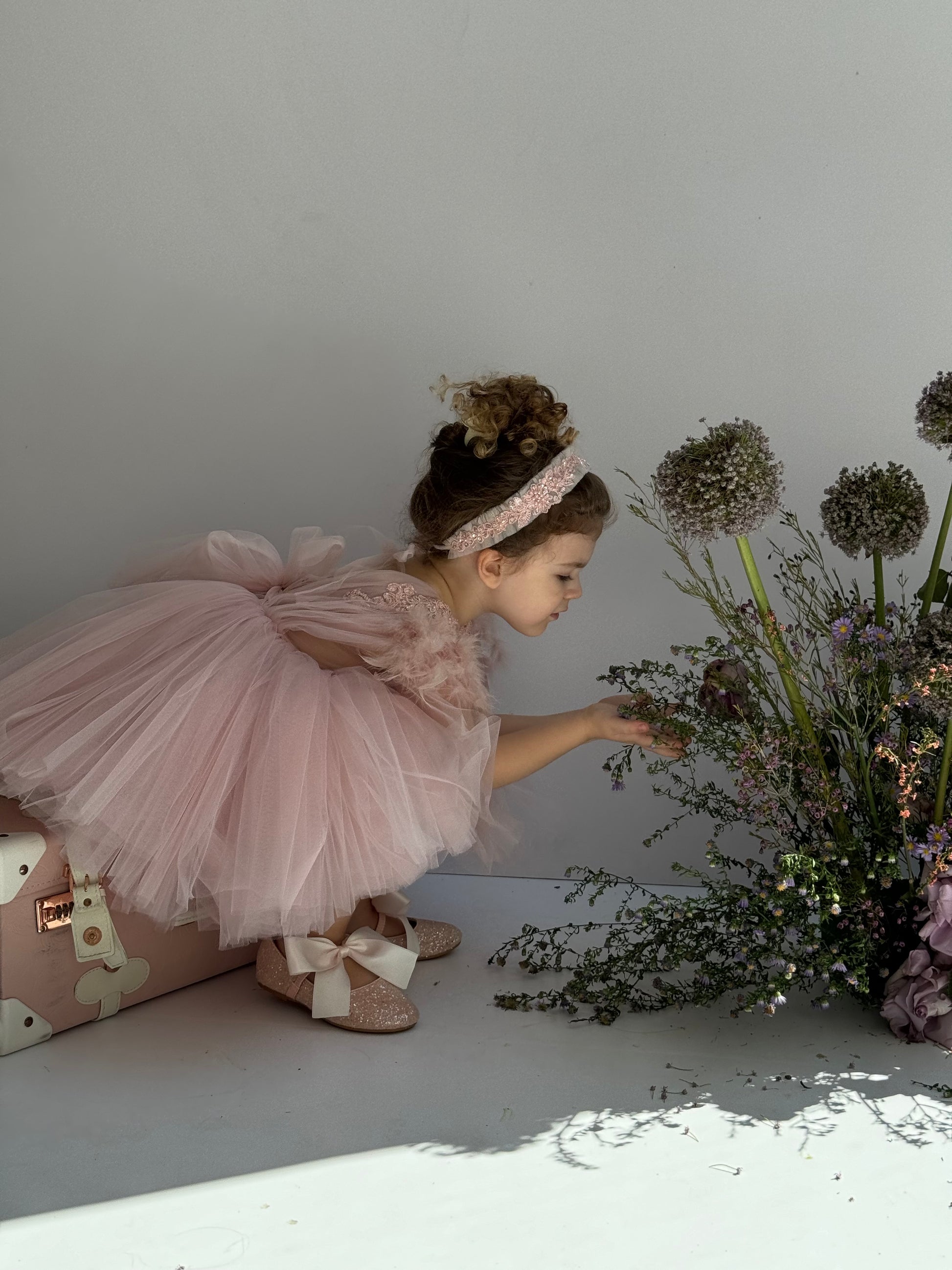 Fustan eventesh me shtresa tyli dhe aplikacione te qendisura me detaje puplash tek supet.
