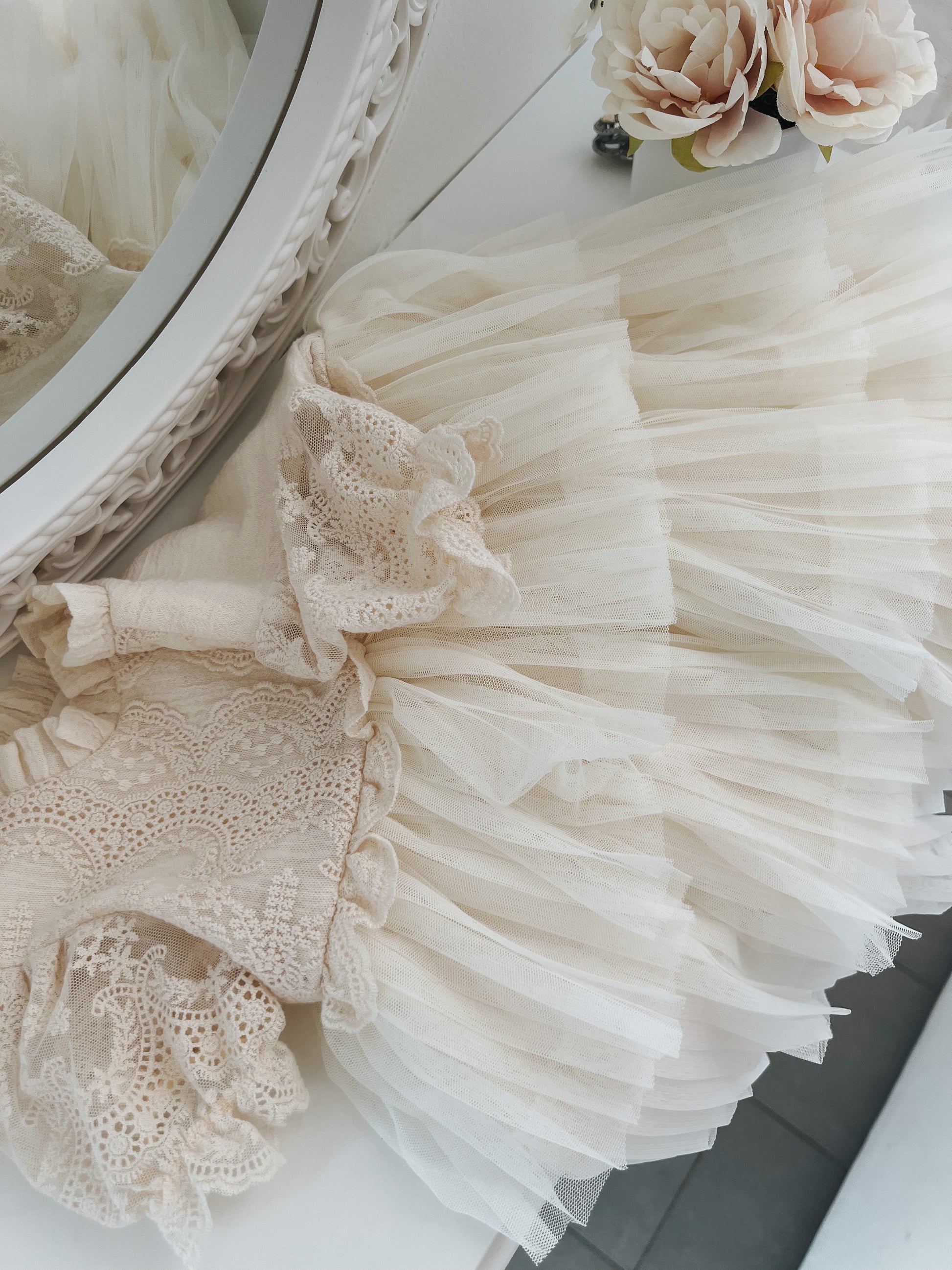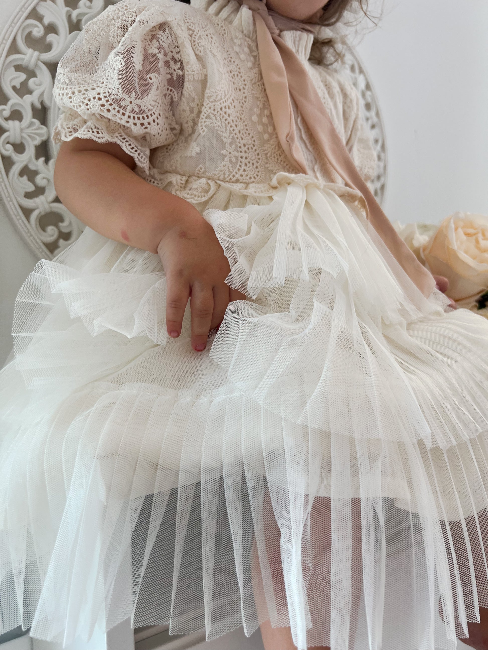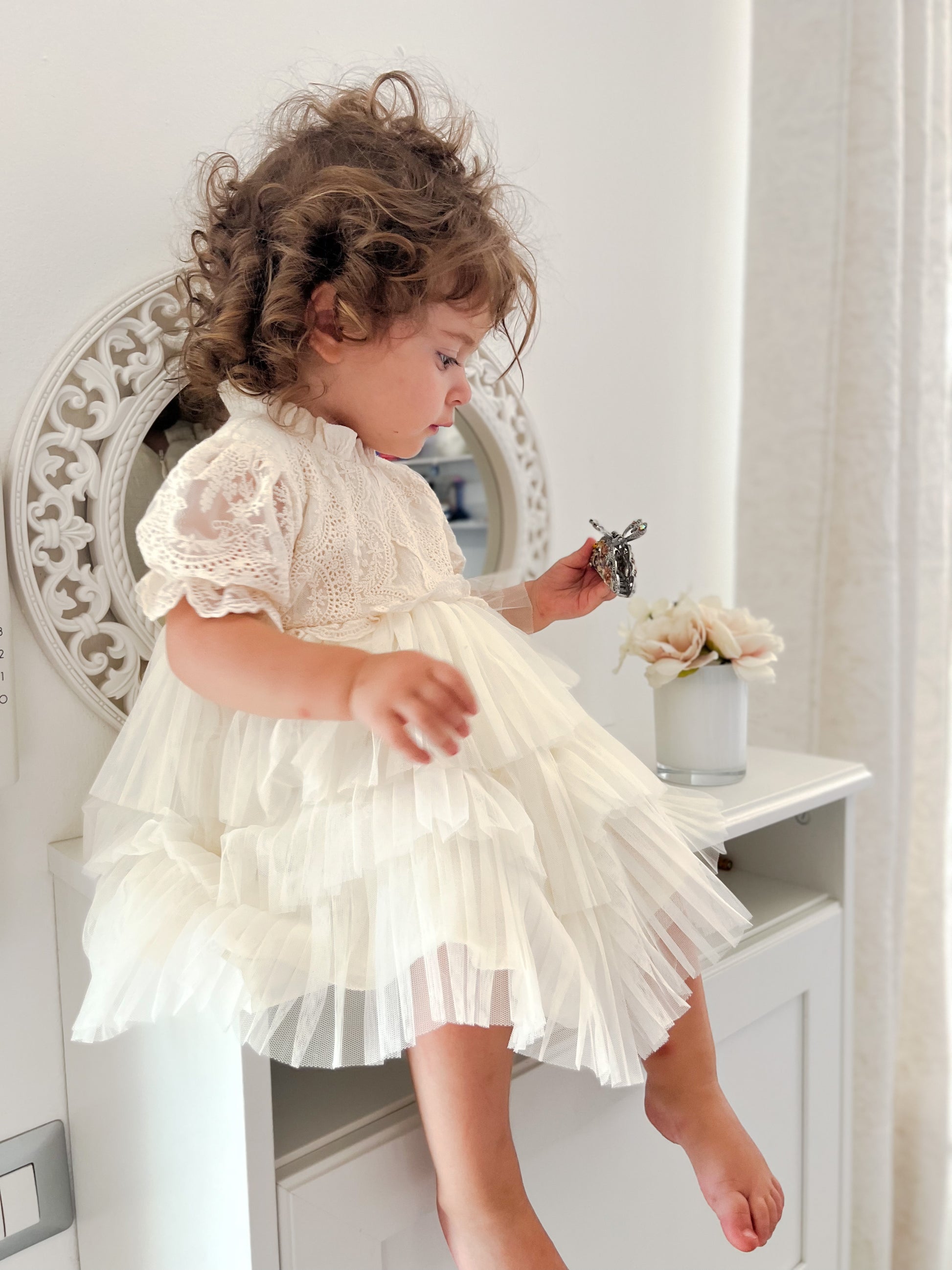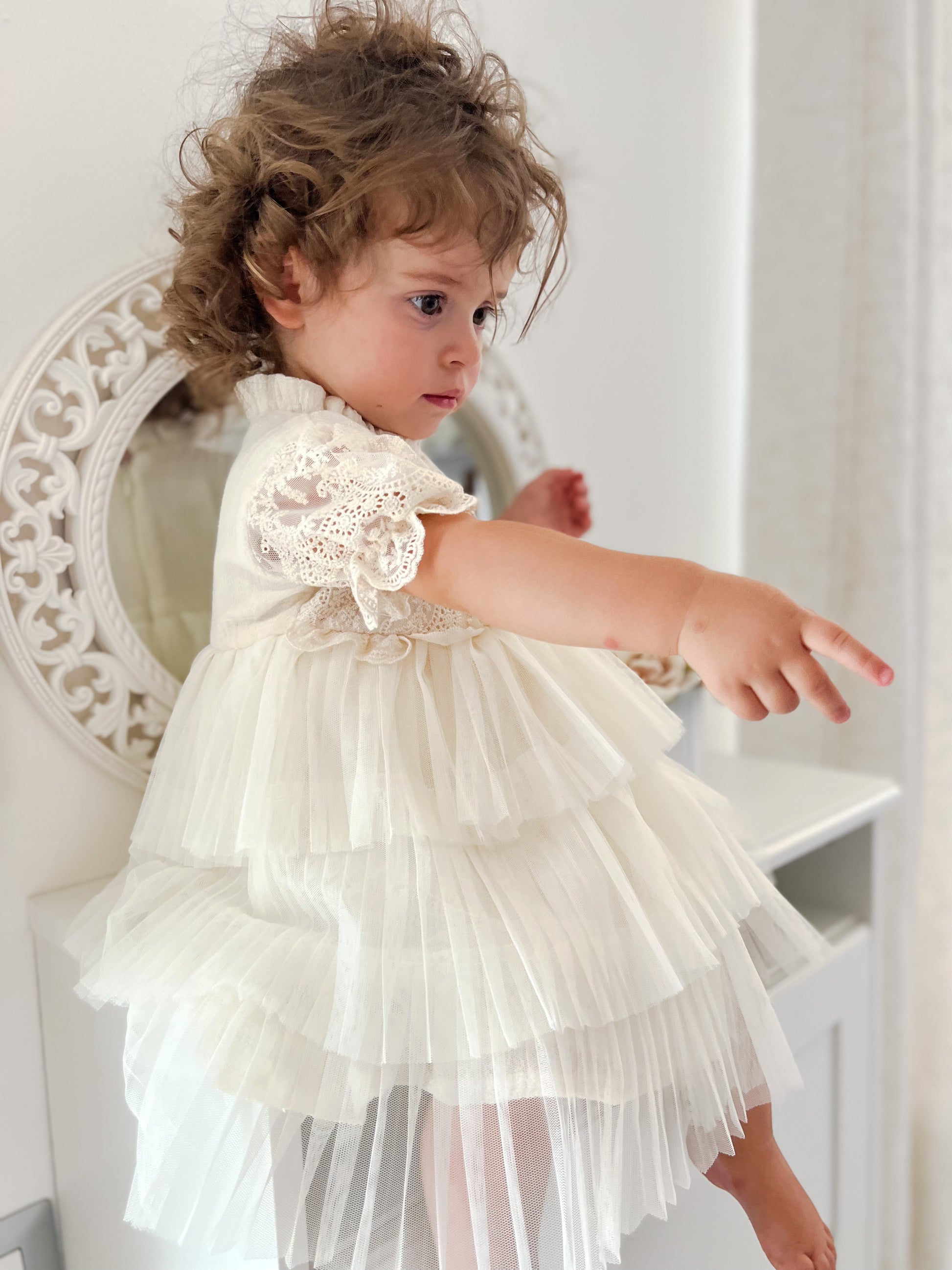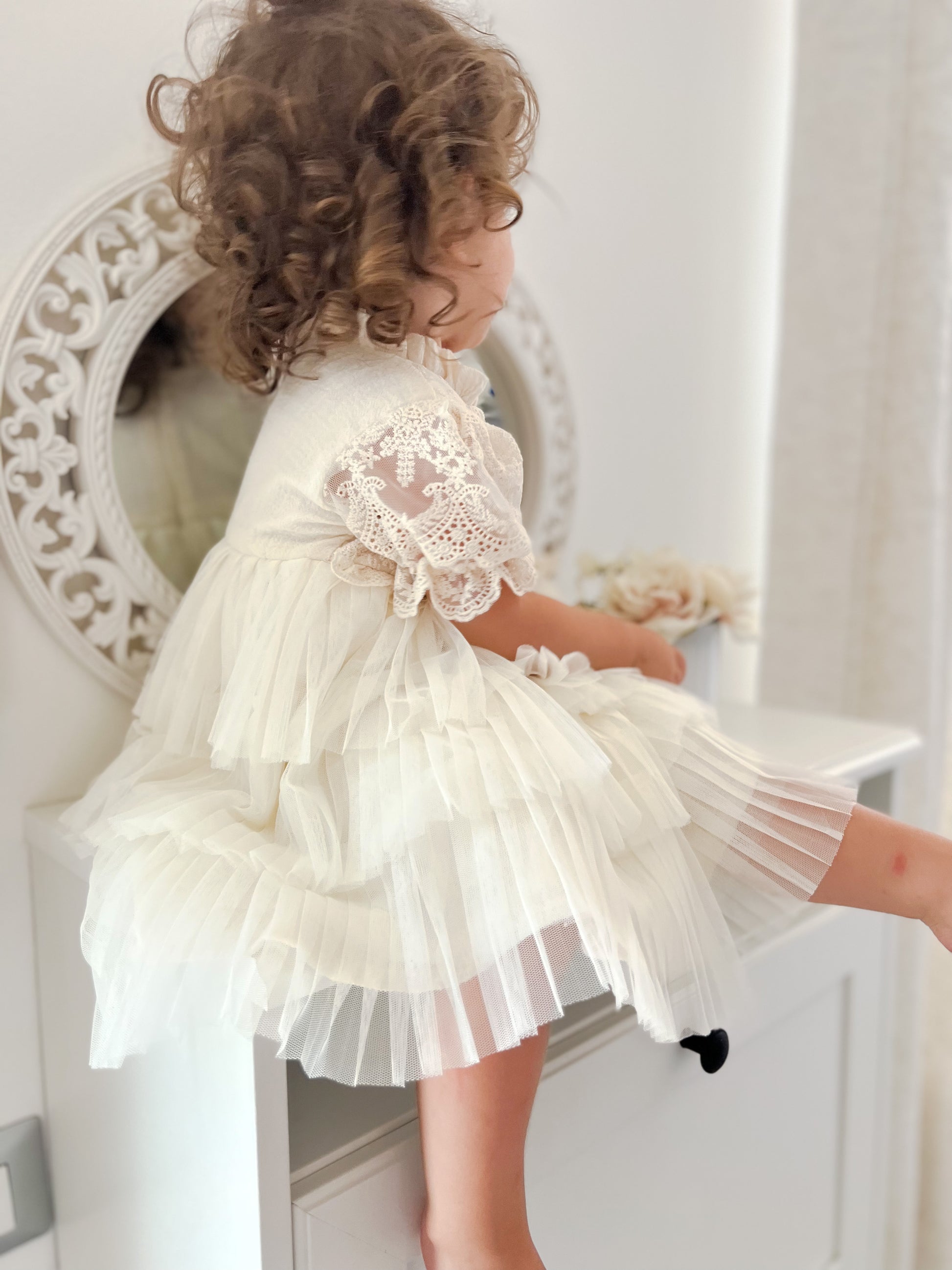 Fustan pagezimi dhe eventesh, me meng te shkurta, punuar me tantelle, lino dhe tyl francez me pala.