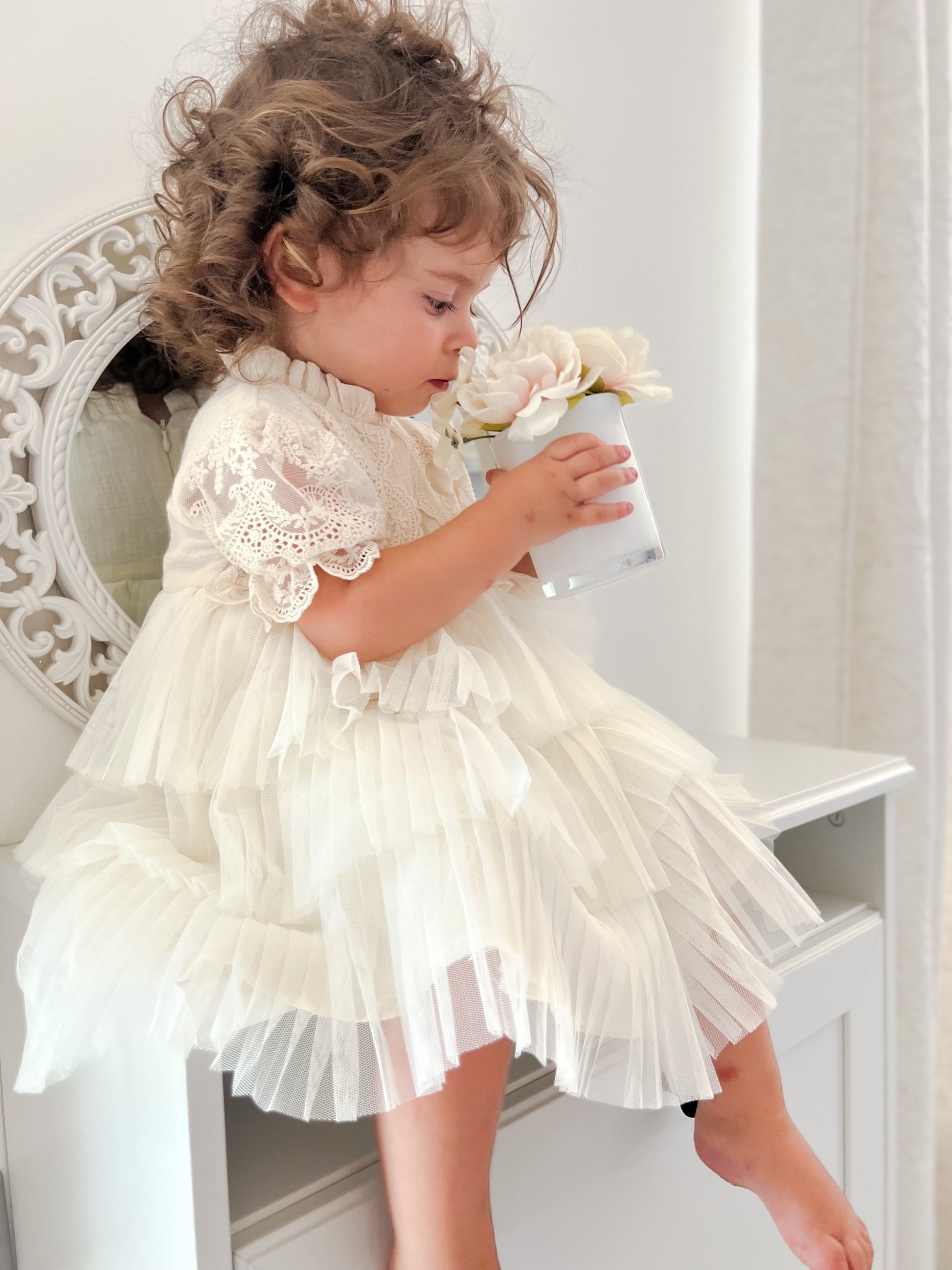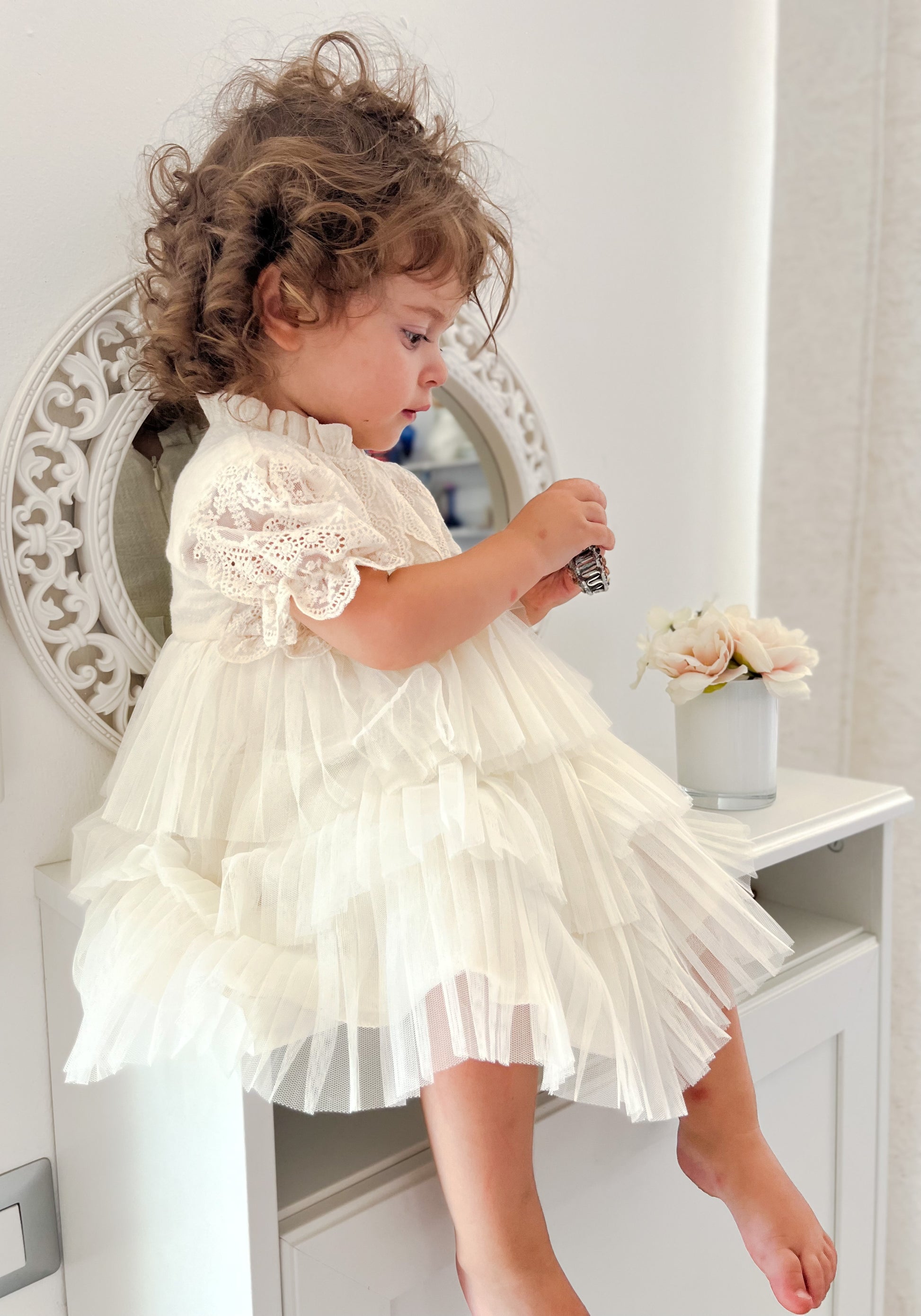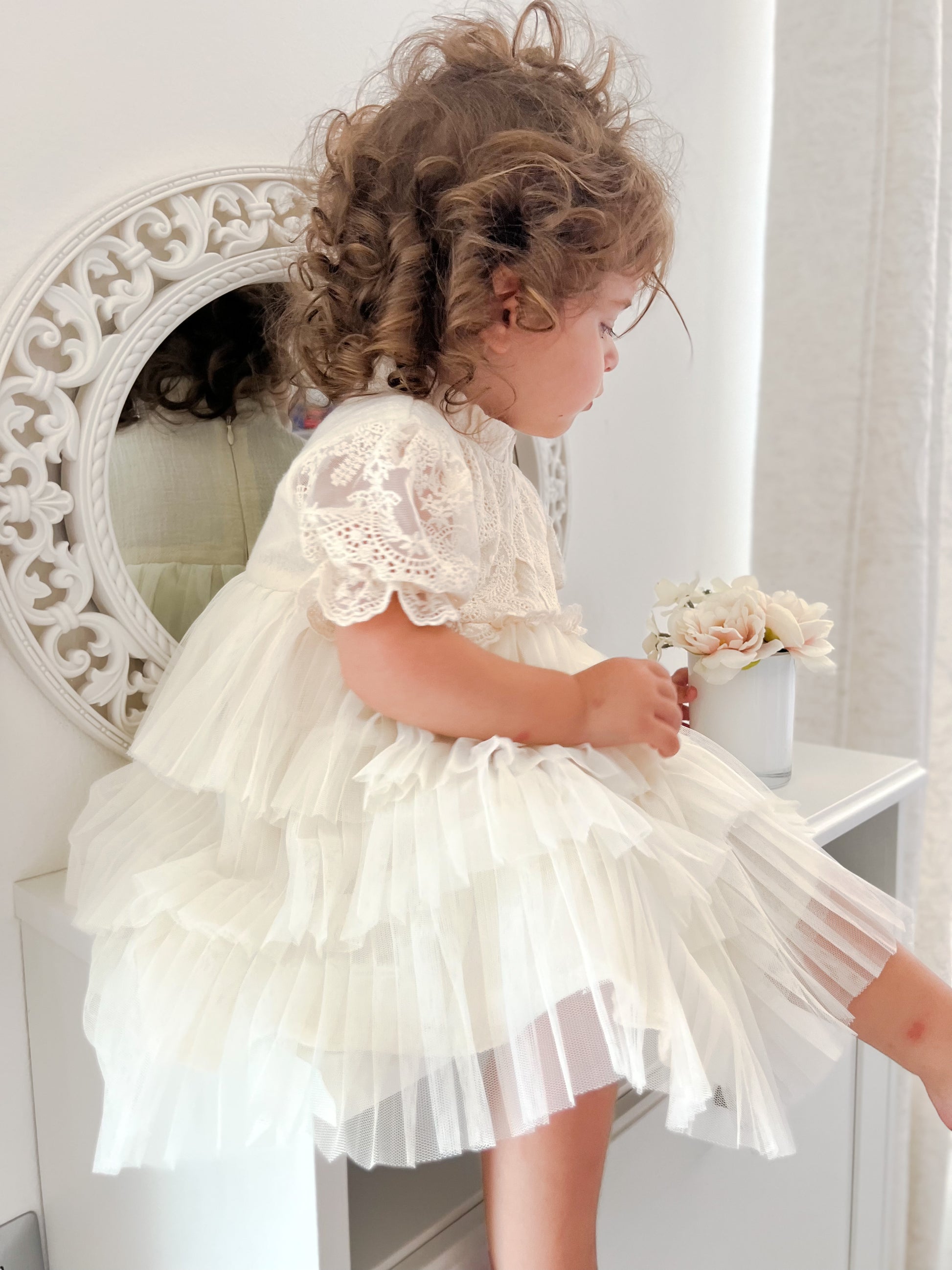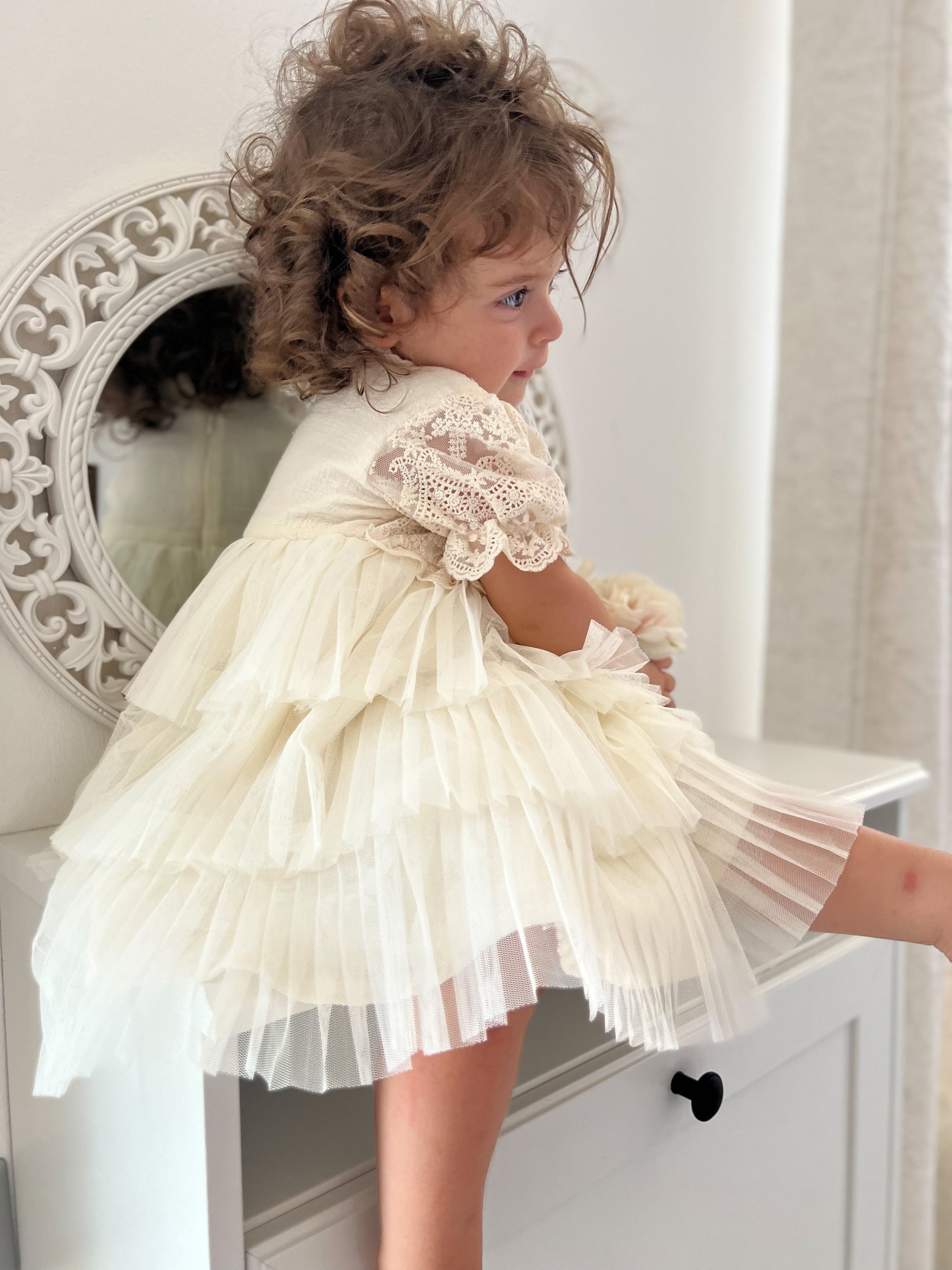Fustan pagezimi dhe eventesh, me meng te shkurta, punuar me tantelle, lino dhe tyl francez me pala.