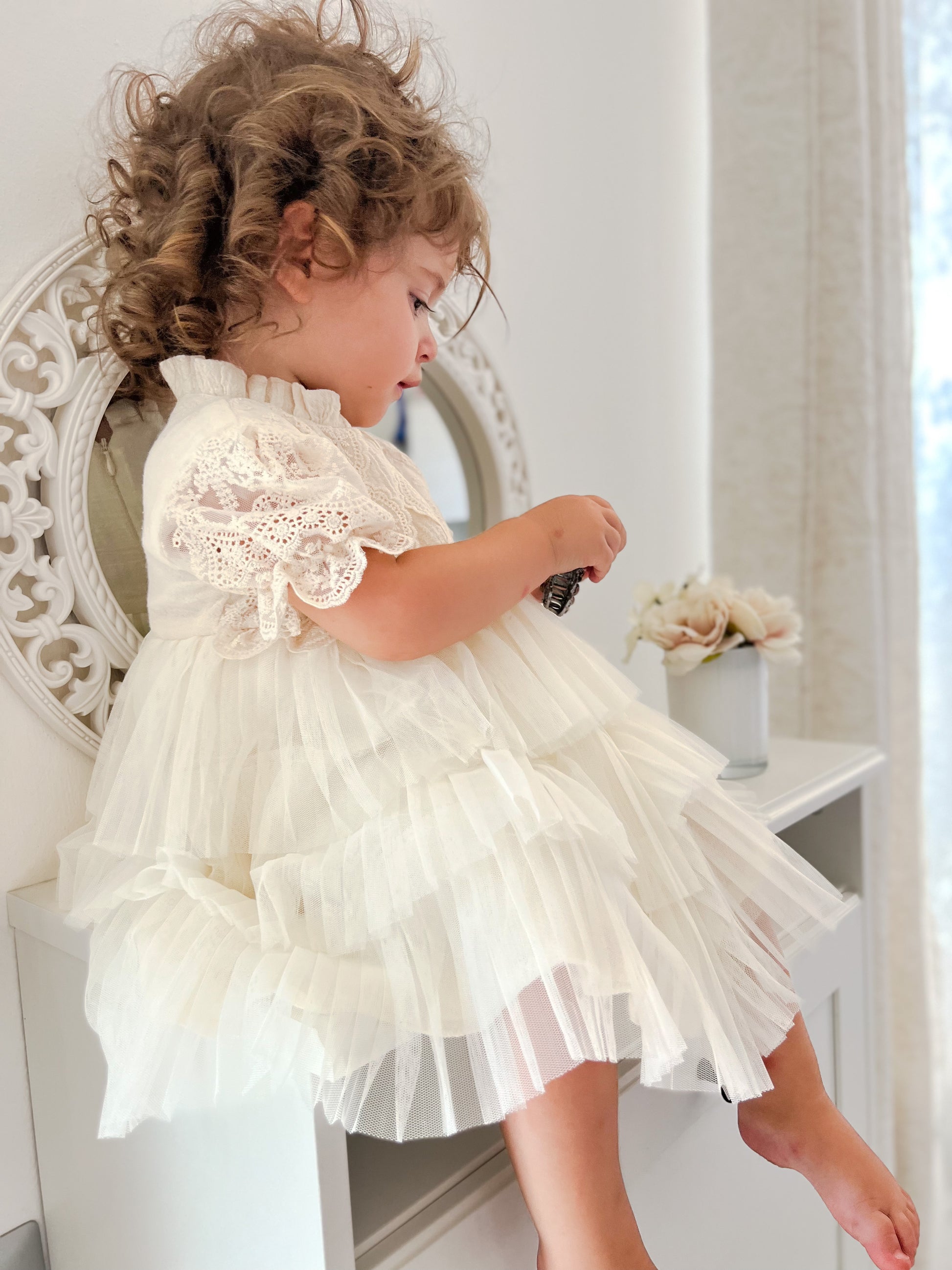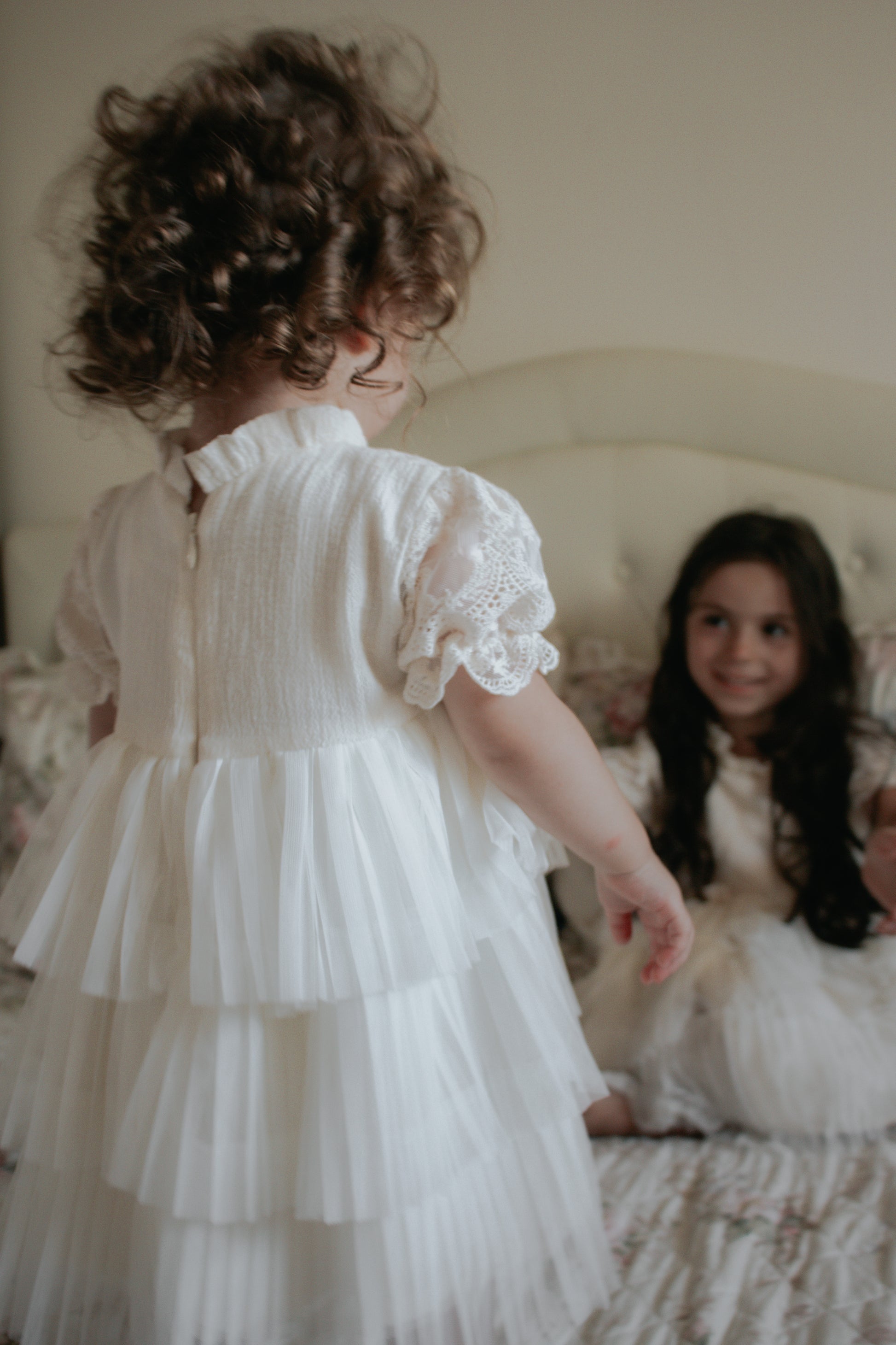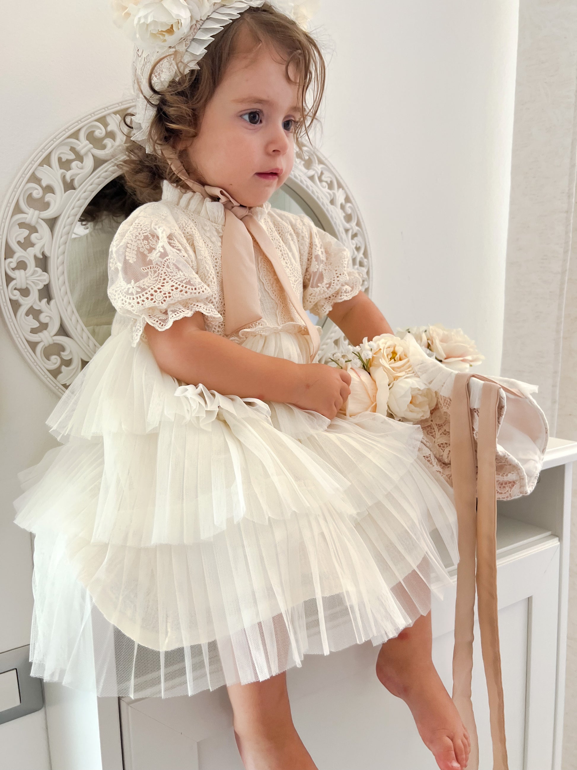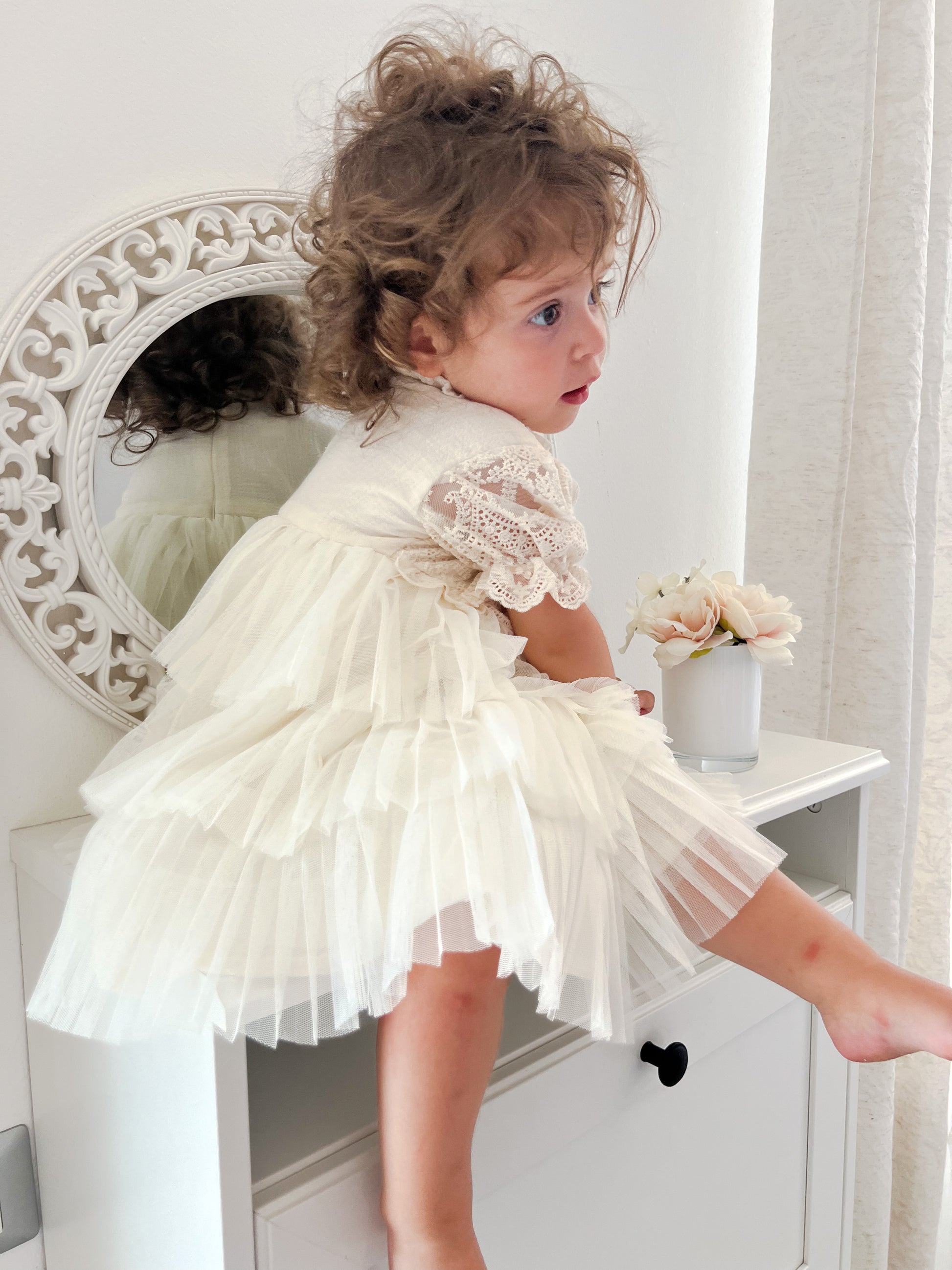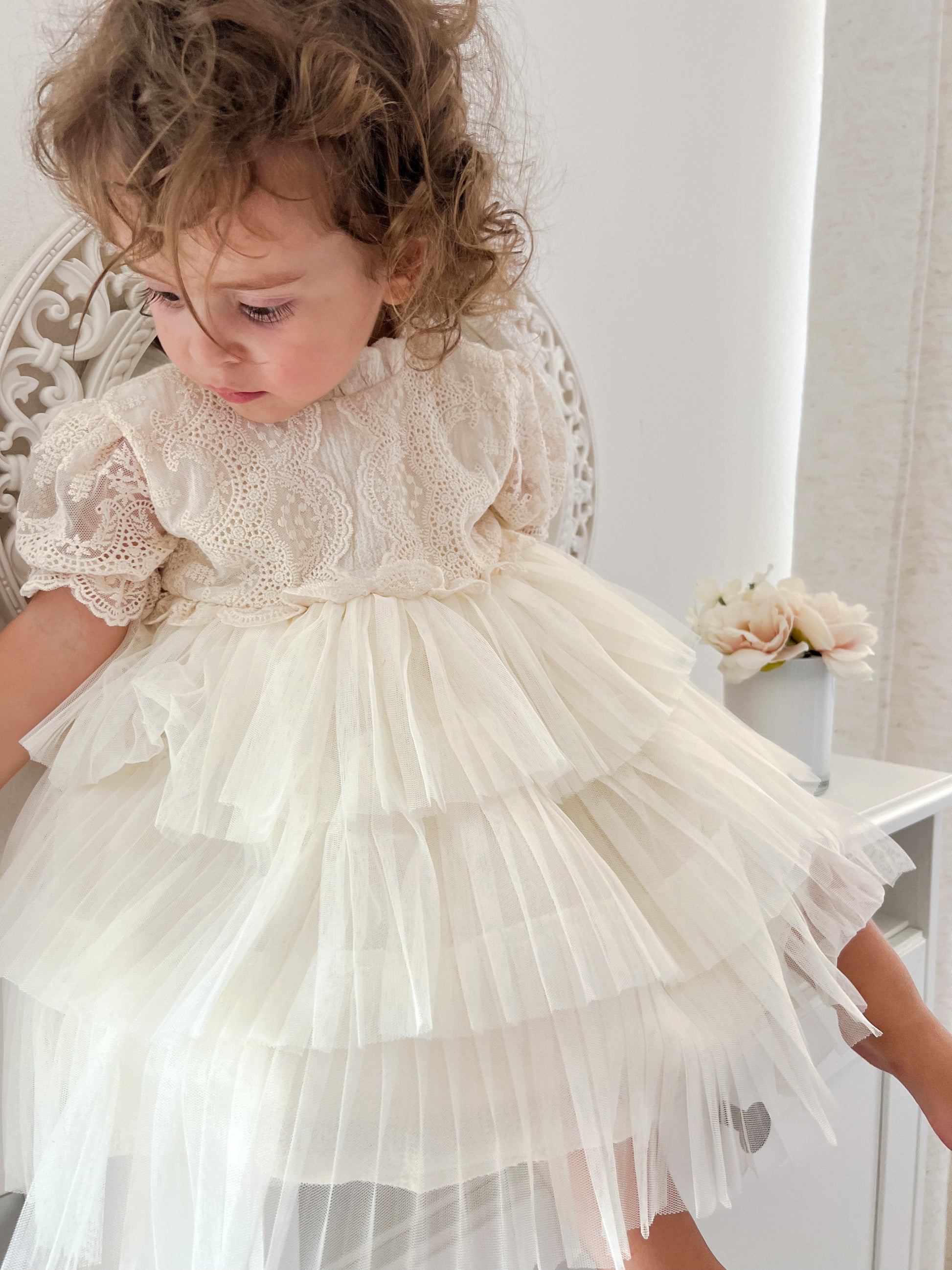 Fustan pagezimi dhe eventesh, me meng te shkurta, punuar me tantelle, lino dhe tyl francez me pala.