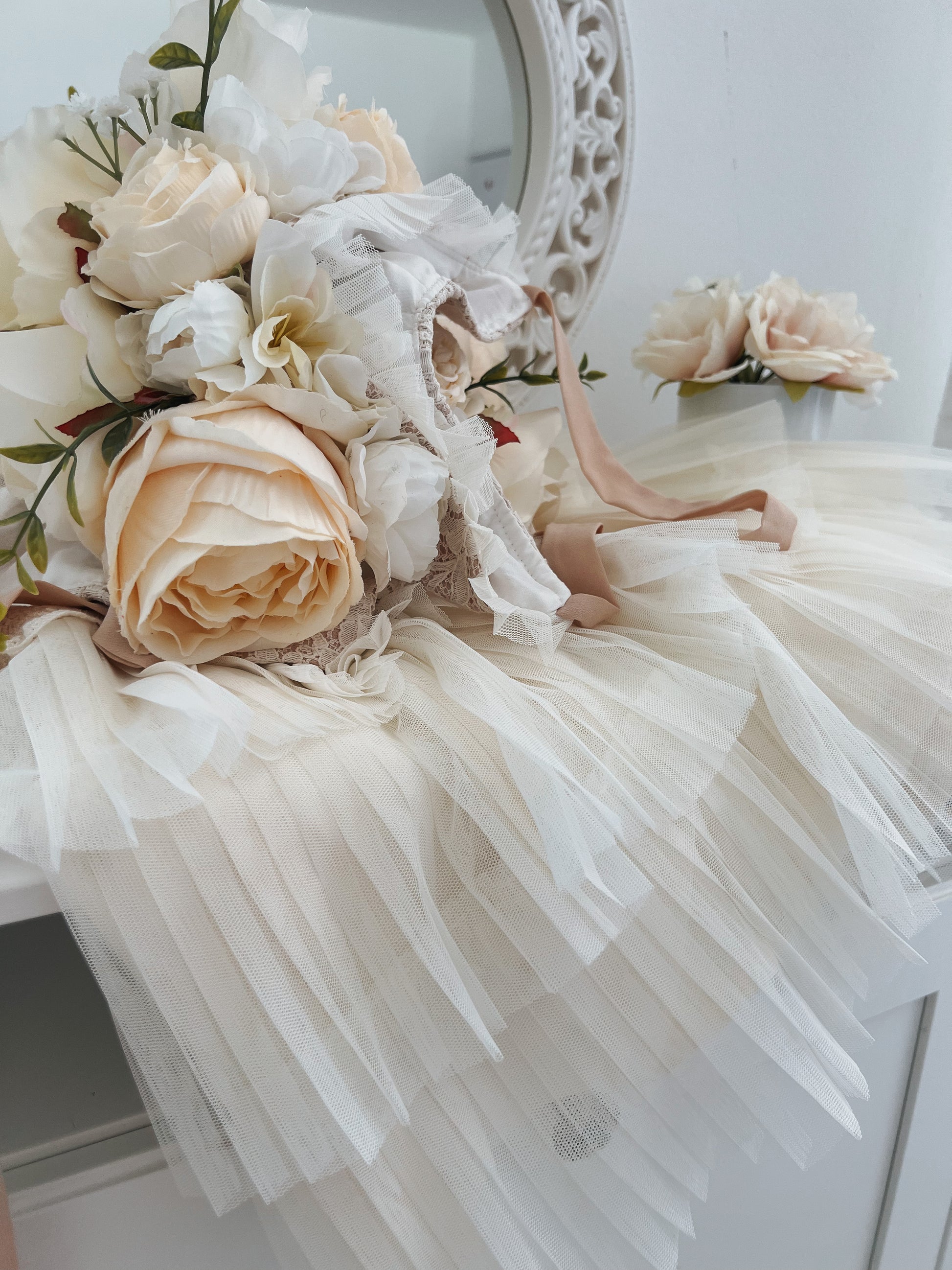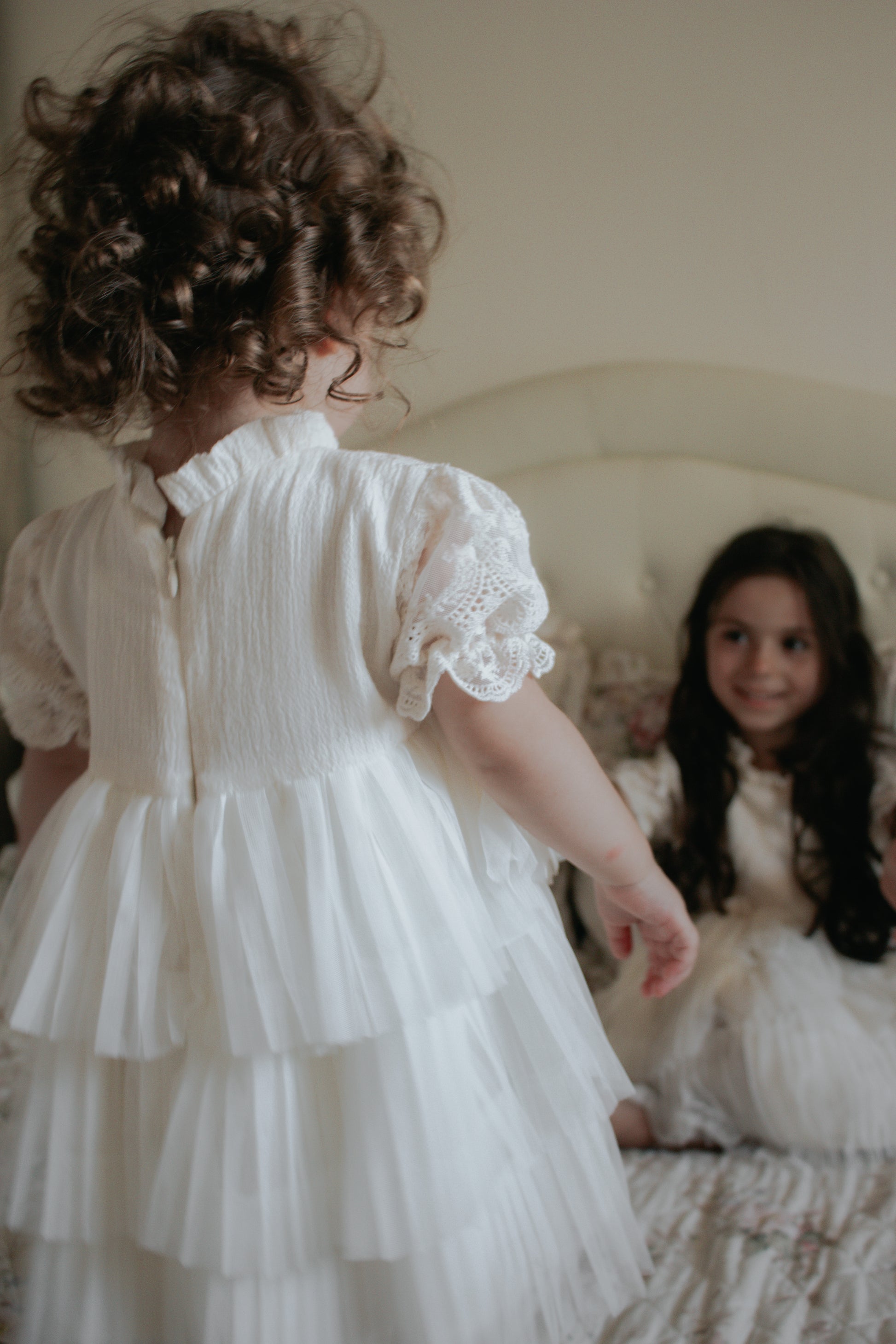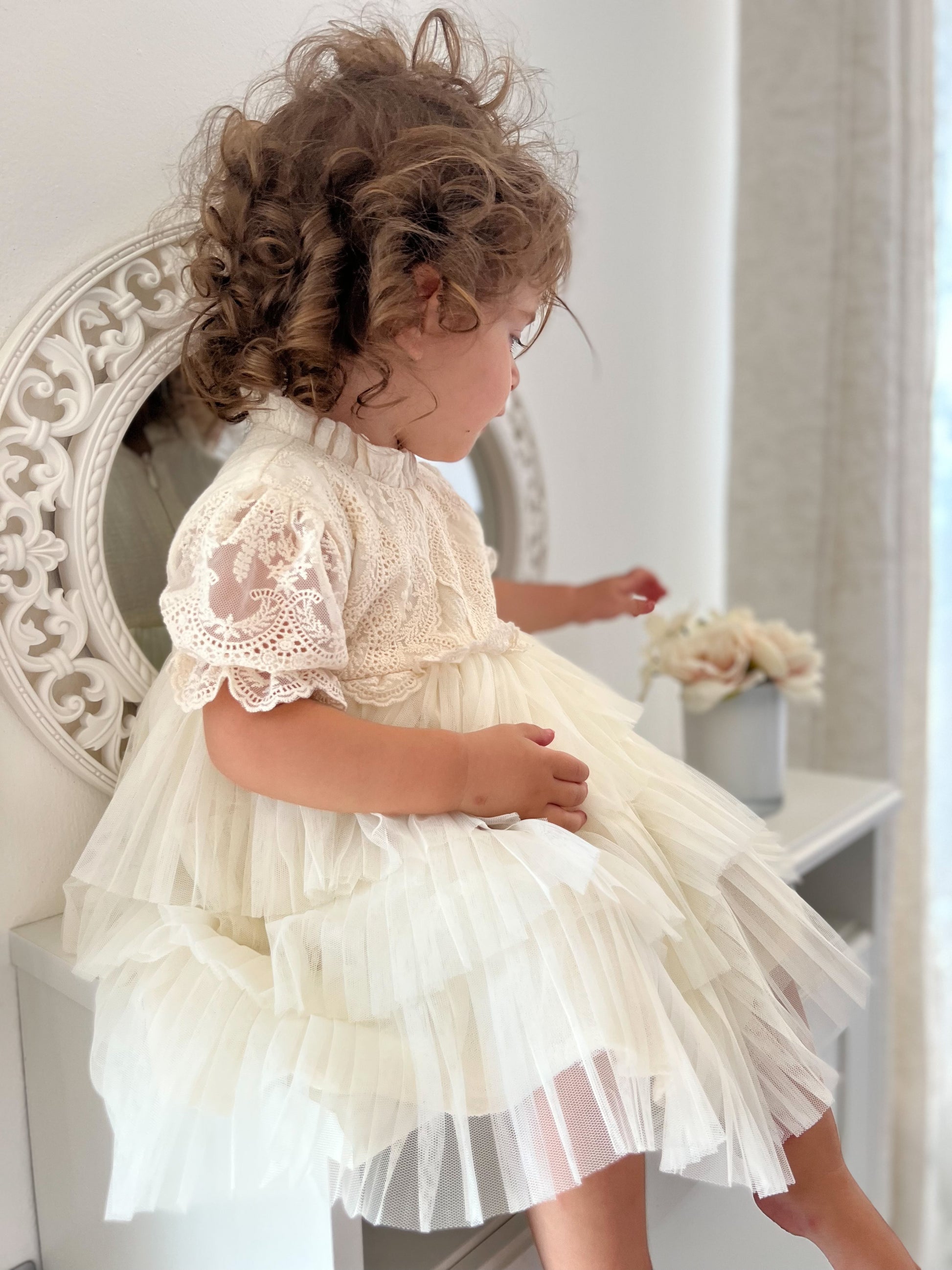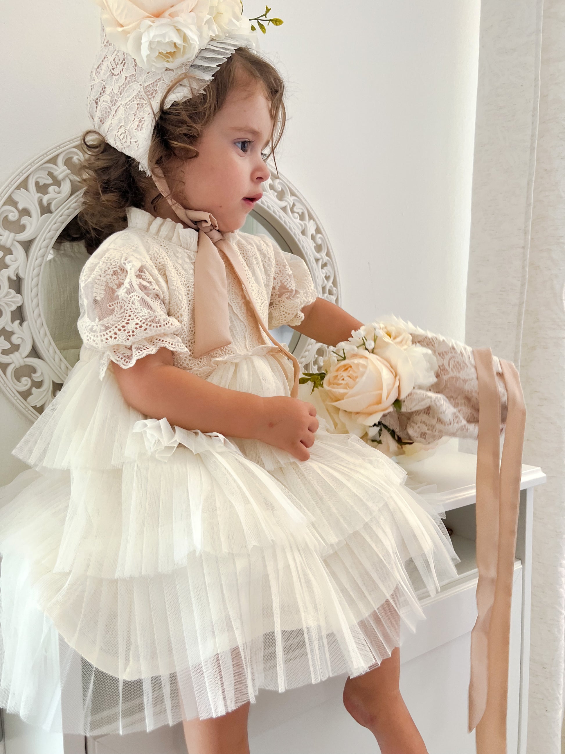 Fustan pagezimi dhe eventesh, me meng te shkurta, punuar me tantelle, lino dhe tyl francez me pala.