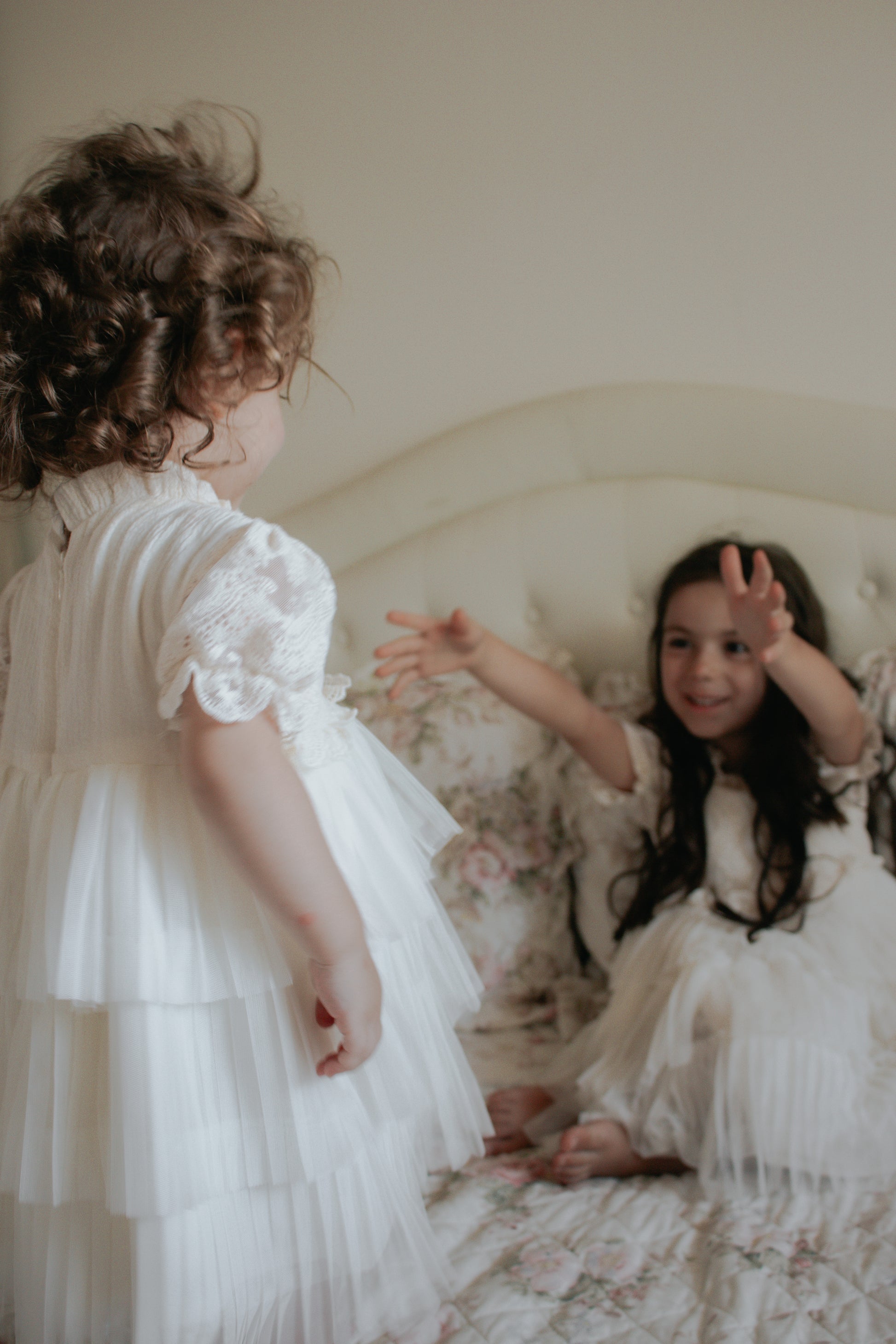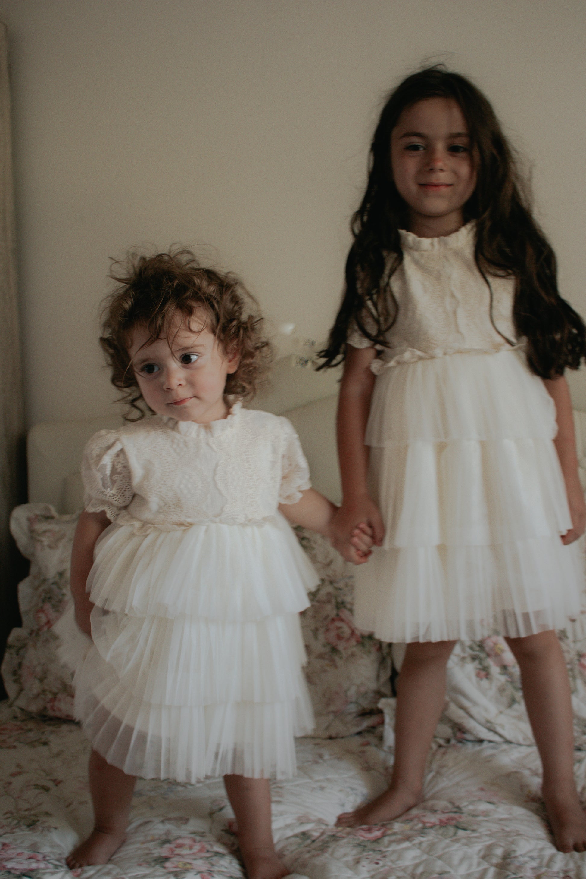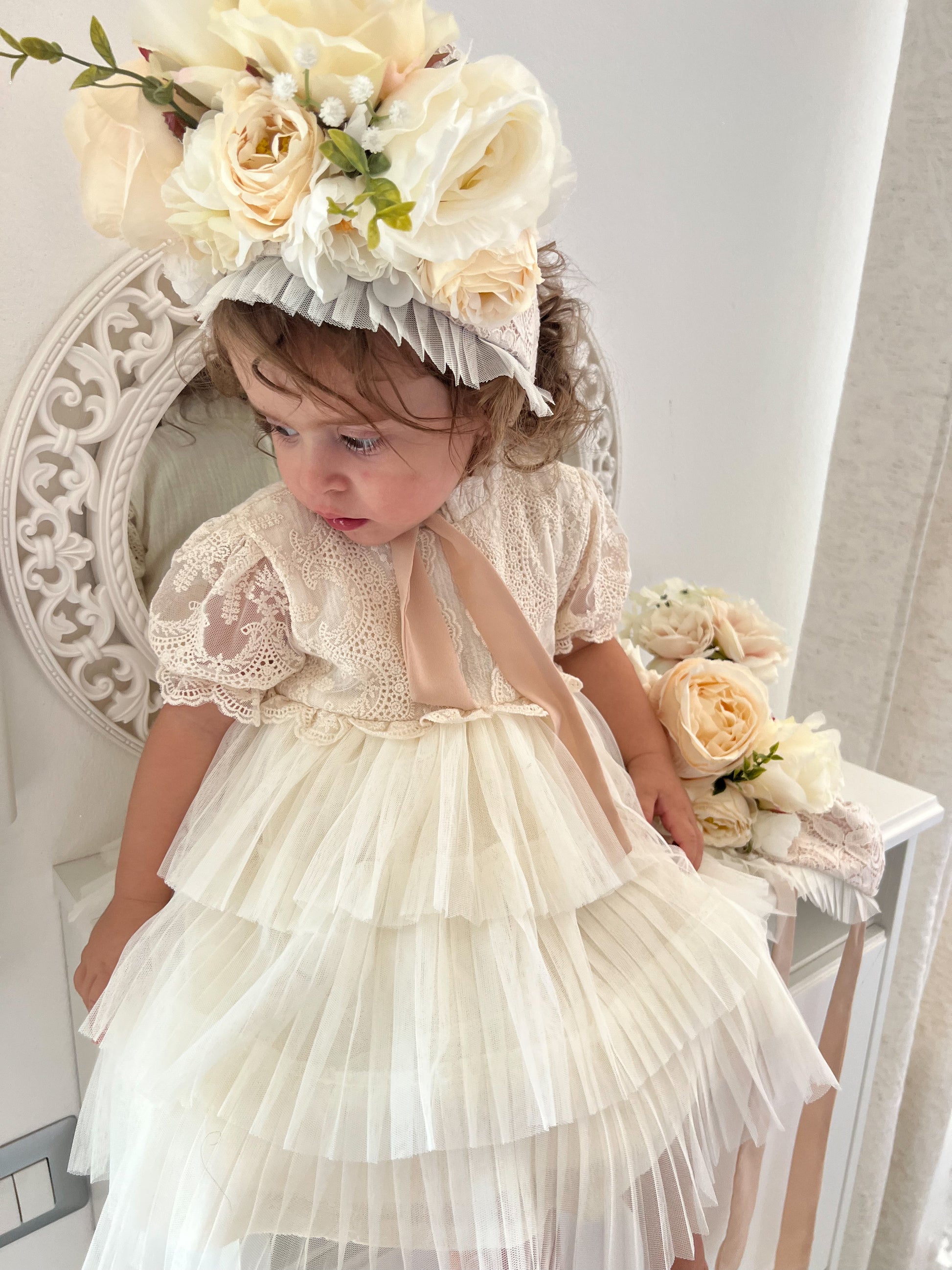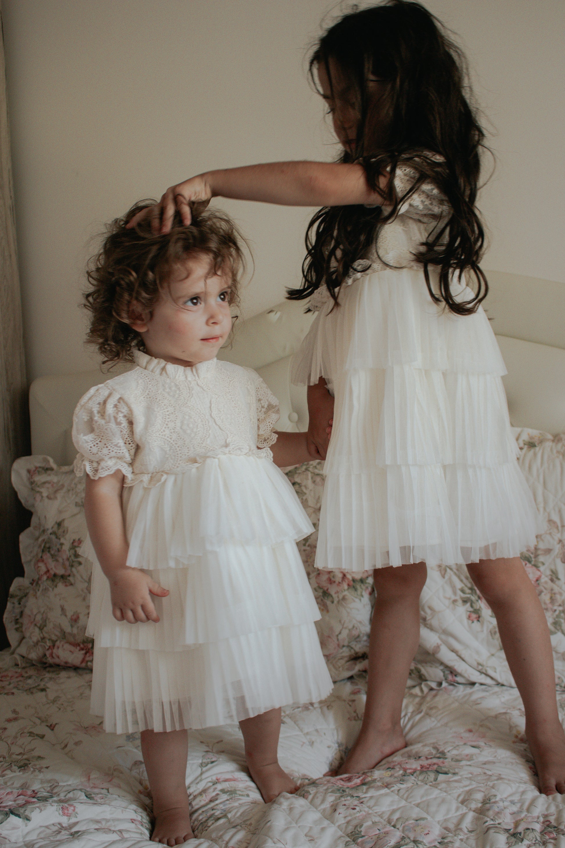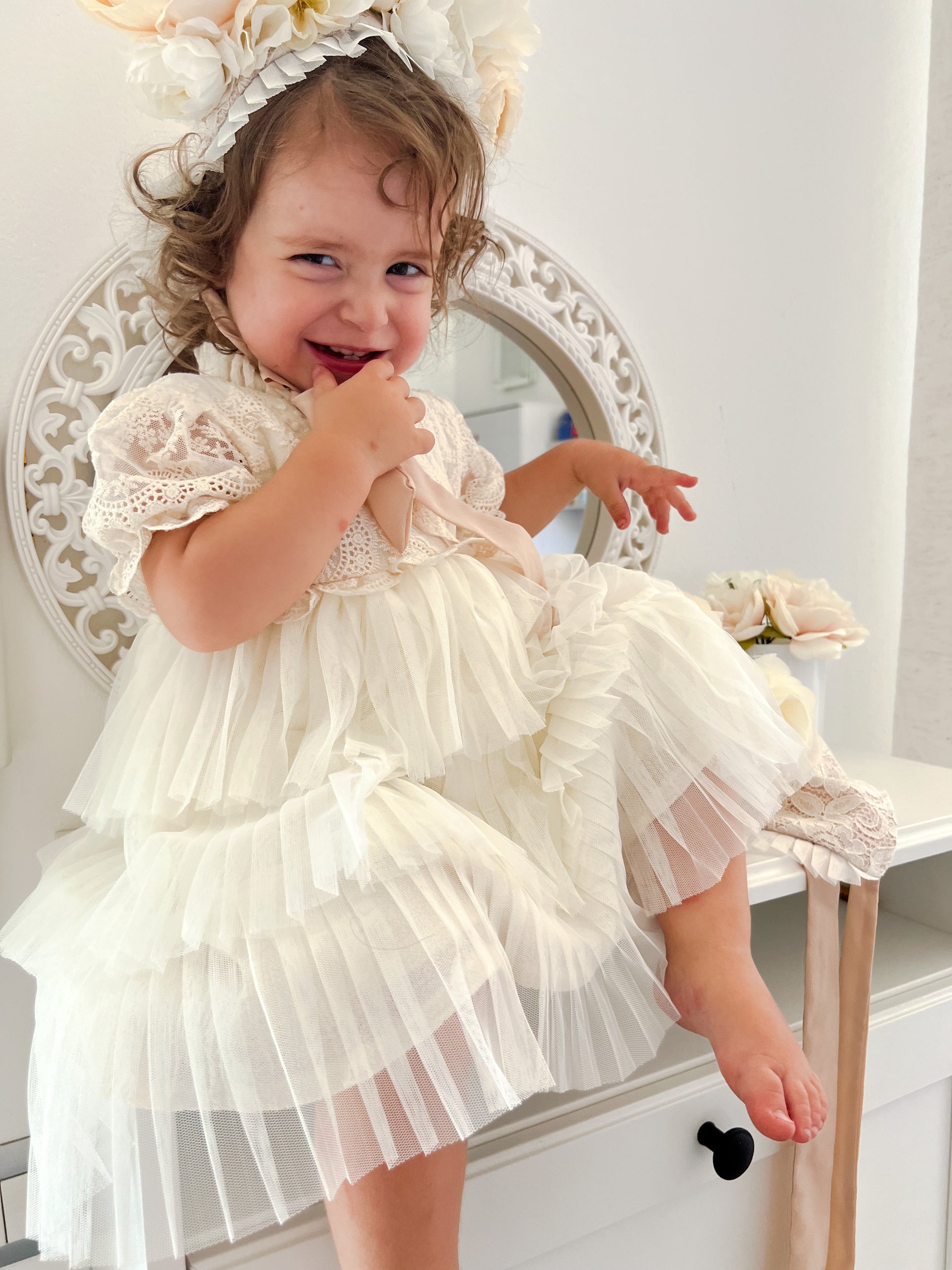 Fustan pagezimi dhe eventesh, me meng te shkurta, punuar me tantelle, lino dhe tyl francez me pala.