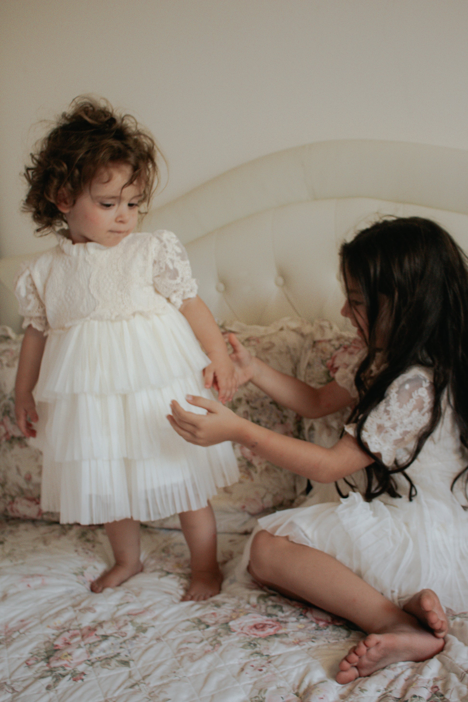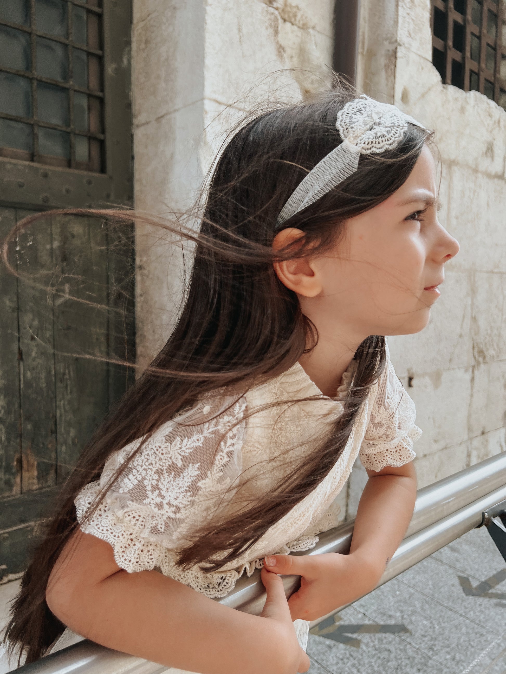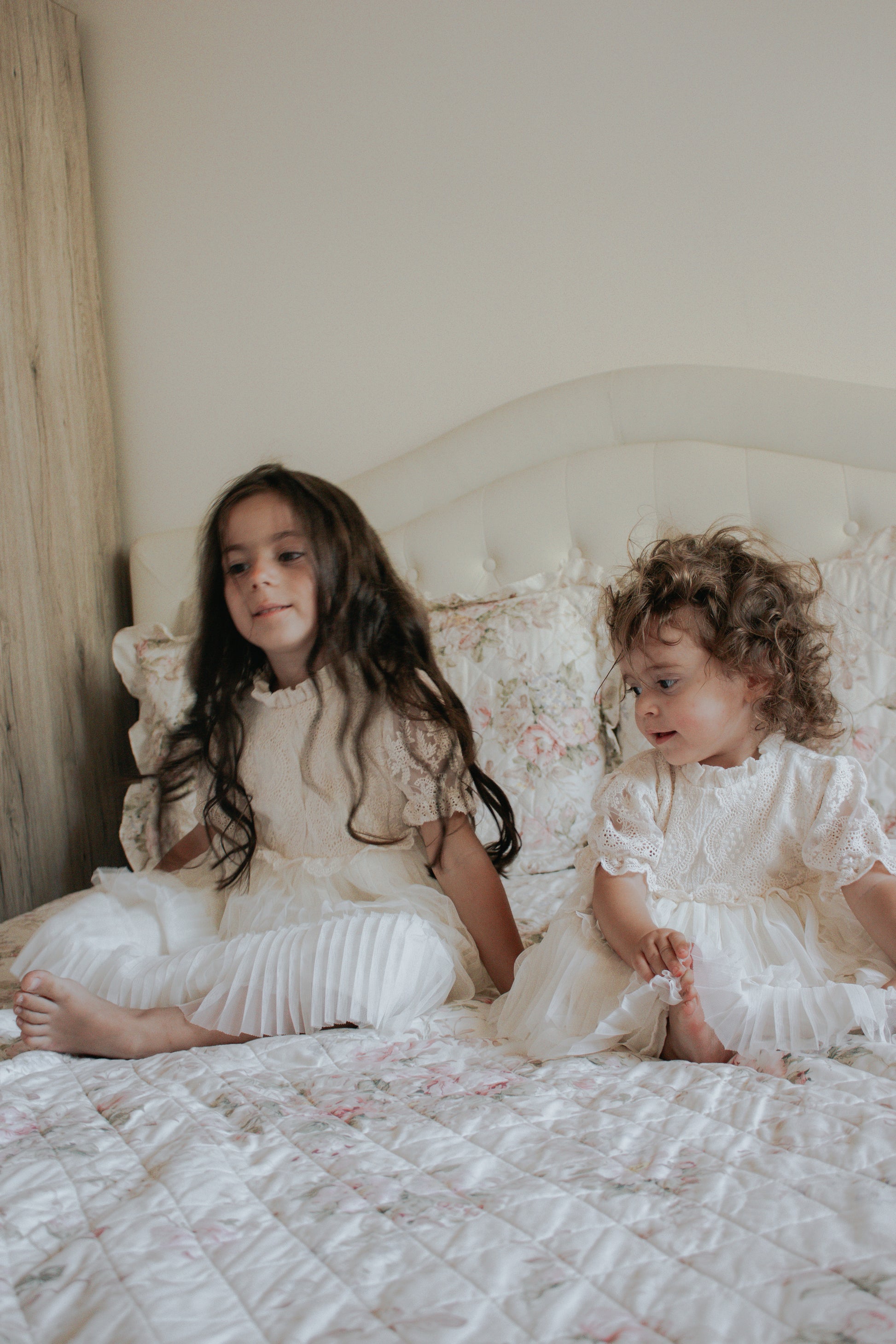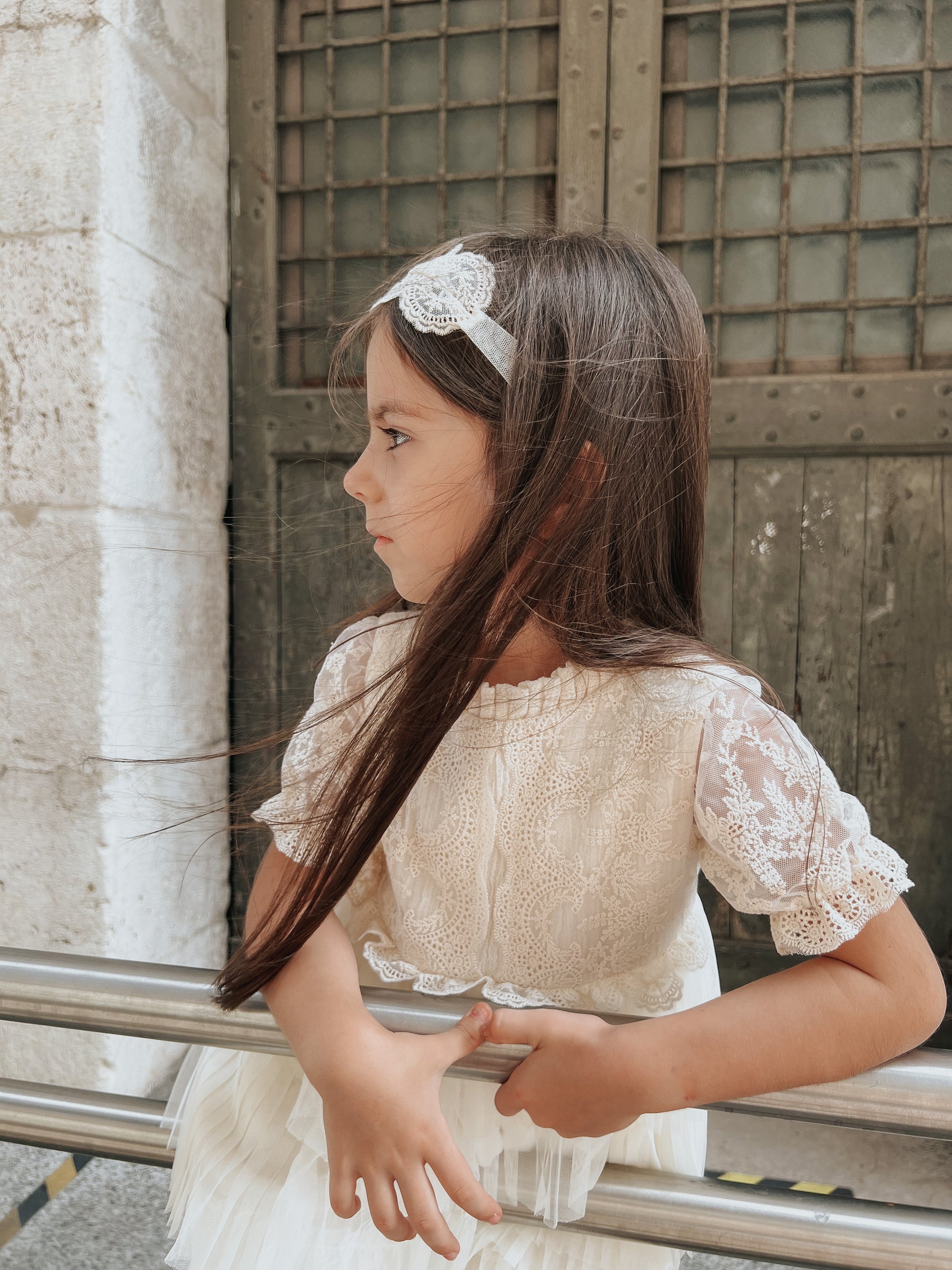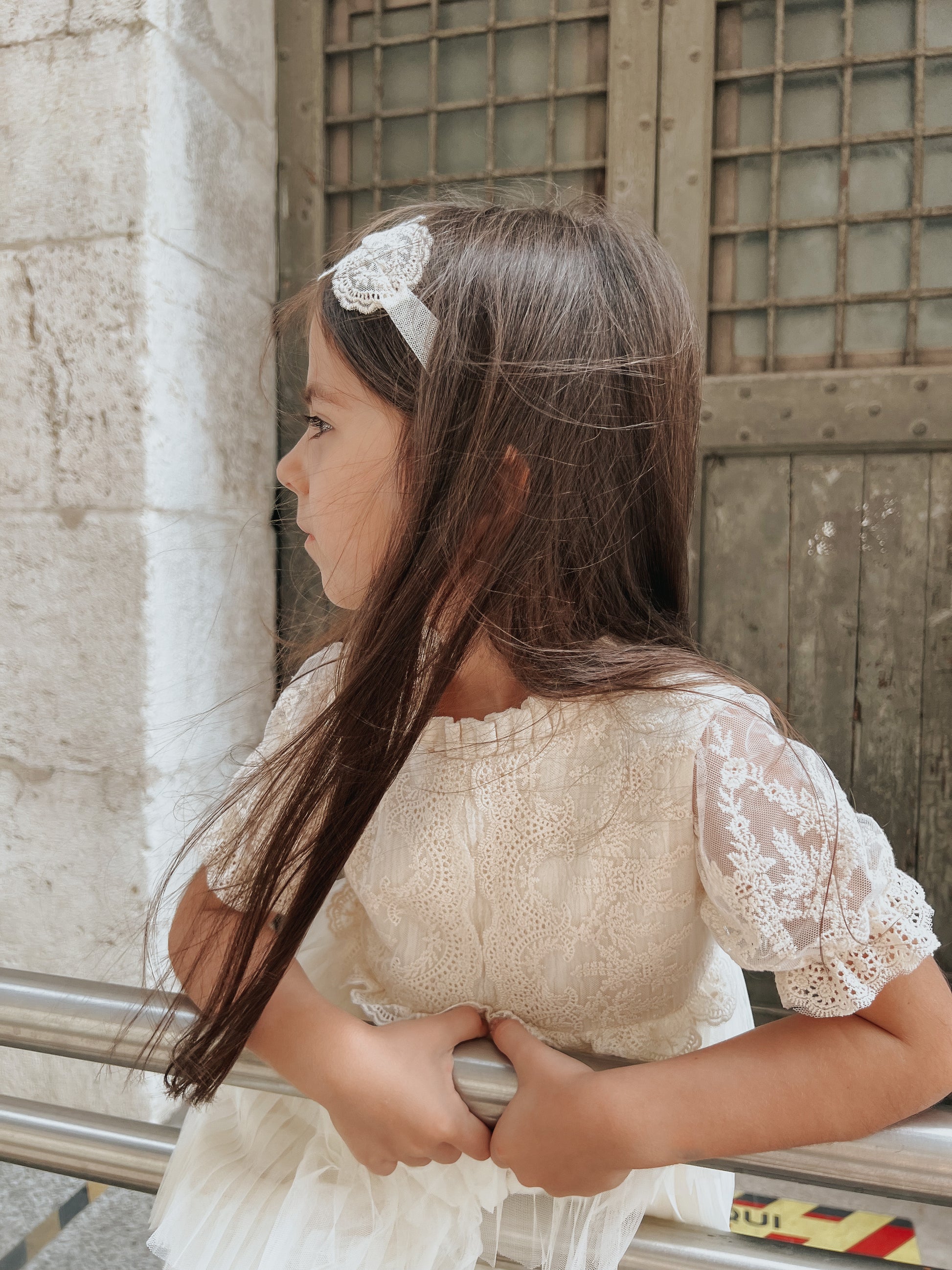 Fustan pagezimi dhe eventesh, me meng te shkurta, punuar me tantelle, lino dhe tyl francez me pala.