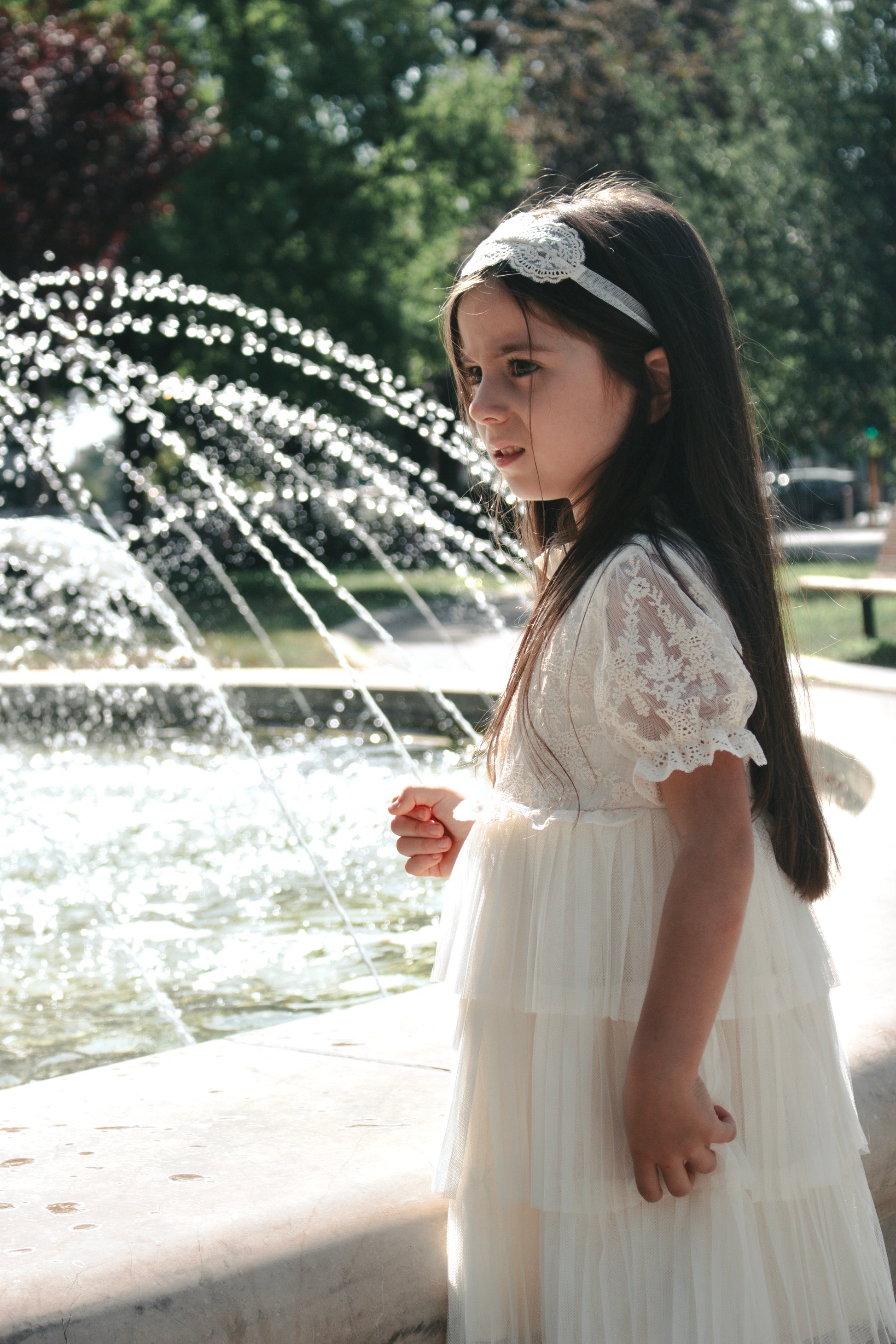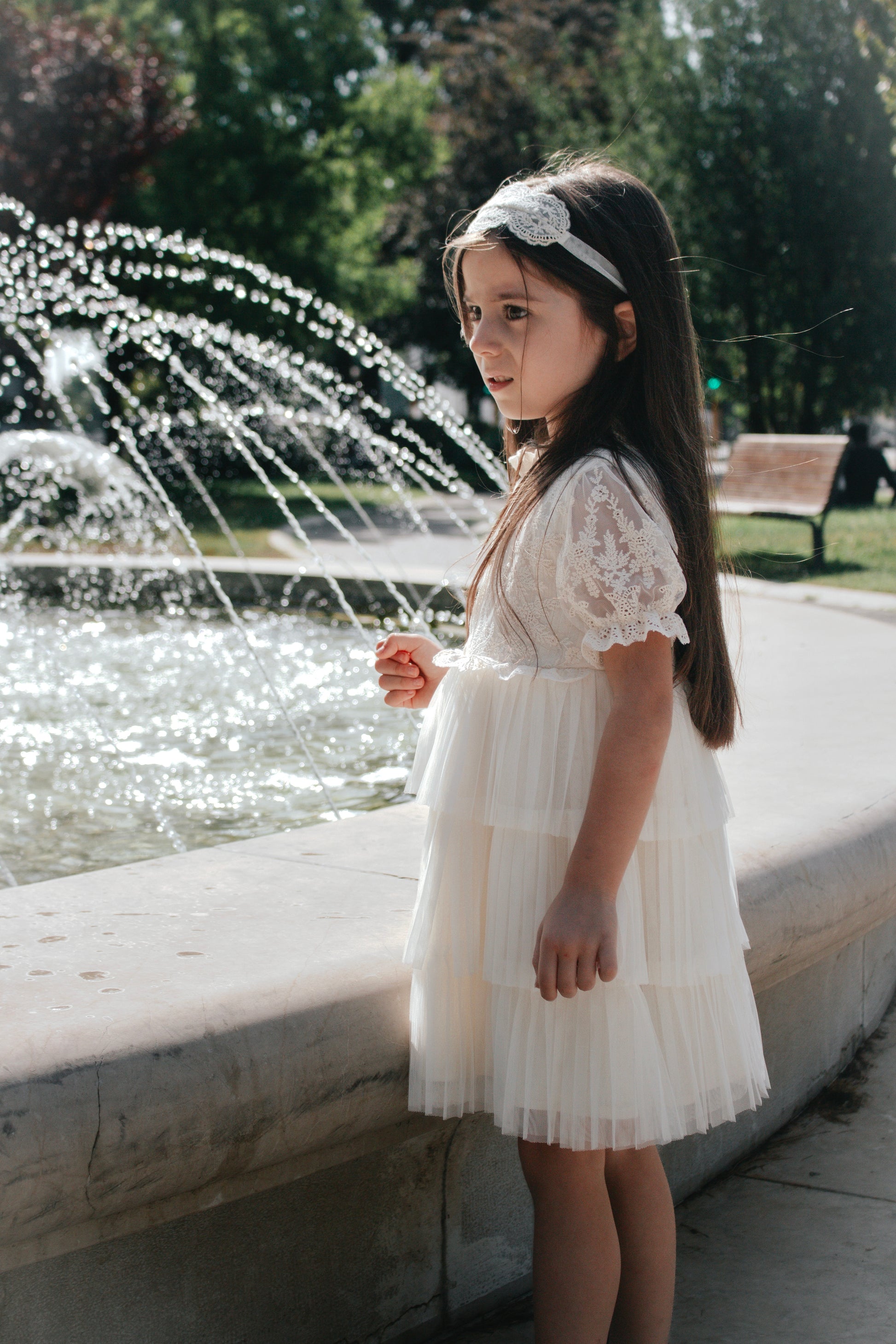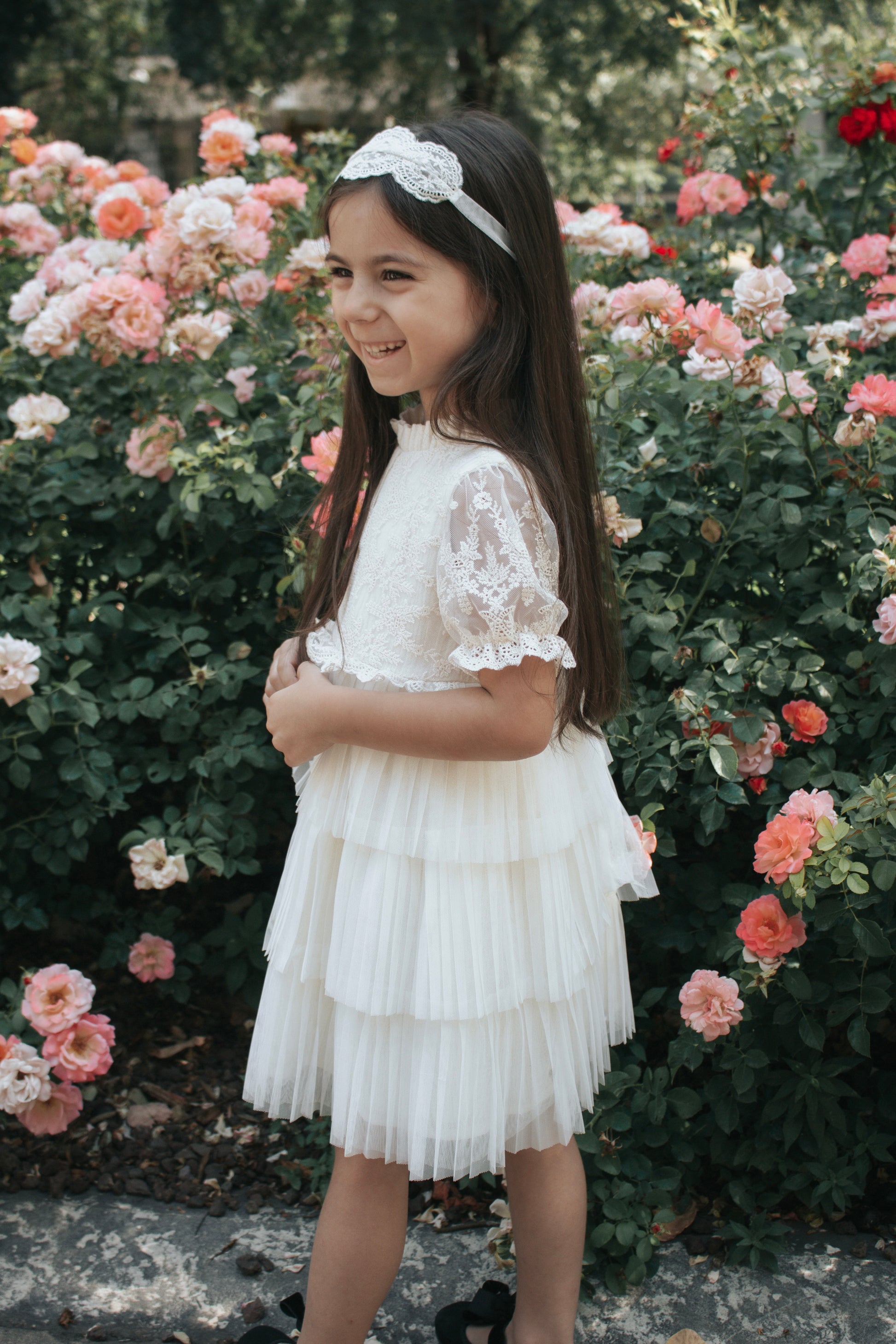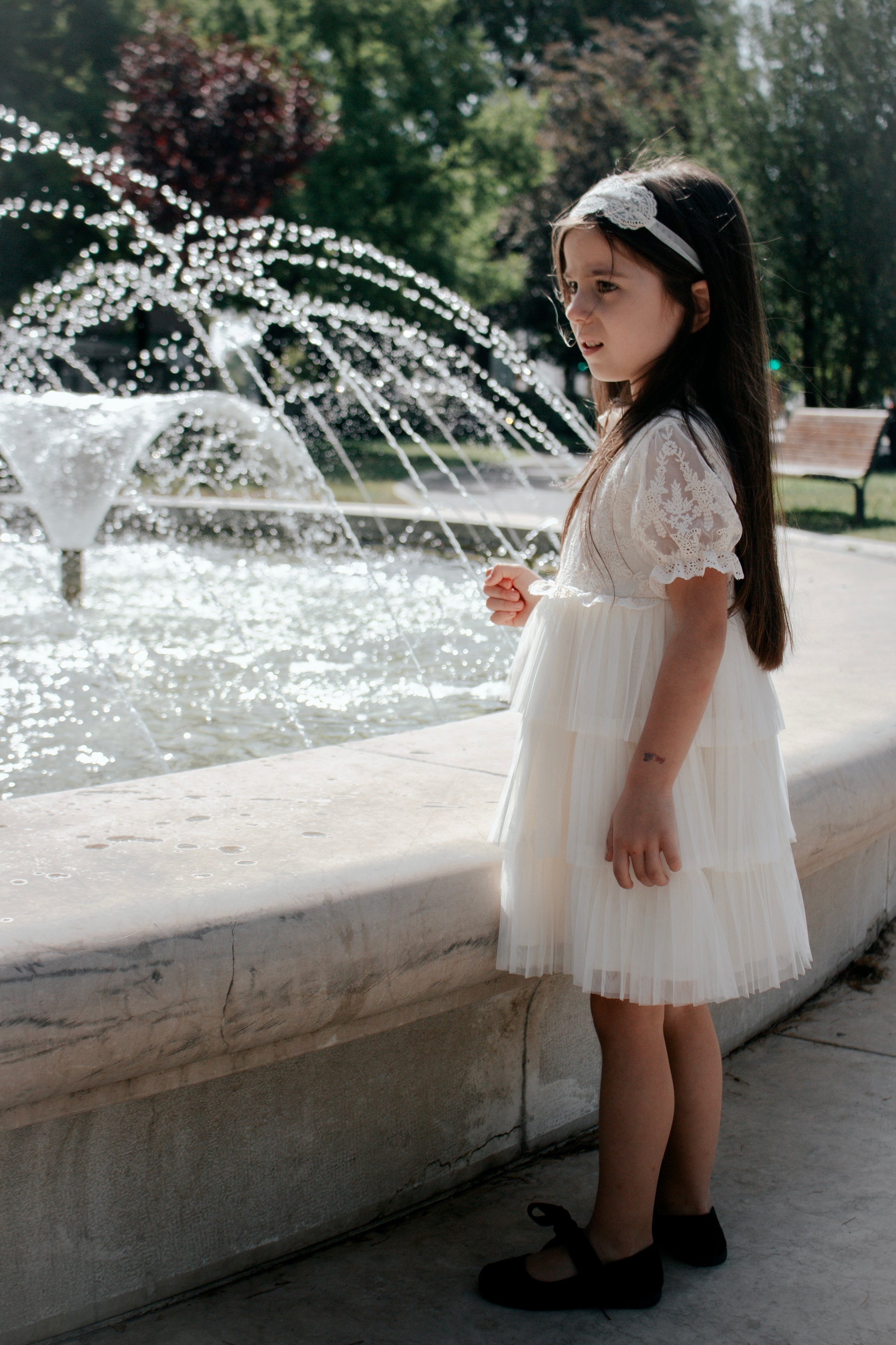Fustan pagezimi dhe eventesh, me meng te shkurta, punuar me tantelle, lino dhe tyl francez me pala.