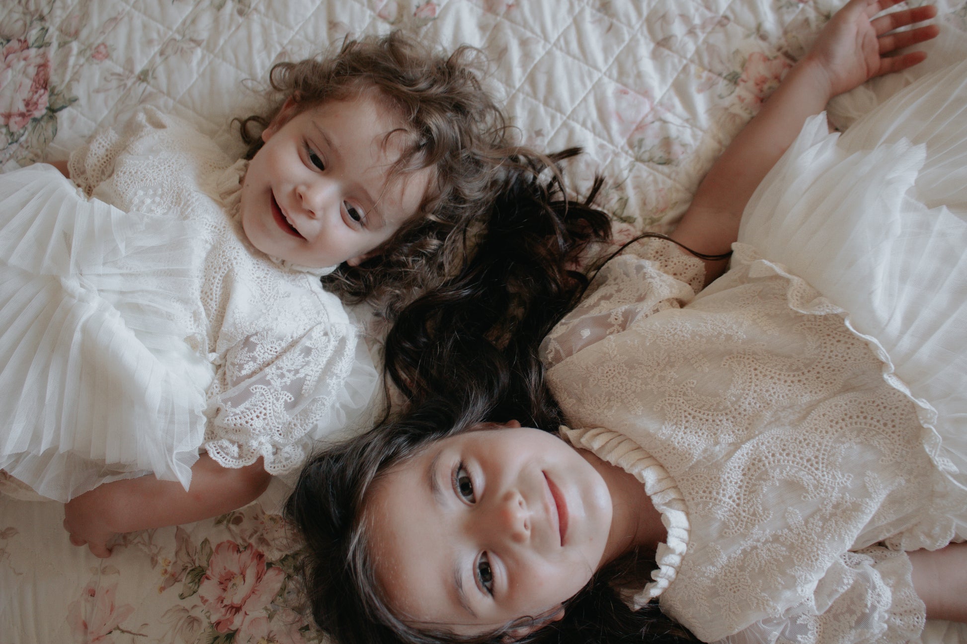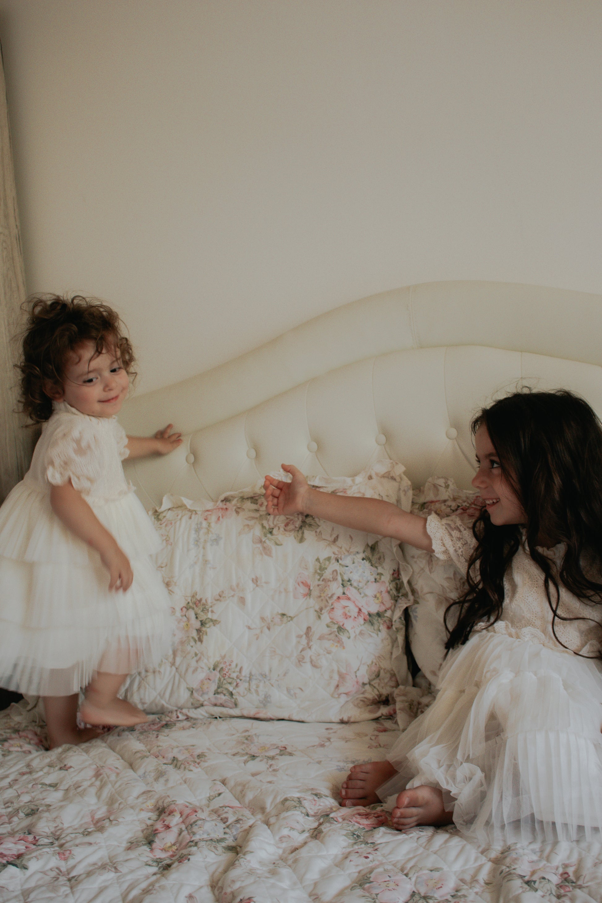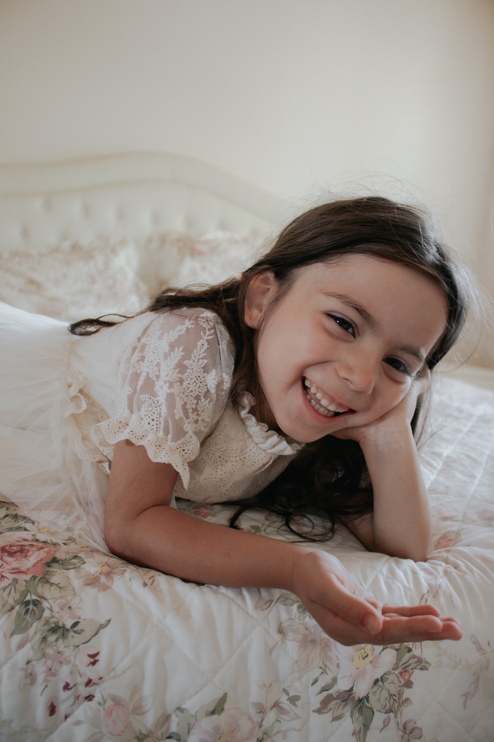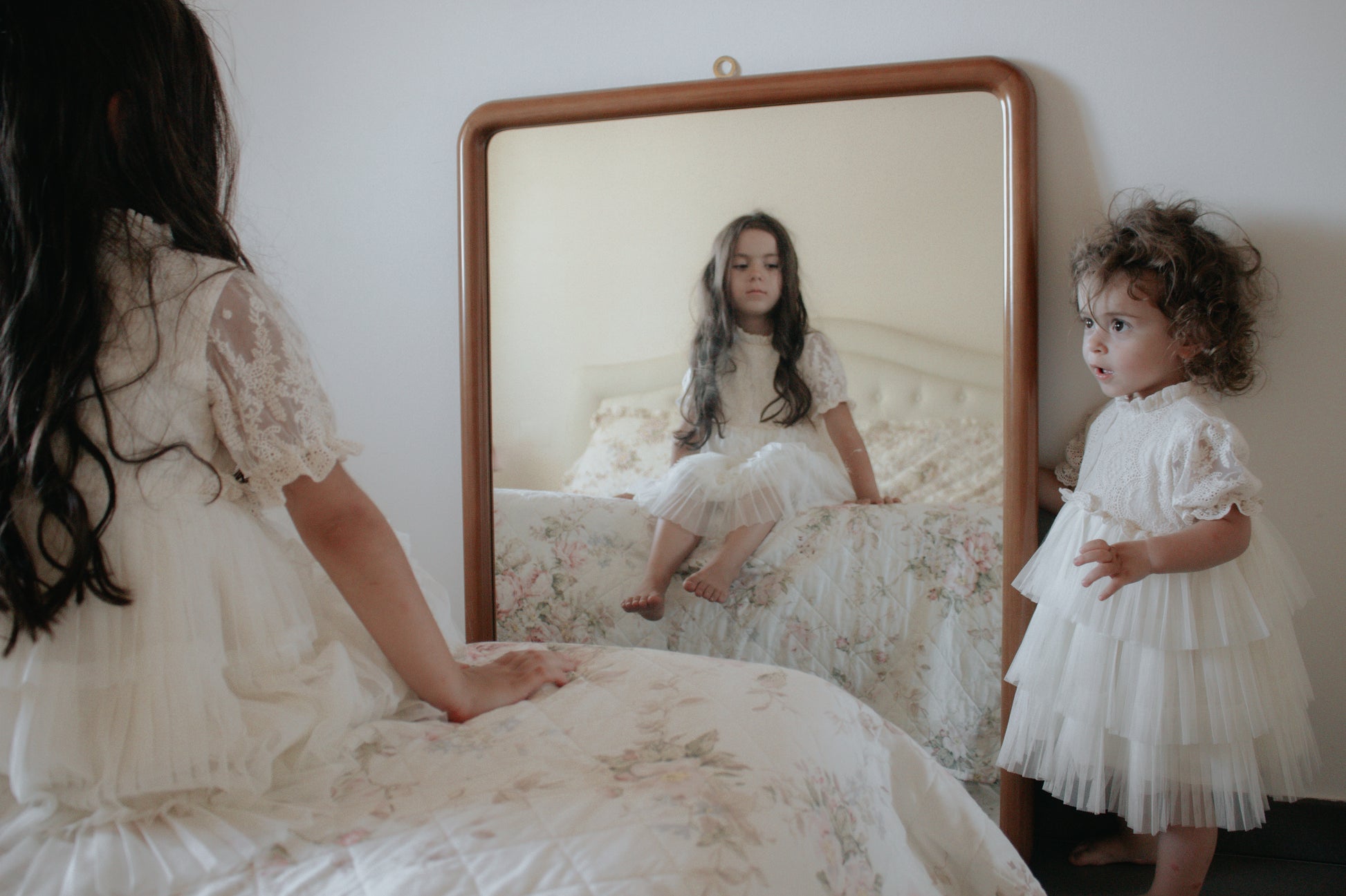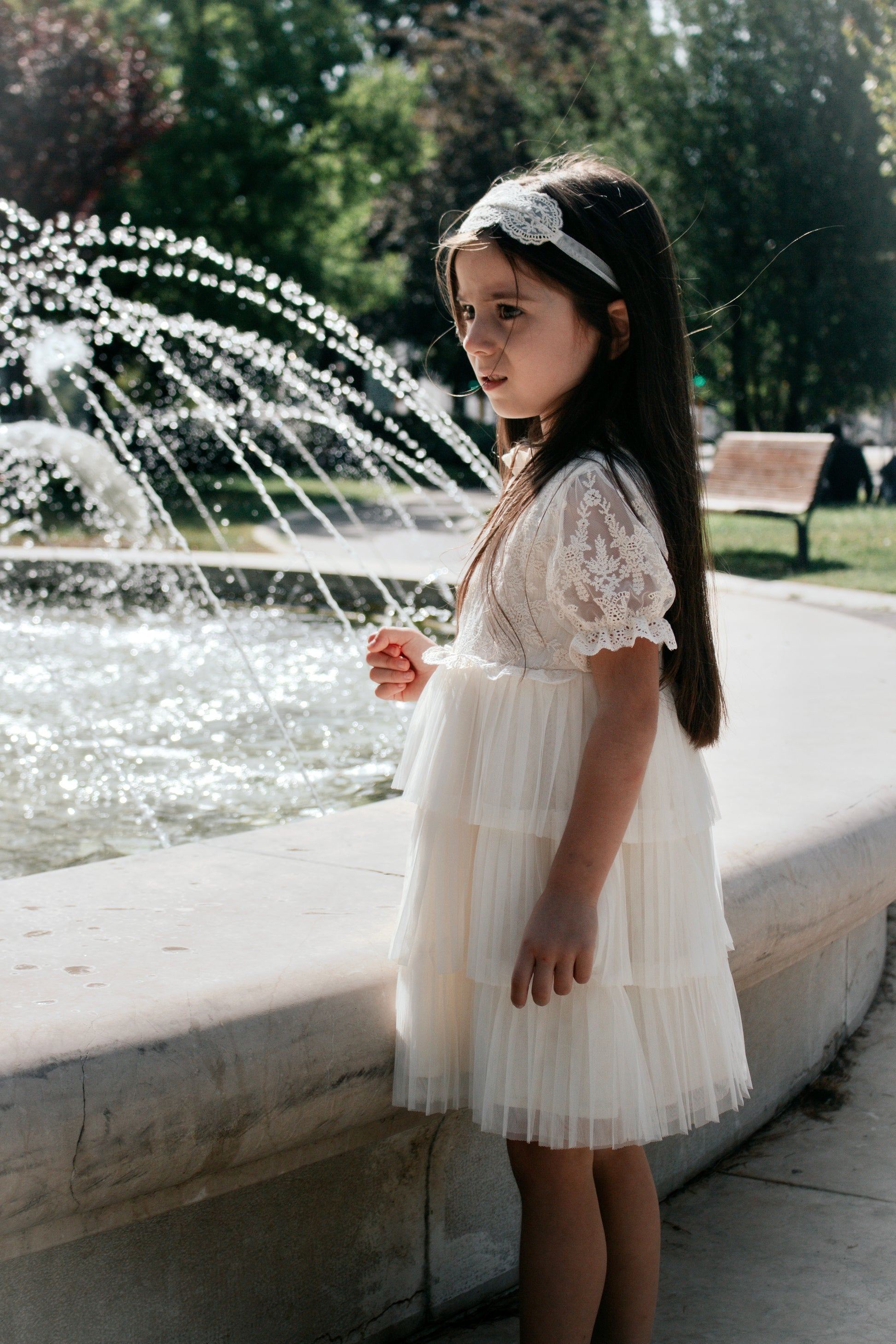 Fustan pagezimi dhe eventesh, me meng te shkurta, punuar me tantelle, lino dhe tyl francez me pala.