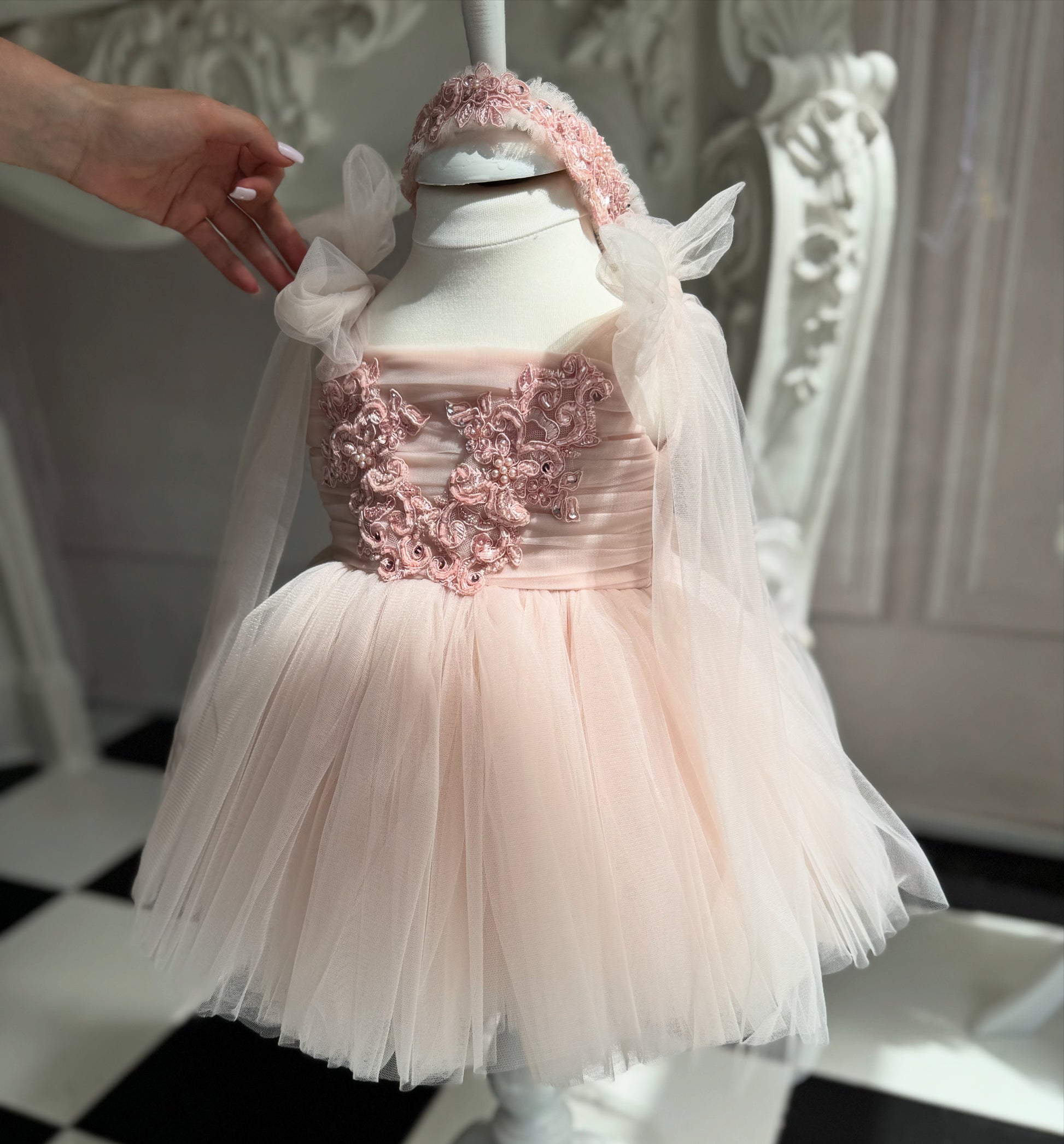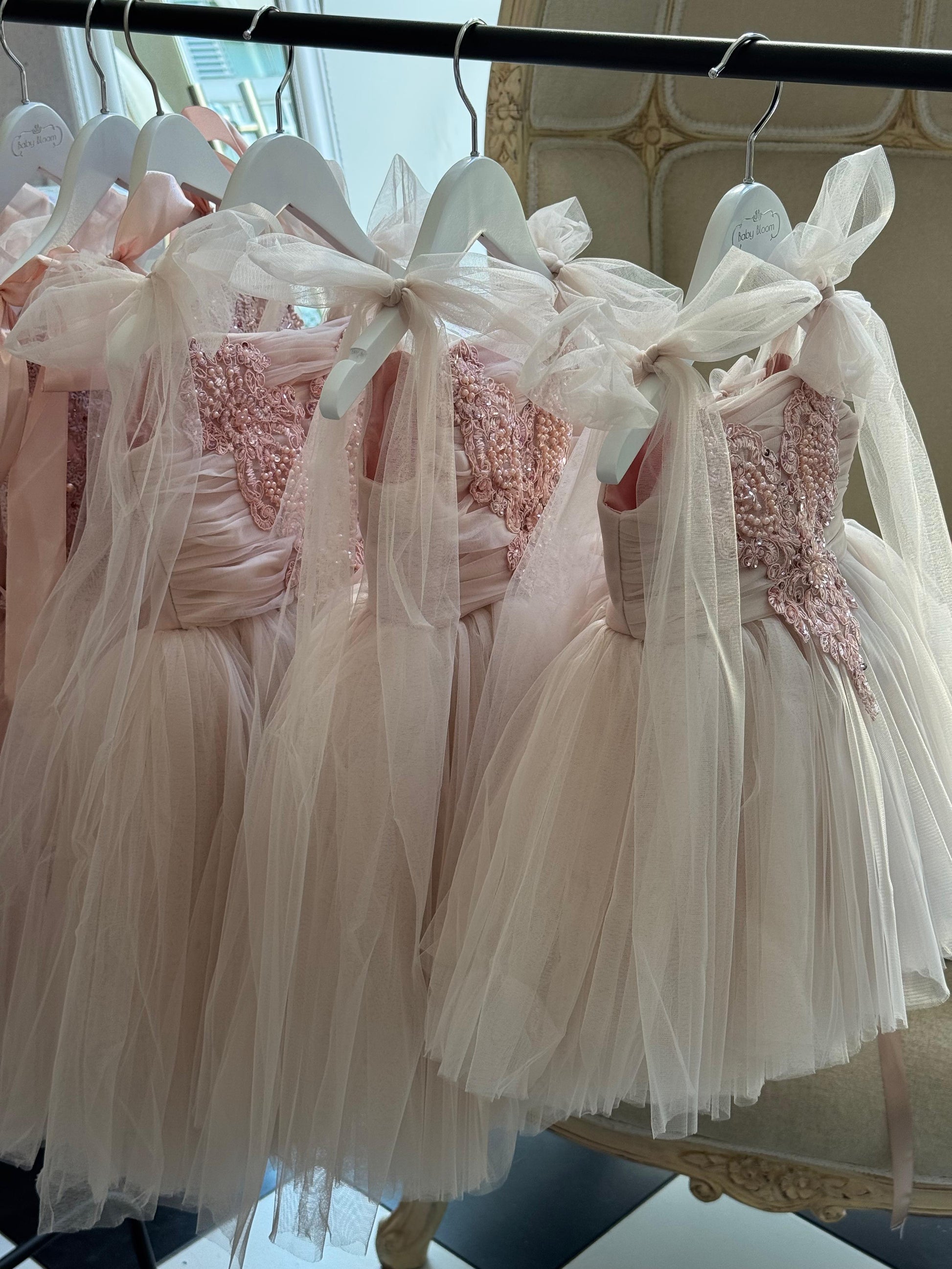 Fustan eventesh, me tirante ne forme fjongosh tyli dhe aplikacione te qendisura me gure.
