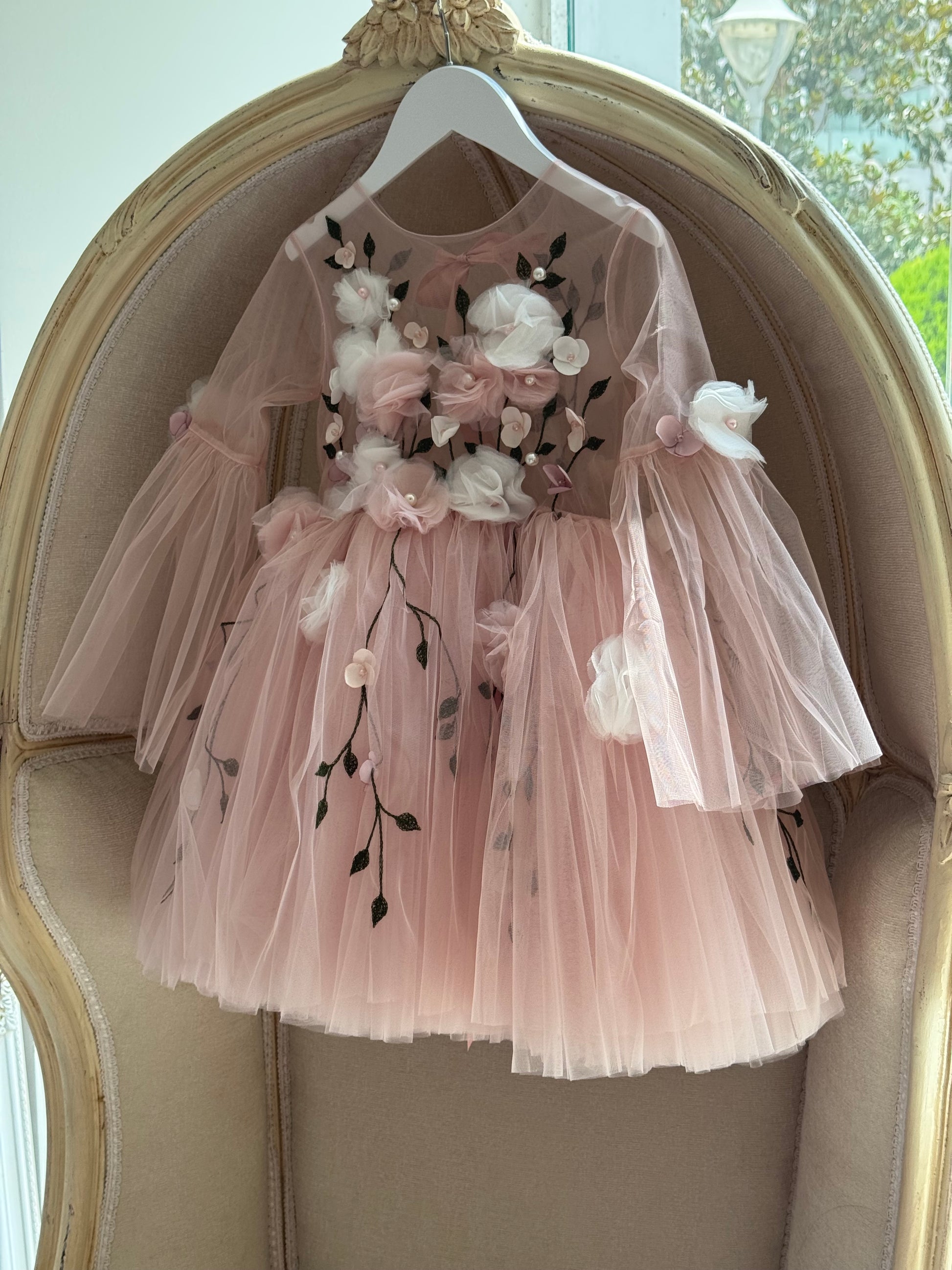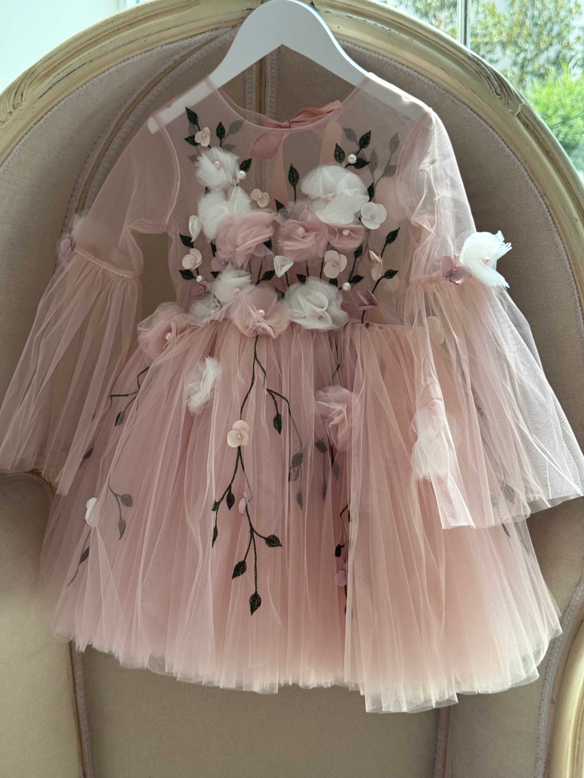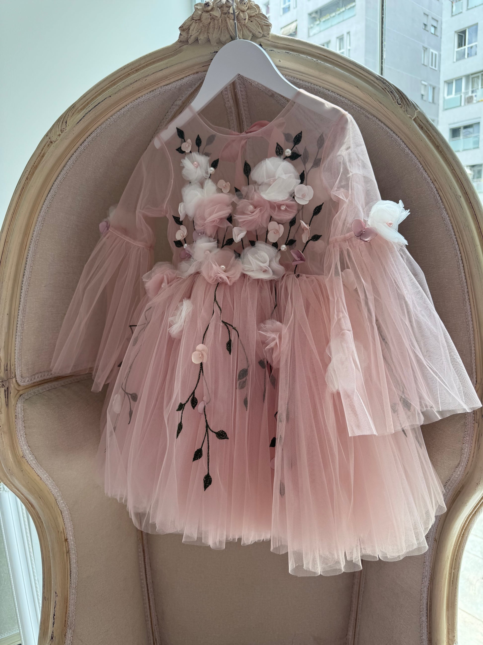 Fustan me meng te gjata tyli, detaje lulesh dhe shtresa tyli.
