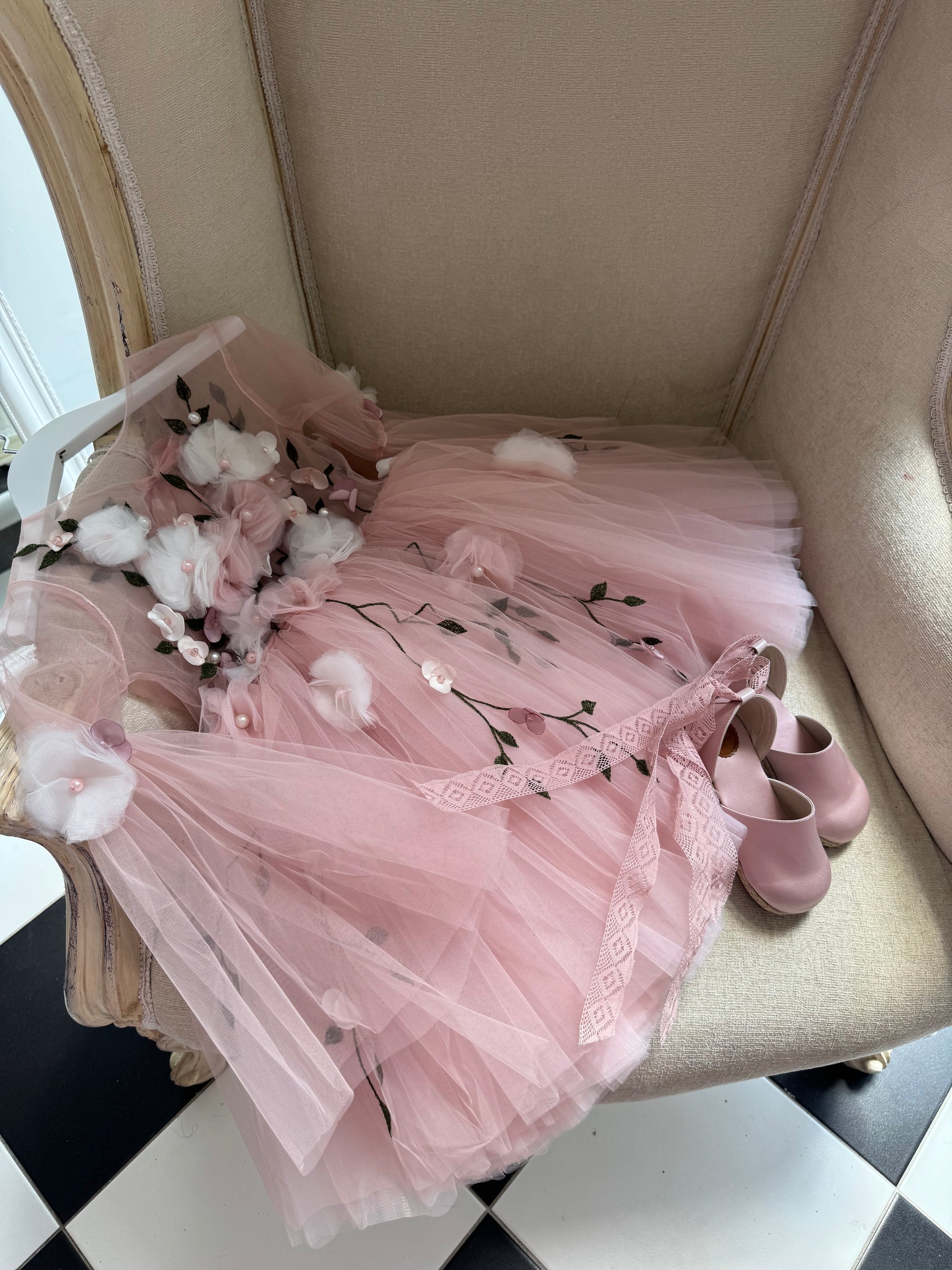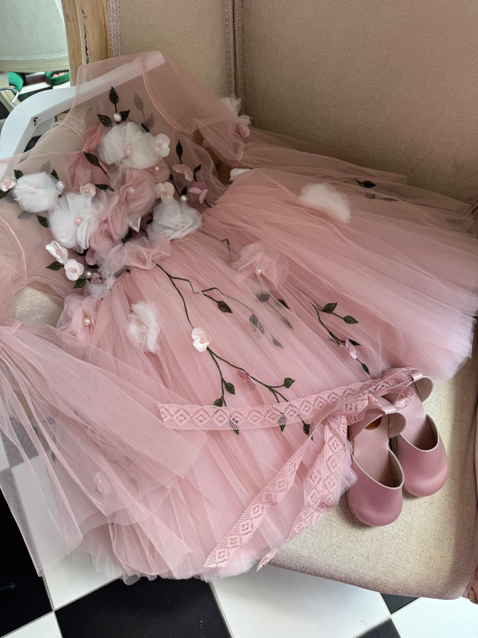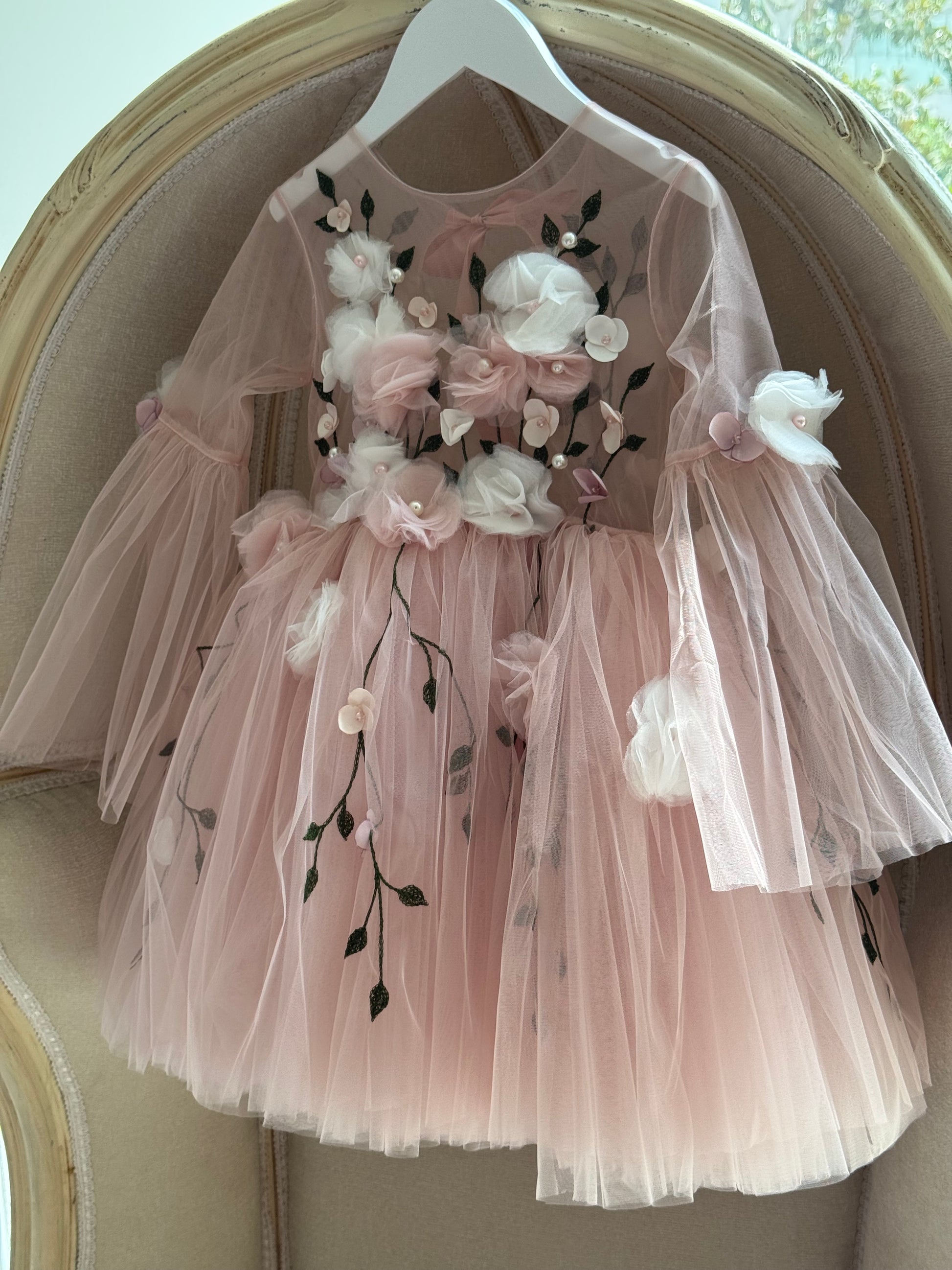 Fustan me meng te gjata tyli, detaje lulesh dhe shtresa tyli.