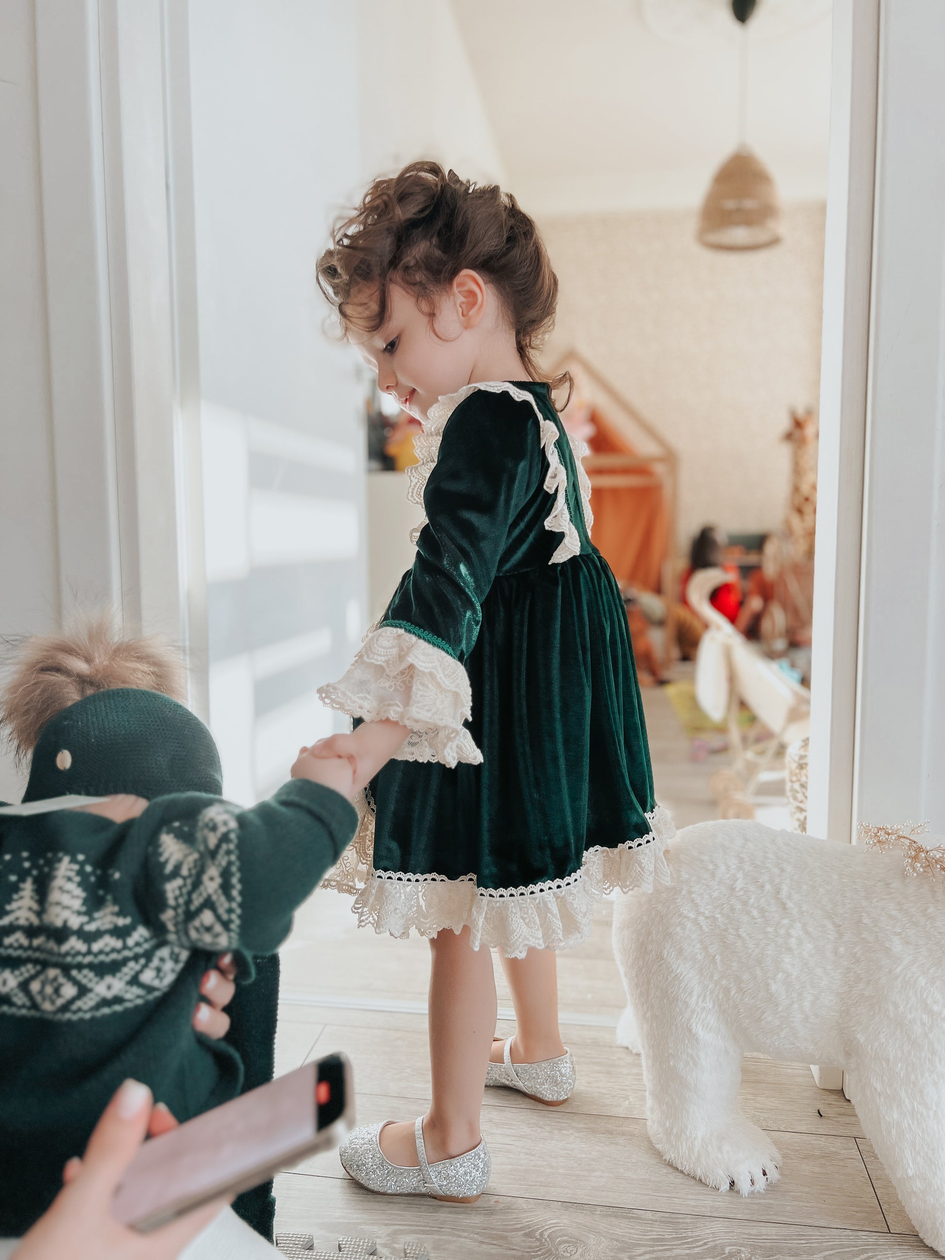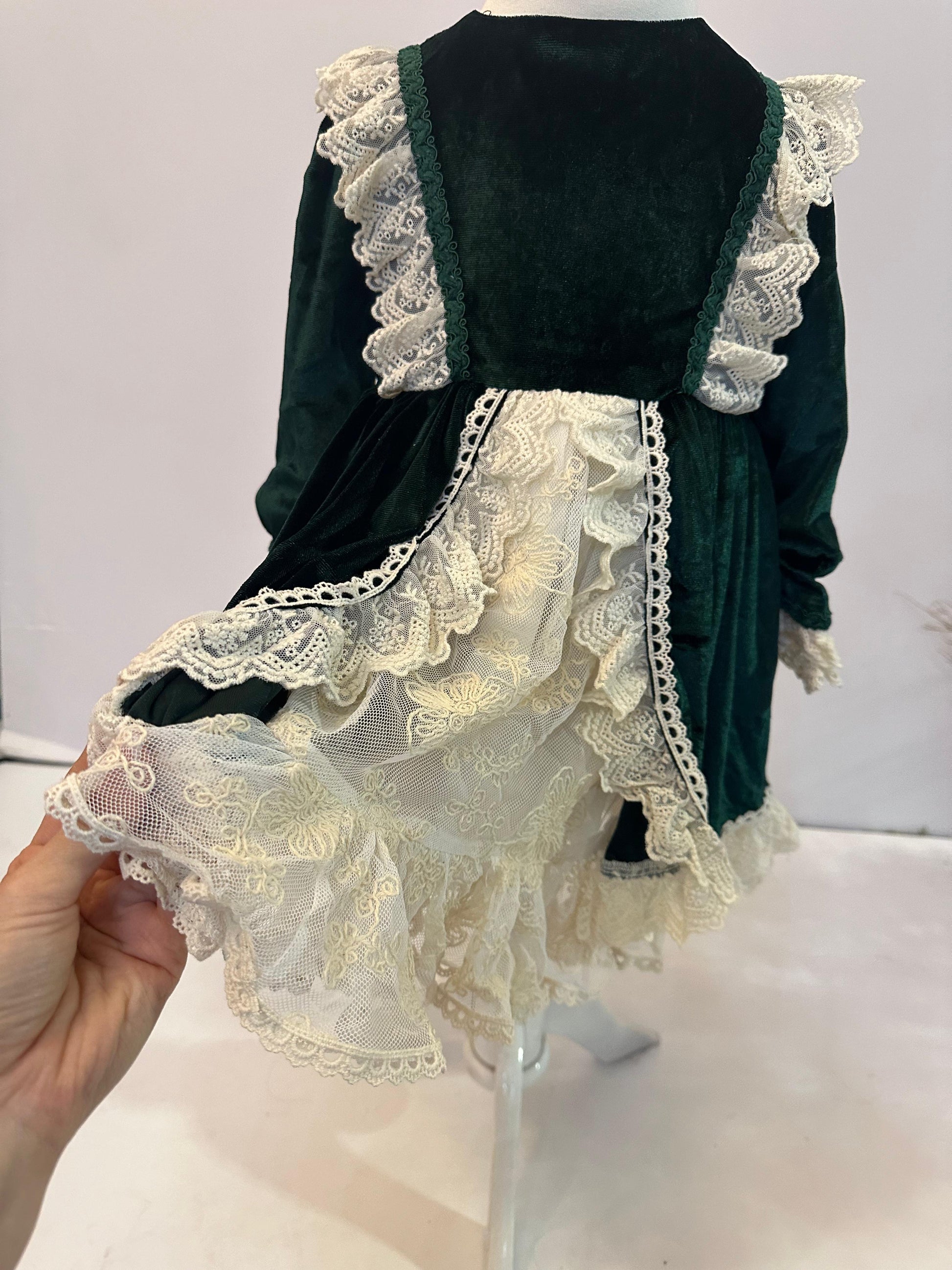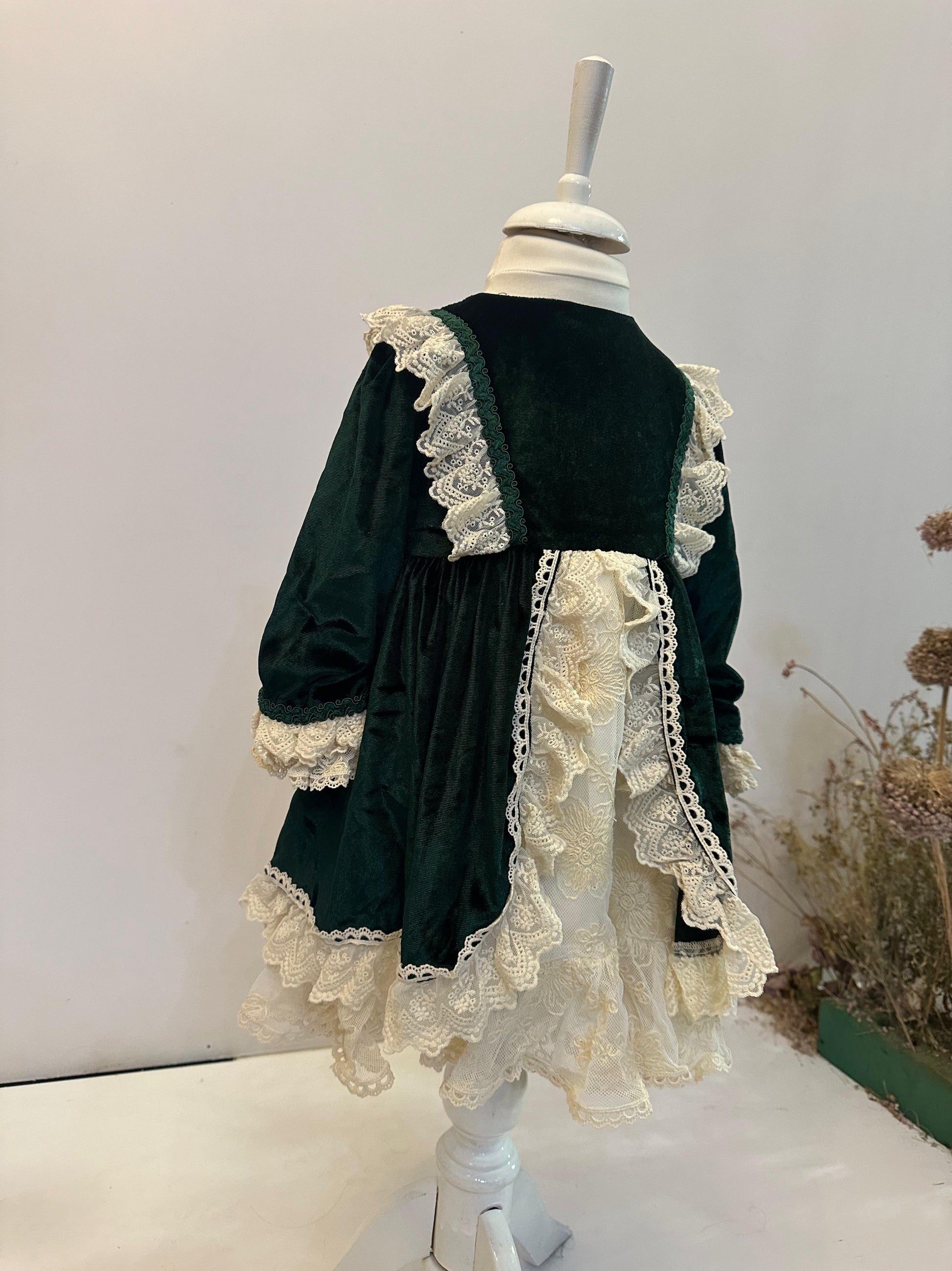 Fustan festiv, velvet jeshil me shtresa tantelle.