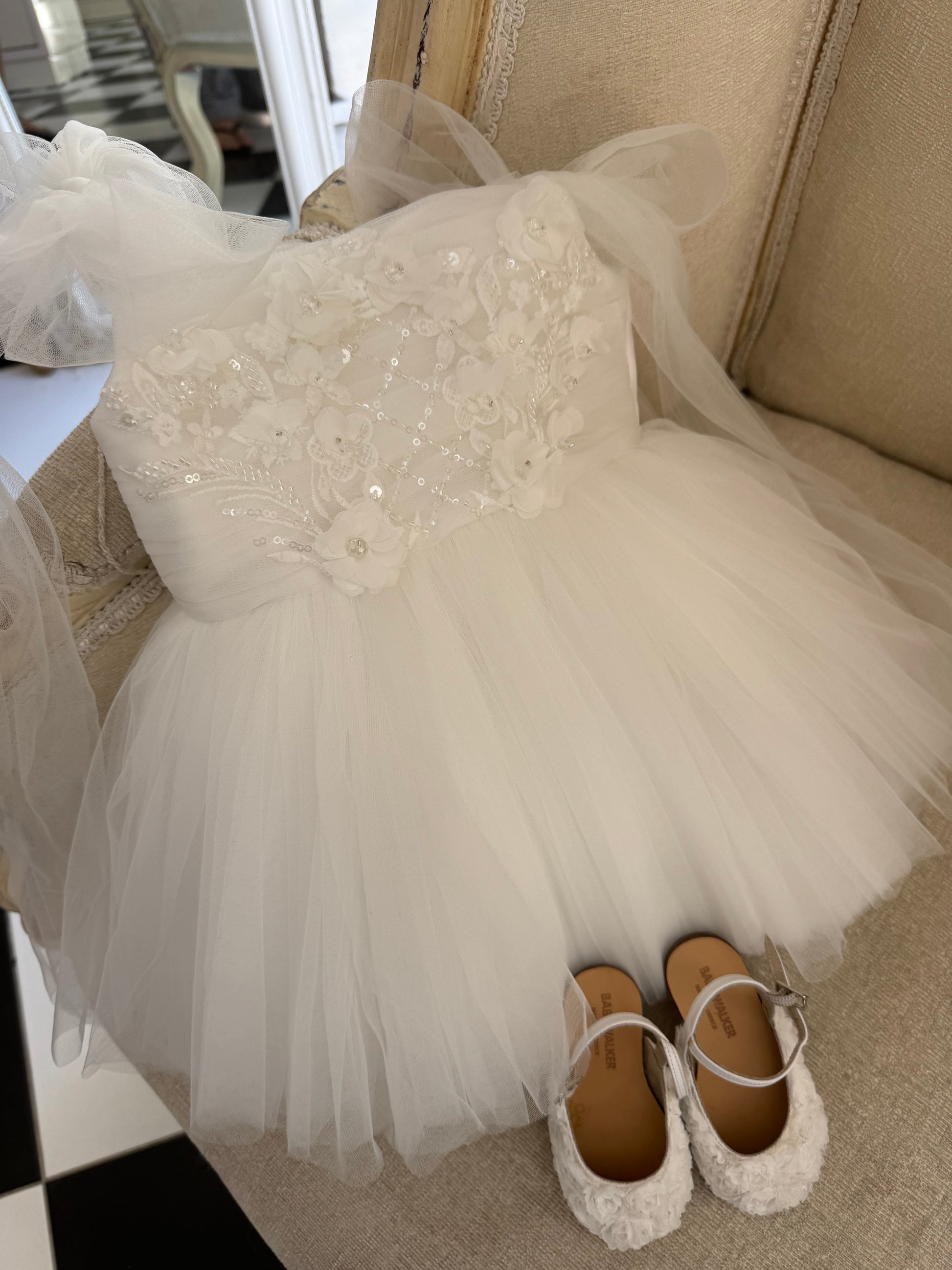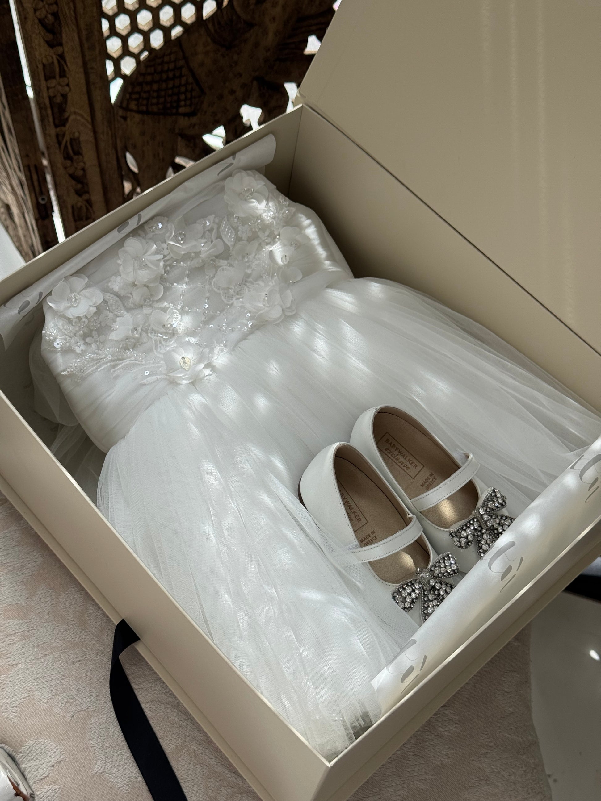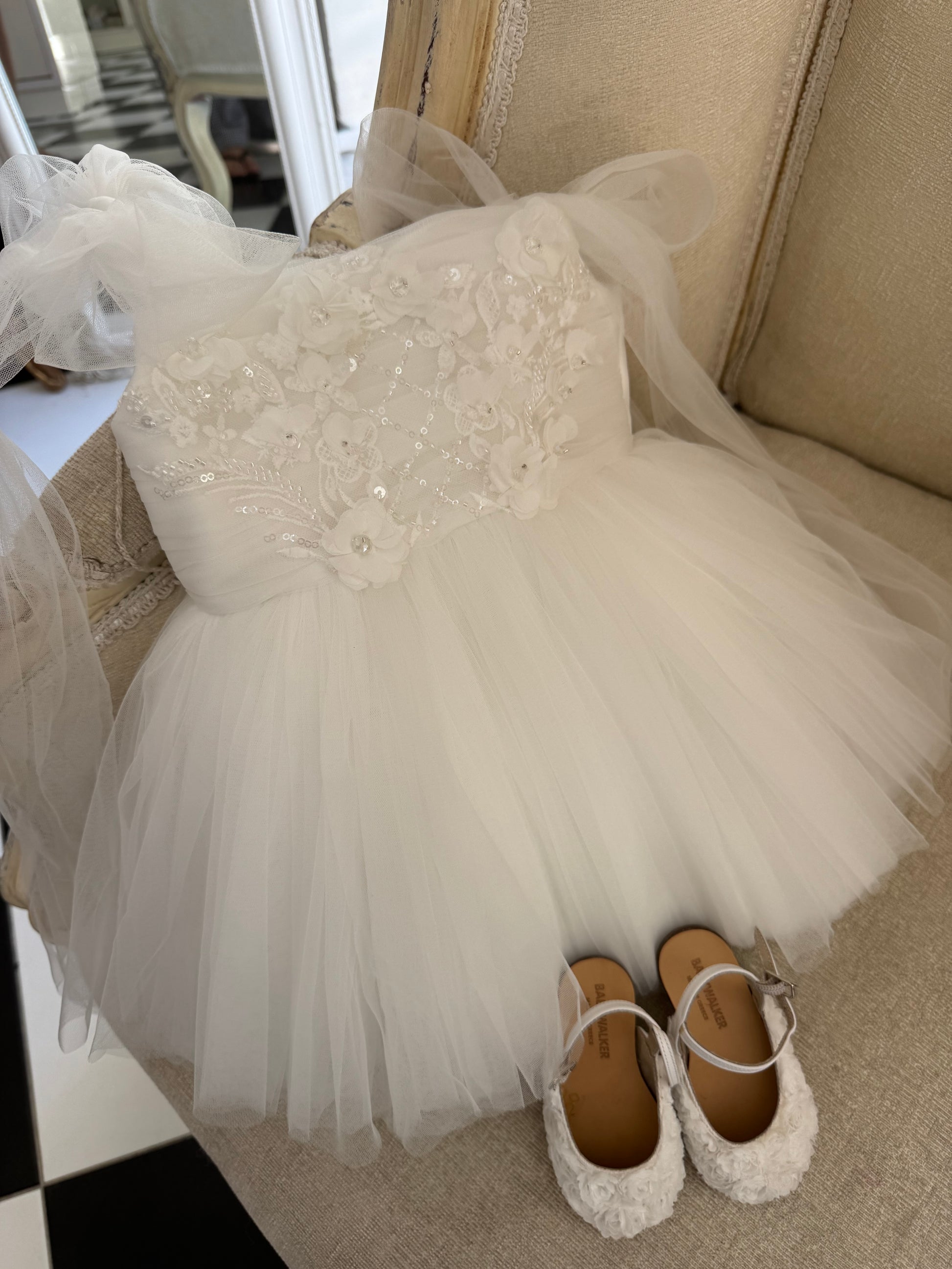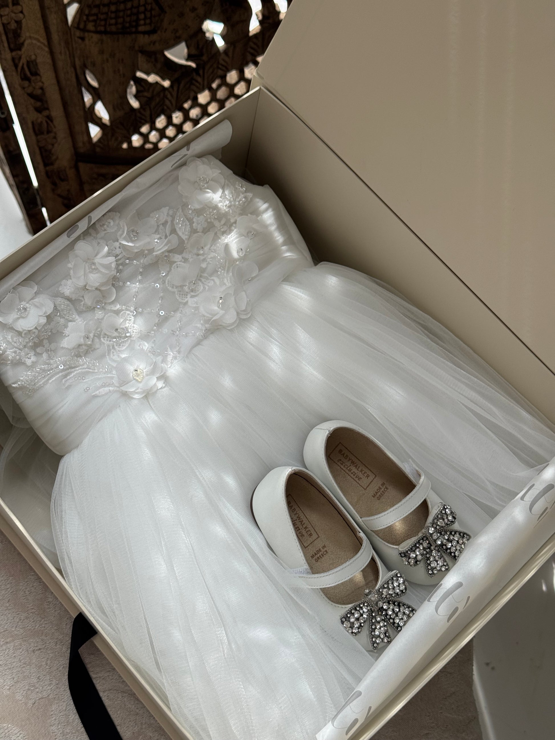 Fustan eventesh me shtresa tyli te bardhe, me tirante tyli dhe detaje te qendisura.