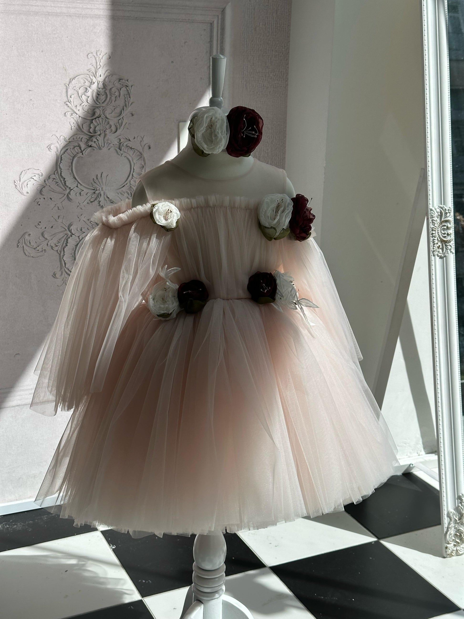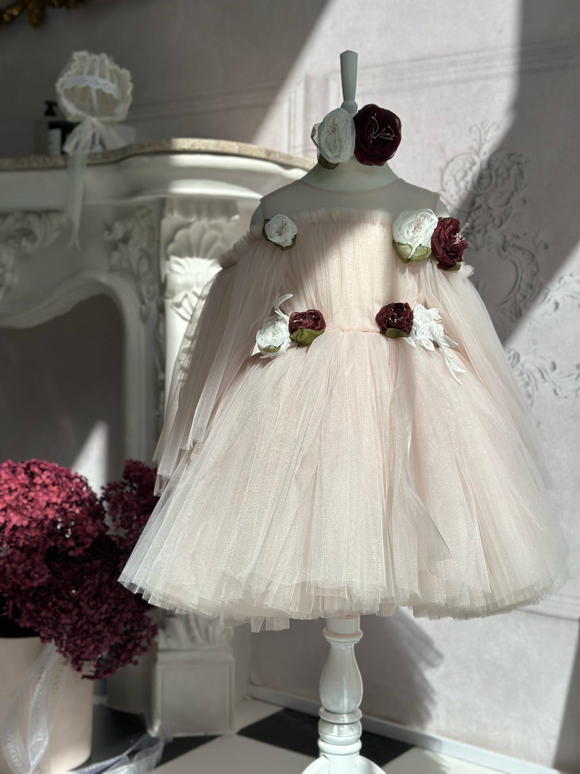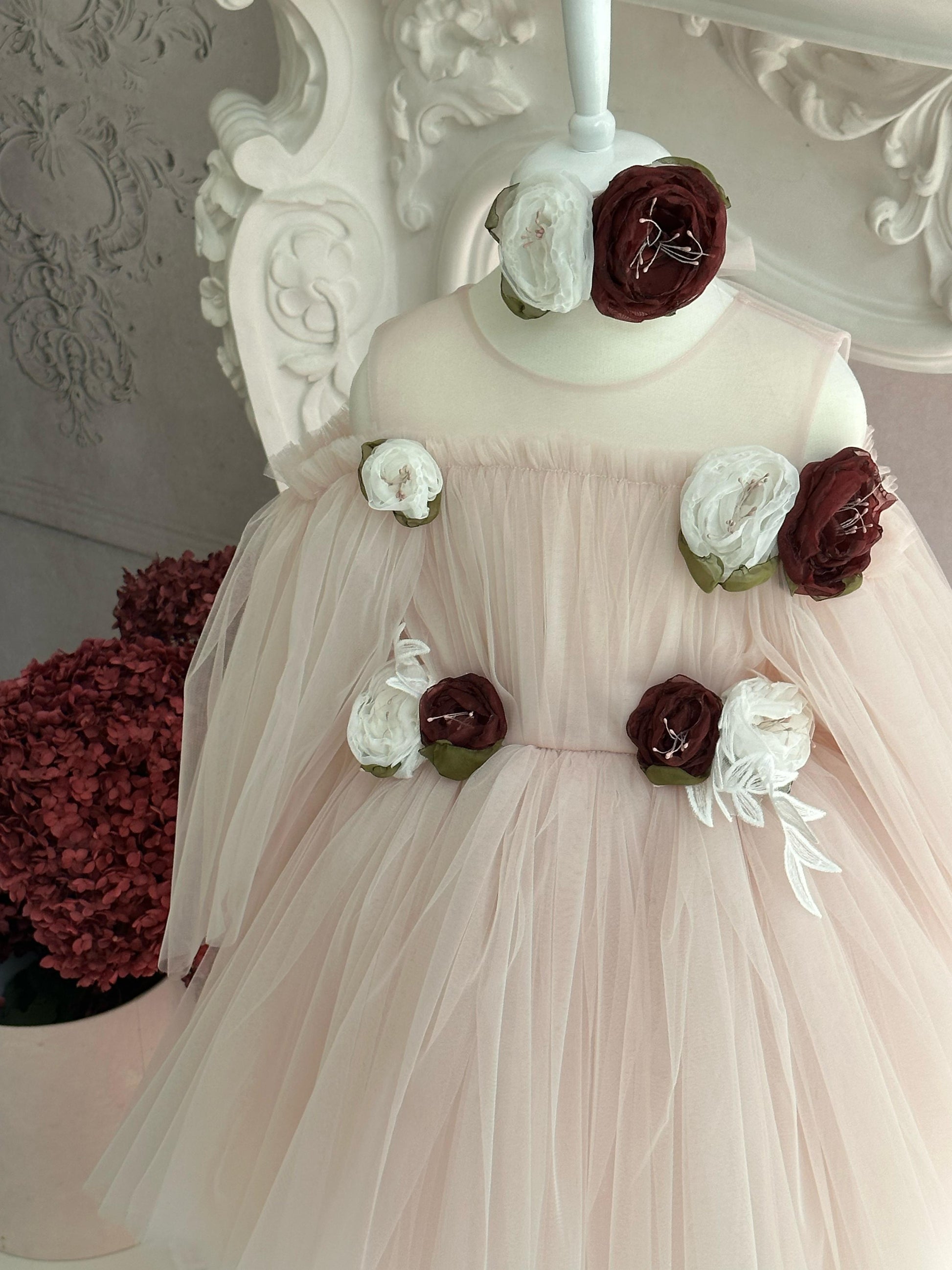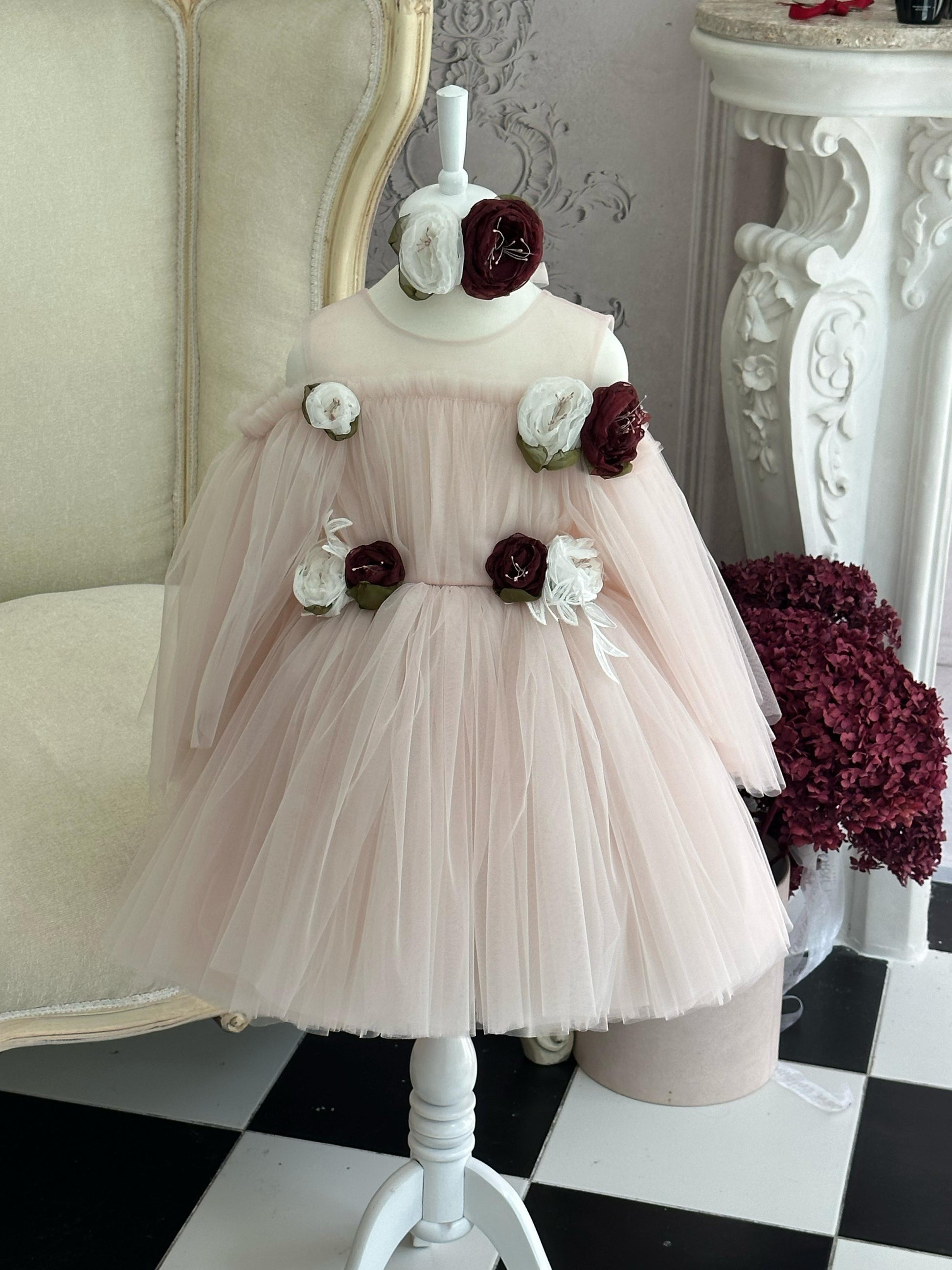 Fustan eventesh, tyl me aplikacione lulesh te punuara