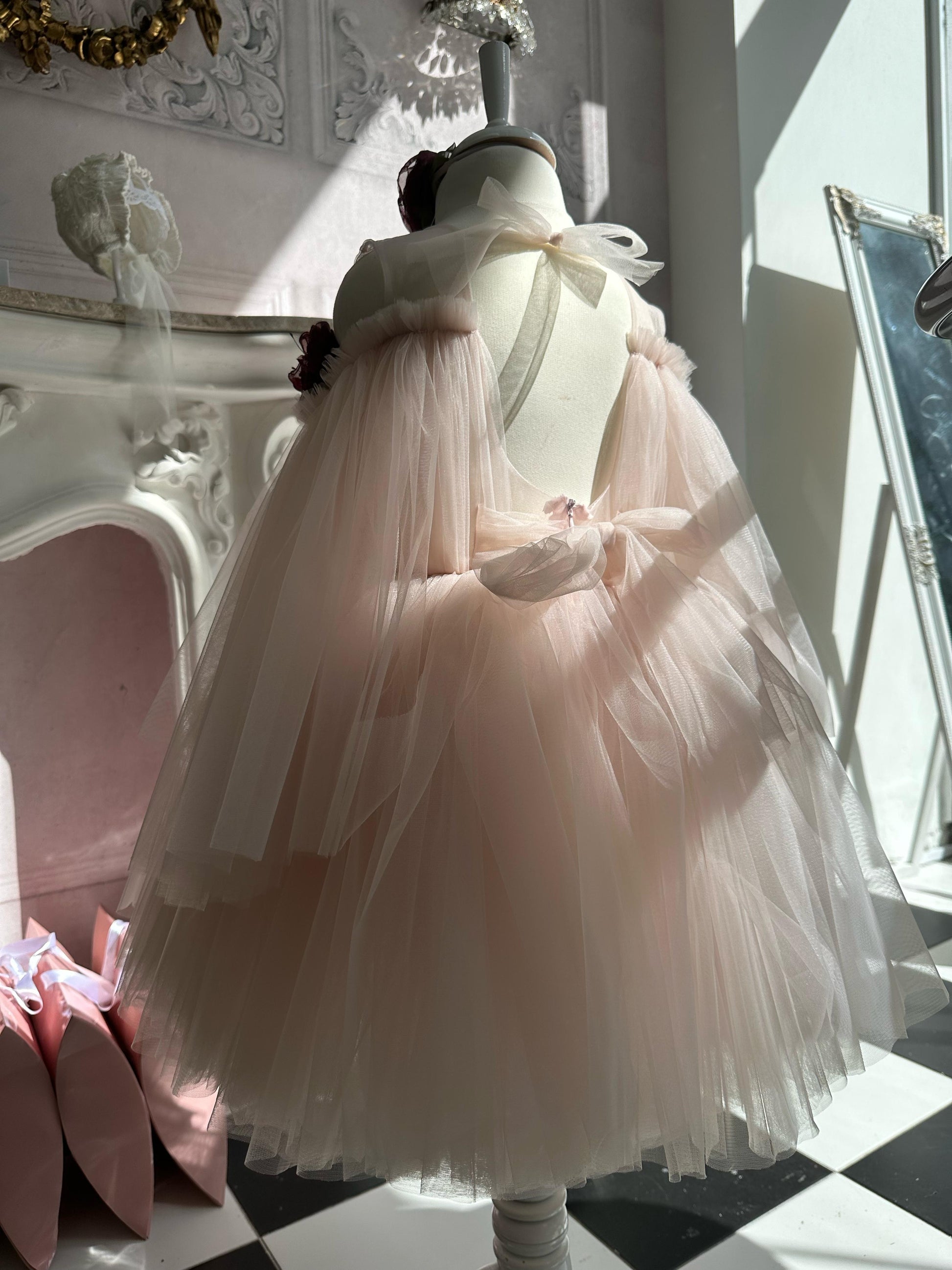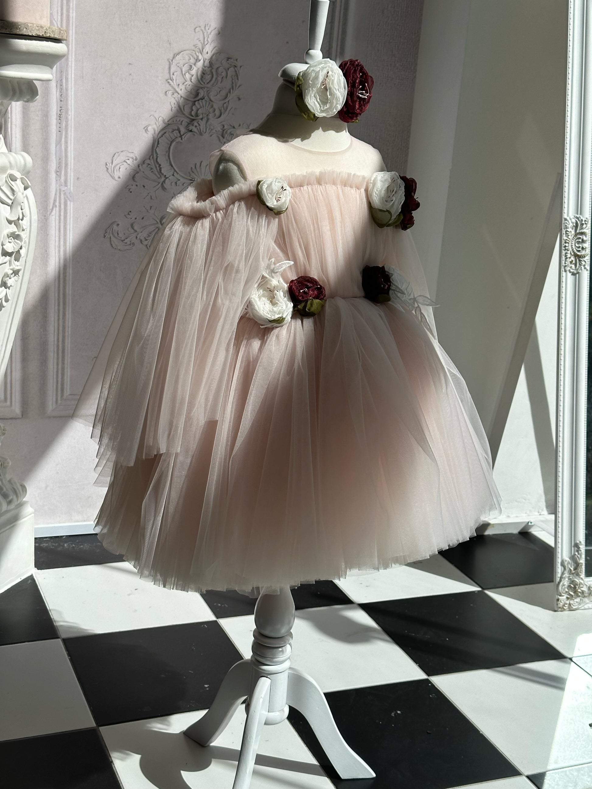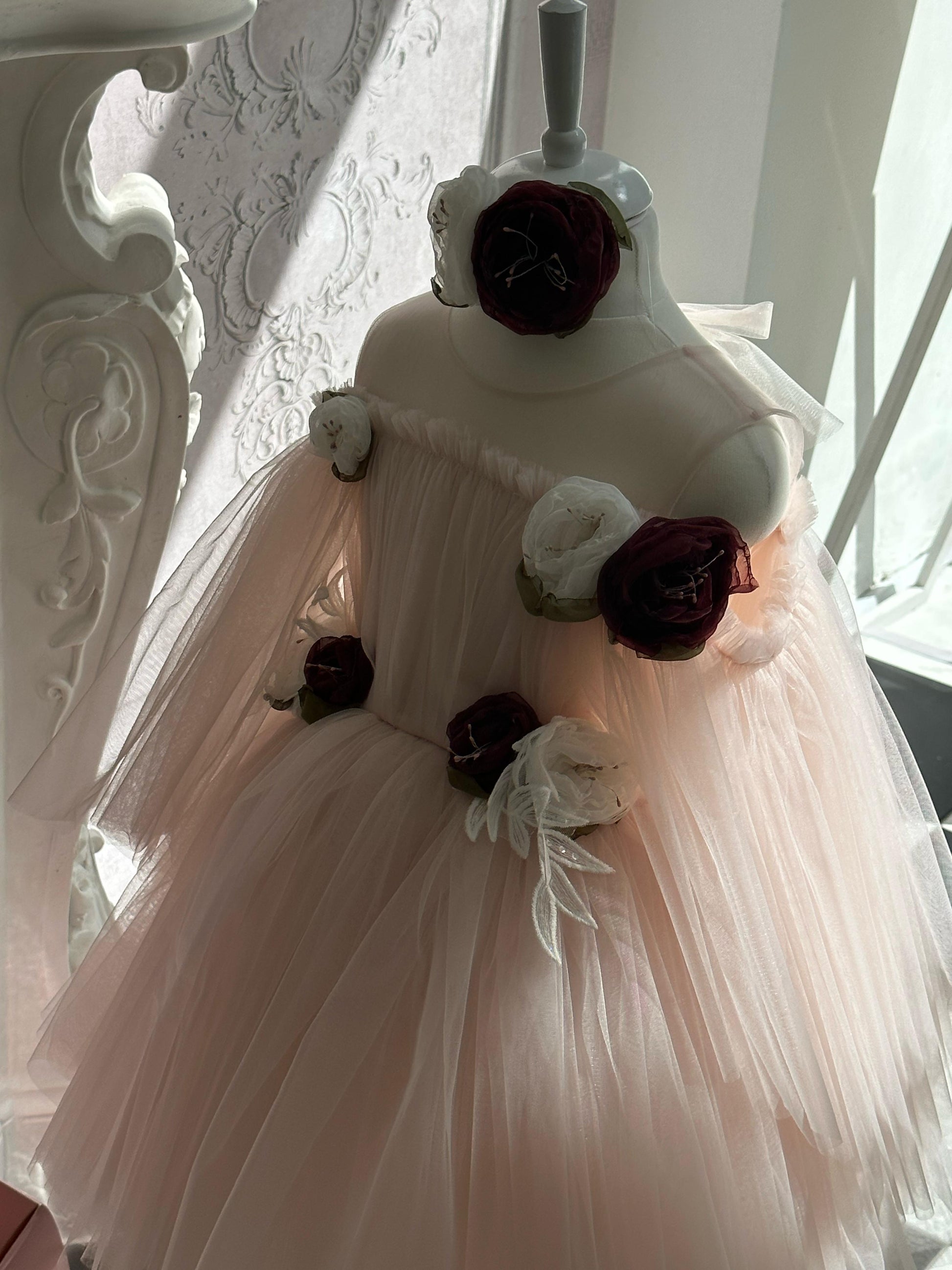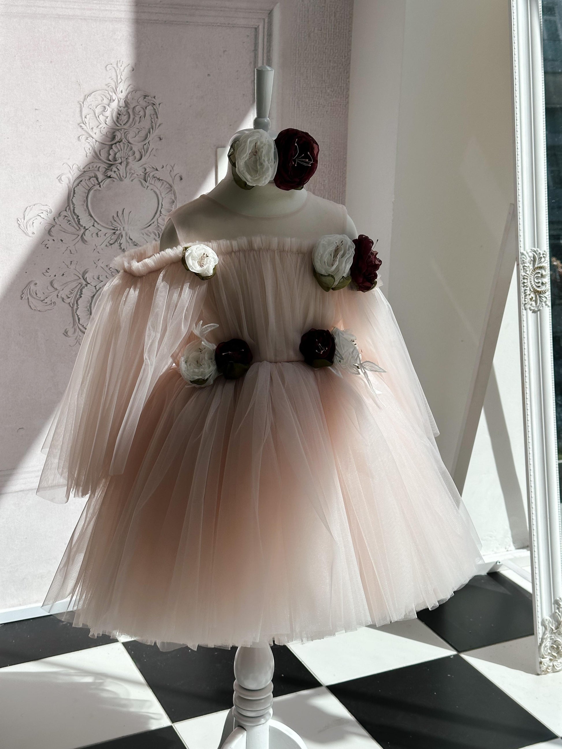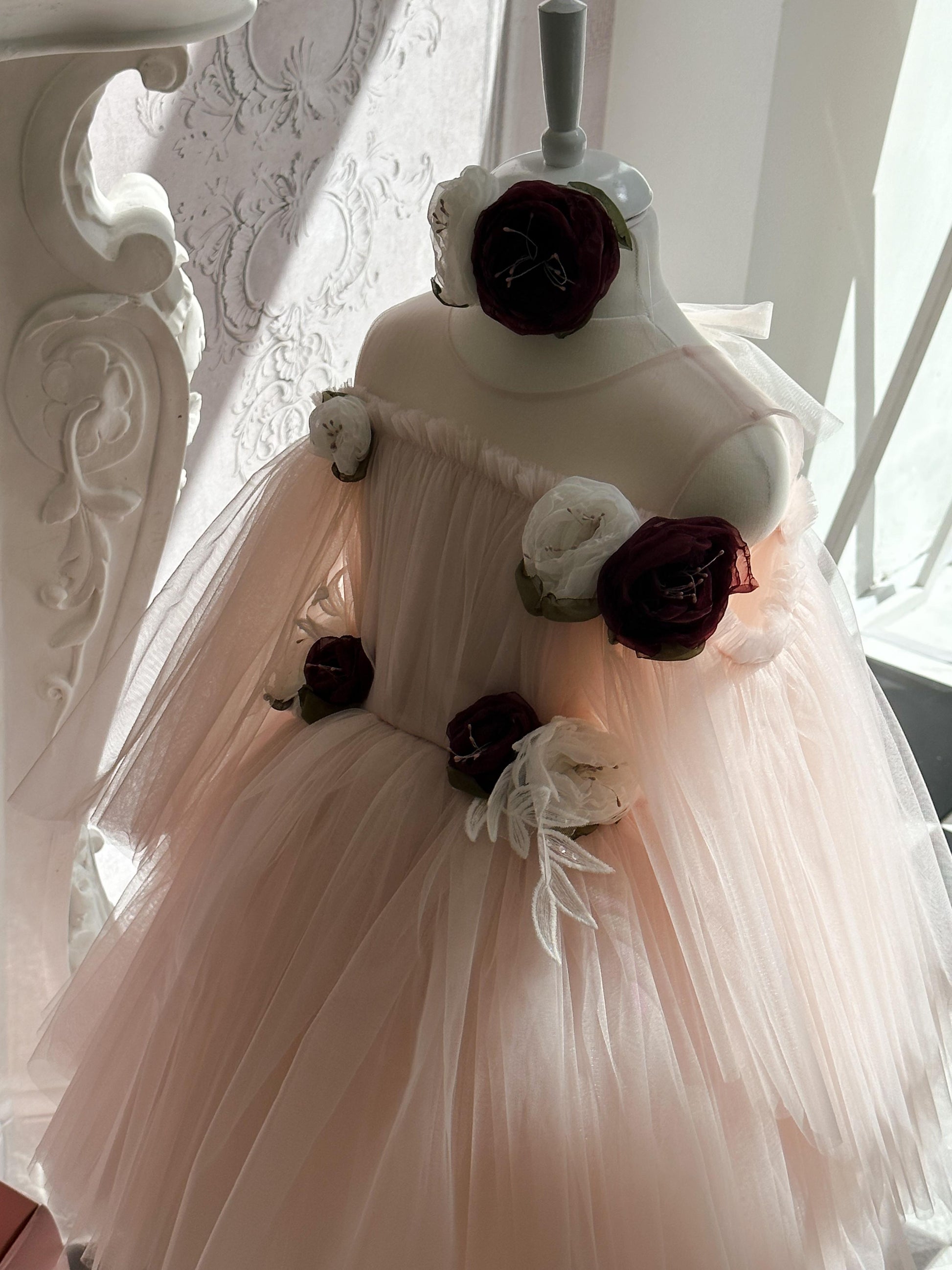 Fustan eventesh, tyl me aplikacione lulesh te punuara