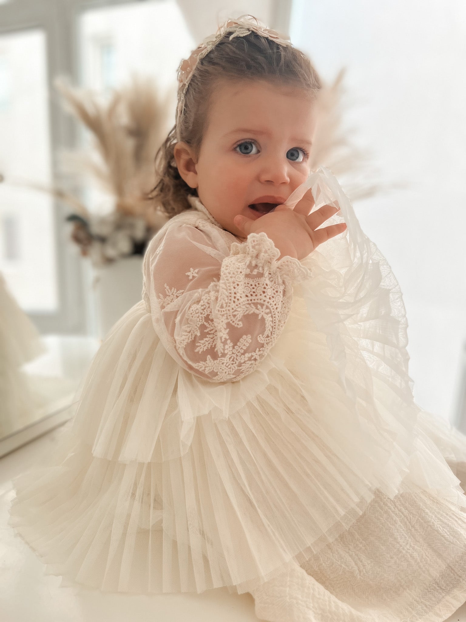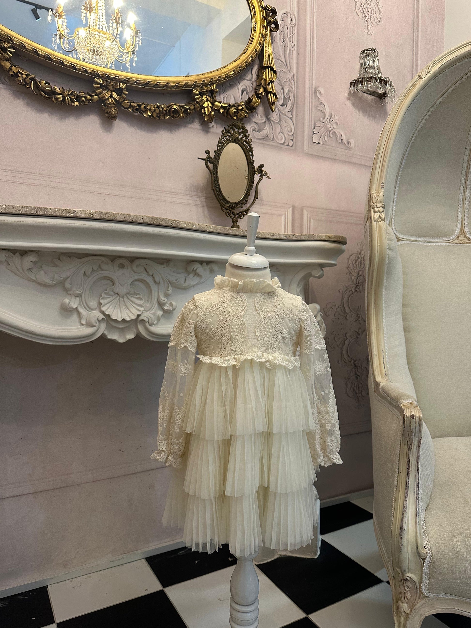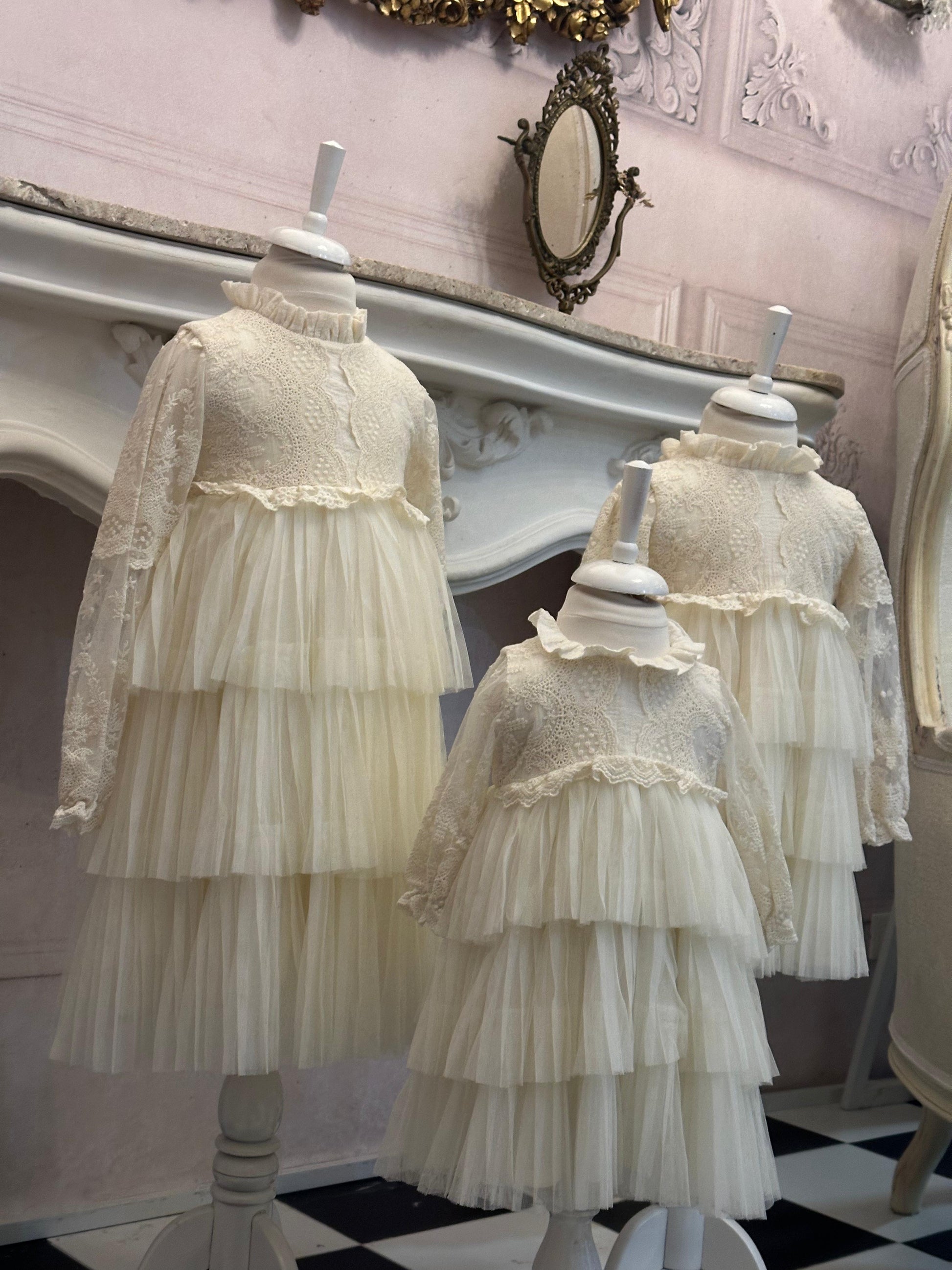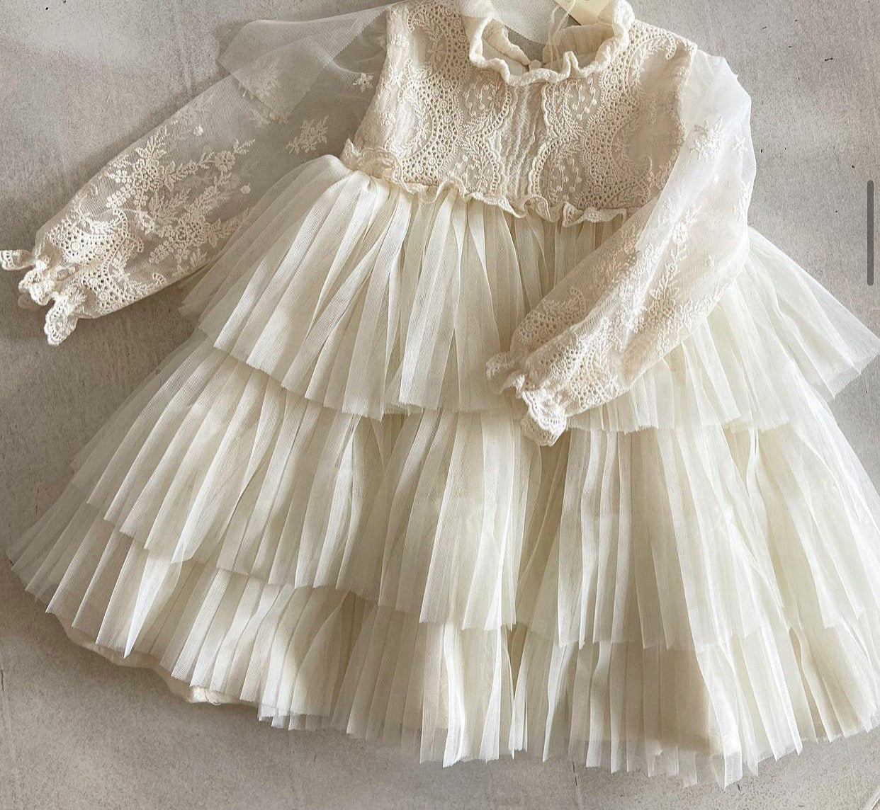 Fustan eventesh me menge te gjata, lino me tantelle dhe tyl francez me pala!