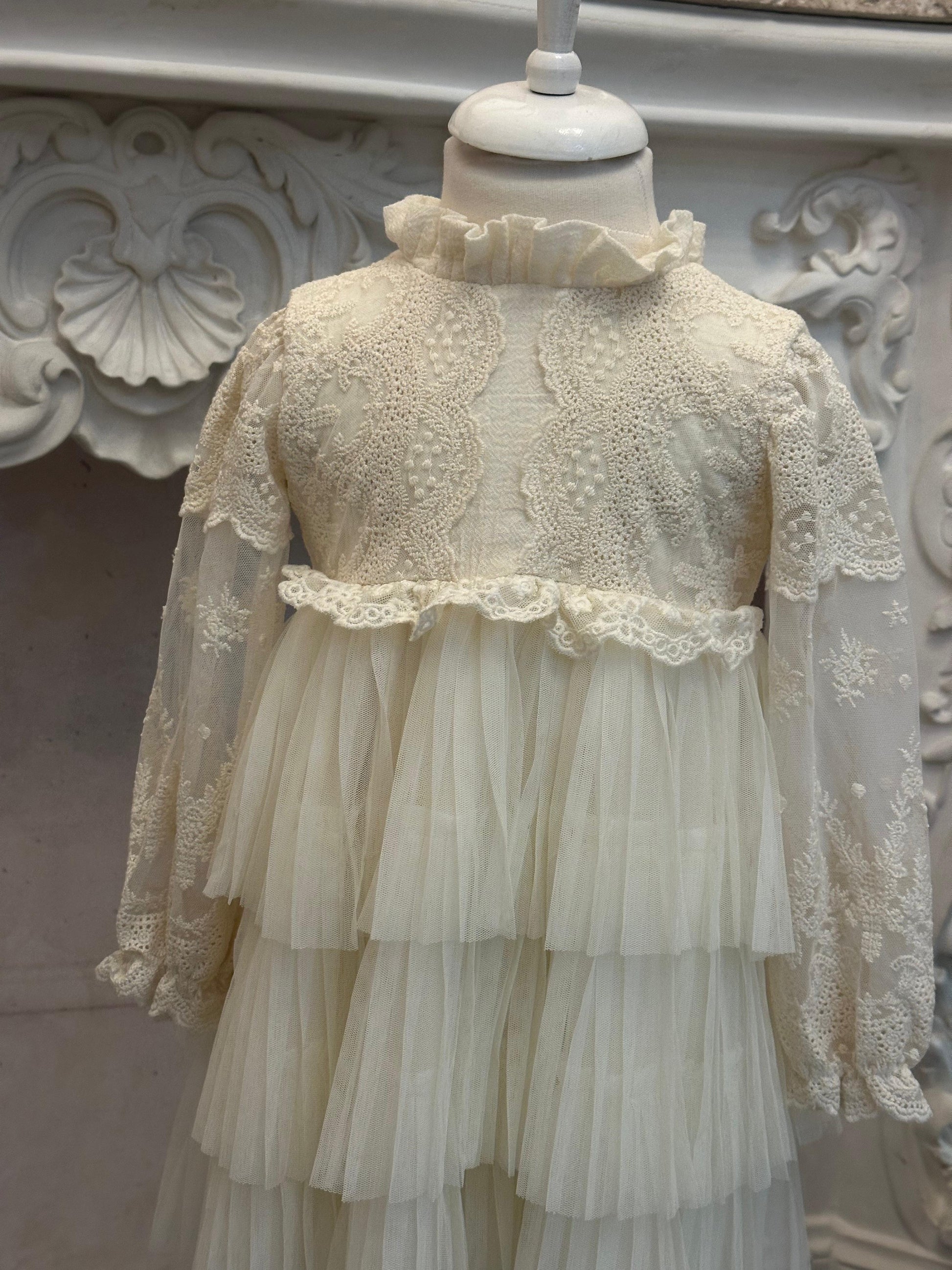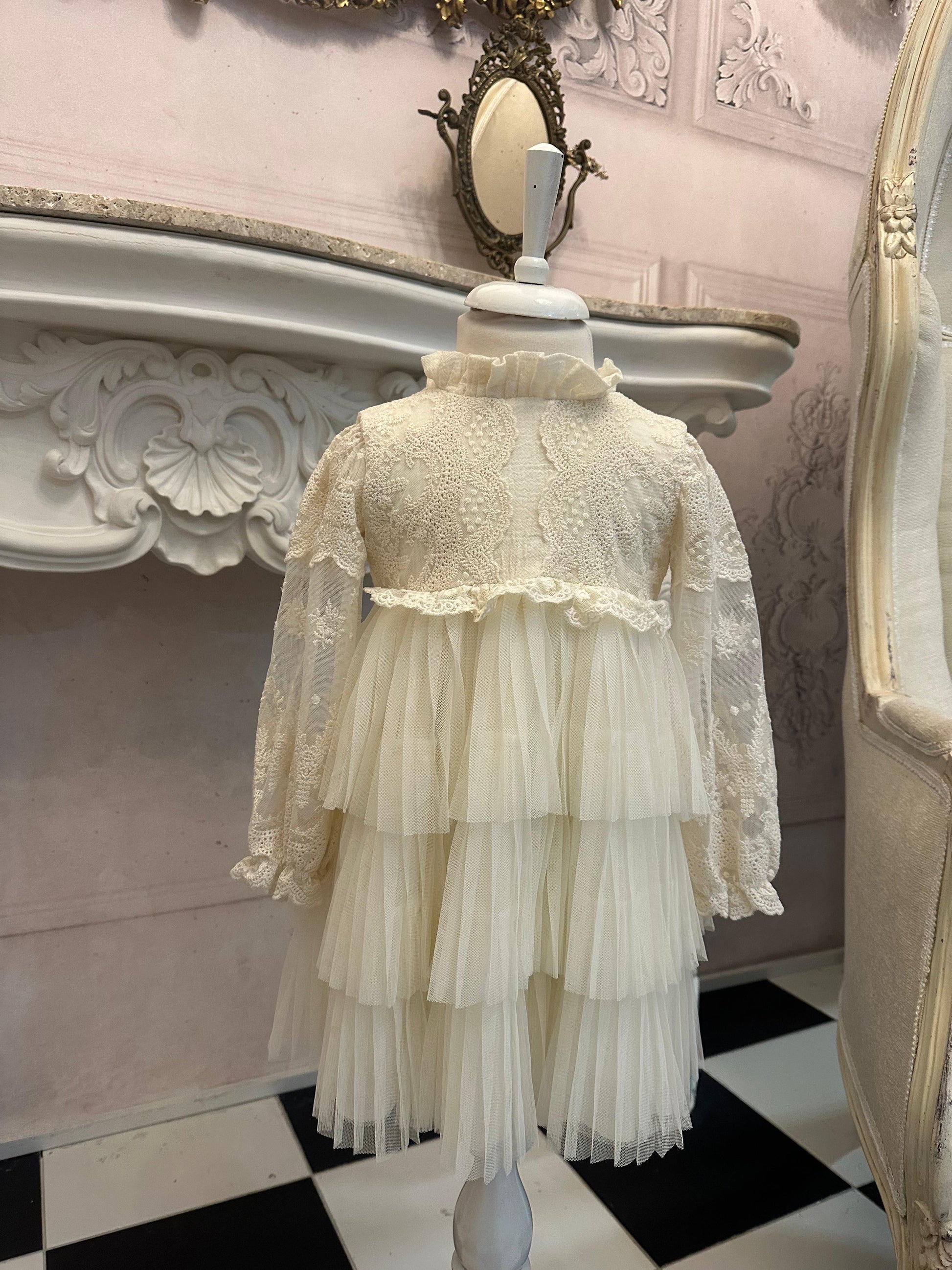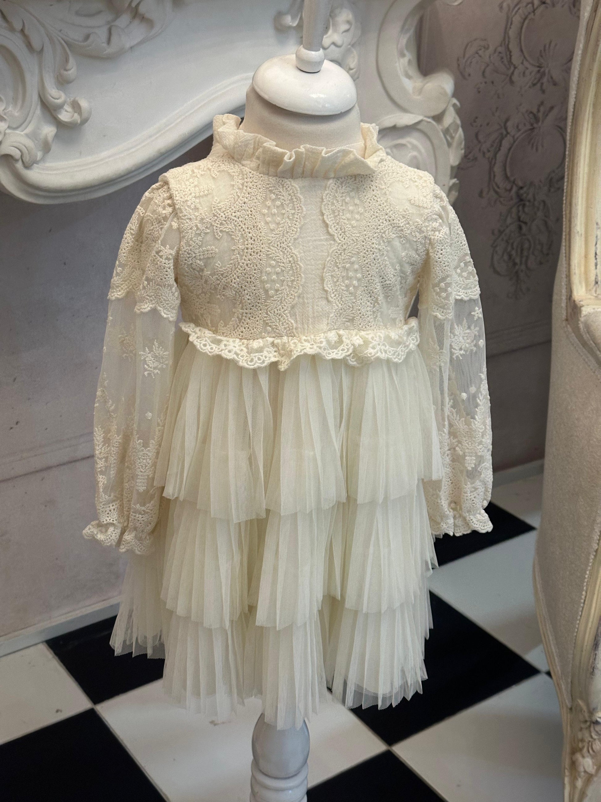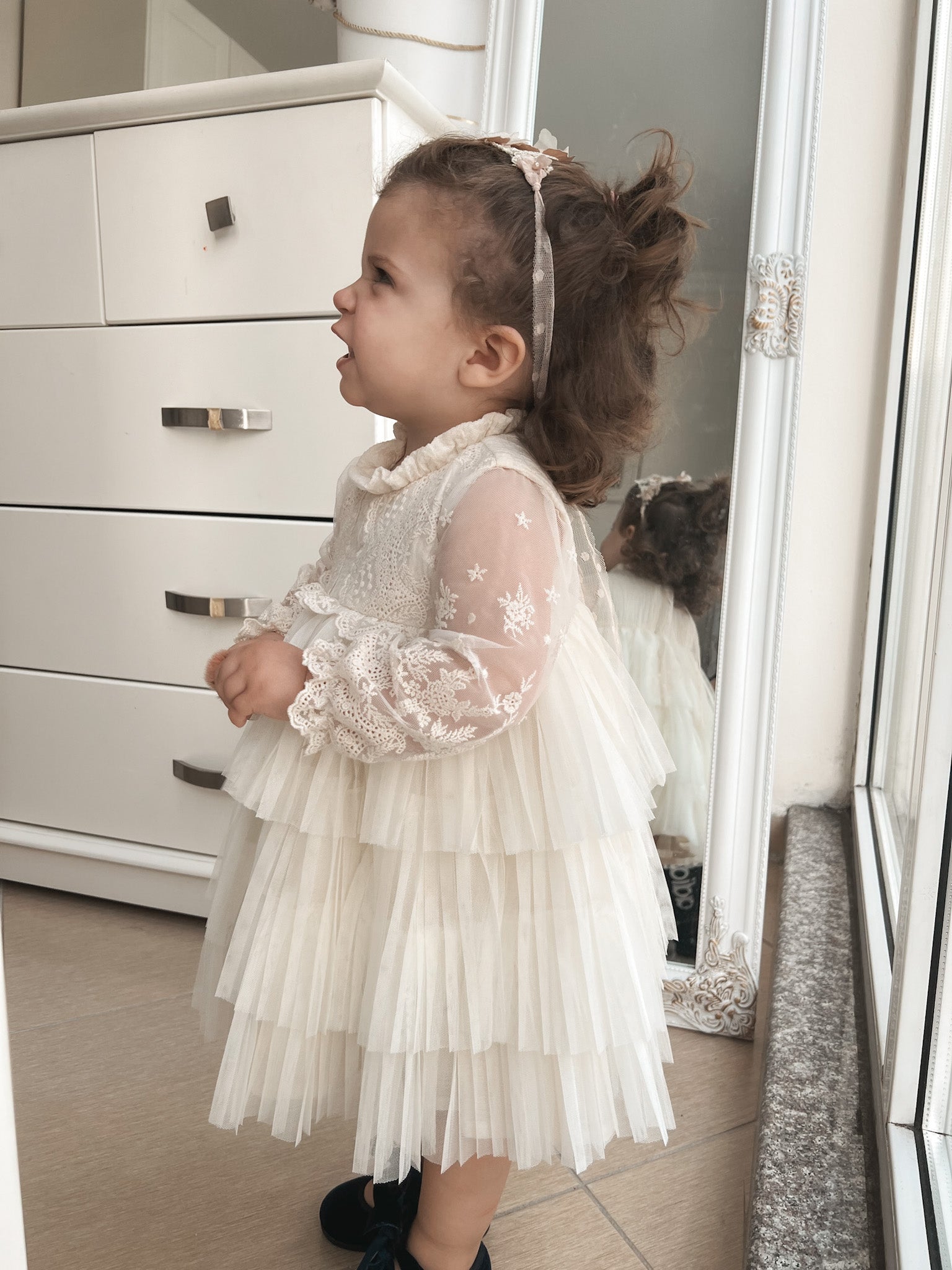 Fustan eventesh me menge te gjata, lino me tantelle dhe tyl francez me pala!