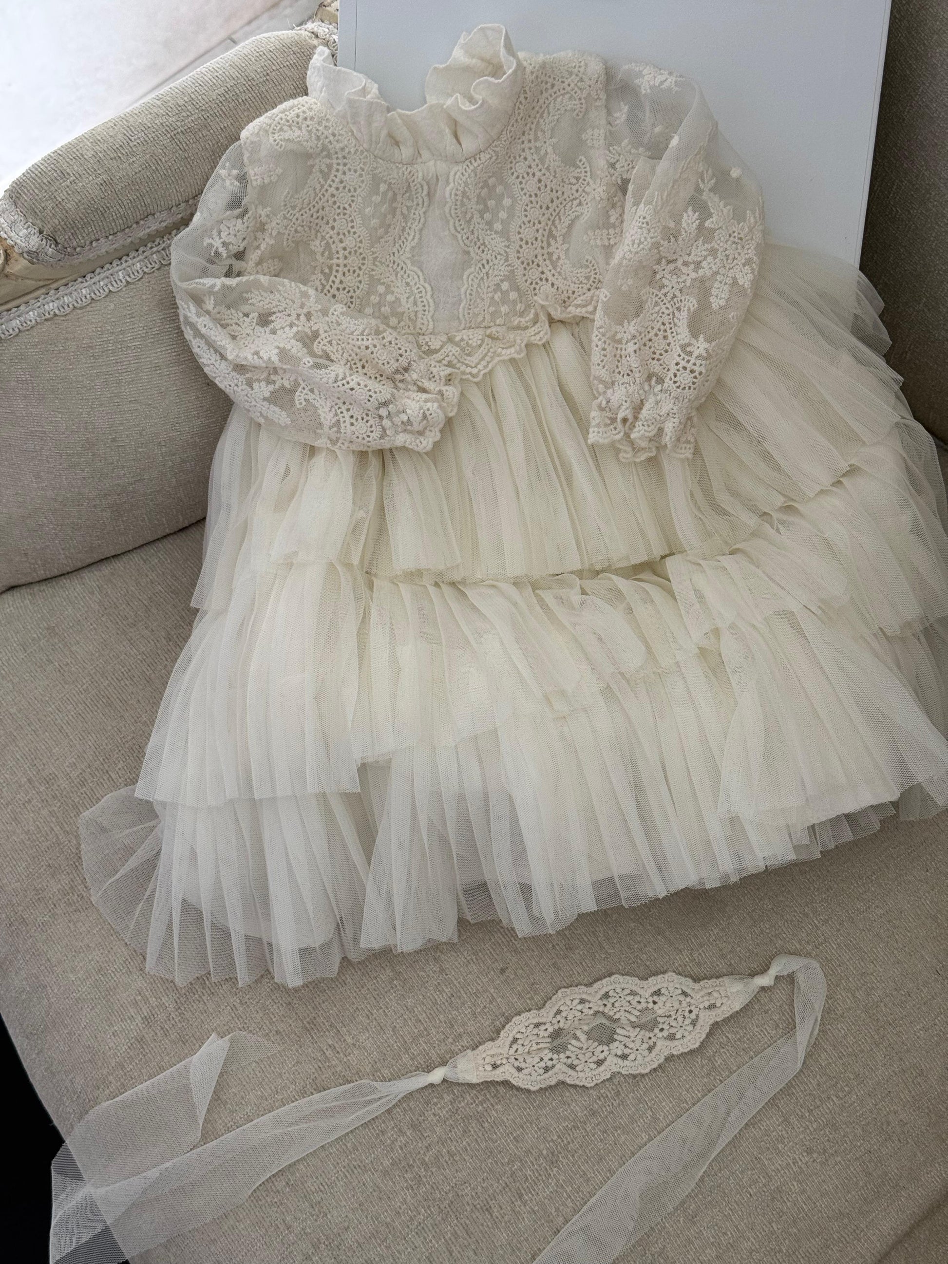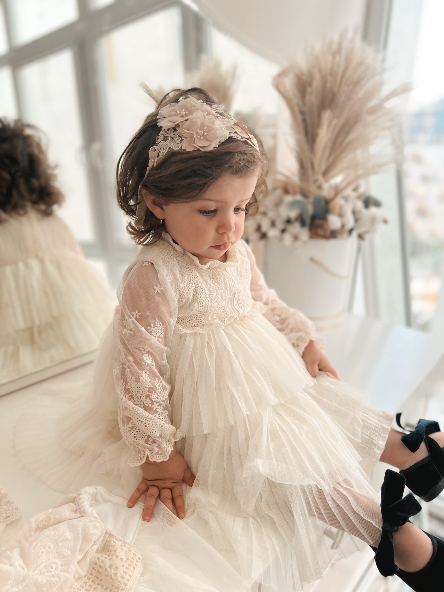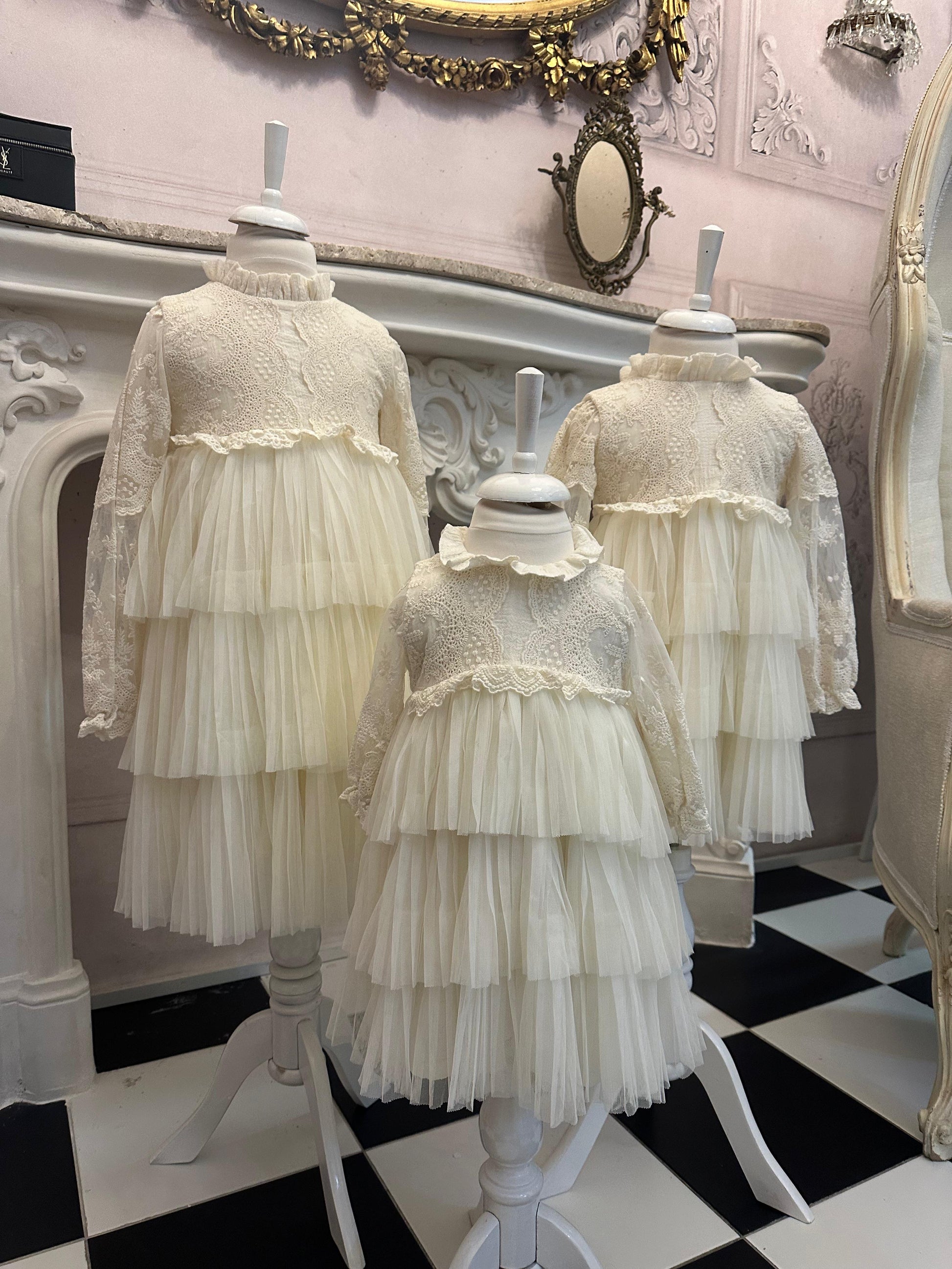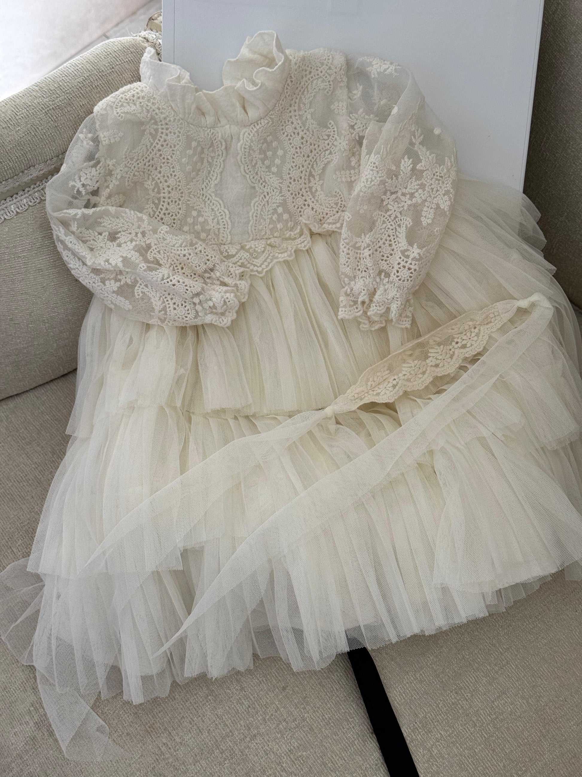 Fustan eventesh me menge te gjata, lino me tantelle dhe tyl francez me pala!