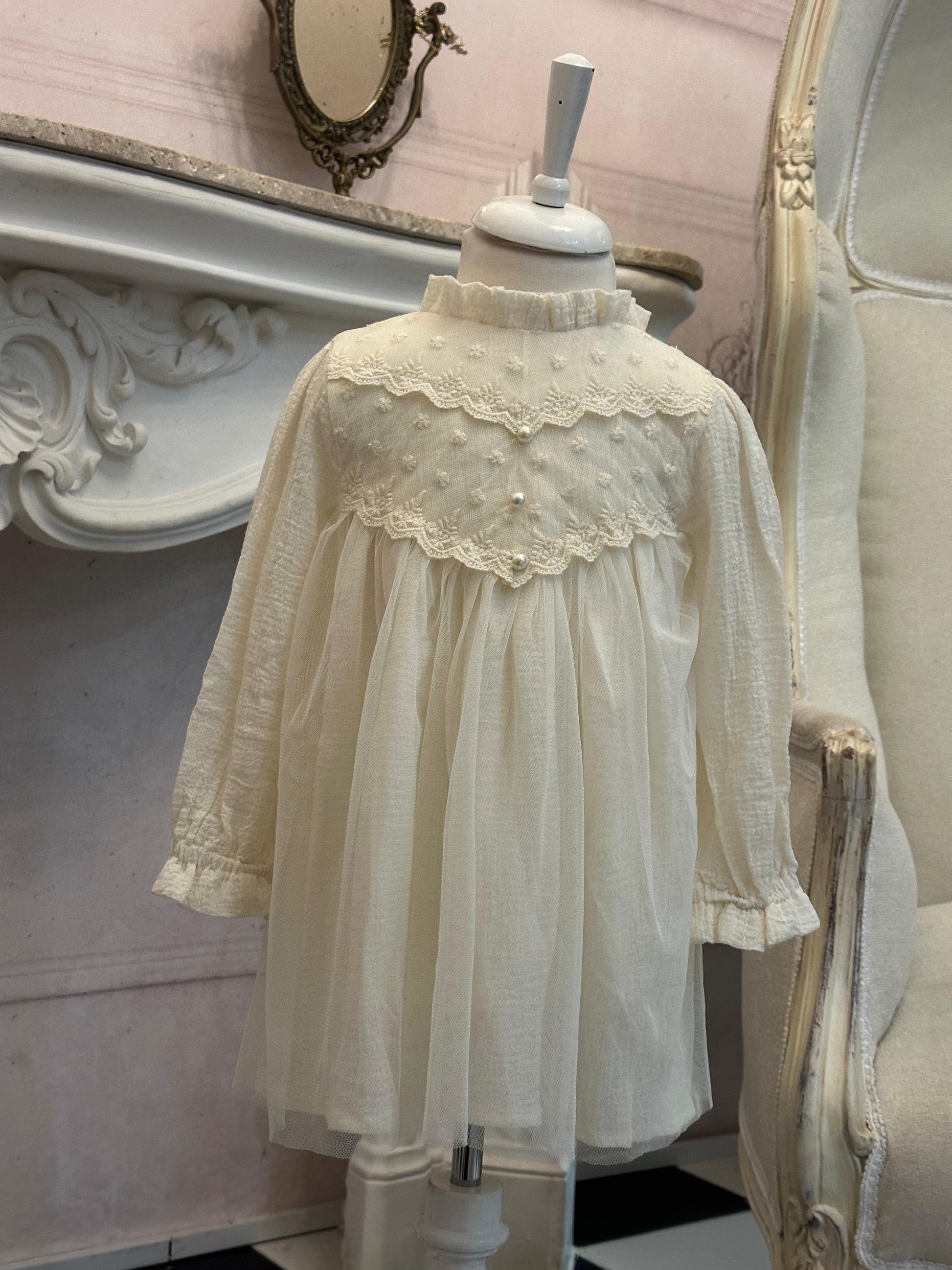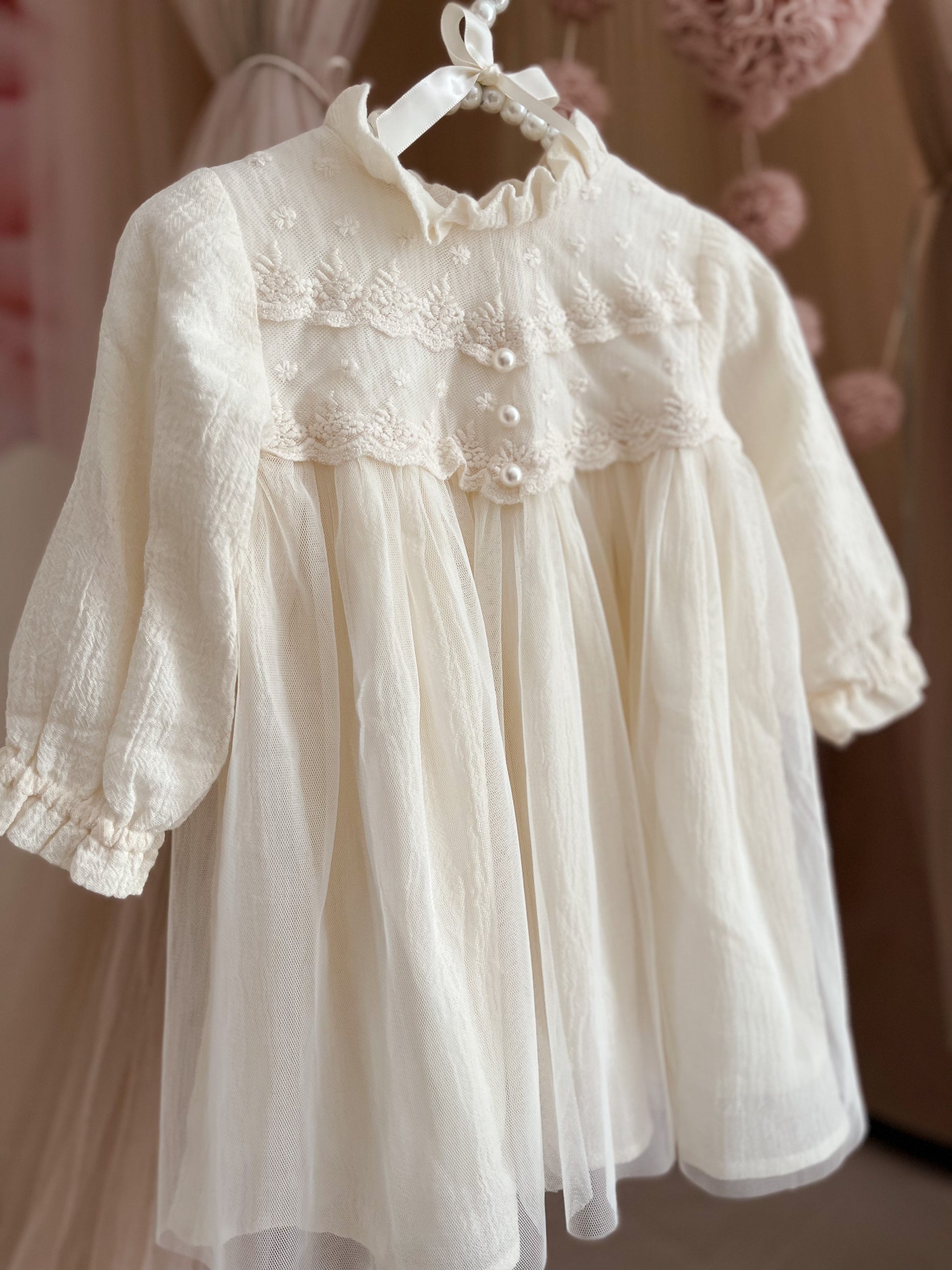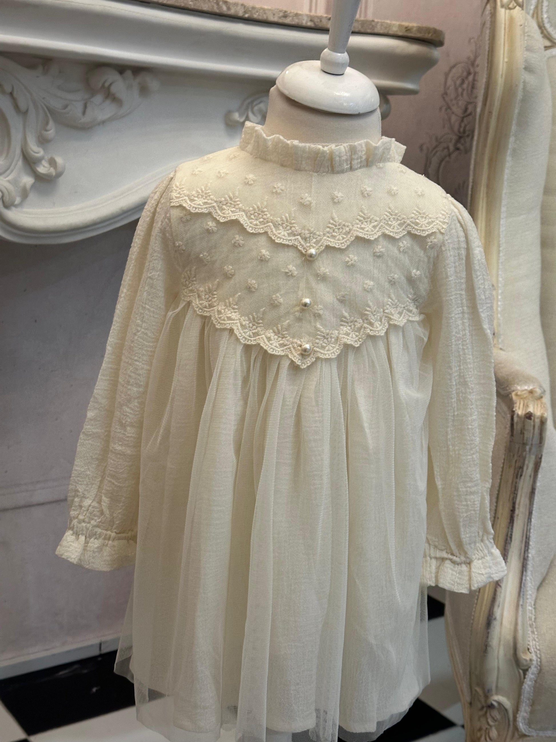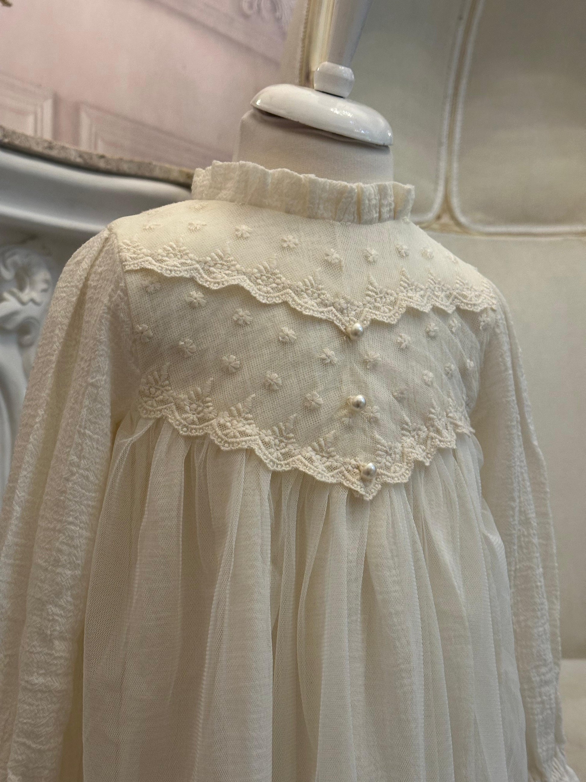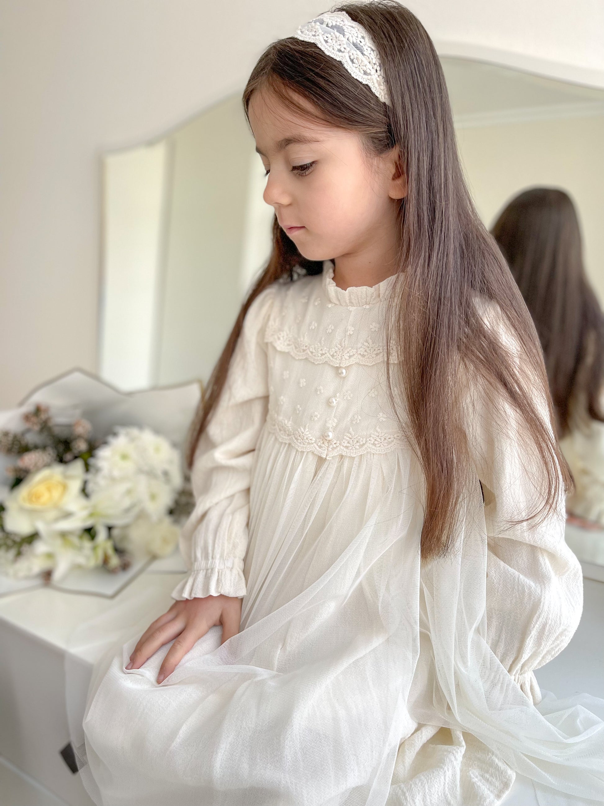Fustan eventesh dhe pagezimesh, lino dhe tantelle me 3 perla perpara