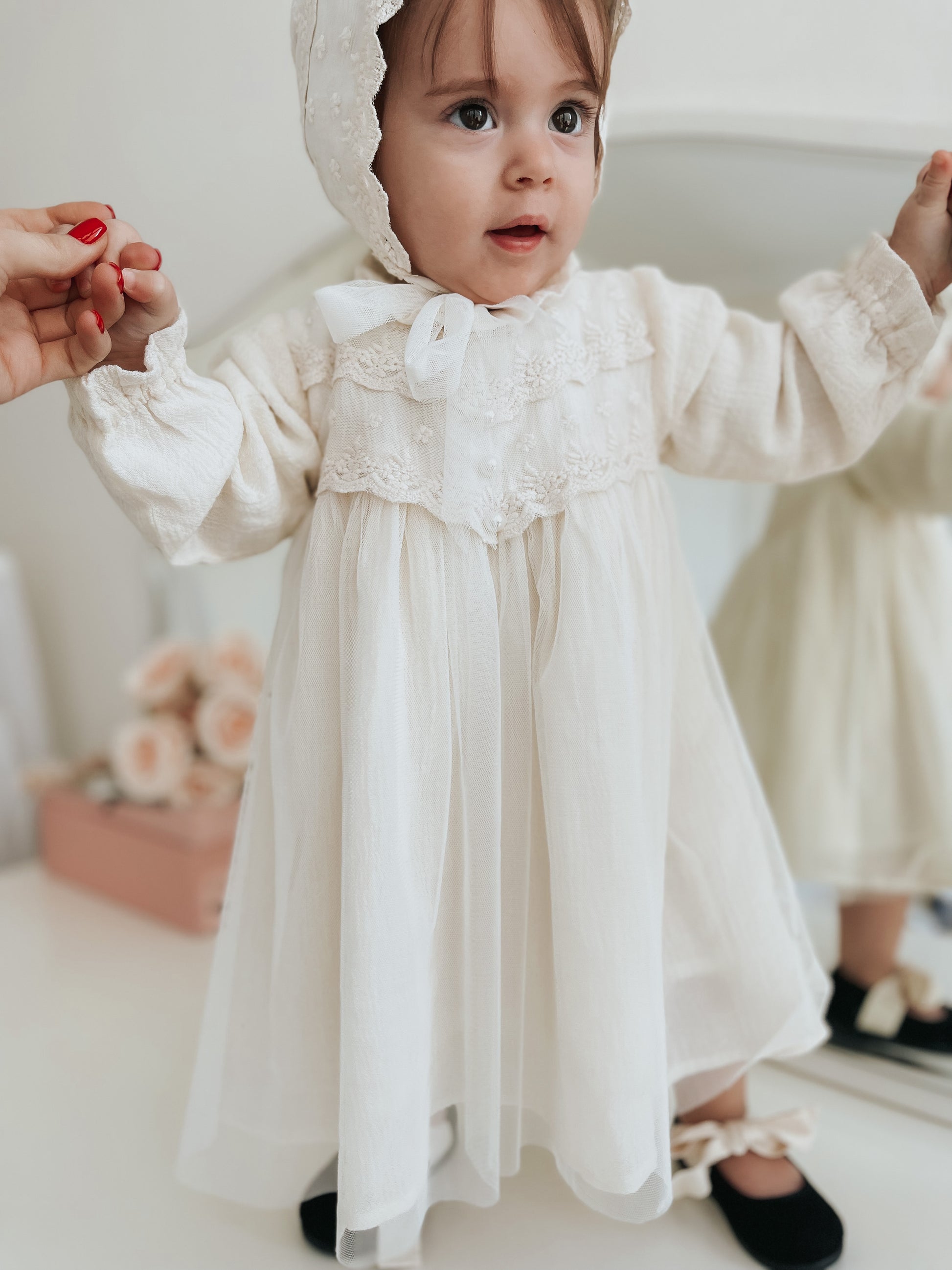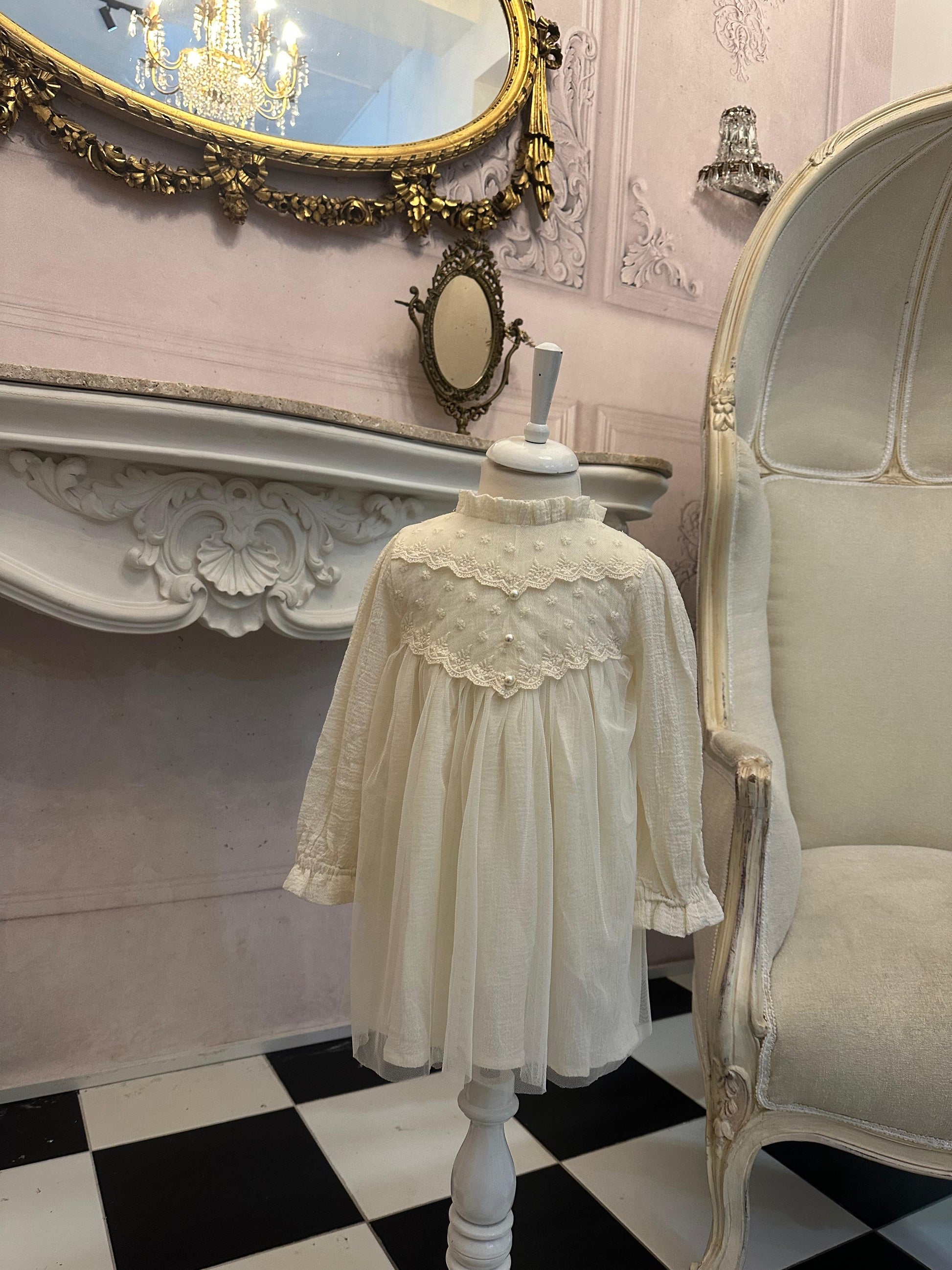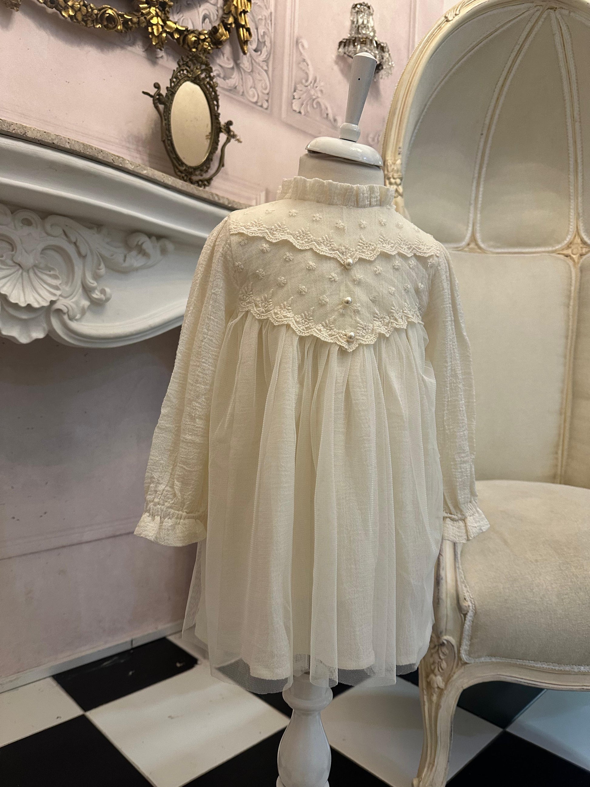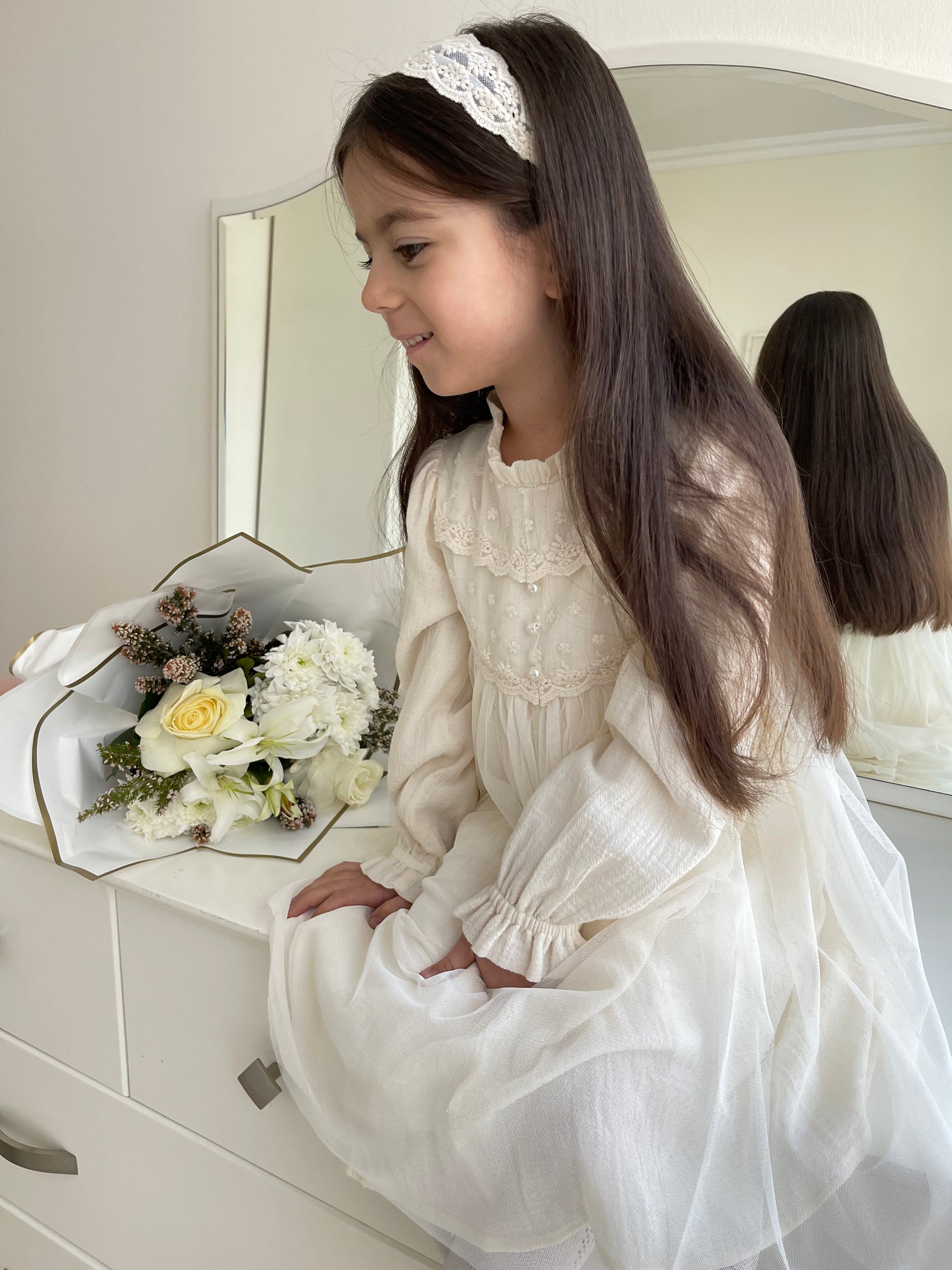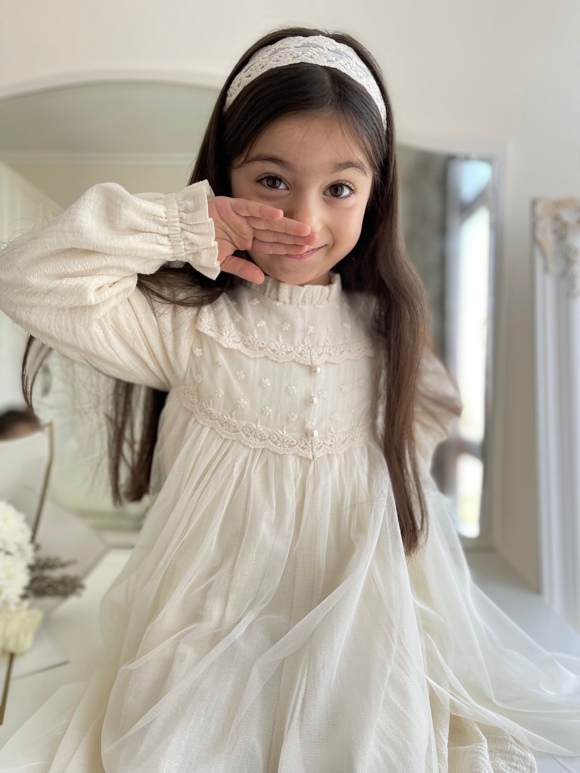 Fustan eventesh dhe pagezimesh, lino dhe tantelle me 3 perla perpara