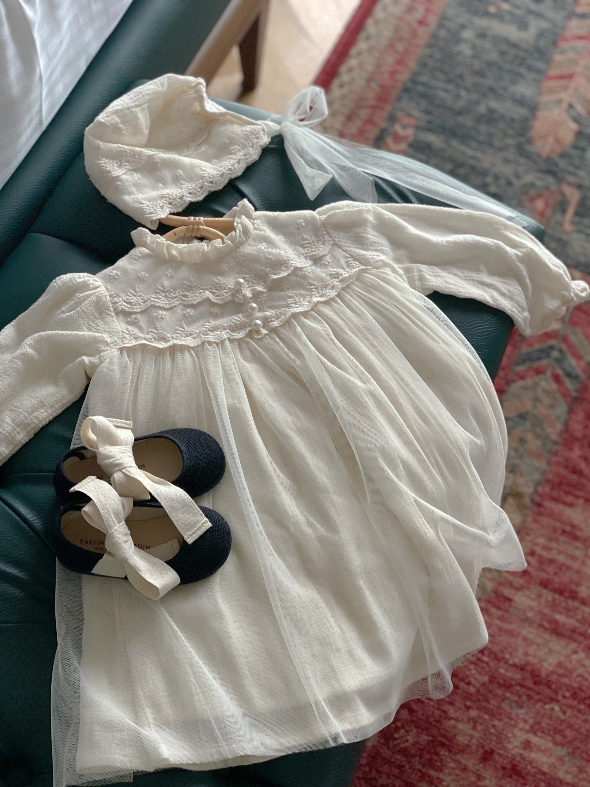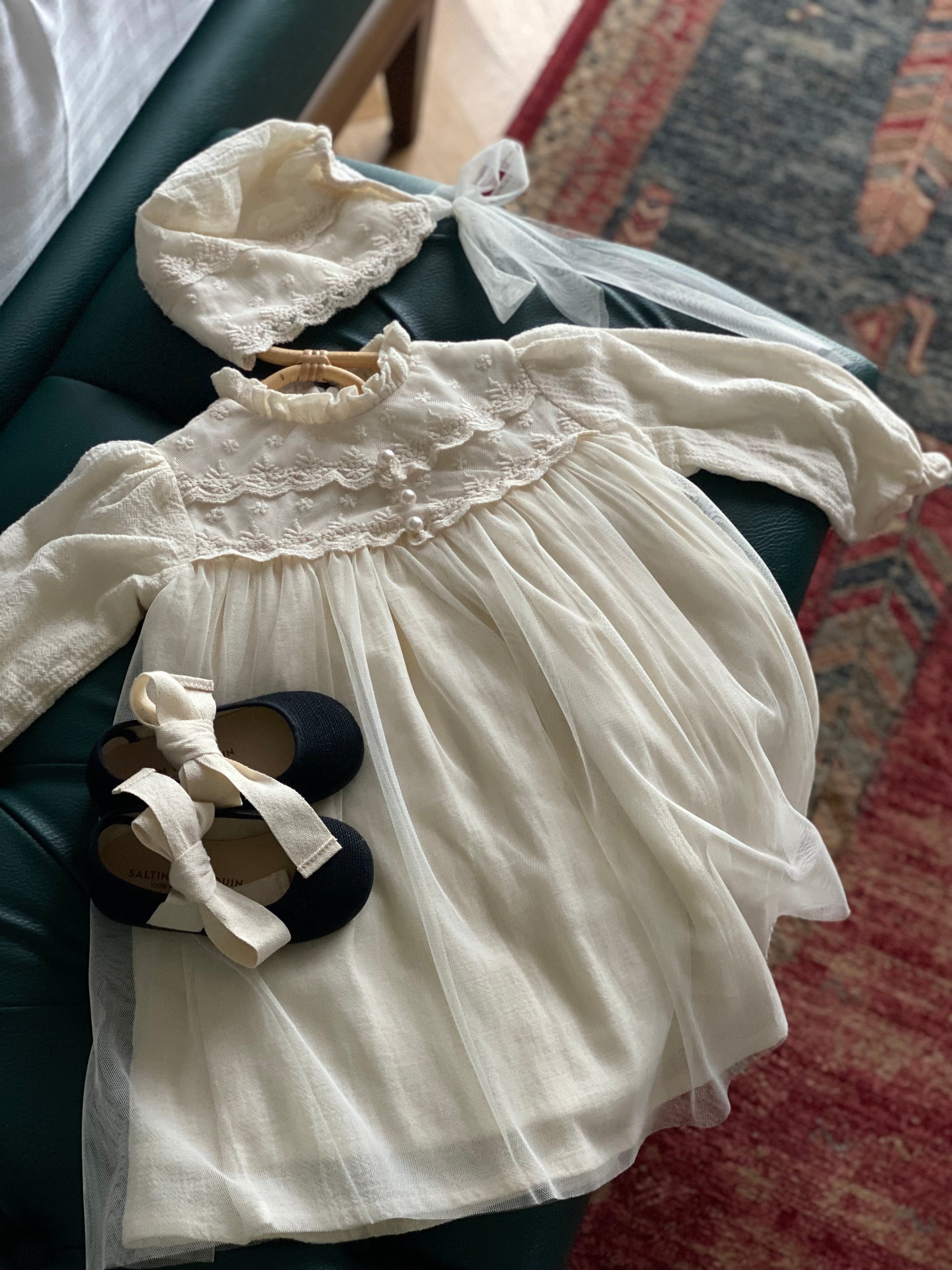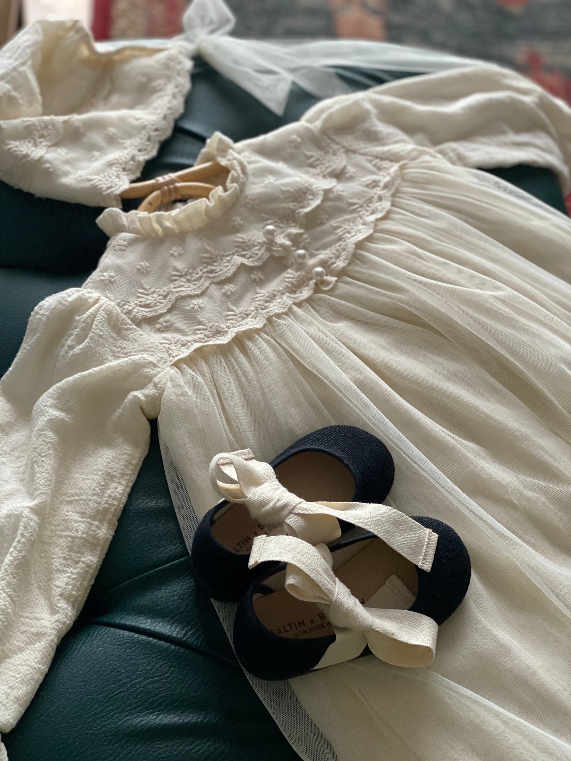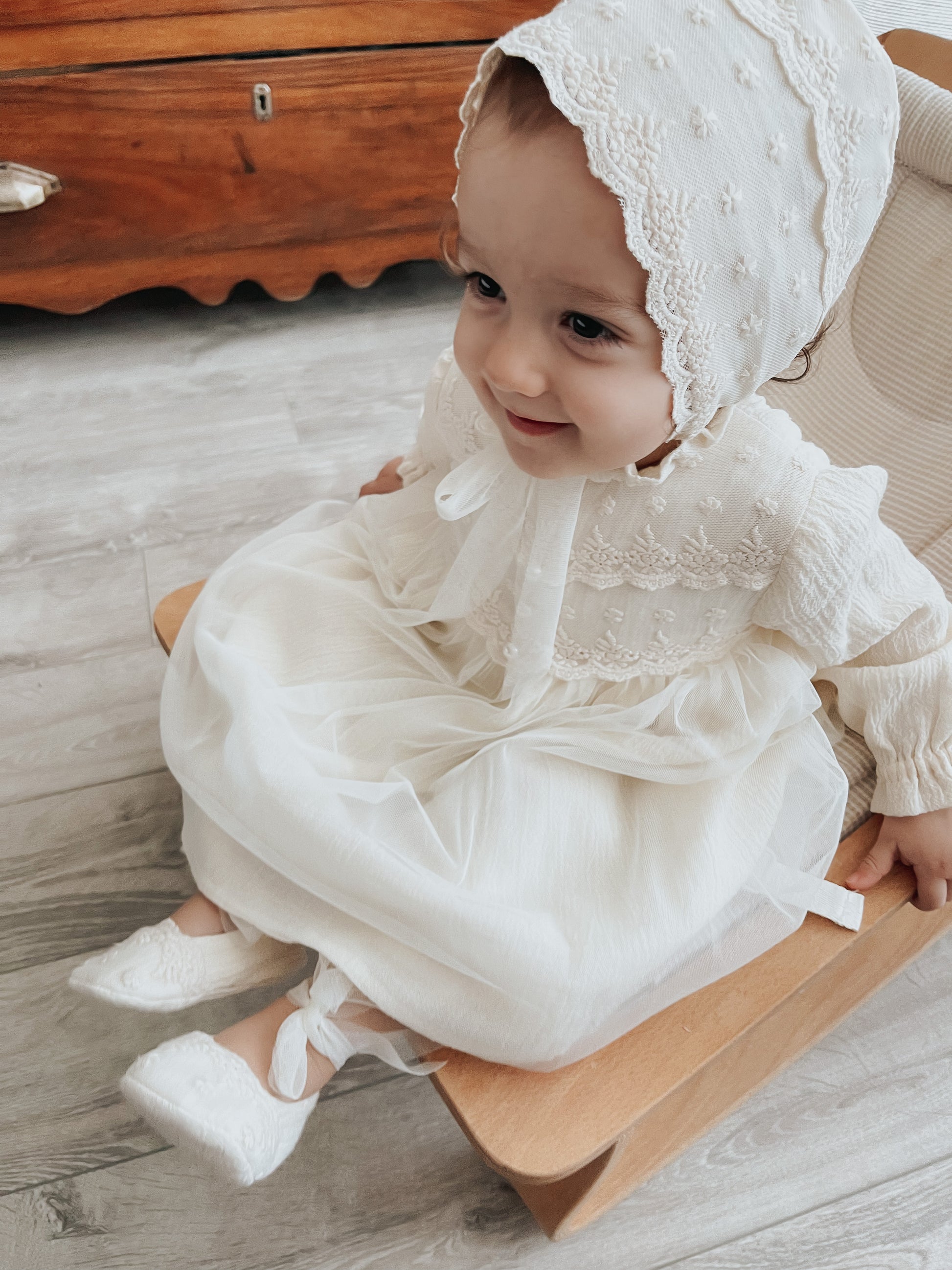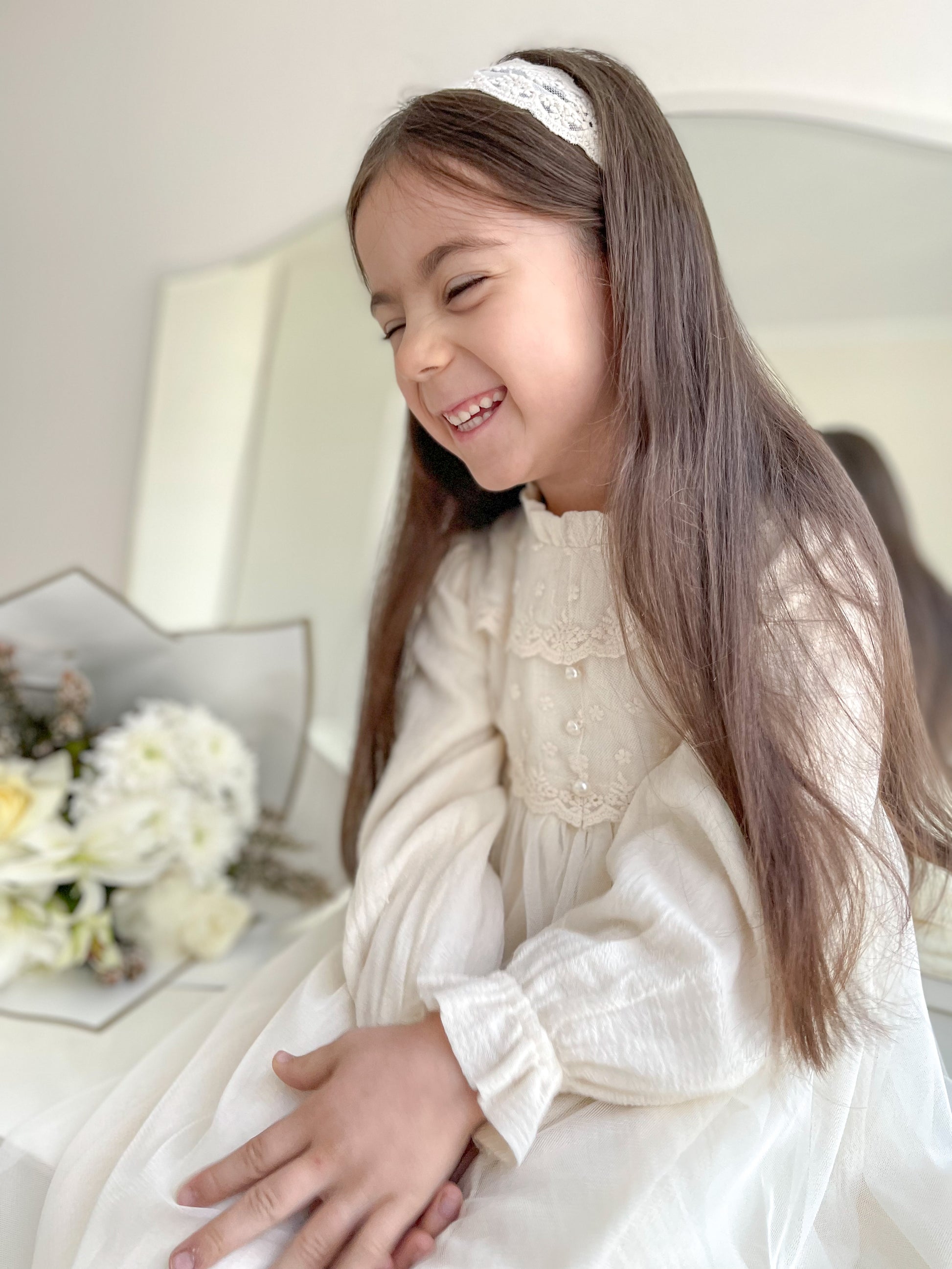 Fustan eventesh dhe pagezimesh, lino dhe tantelle me 3 perla perpara