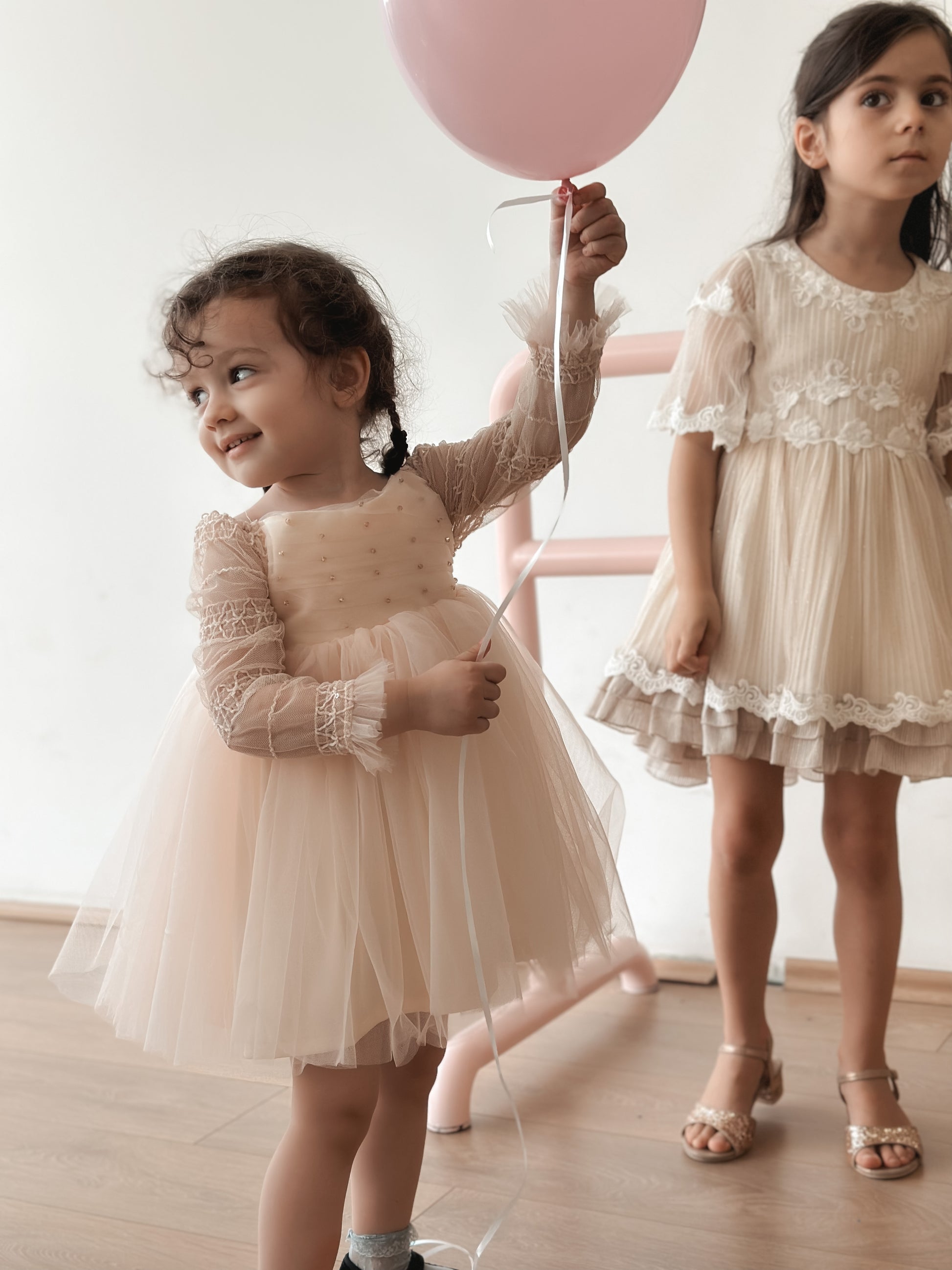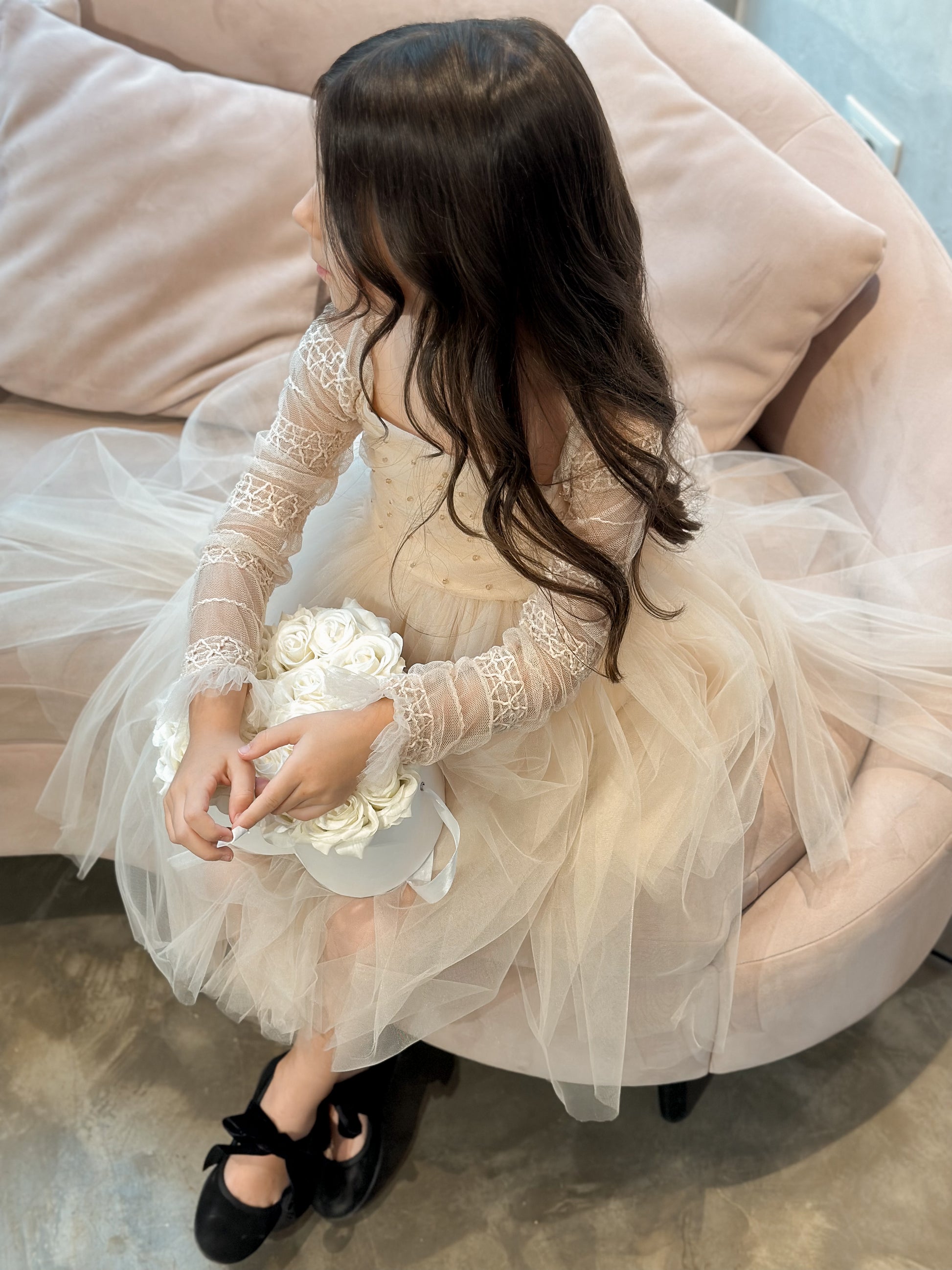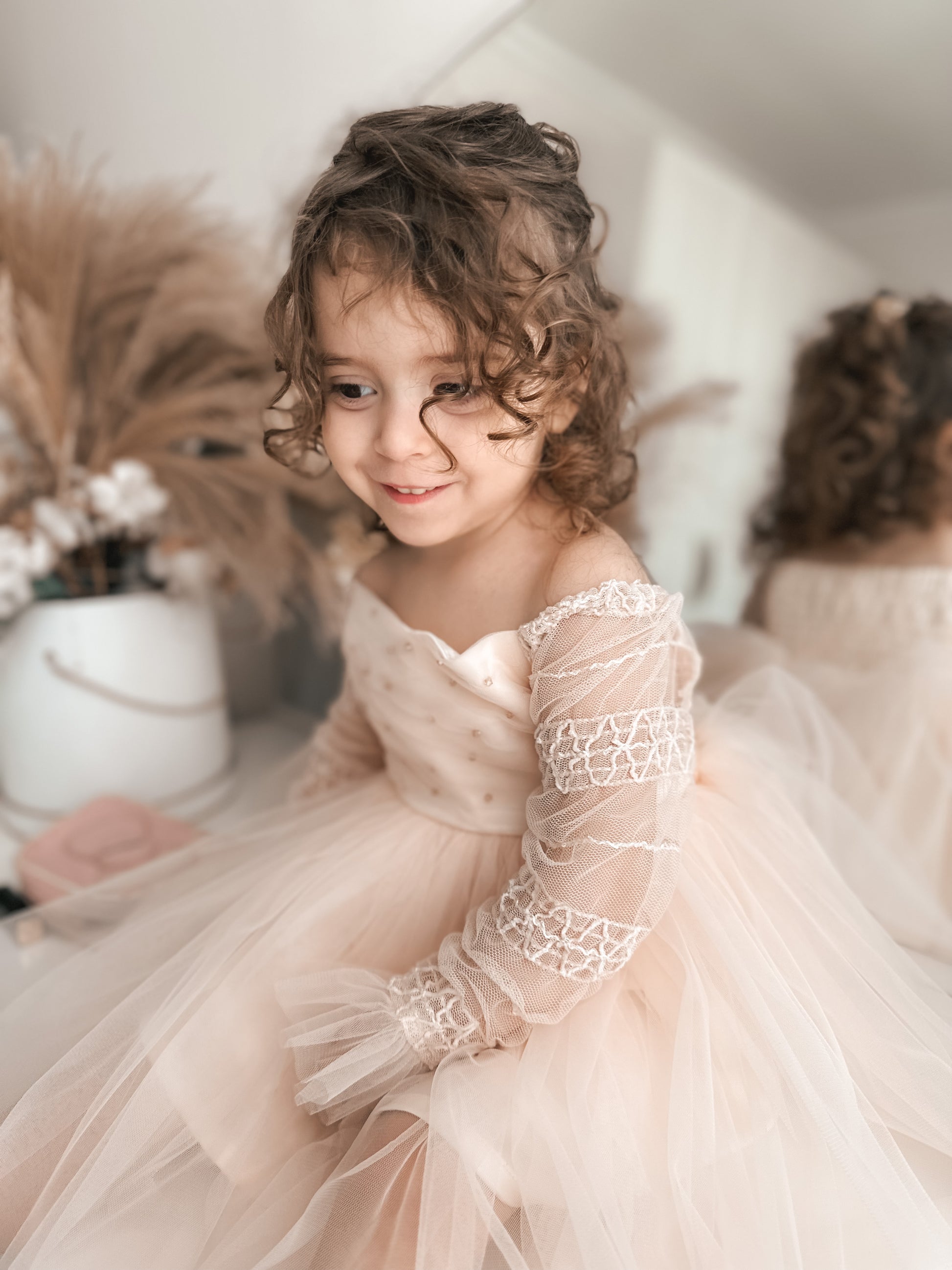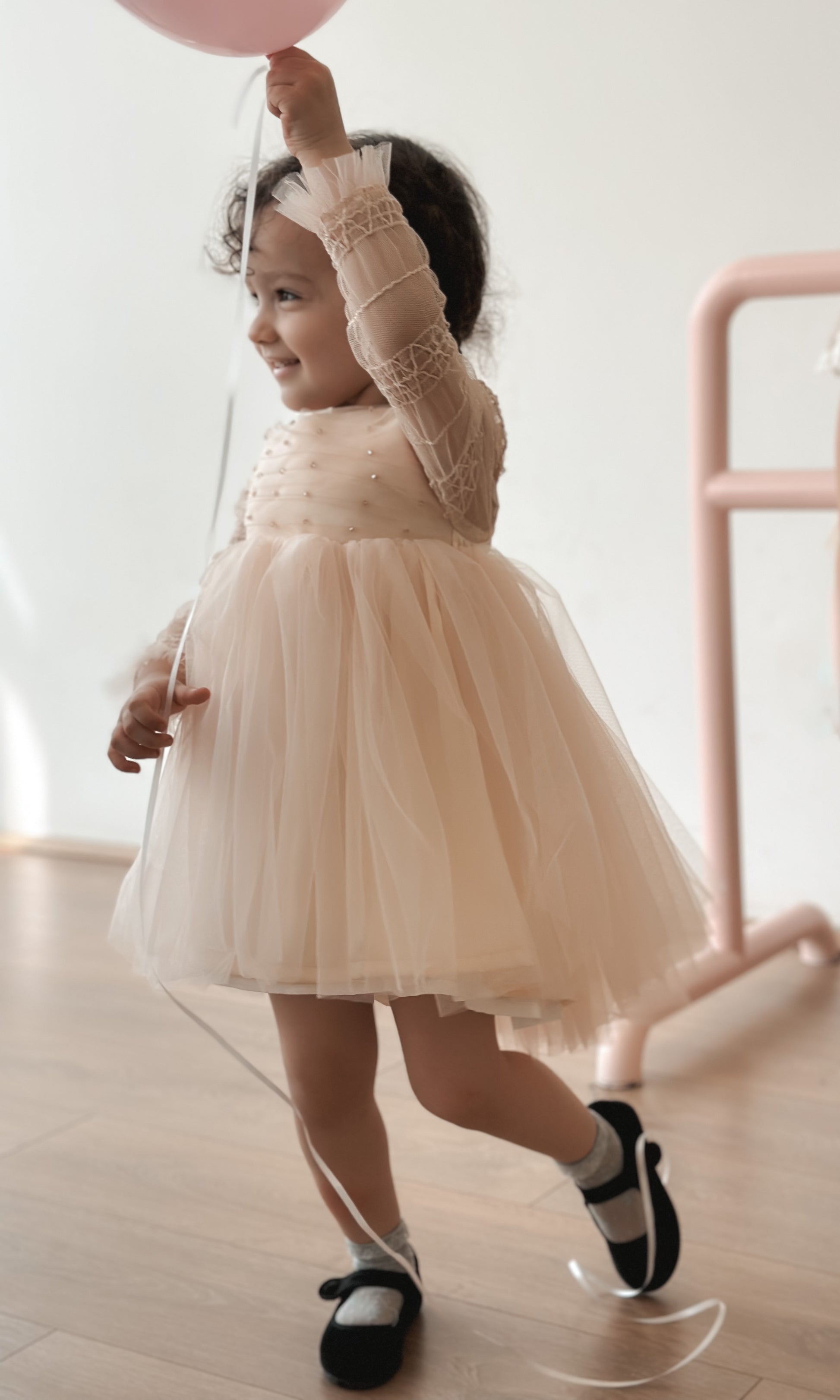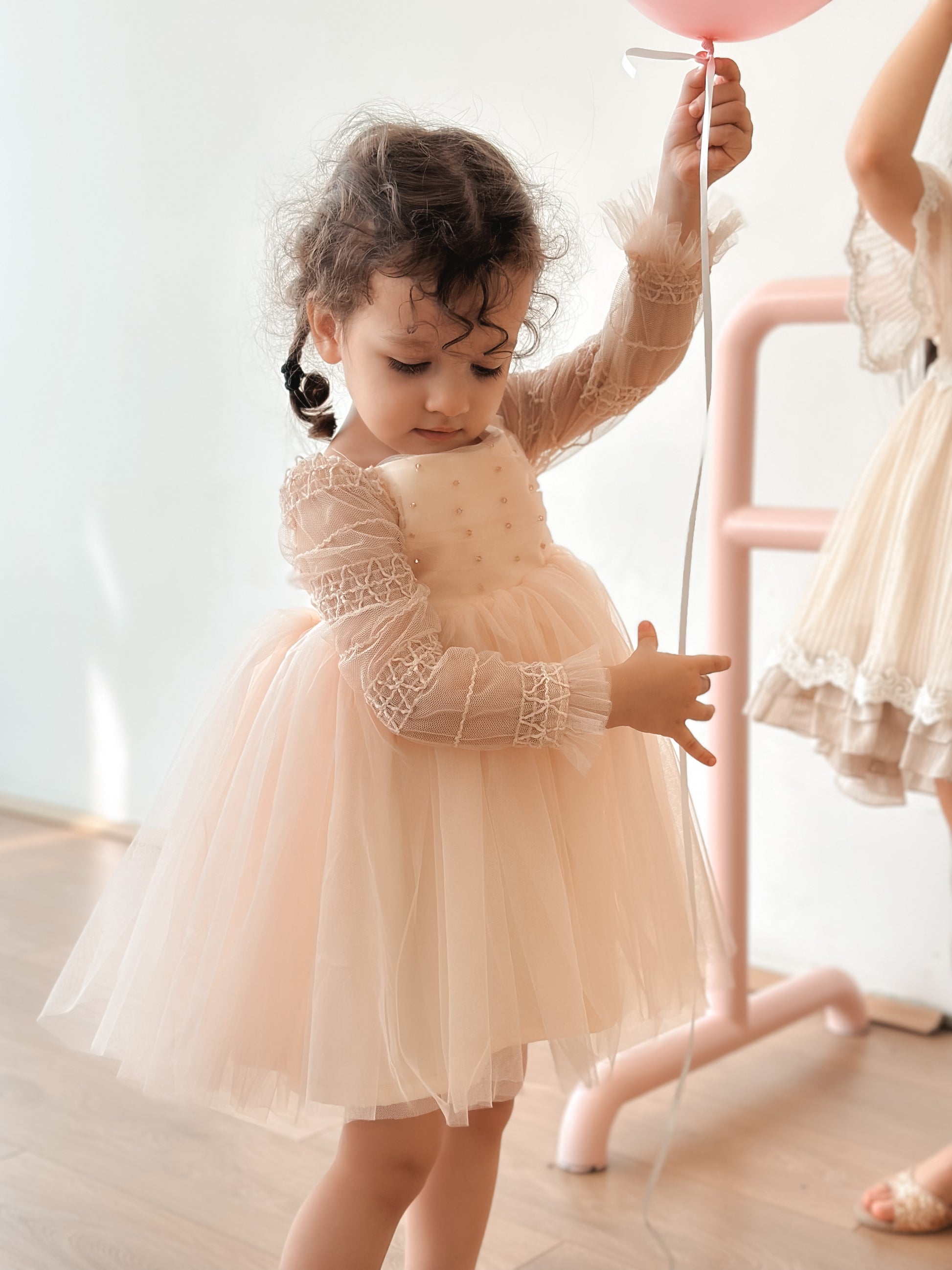 Sindy dress, fustan eventesh dhe pagezimesh, me menge te gjata dhe detaje me gurre ne pjesen e perparme.