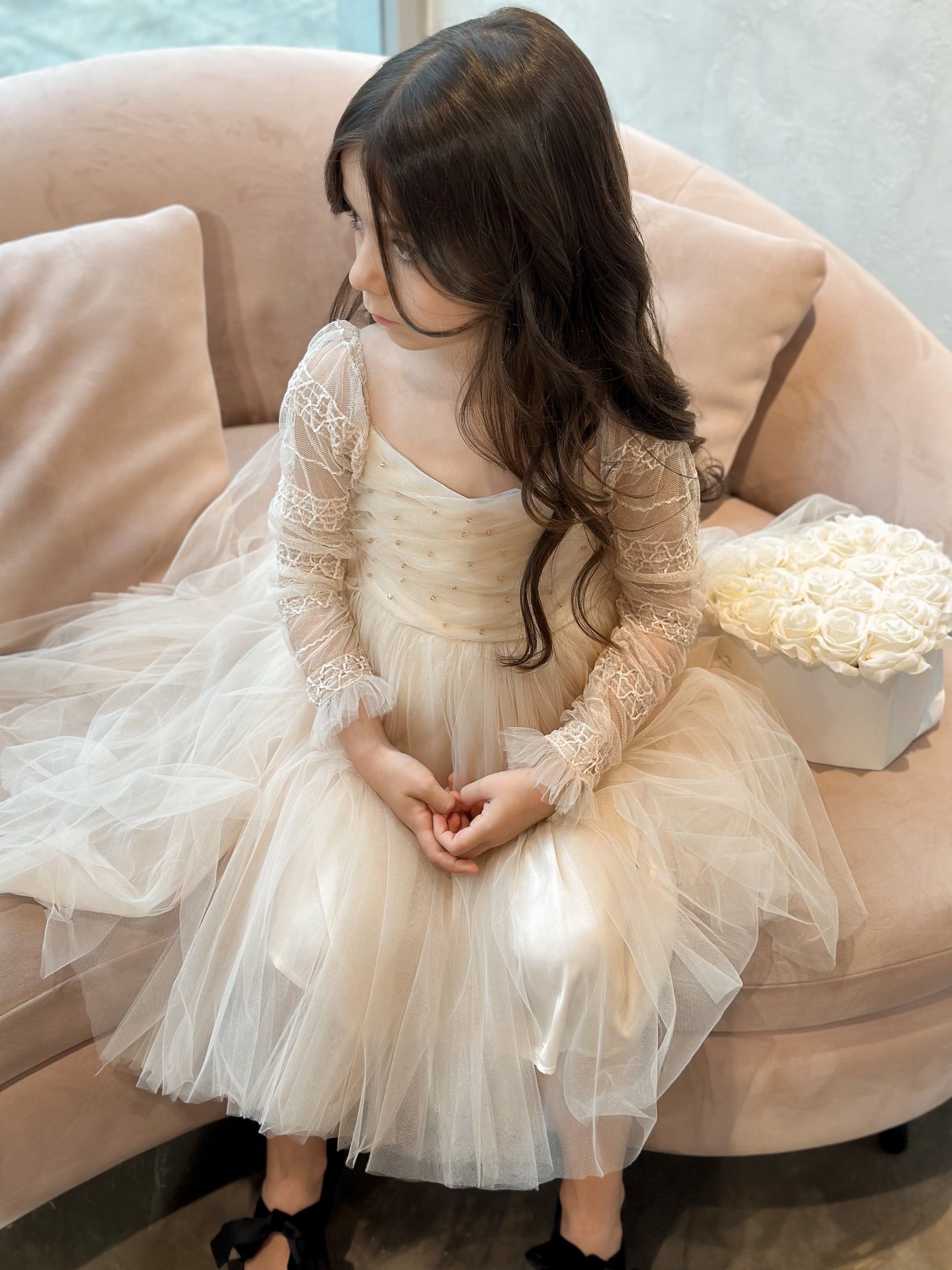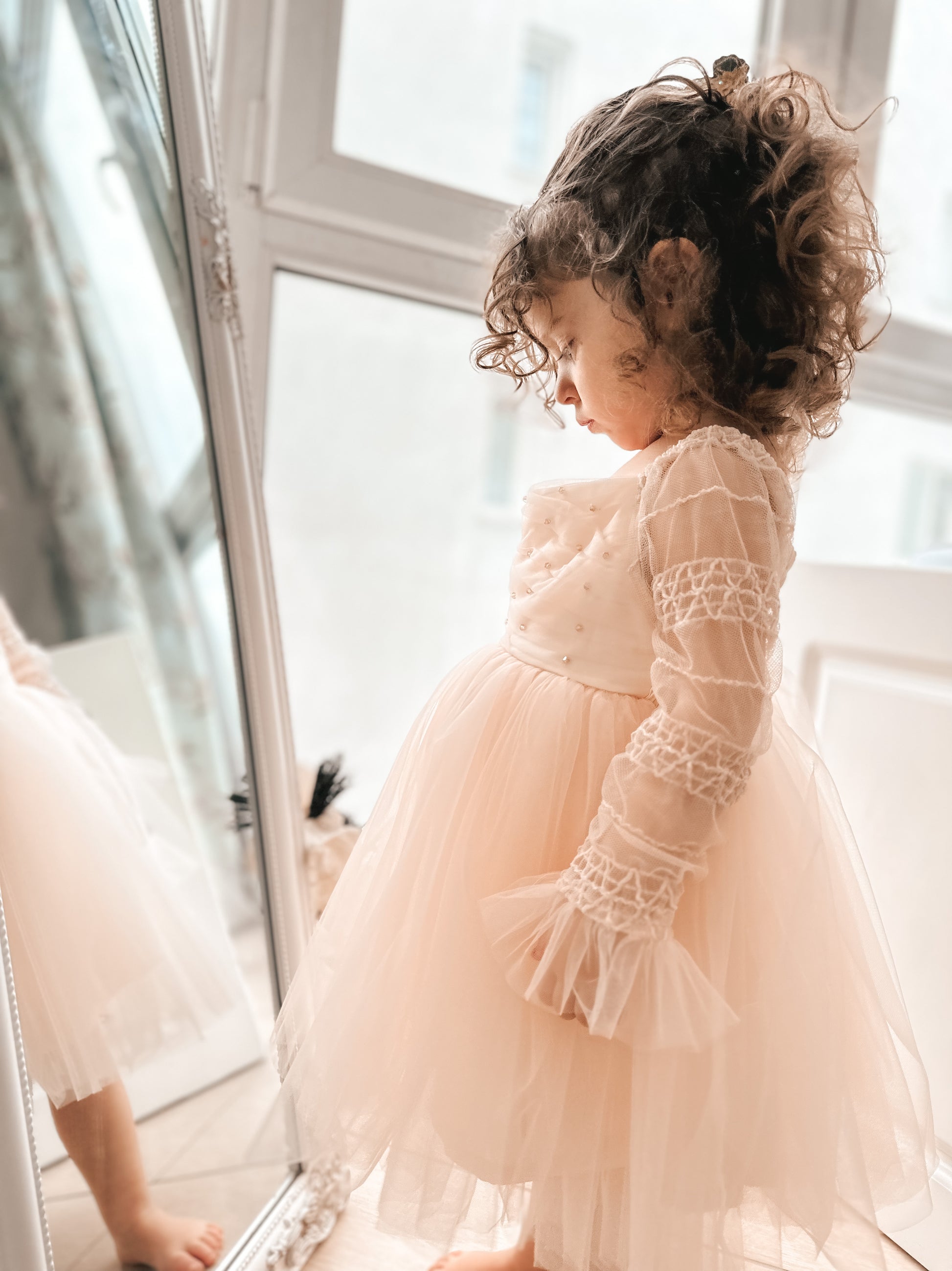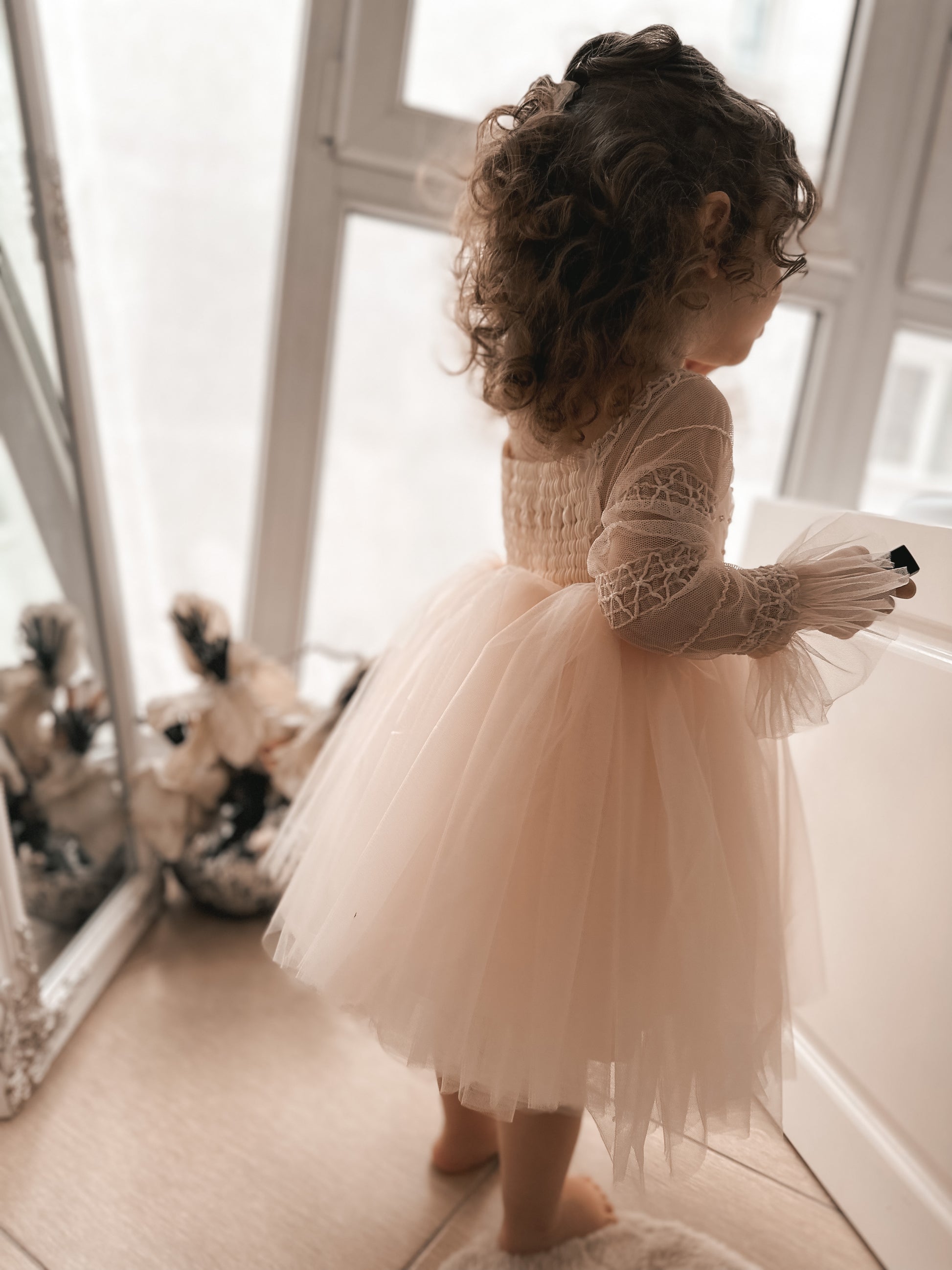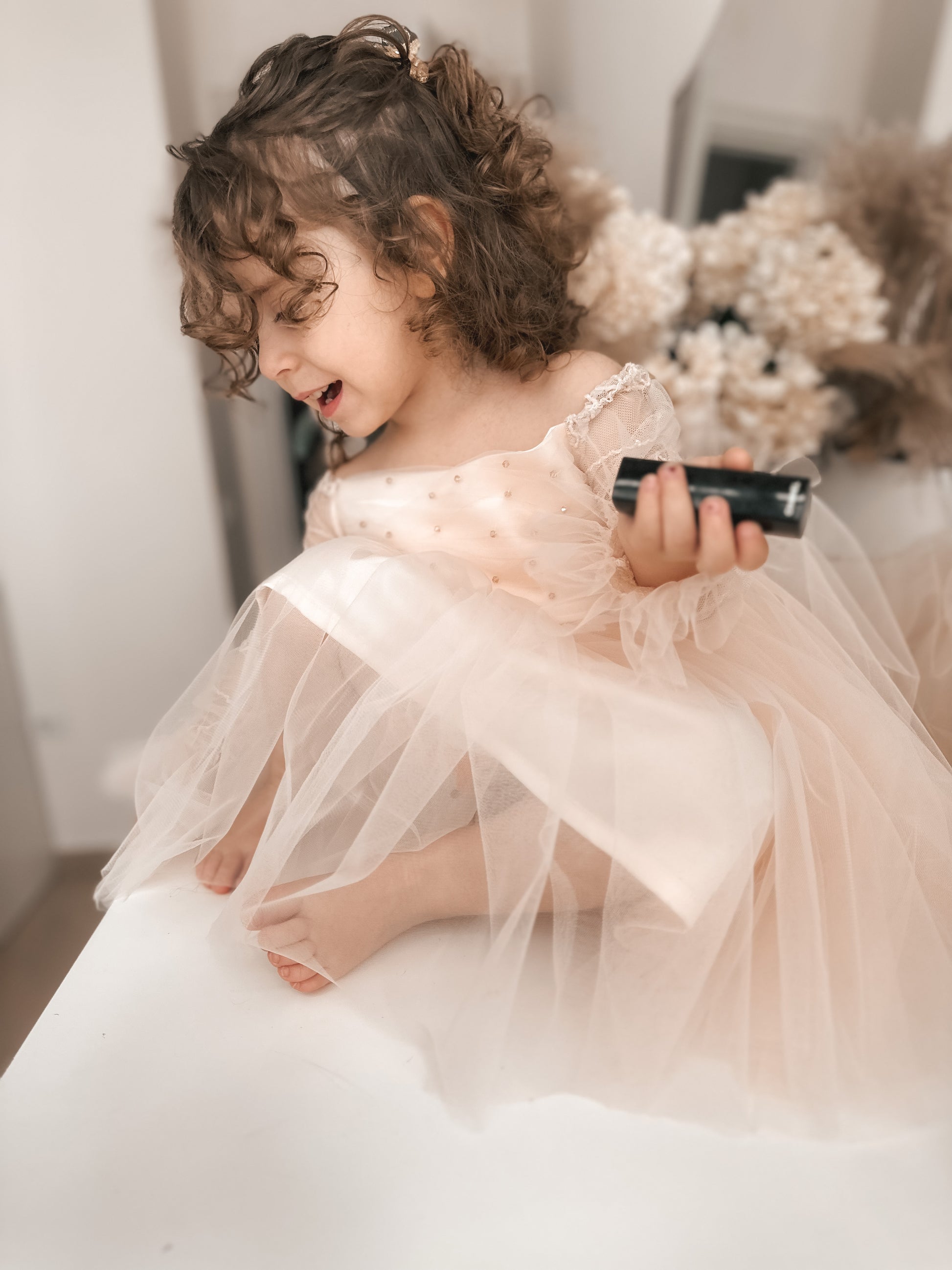 Sindy dress, fustan eventesh dhe pagezimesh, me menge te gjata dhe detaje me gurre ne pjesen e perparme.