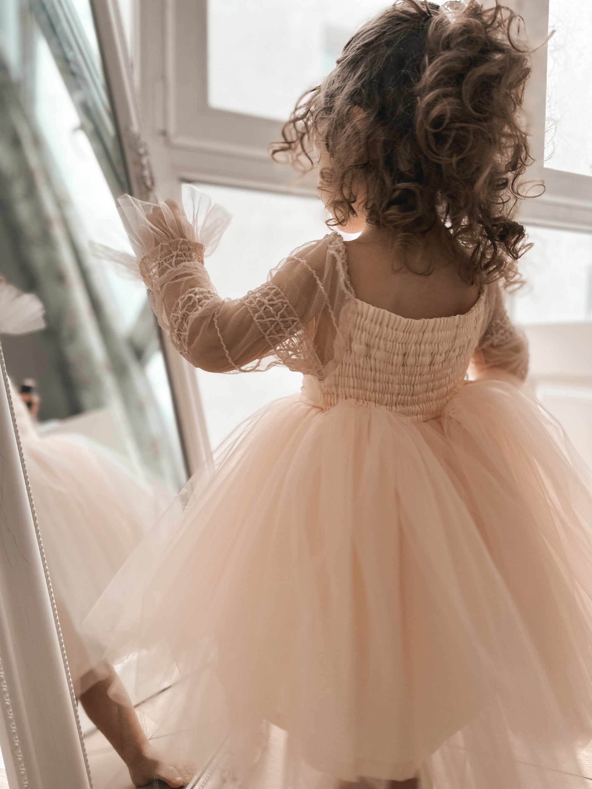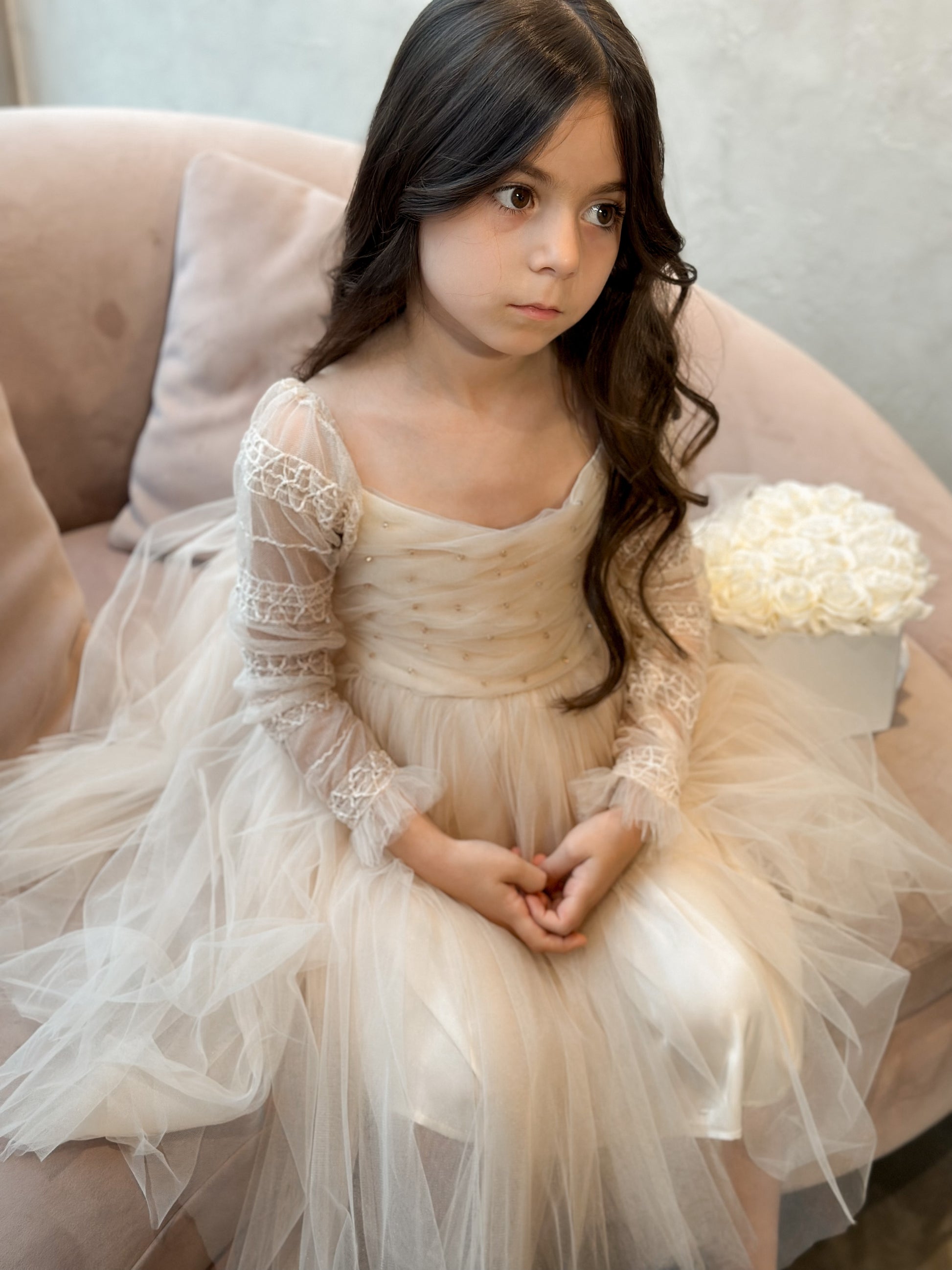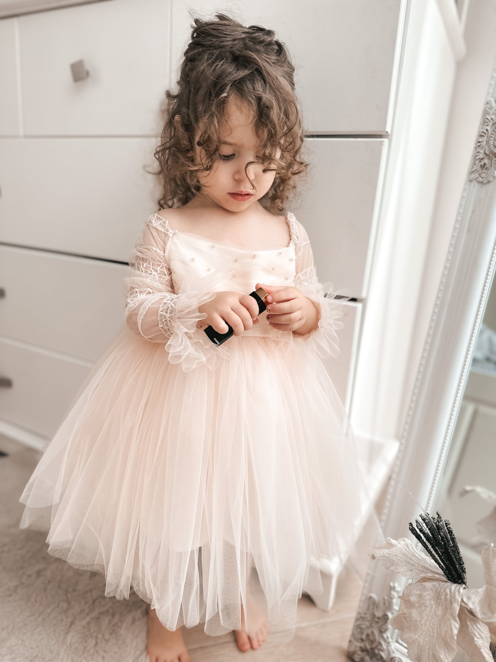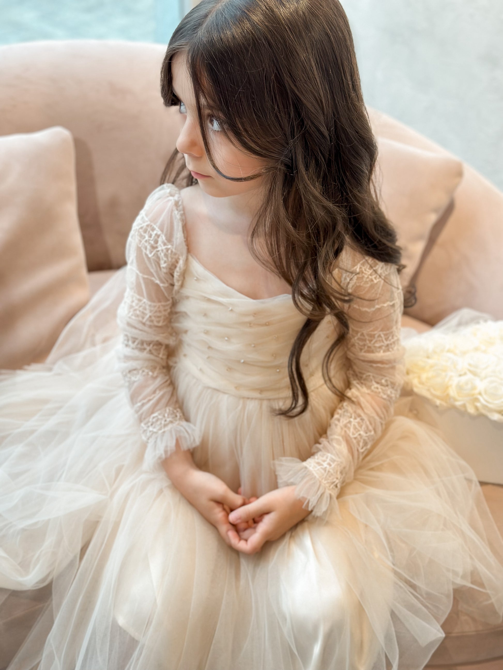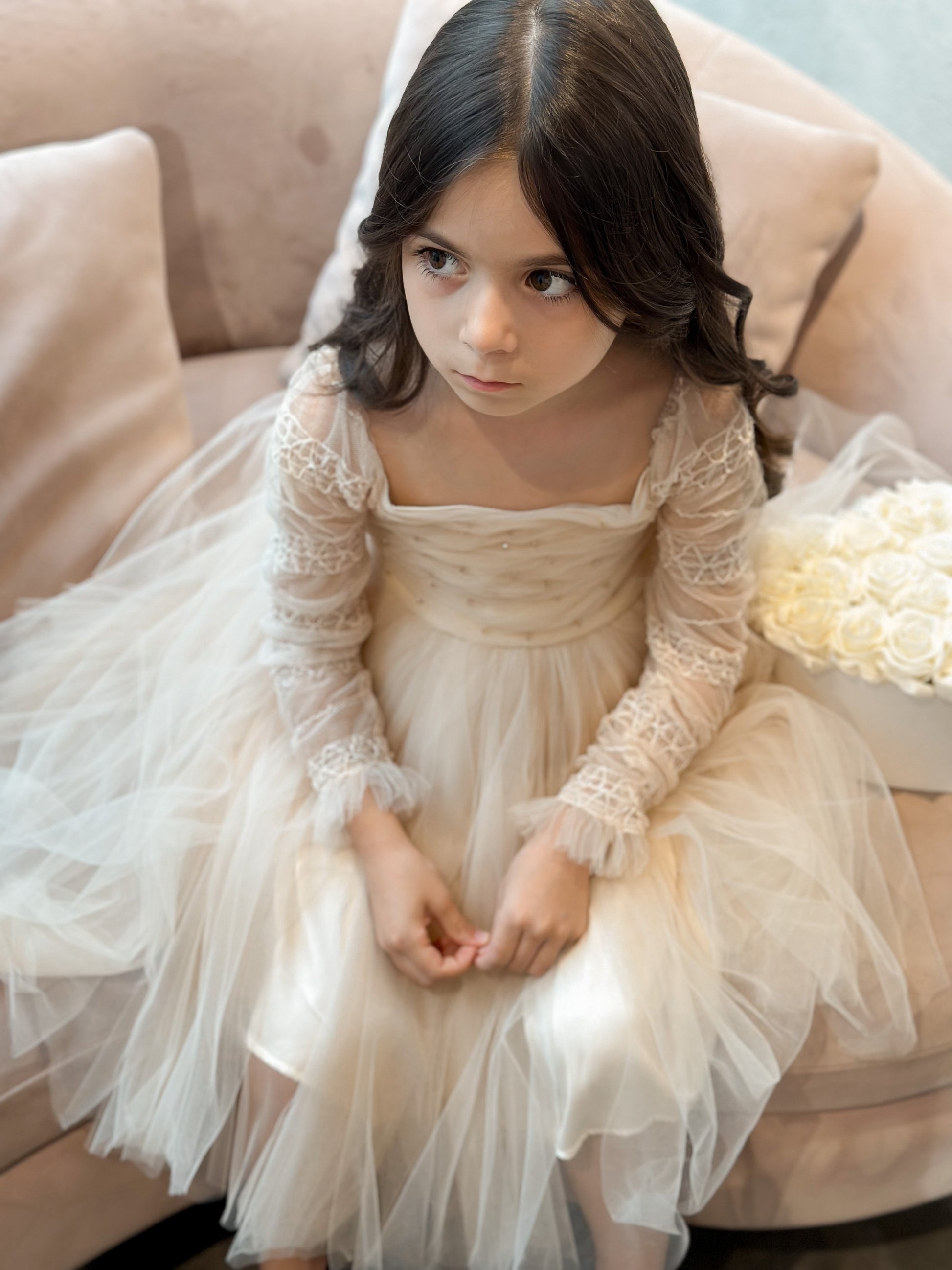 Sindy dress, fustan eventesh dhe pagezimesh, me menge te gjata dhe detaje me gurre ne pjesen e perparme.