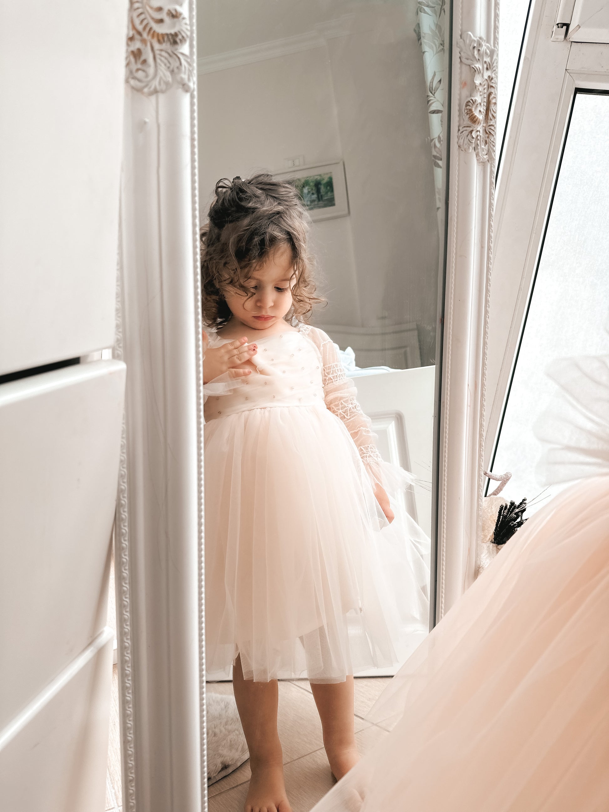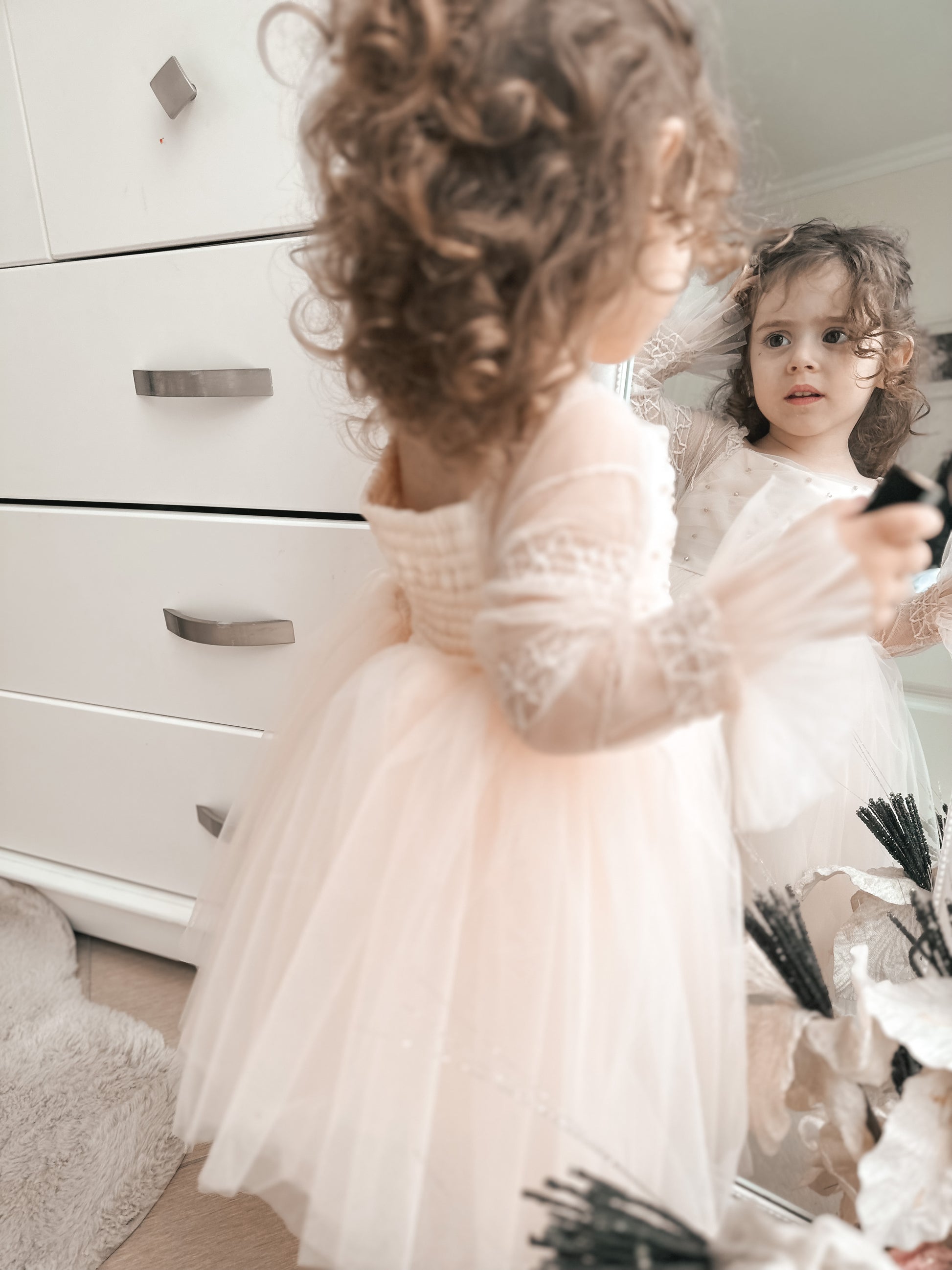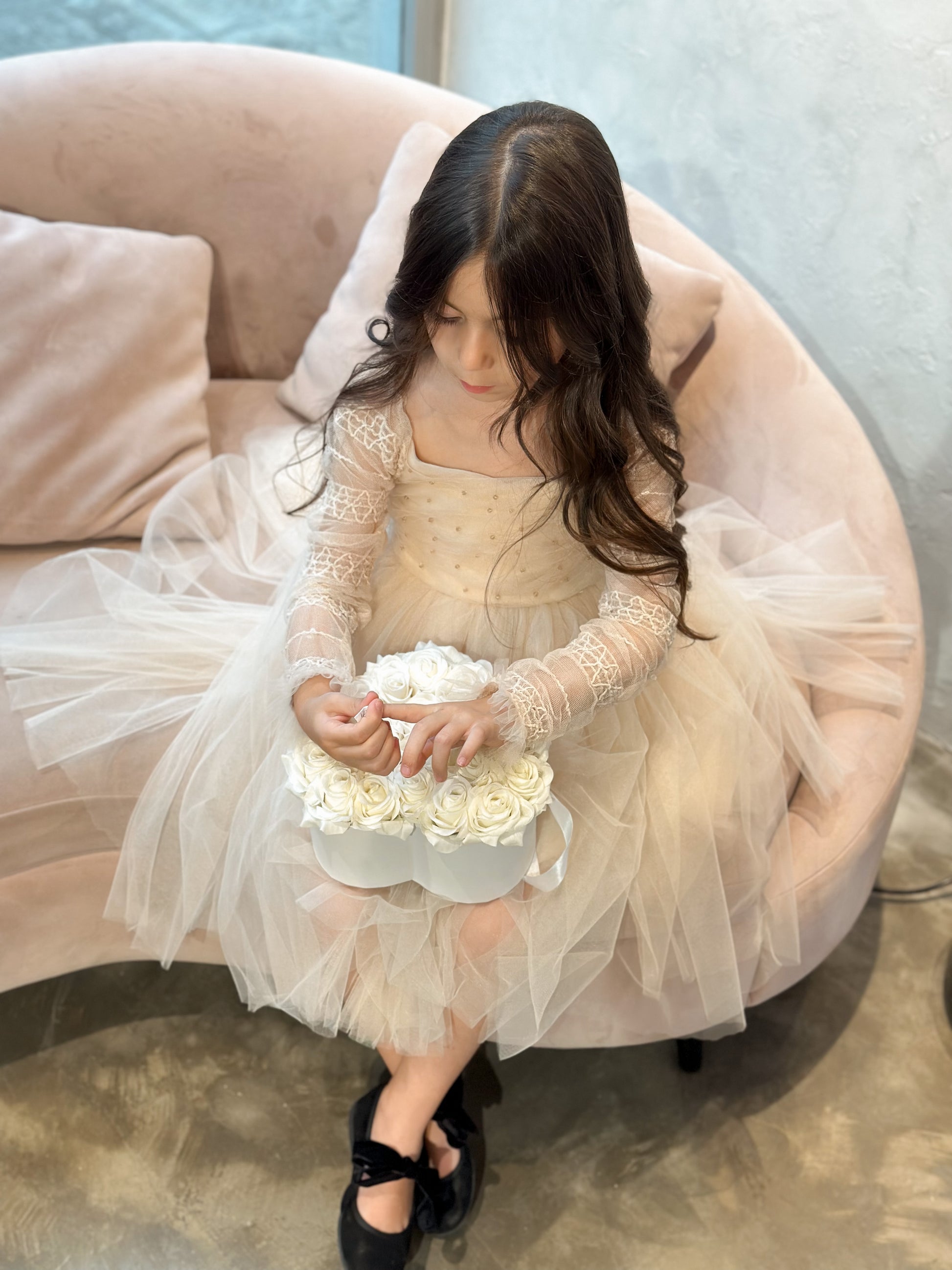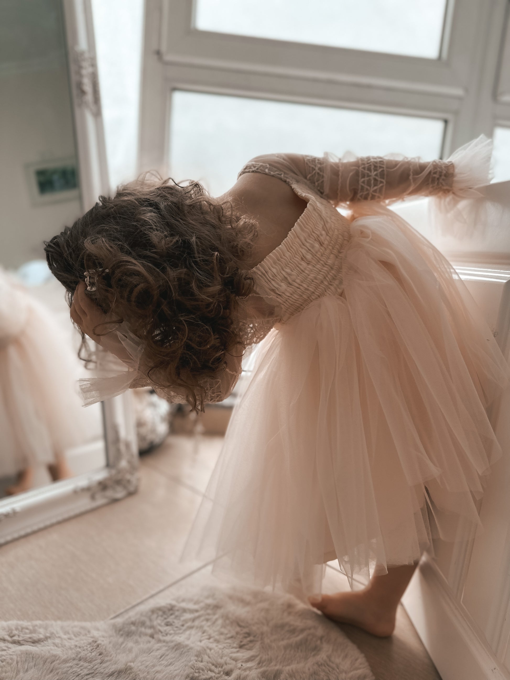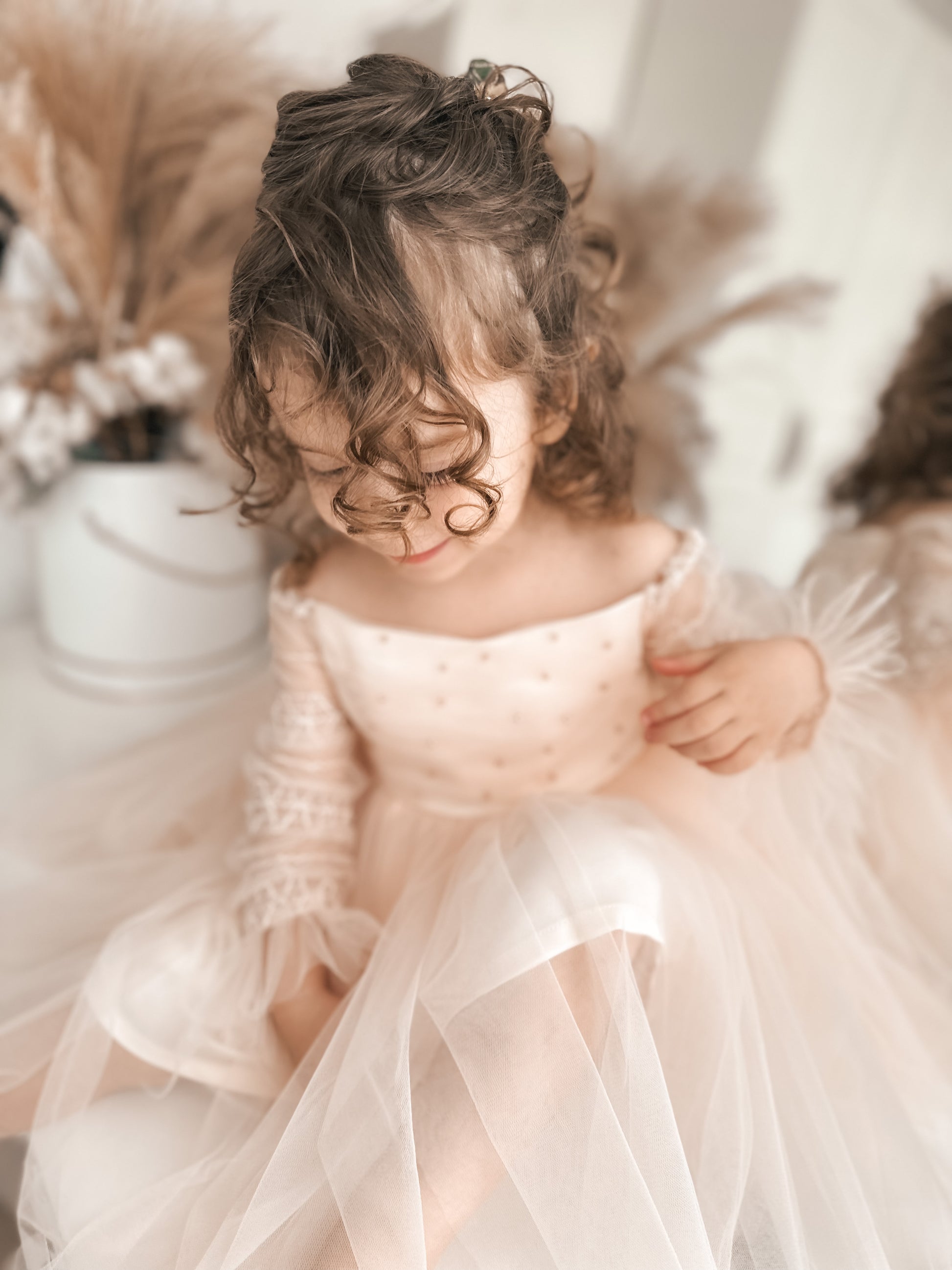 Sindy dress, fustan eventesh dhe pagezimesh, me menge te gjata dhe detaje me gurre ne pjesen e perparme.