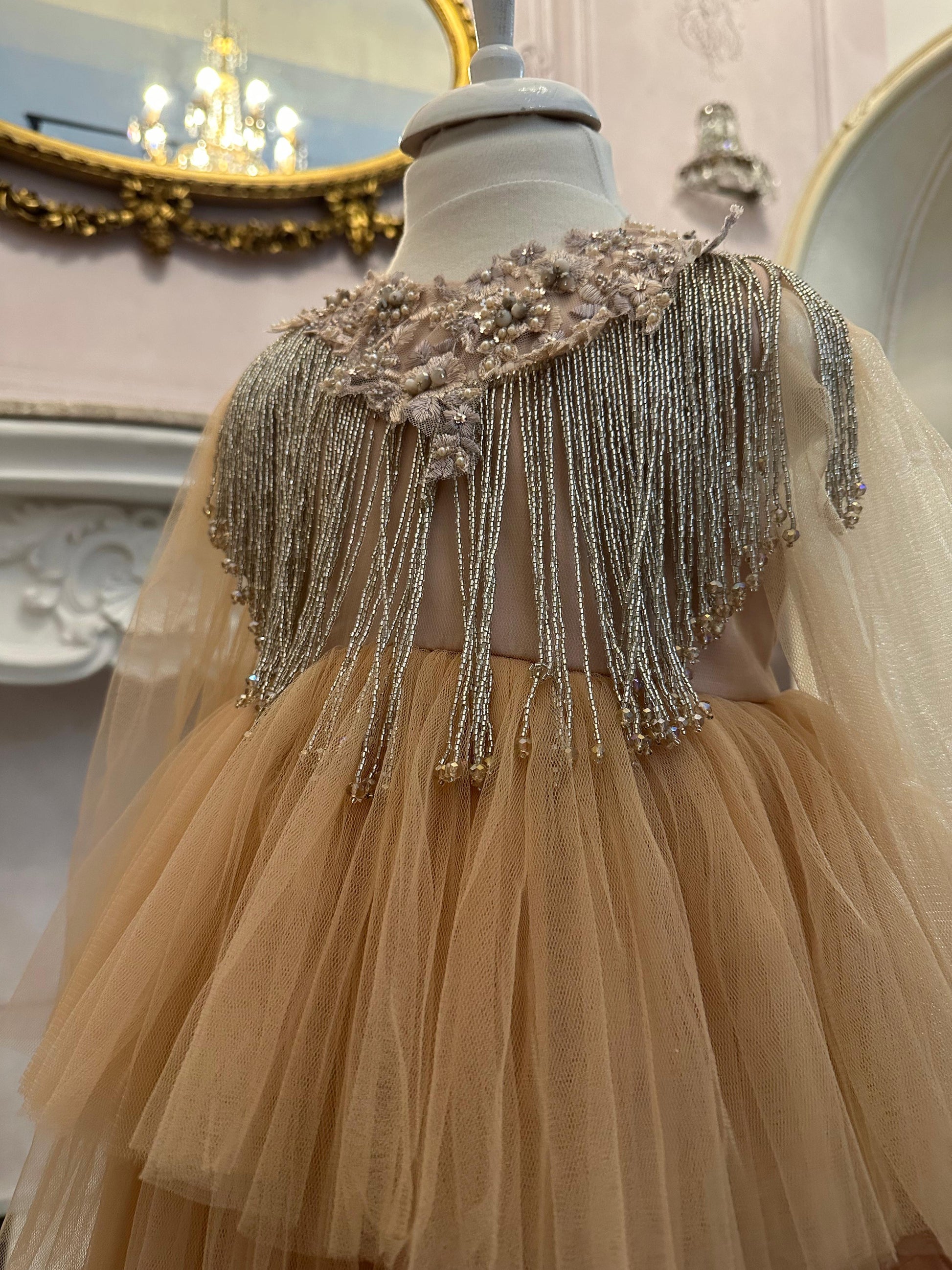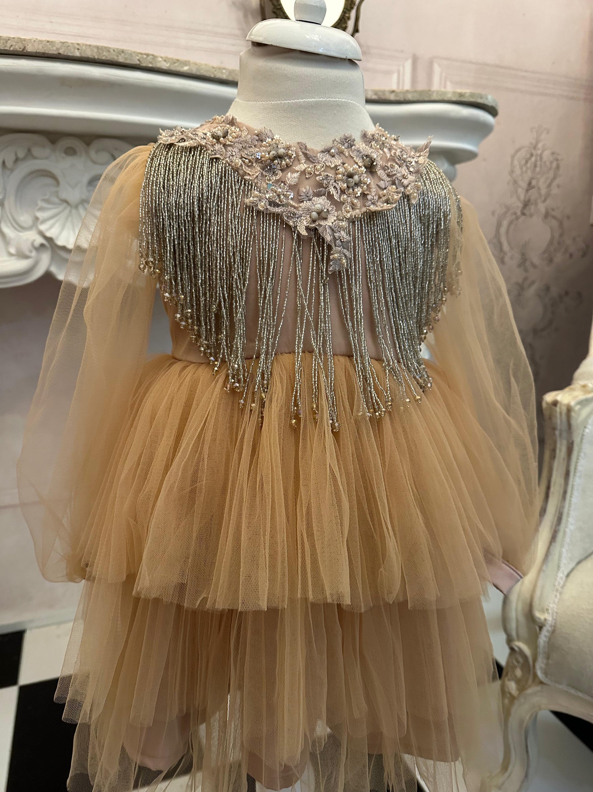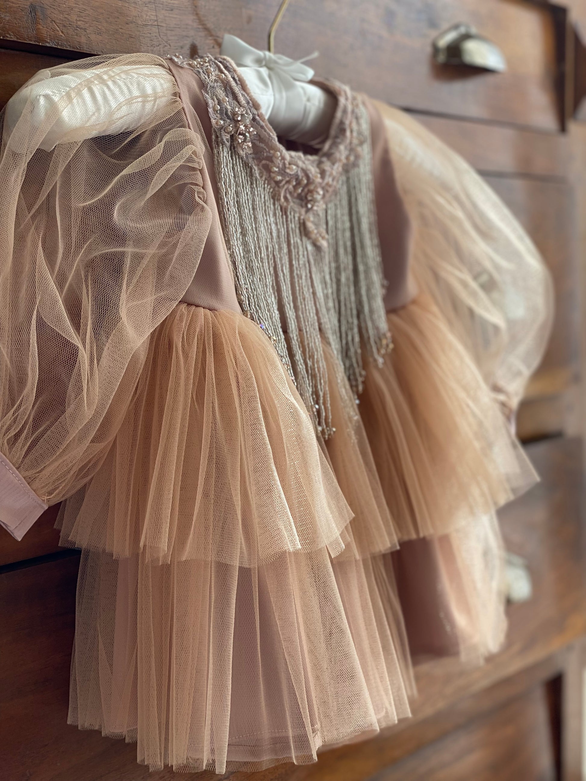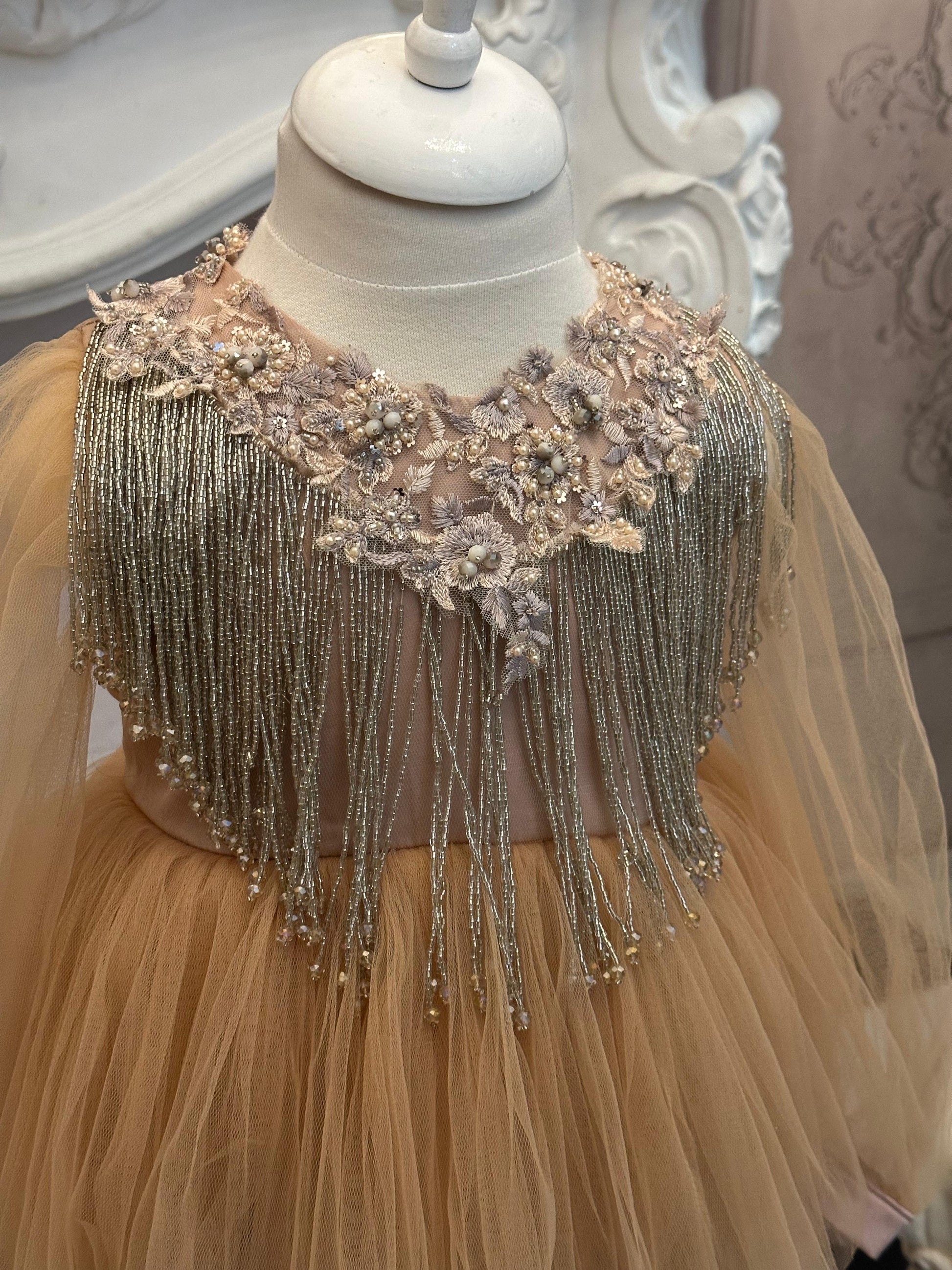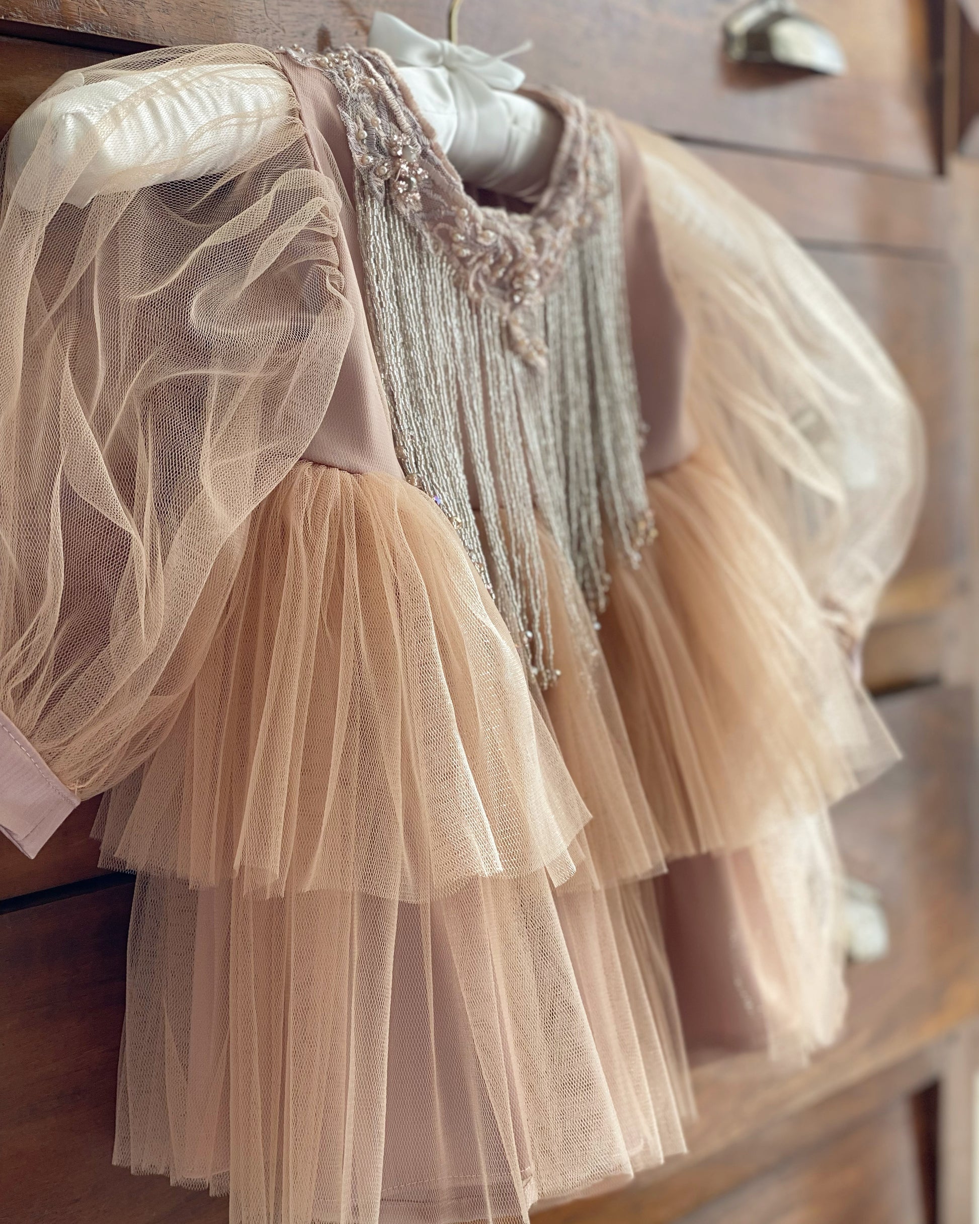 Garbi dress, fustan eventesh dhe pagezimi.Me menge te gjata transparente dhe detaje ruazash e kristalesh.