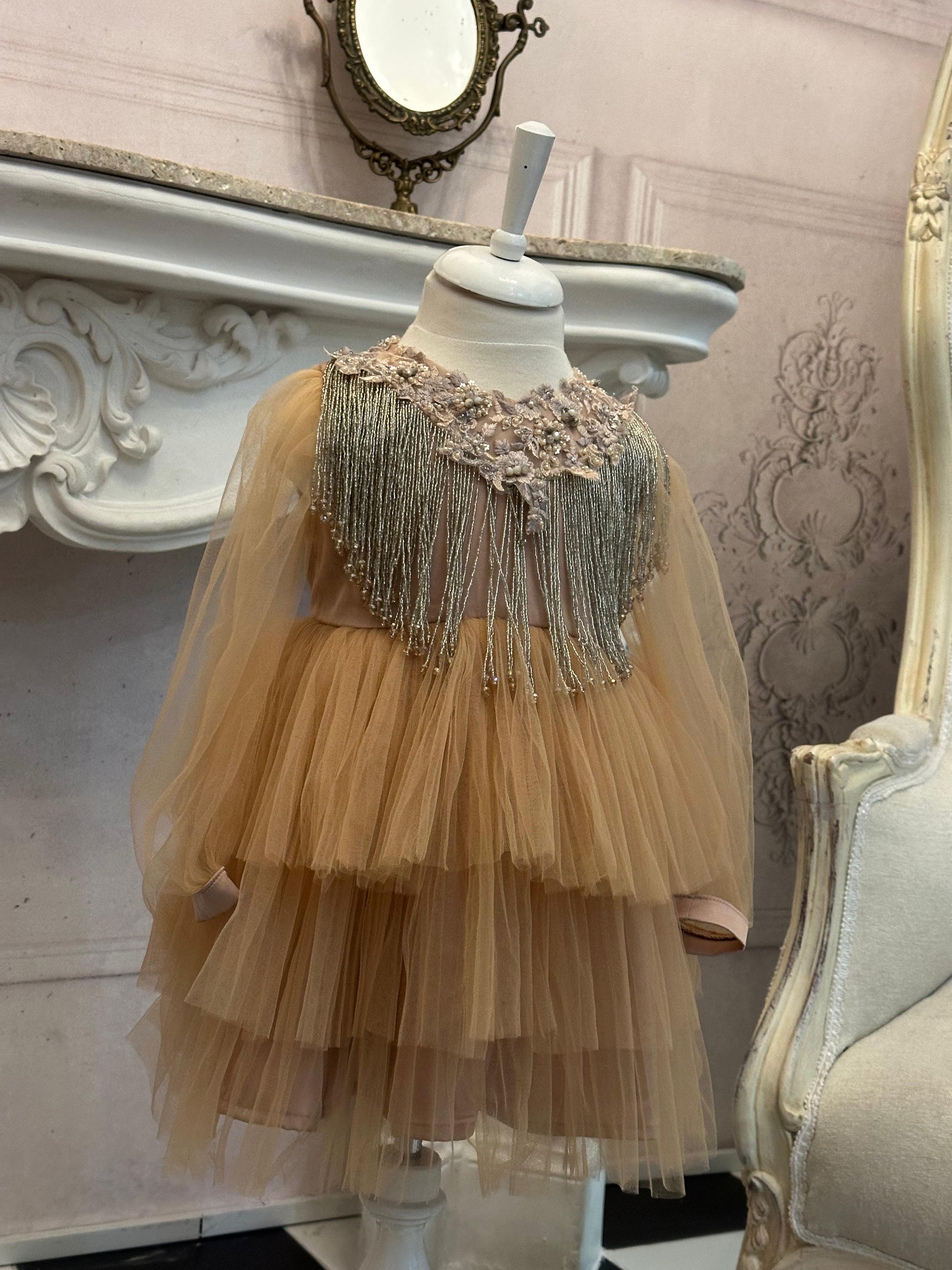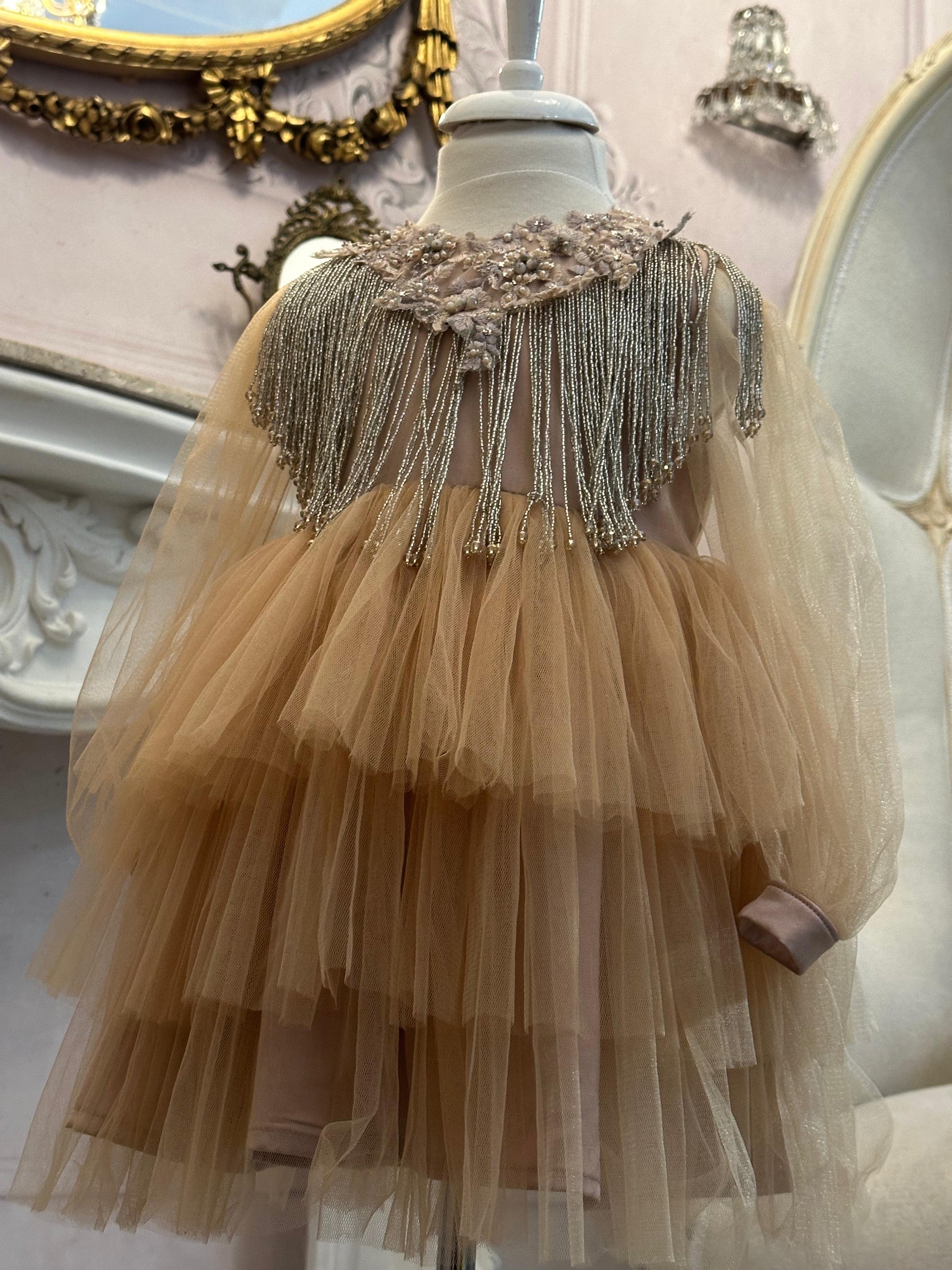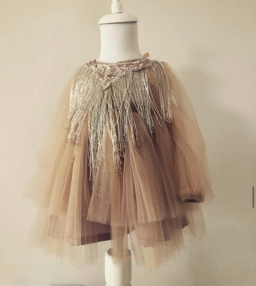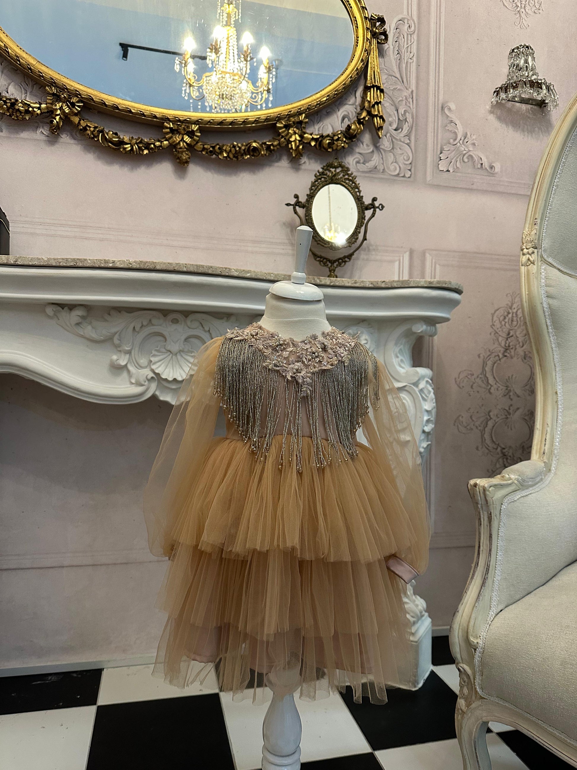 Garbi dress, fustan eventesh dhe pagezimi.Me menge te gjata transparente dhe detaje ruazash e kristalesh.