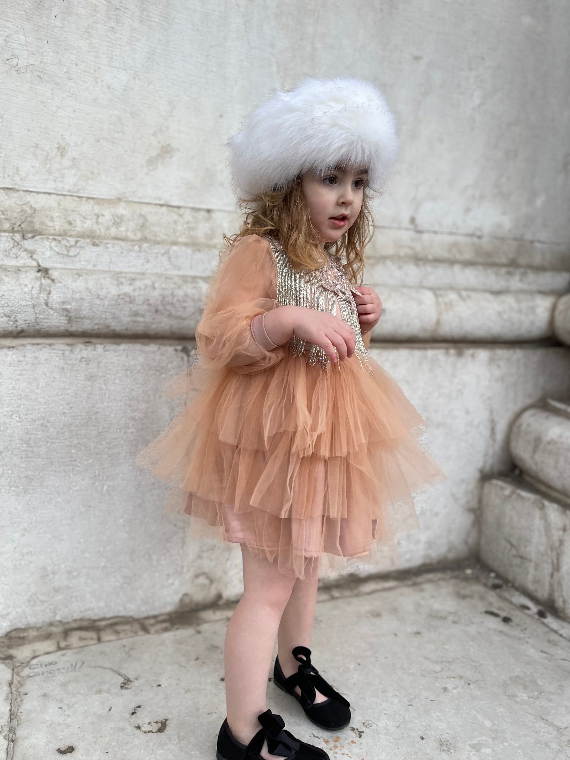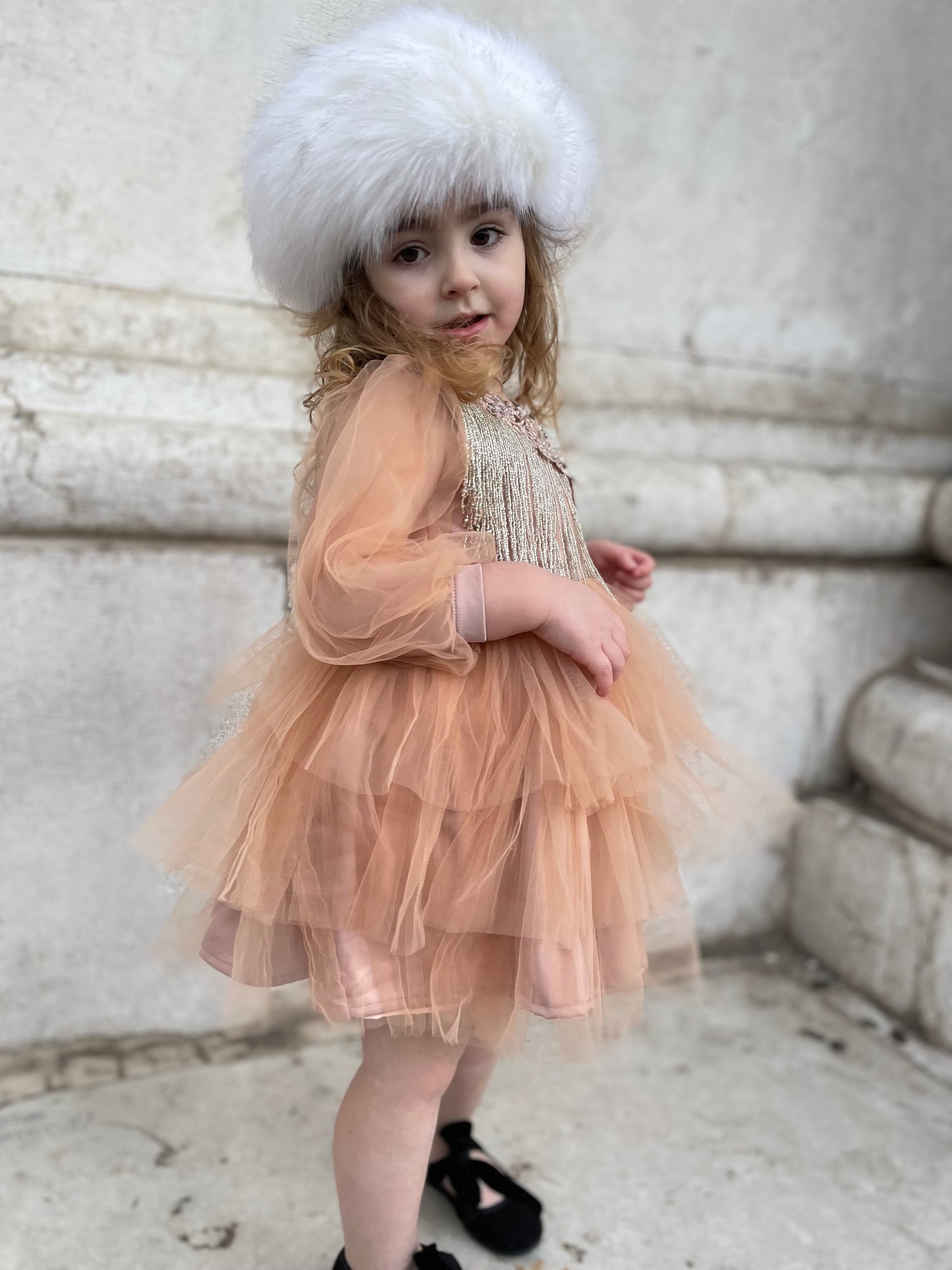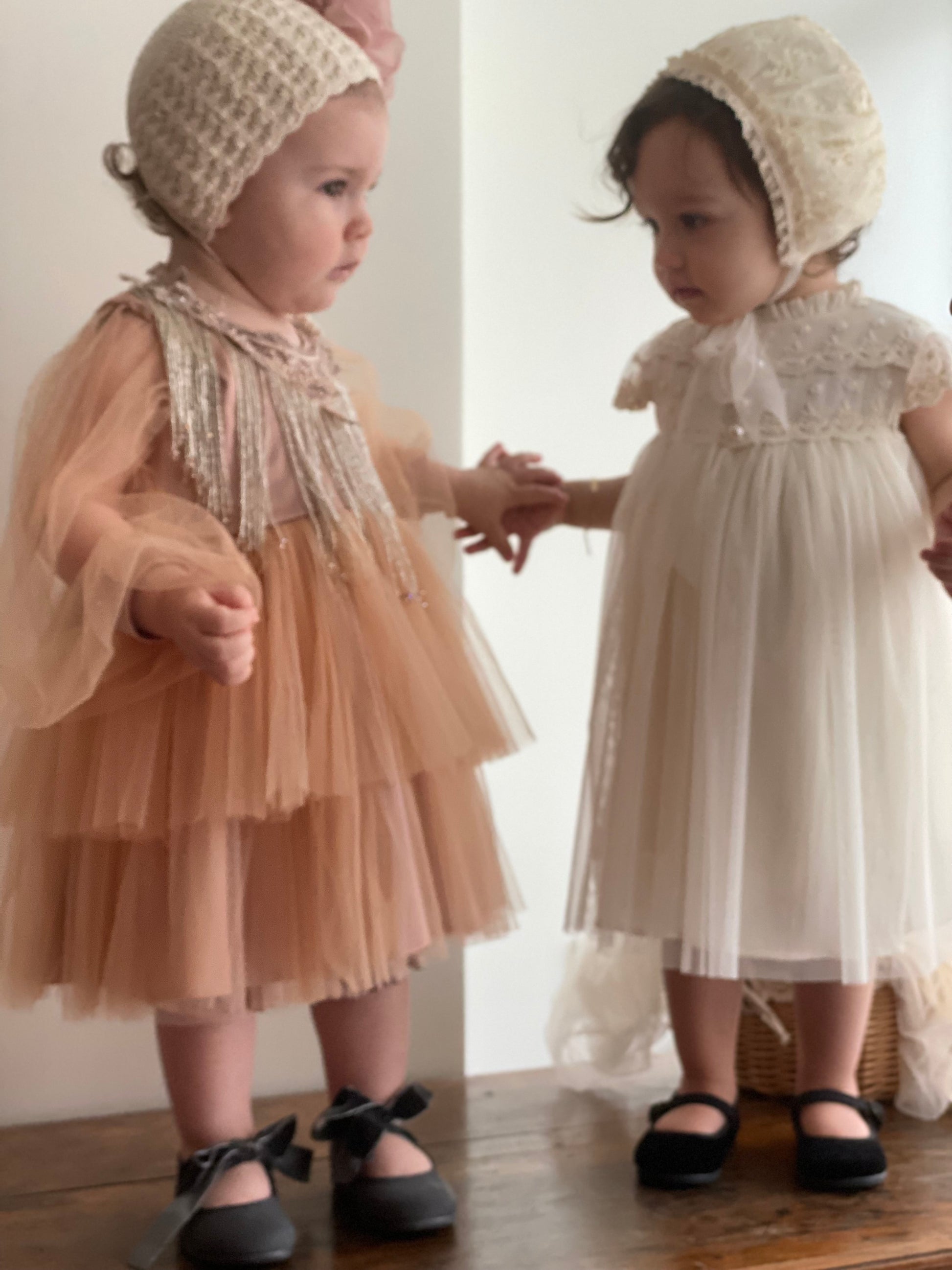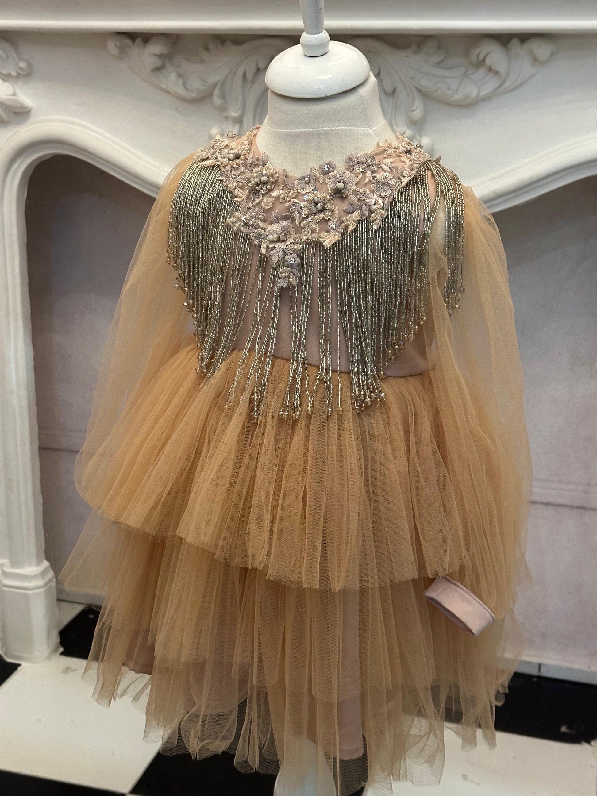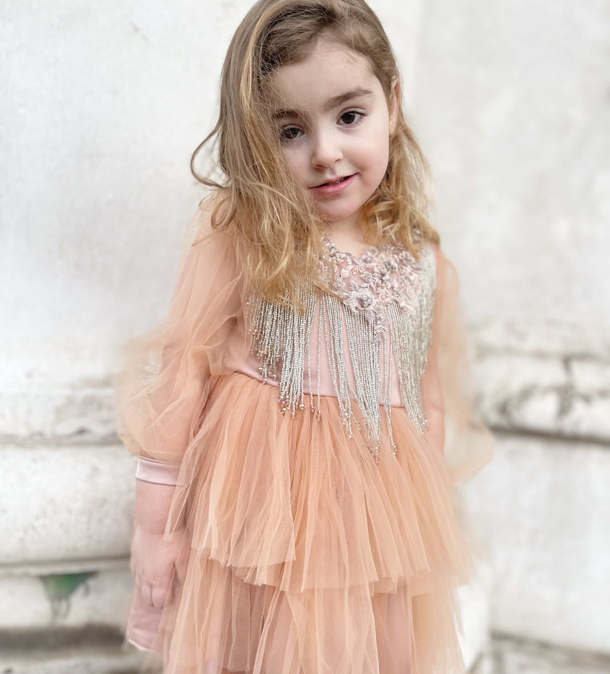Garbi dress, fustan eventesh dhe pagezimi.Me menge te gjata transparente dhe detaje ruazash e kristalesh.