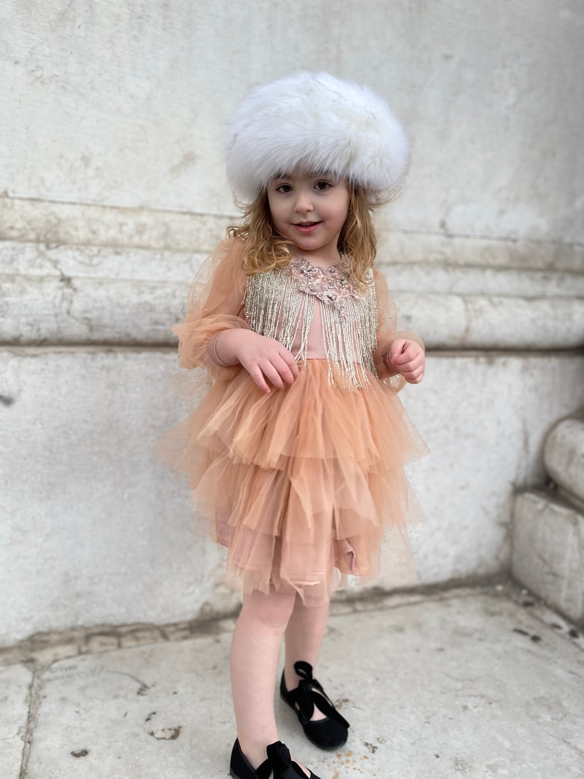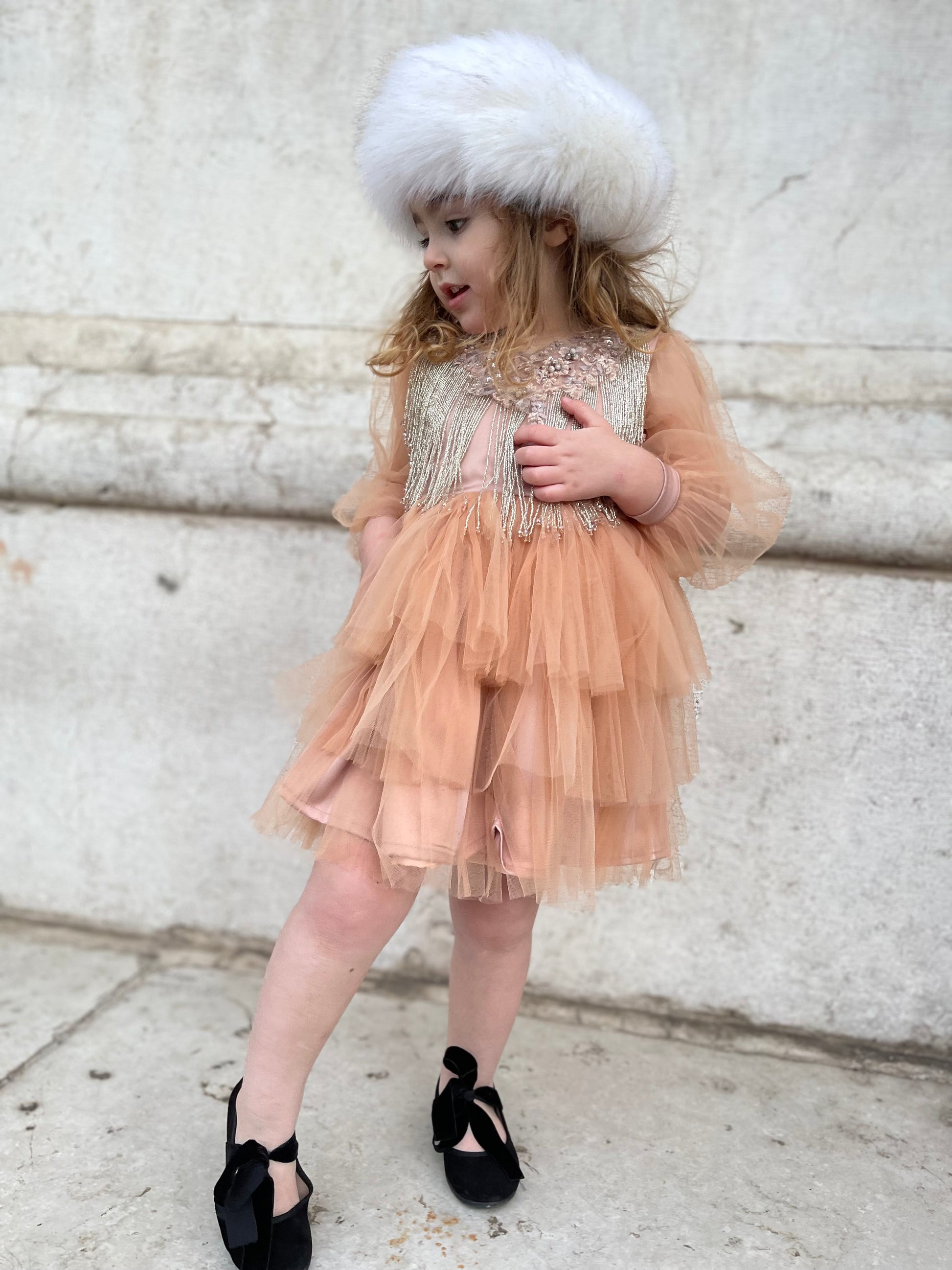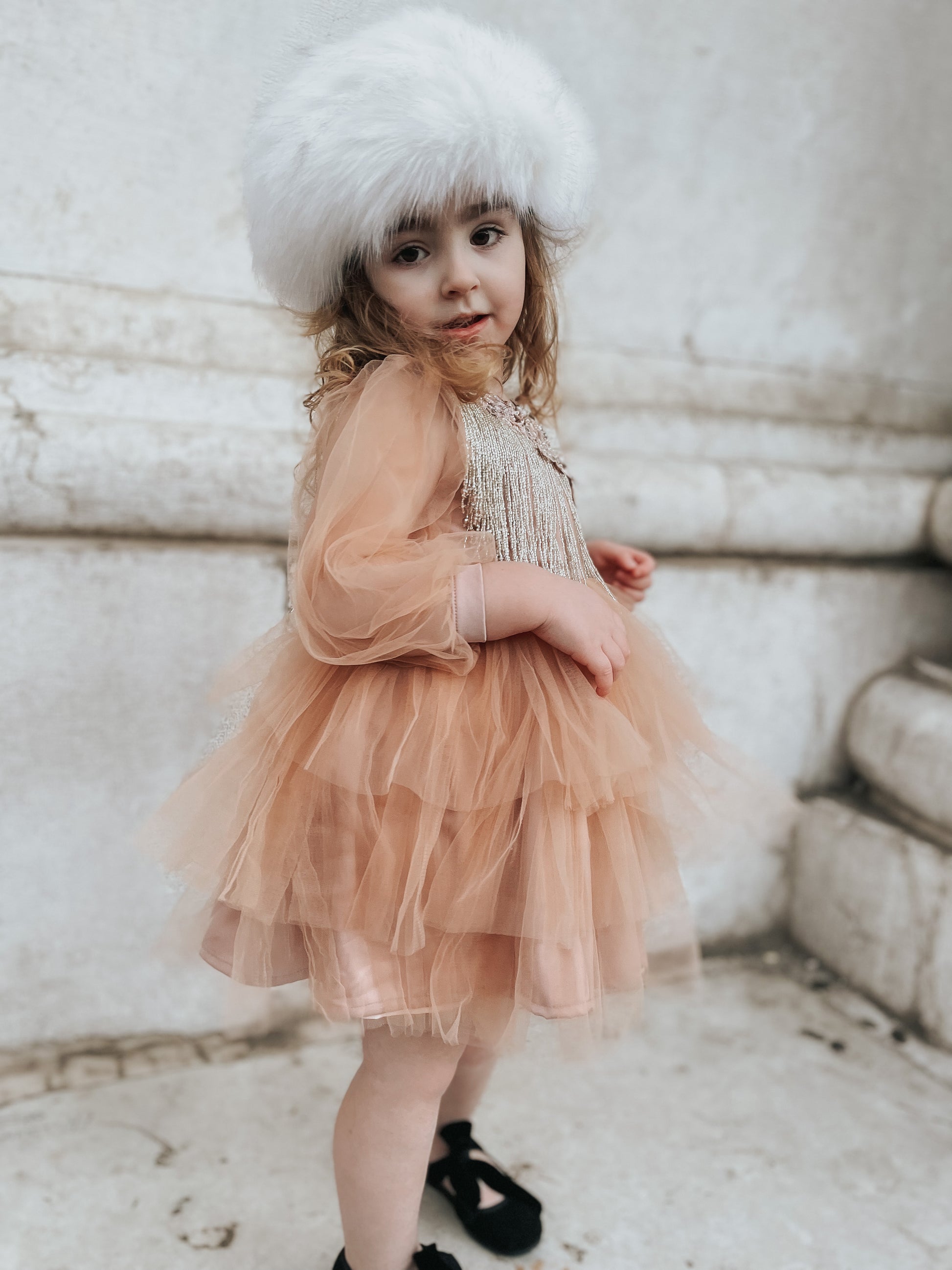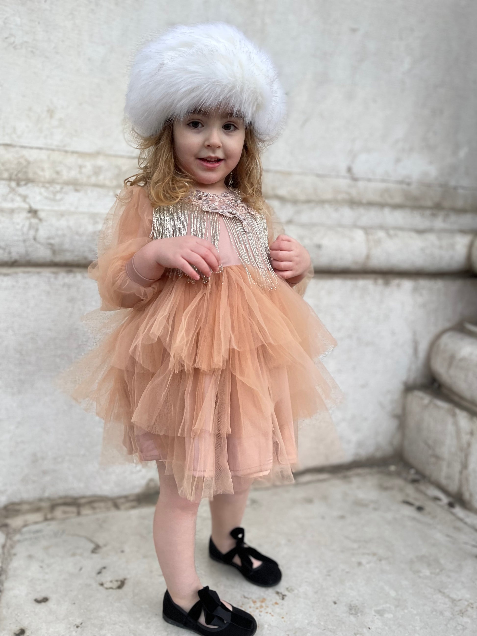 Garbi dress, fustan eventesh dhe pagezimi.Me menge te gjata transparente dhe detaje ruazash e kristalesh.